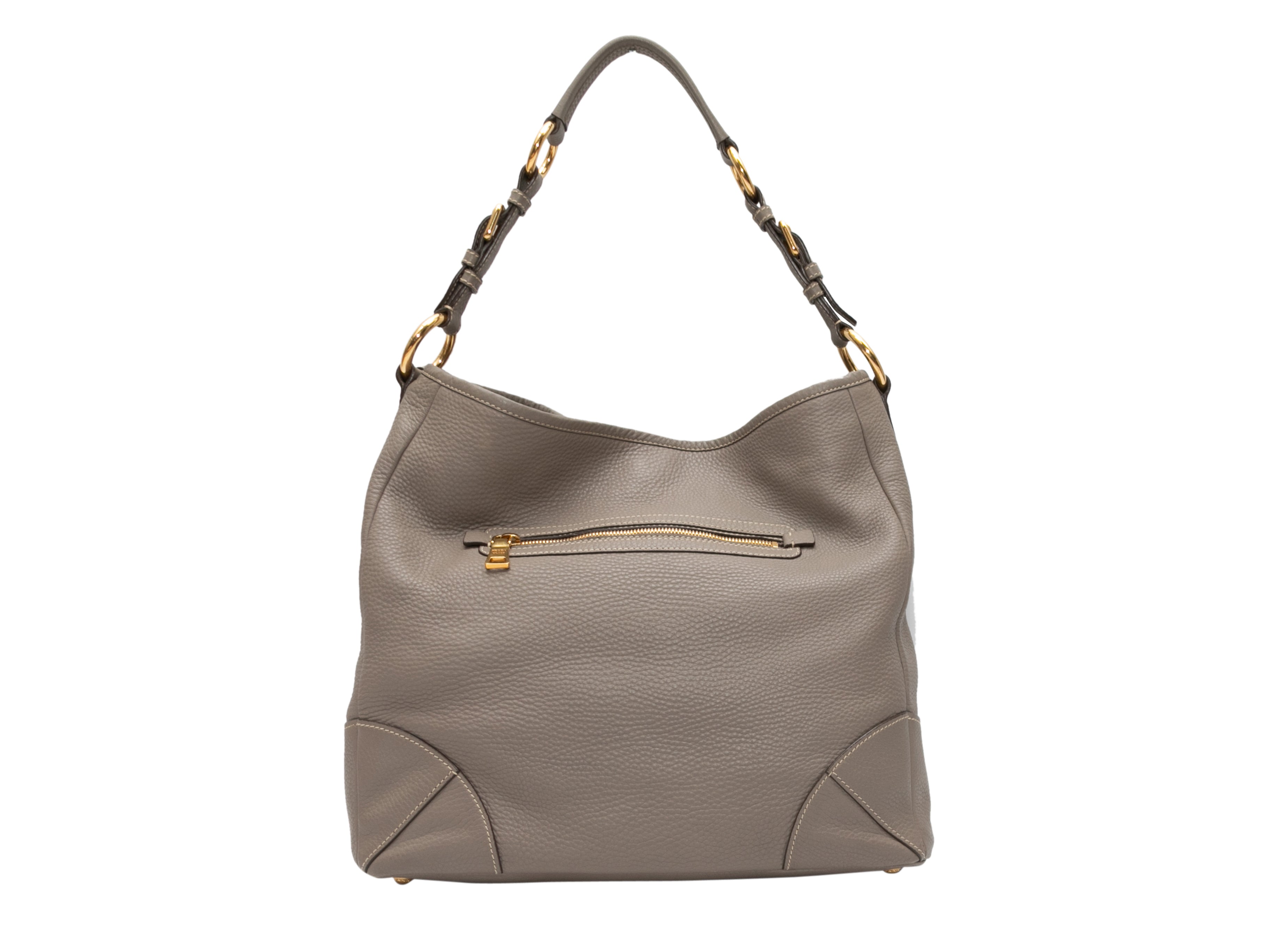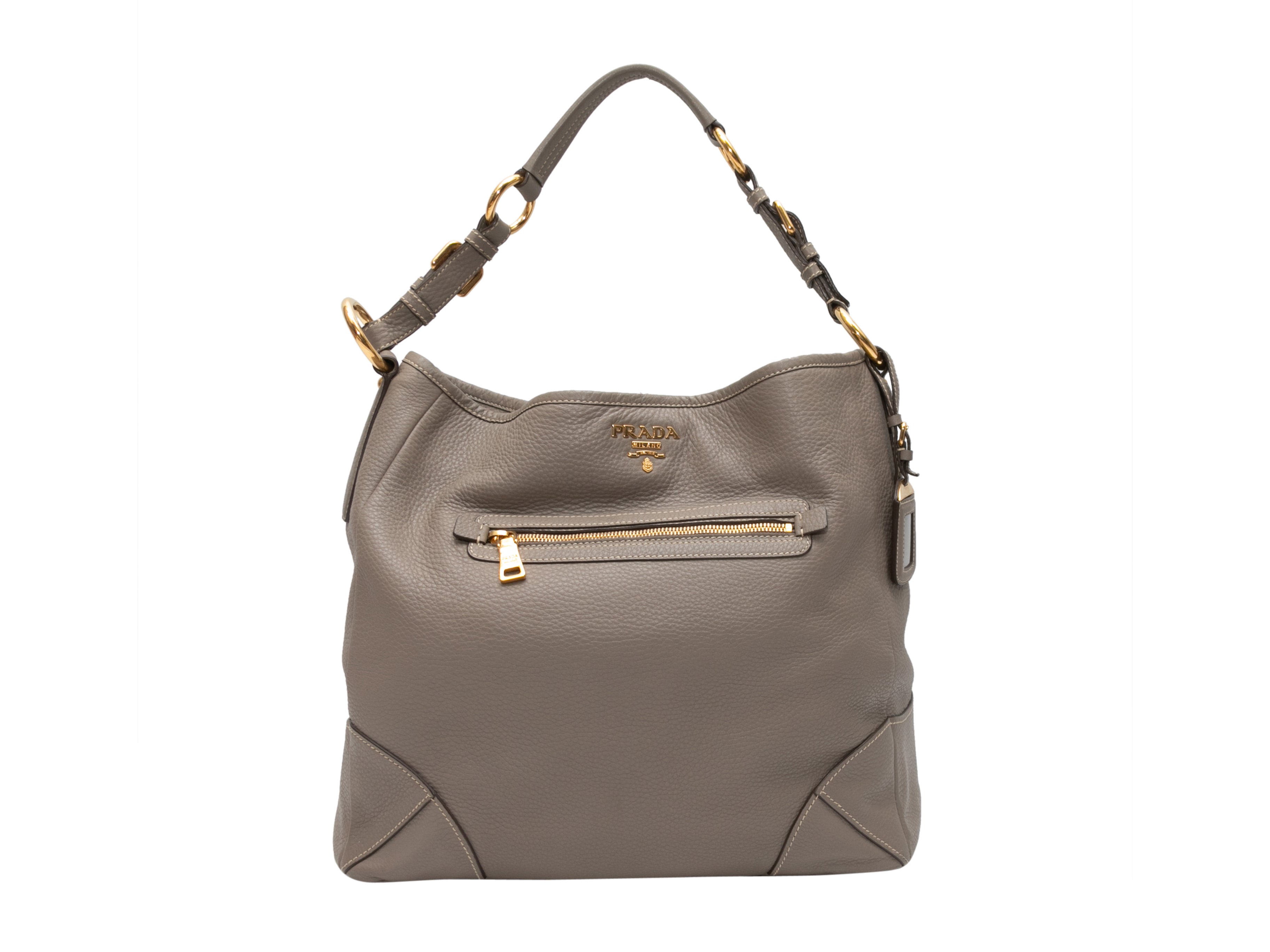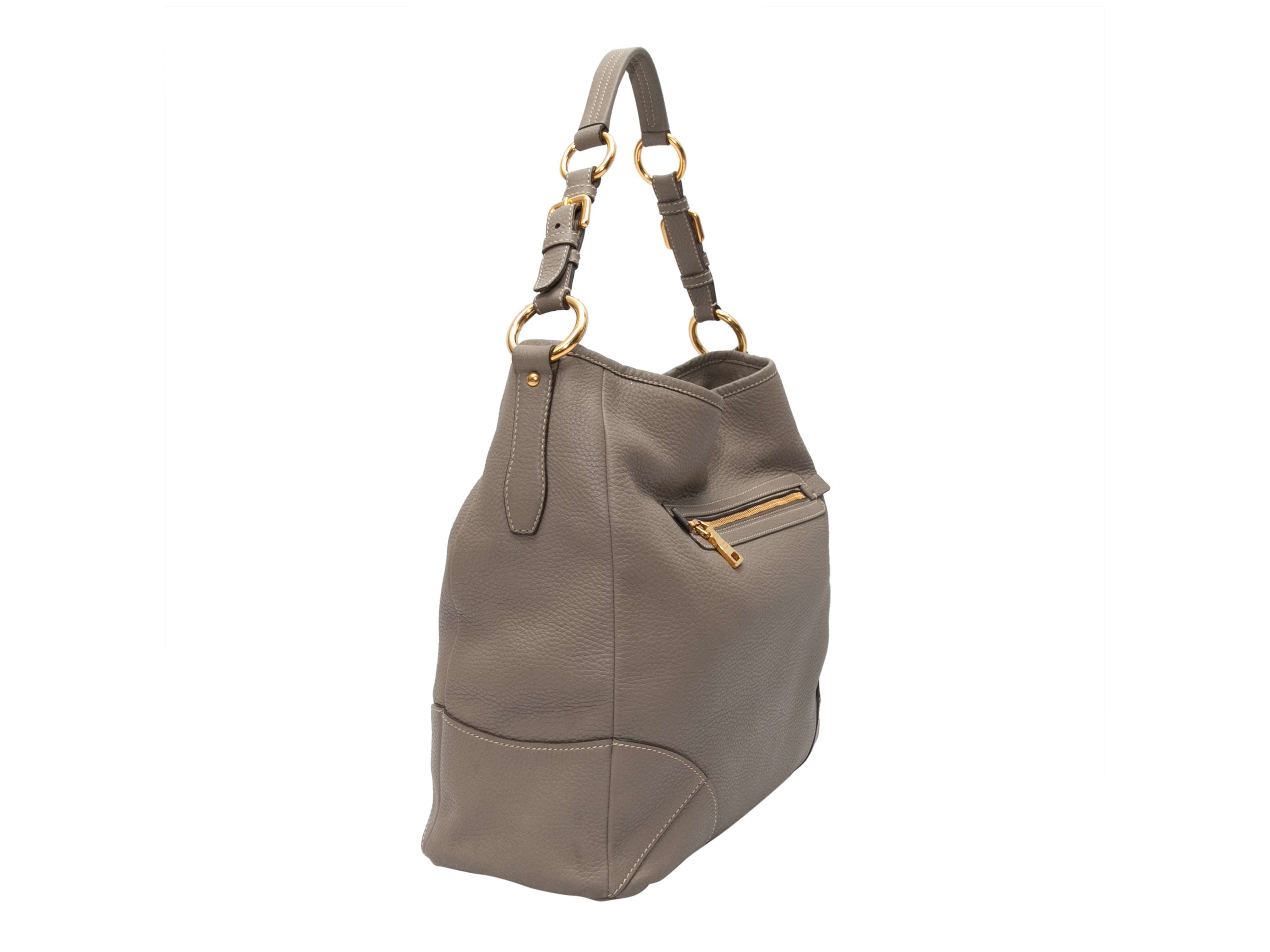 Product Details: Gray Prada Leather Hobo Tote Bag. This hobo tote bag features a leather body, gold-tone hardware, exterior front and back zip pockets, and a single flat top handle. 14″ L x 12″ H x 7″ D, 10″ handle drop.