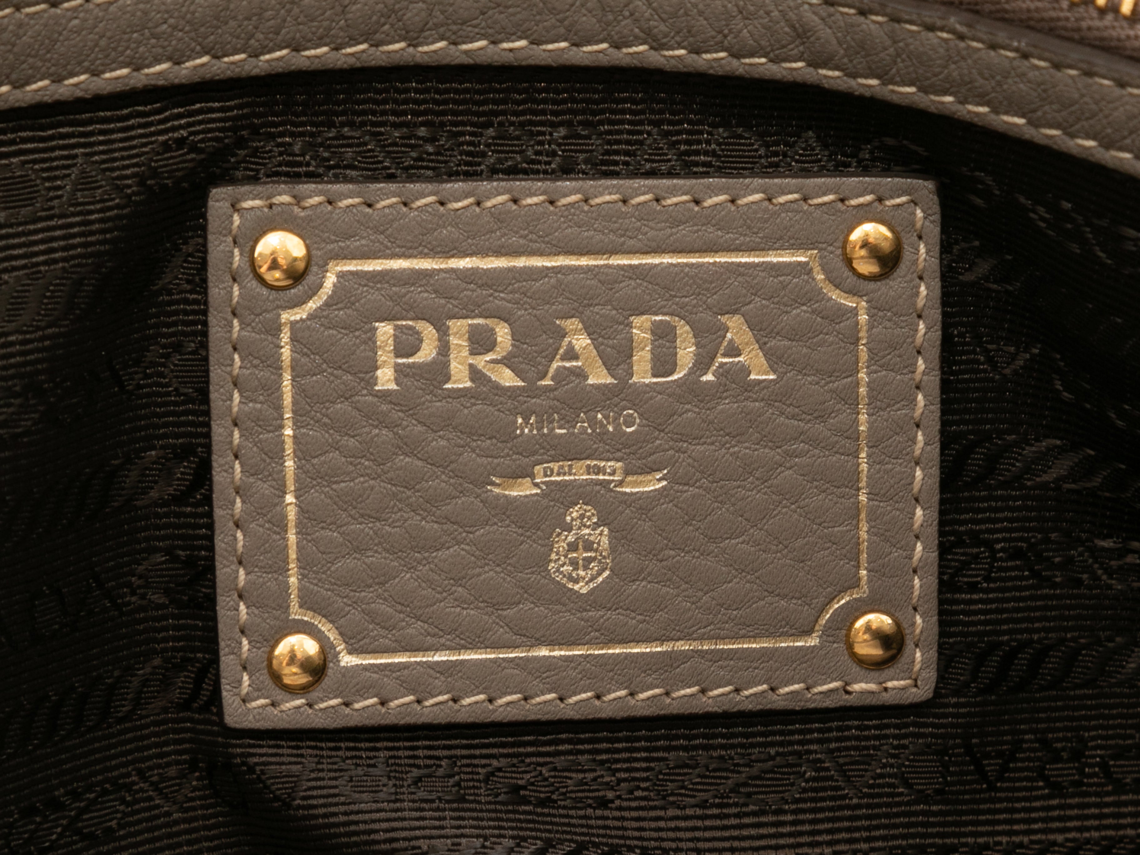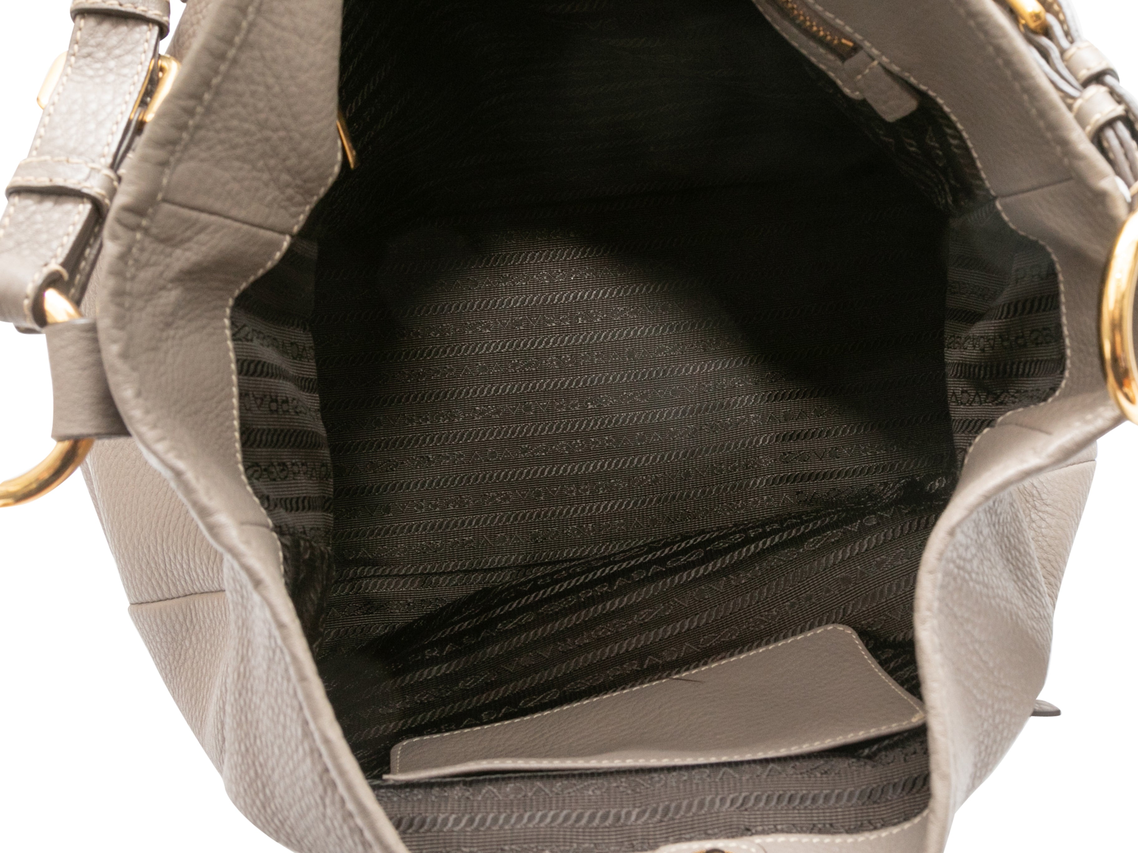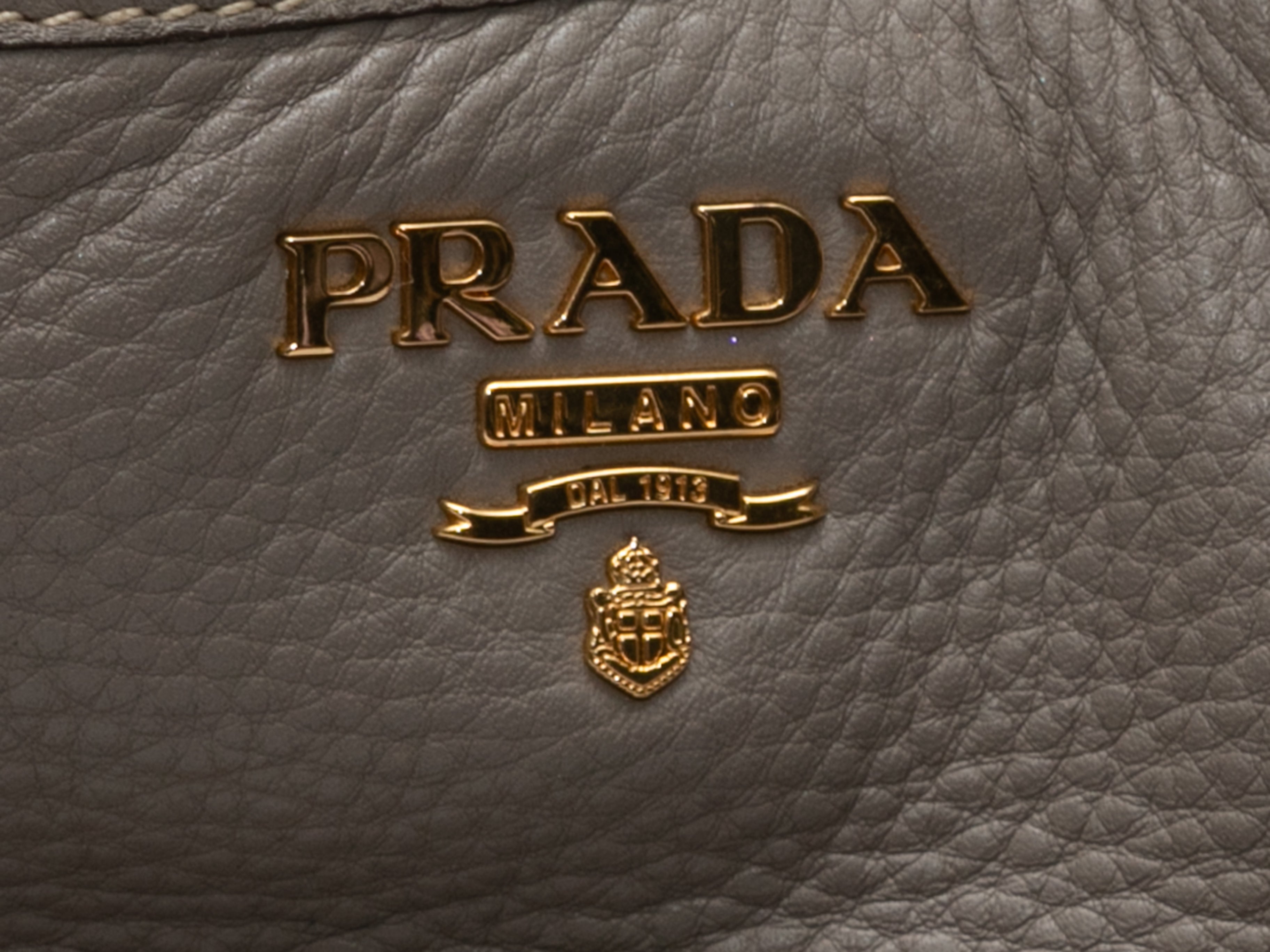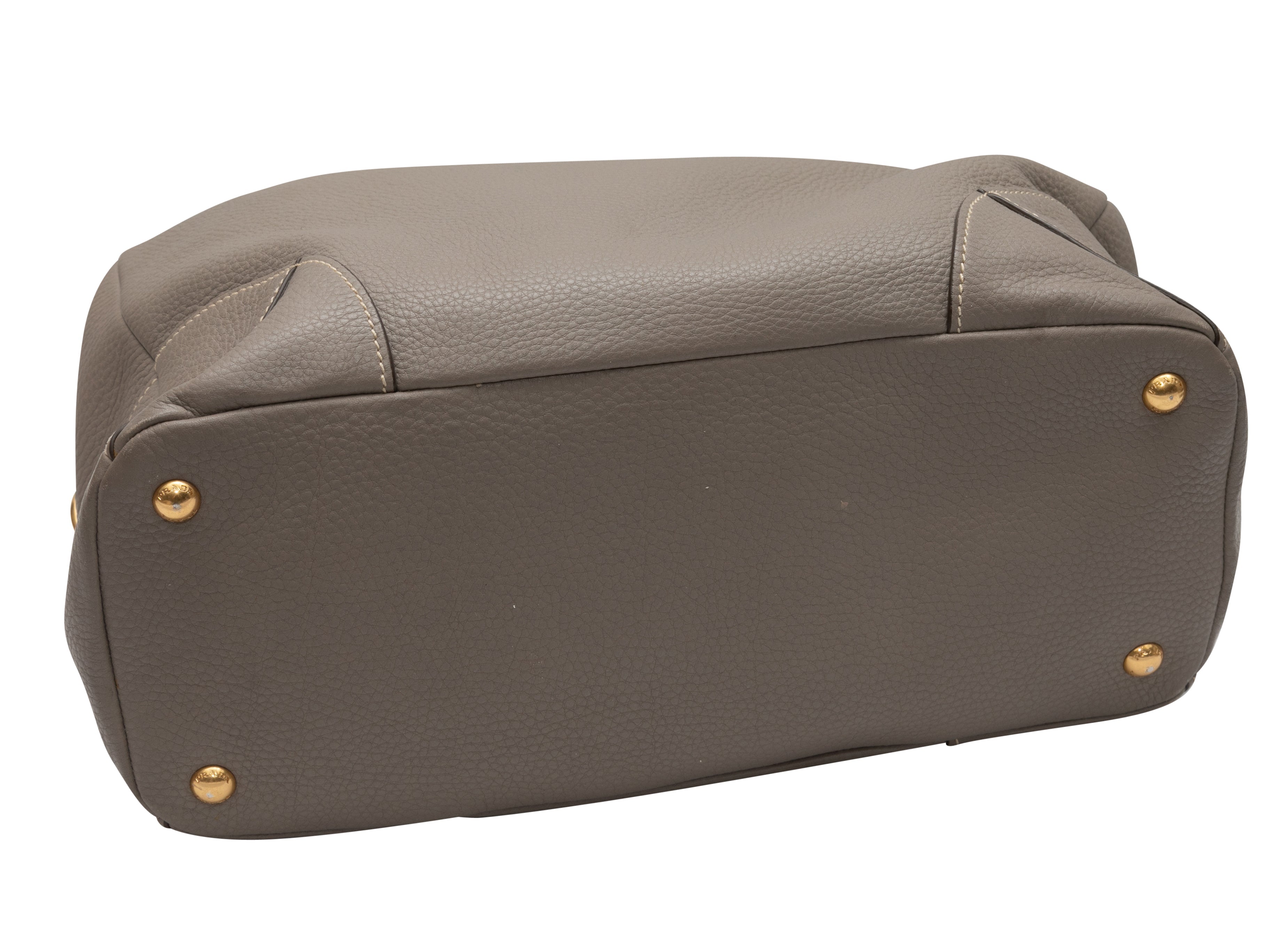 Product Details: Gray Prada Leather Hobo Tote Bag. This hobo tote bag features a leather body, gold-tone hardware, exterior front and back zip pockets, and a single flat top handle. 14″ L x 12″ H x 7″ D, 10″ handle drop.