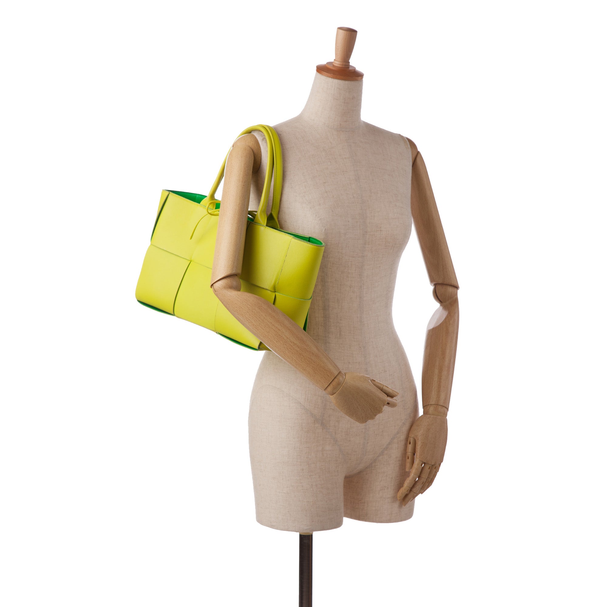 Product Details: Green Bottega Veneta Maxi Intrecciato Small Arco Tote. The Maxi Intrecciato Small Arco tote bag features a leather body, rolled leather handles, and an open top with leather knot closure. 8.3″ L x 12.2″ W x 4.7″ D, 6.3″ drop. Serial number BO9925557X.