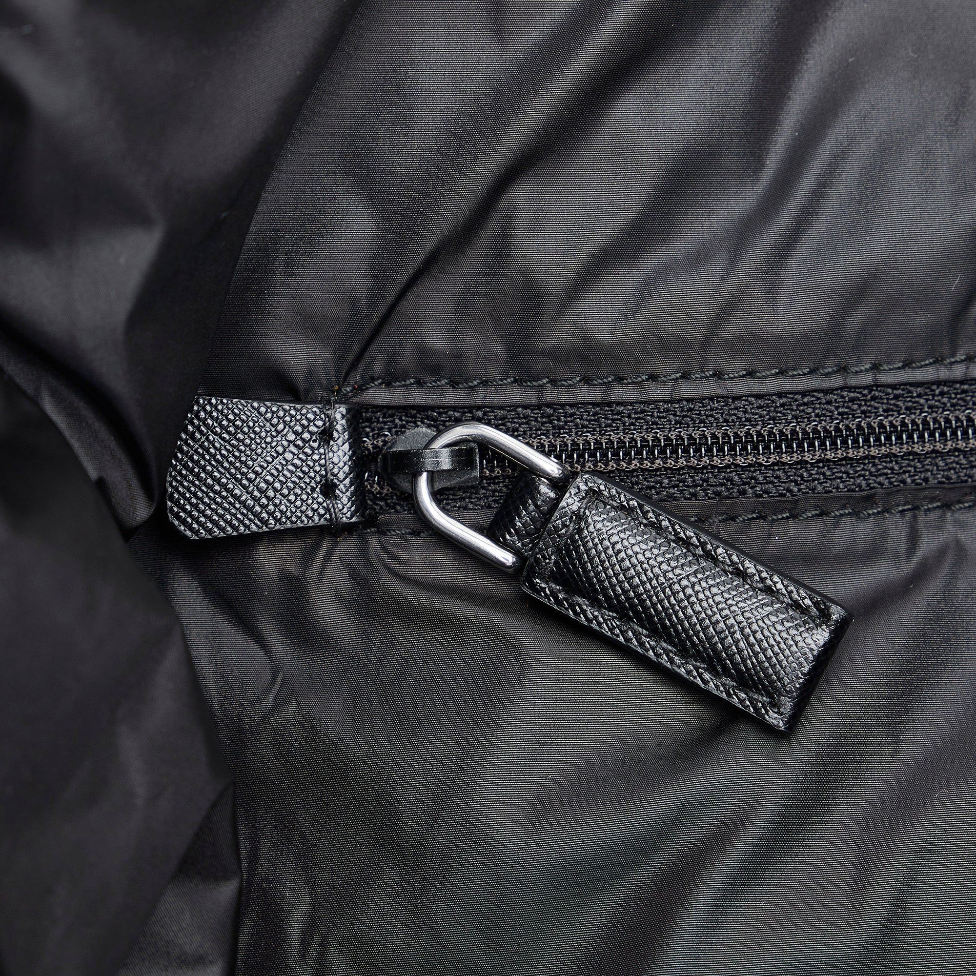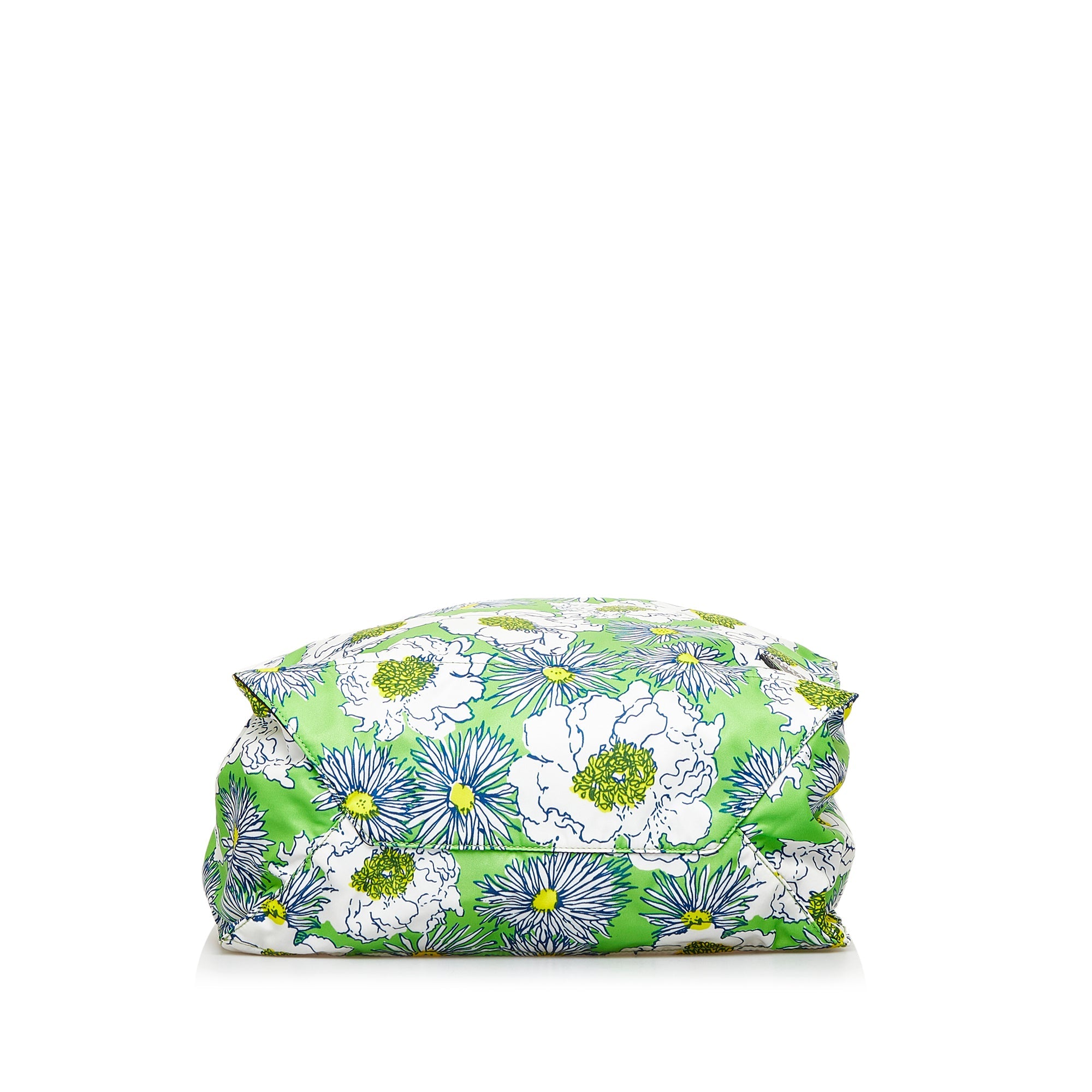 Product Details: Green Prada Tessuto Stampato Tote. This tote bag features a printed nylon body, flat leather handles, an open top, and an interior zip pocket. 14.2″ L x 13.8″ W x 7.1″ D, 5.1″ drop.