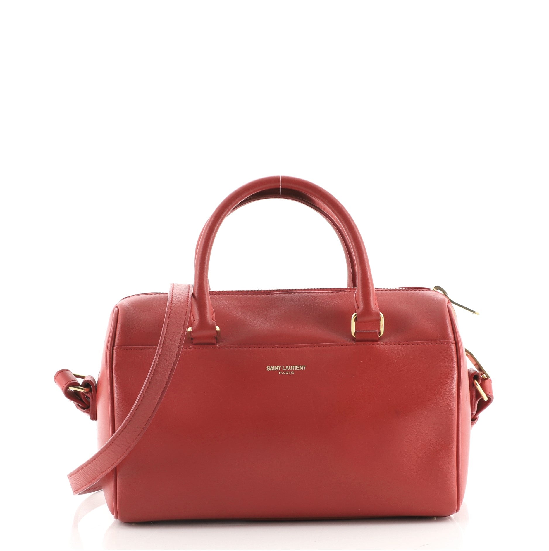 Condition: Fair. Creasing, wear and heavy scuffs on exterior, handles and strap, heavy cracking and slight peeling on handle wax edges, cracking on strap wax edges. Moderate wear, small marks and pen marks in interior, scratches and discoloration on hardware.