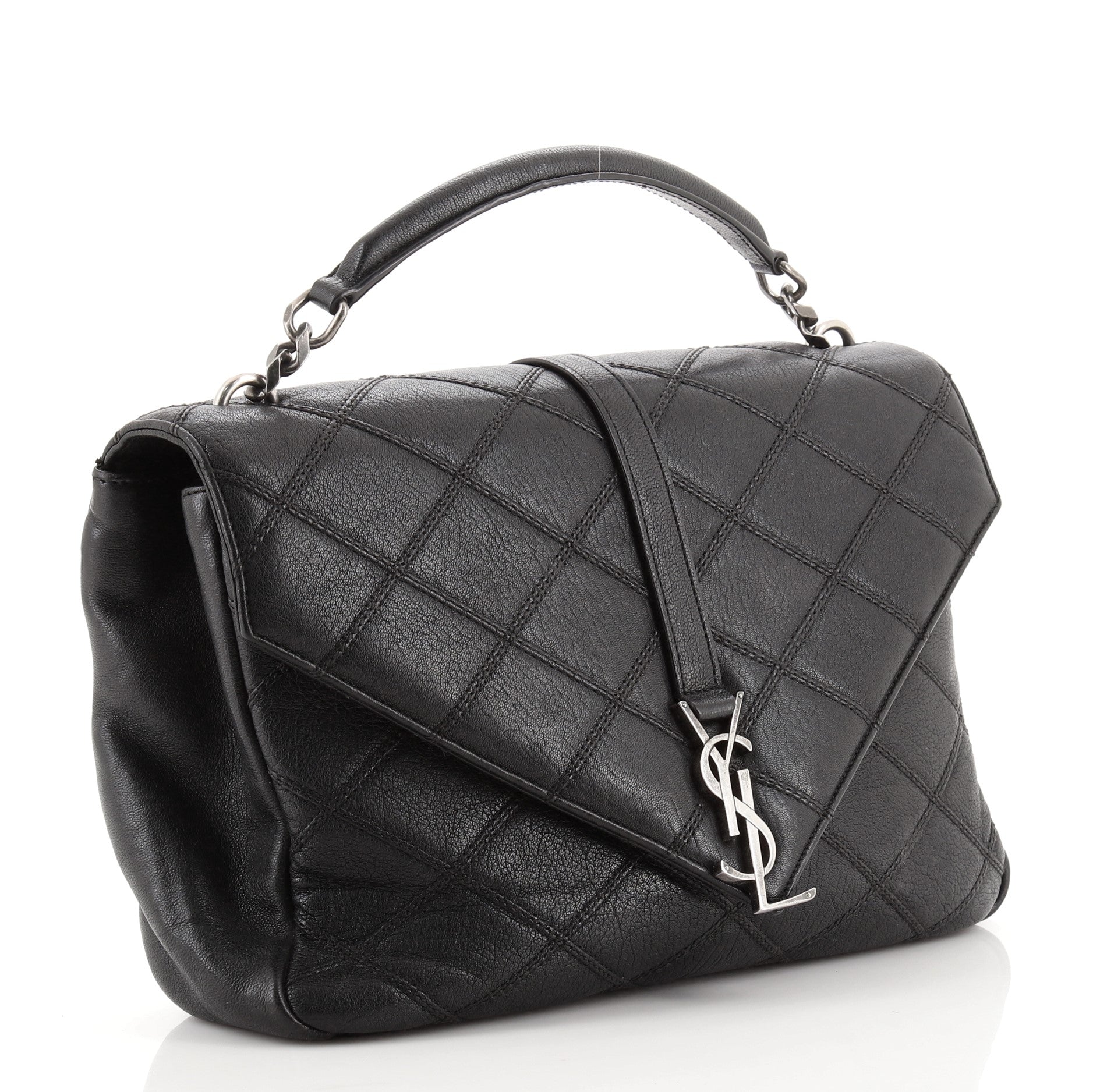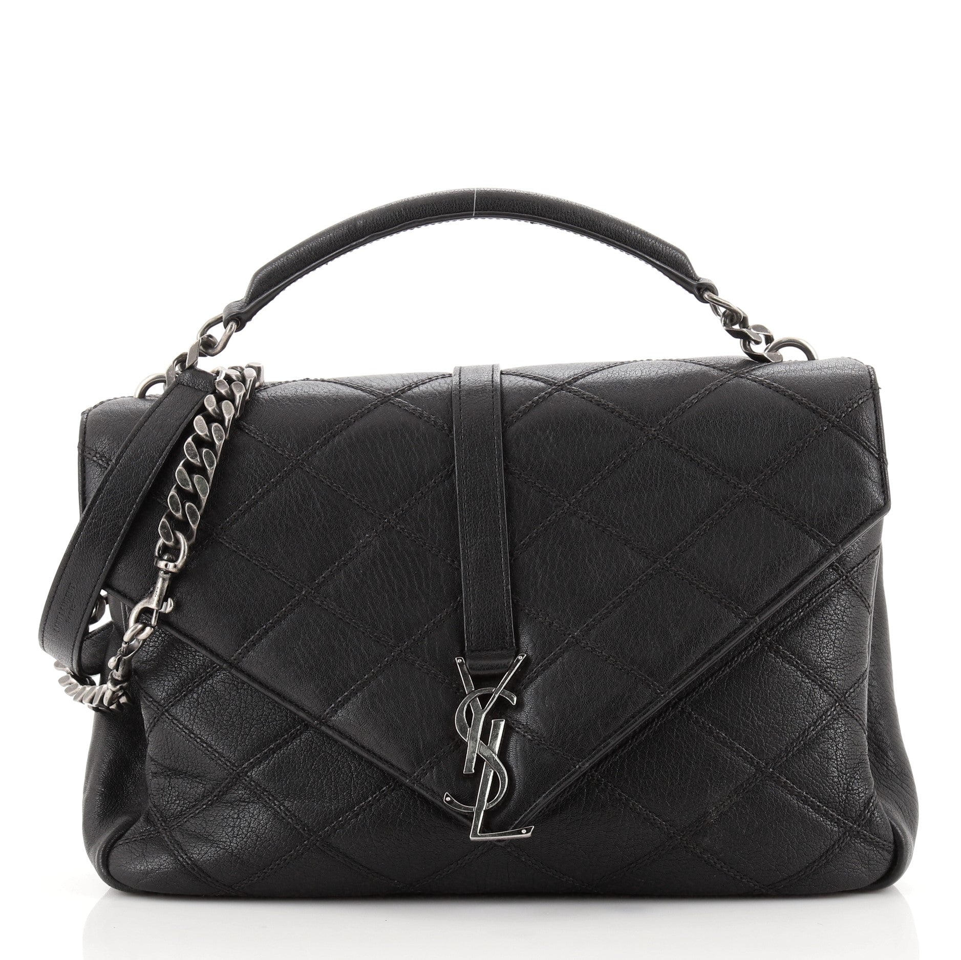Condition: Good. Creasing on exterior and underneath flap, wear on exterior, flap edges and handle. Scuffs underneath flap, moderate stains and discoloration in interior, scratches on hardware.