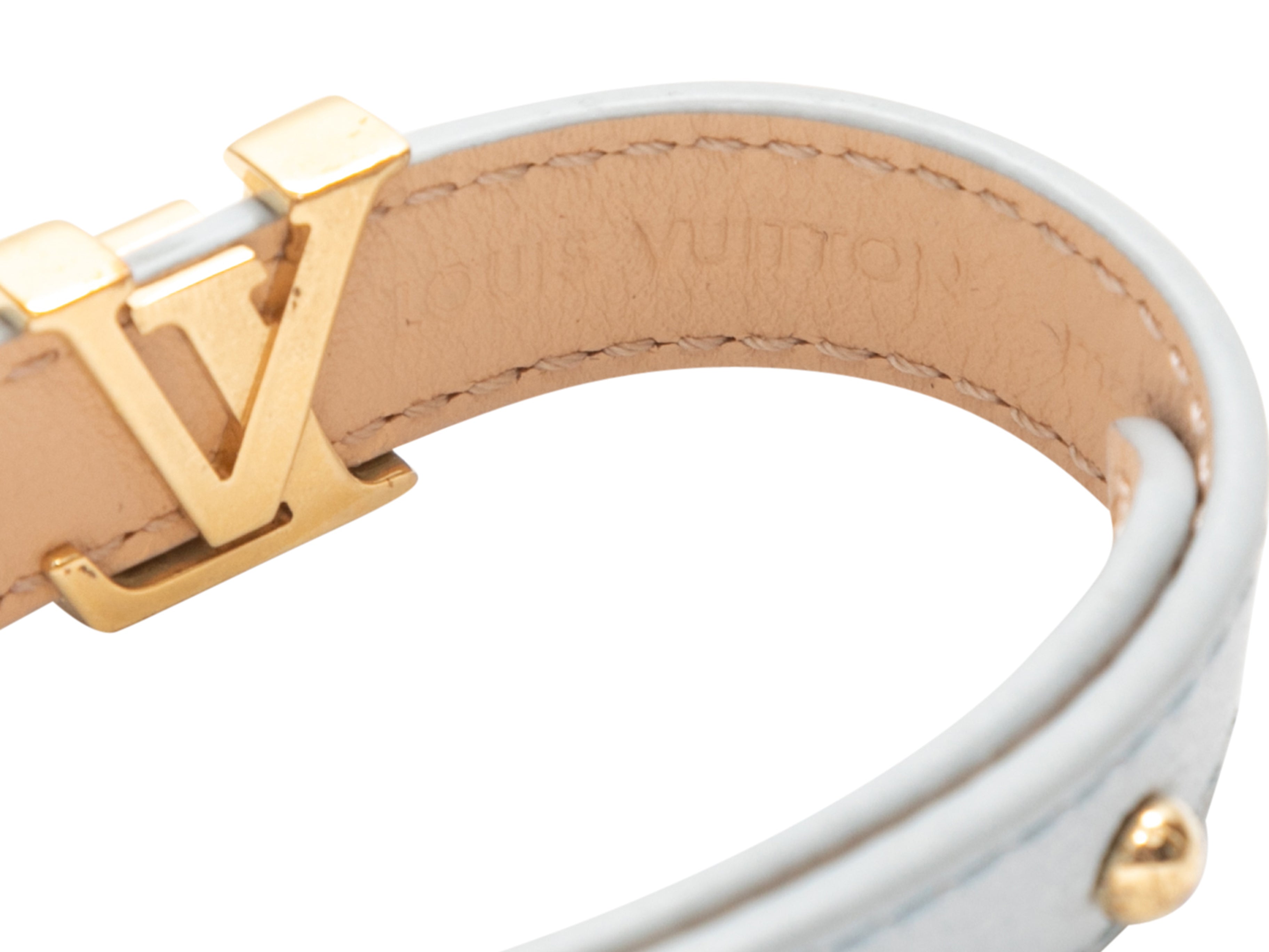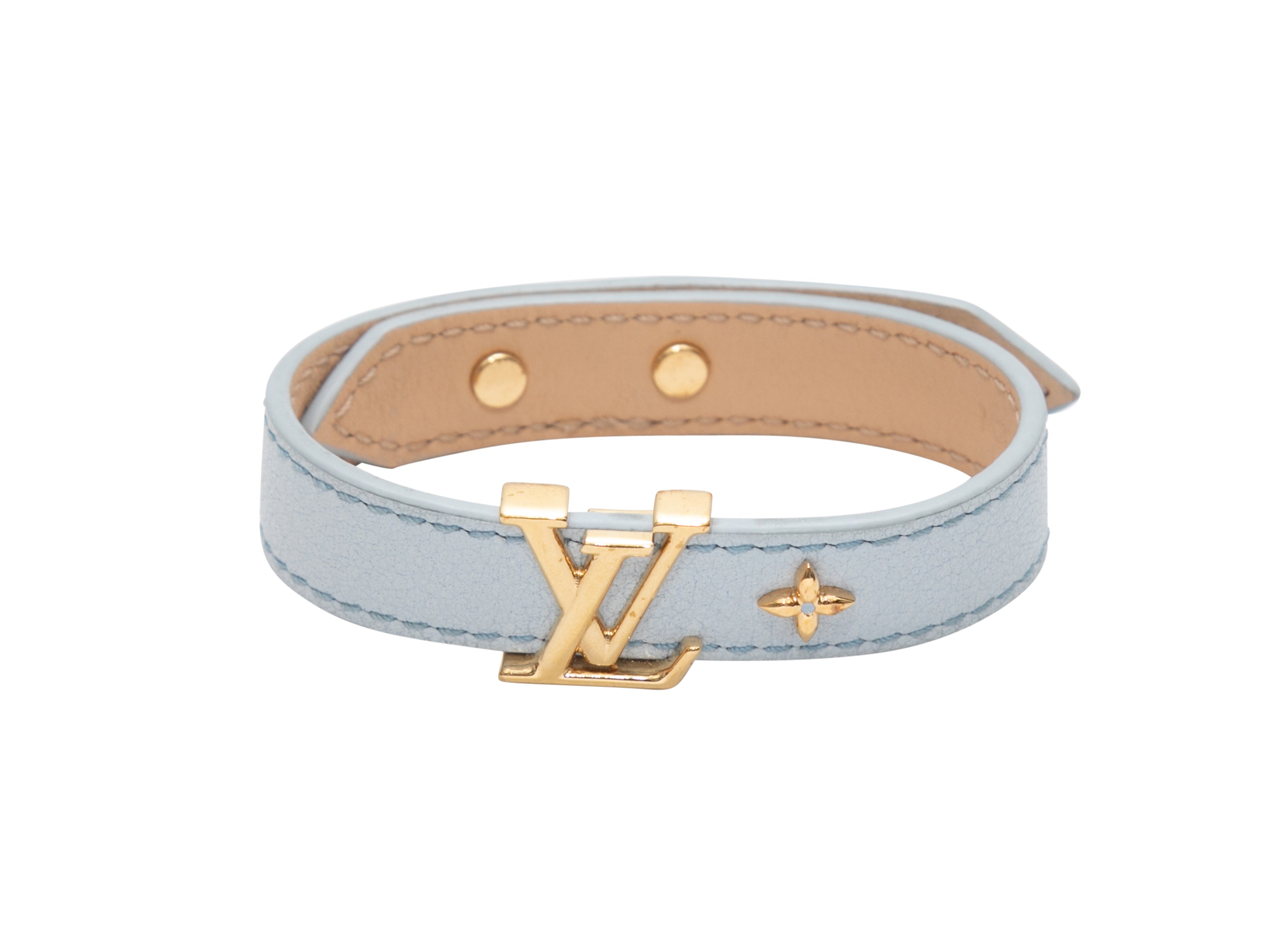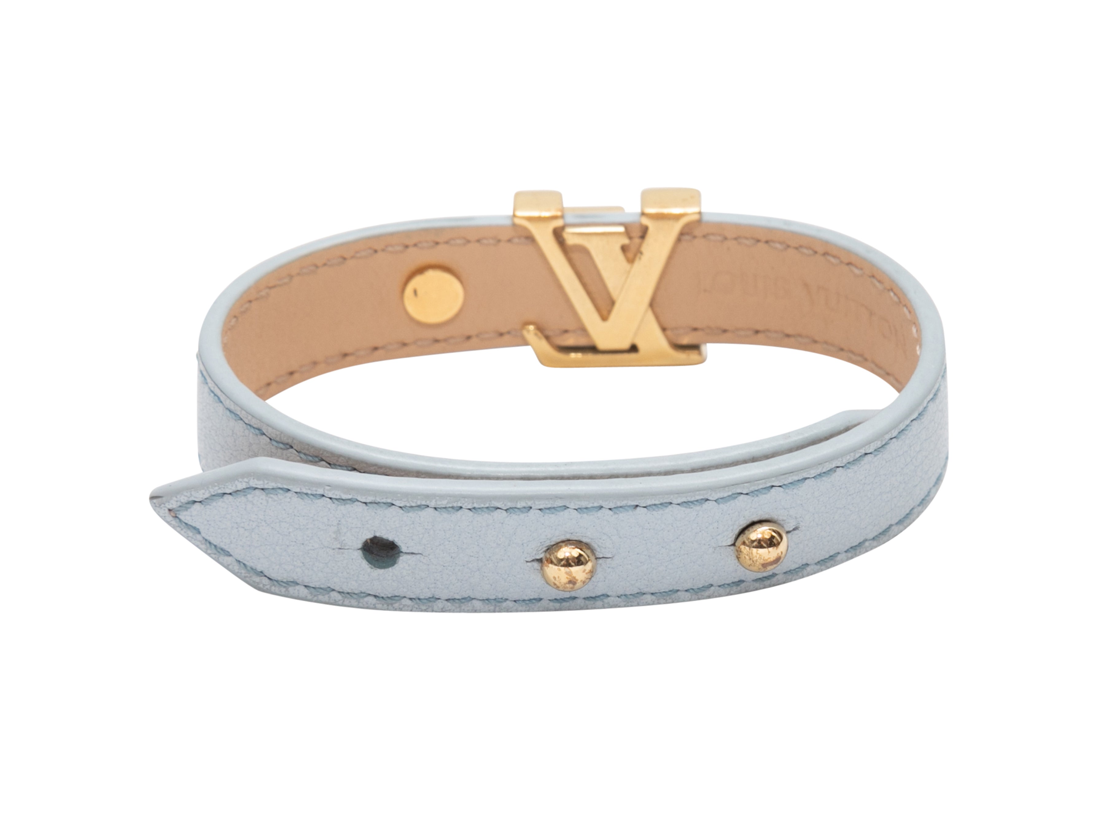 Product Details: Light blue leather logo bracelet by LV. Gold-tone hardware. Peg-in-hole closure. 0.5″ width, 8.5″ length.