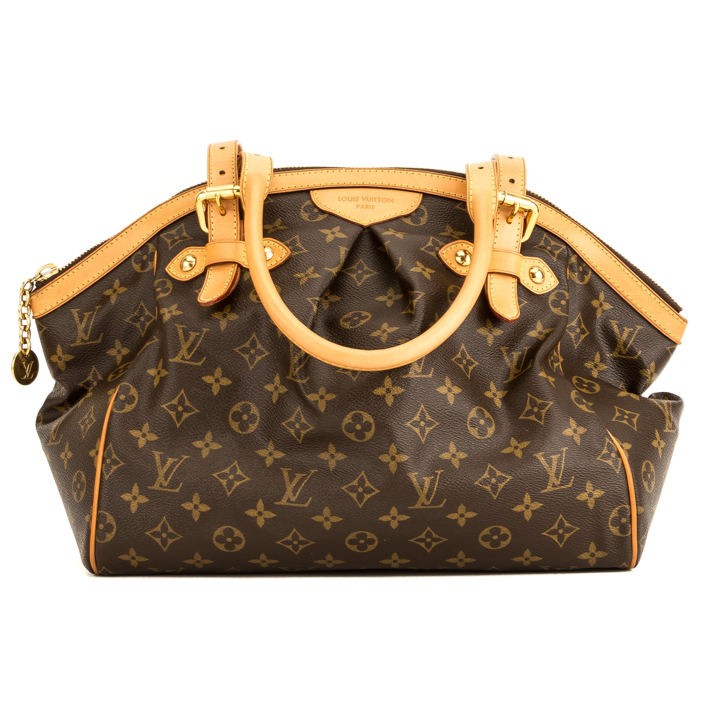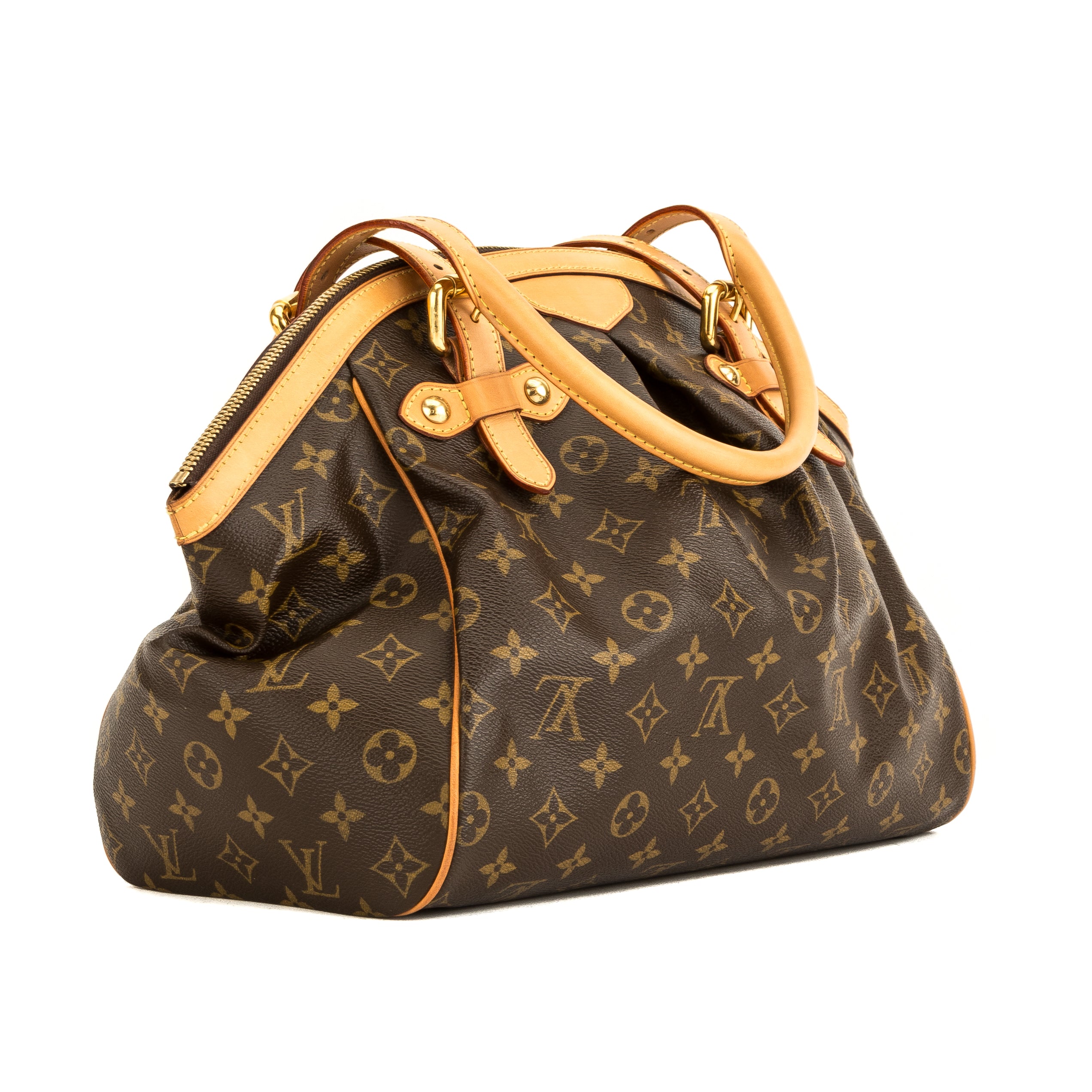 This is an authentic, pre-owned LOUIS VUITTON Tivoli GM Bag. It’s named after the city of Tivoli, Italy. It’s crafted in the Monogram canvas with a pleated front detail, a vachetta leather trim, and adjustable top handles to carry as a tote or shoulder bag. It has golden brass hardware with five studs on the base for support. It has a zip closure with an LV medallion charm and an interior with a brown textile lining, a d-ring, two flat pockets, and a cellphone pocket. This is the largest Tivoli so there’s plenty of space for your daily essentials.