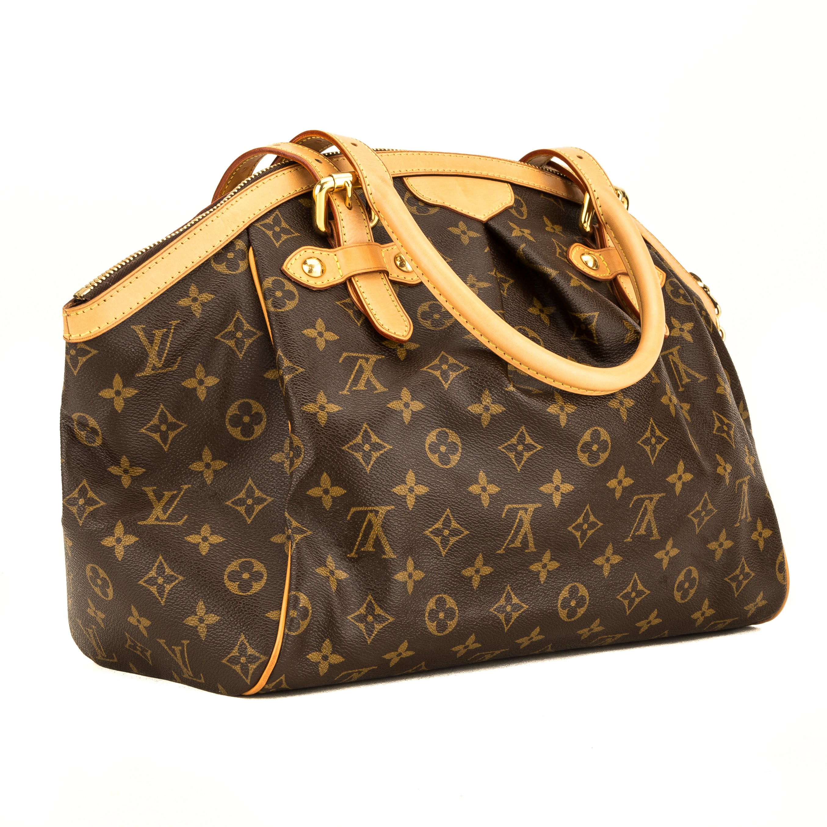 This is an authentic, pre-owned LOUIS VUITTON Tivoli GM Bag. It’s named after the city of Tivoli, Italy. It’s crafted in the Monogram canvas with a pleated front detail, a vachetta leather trim, and adjustable top handles to carry as a tote or shoulder bag. It has golden brass hardware with five studs on the base for support. It has a zip closure with an LV medallion charm and an interior with a brown textile lining, a d-ring, two flat pockets, and a cellphone pocket. This is the largest Tivoli so there’s plenty of space for your daily essentials.