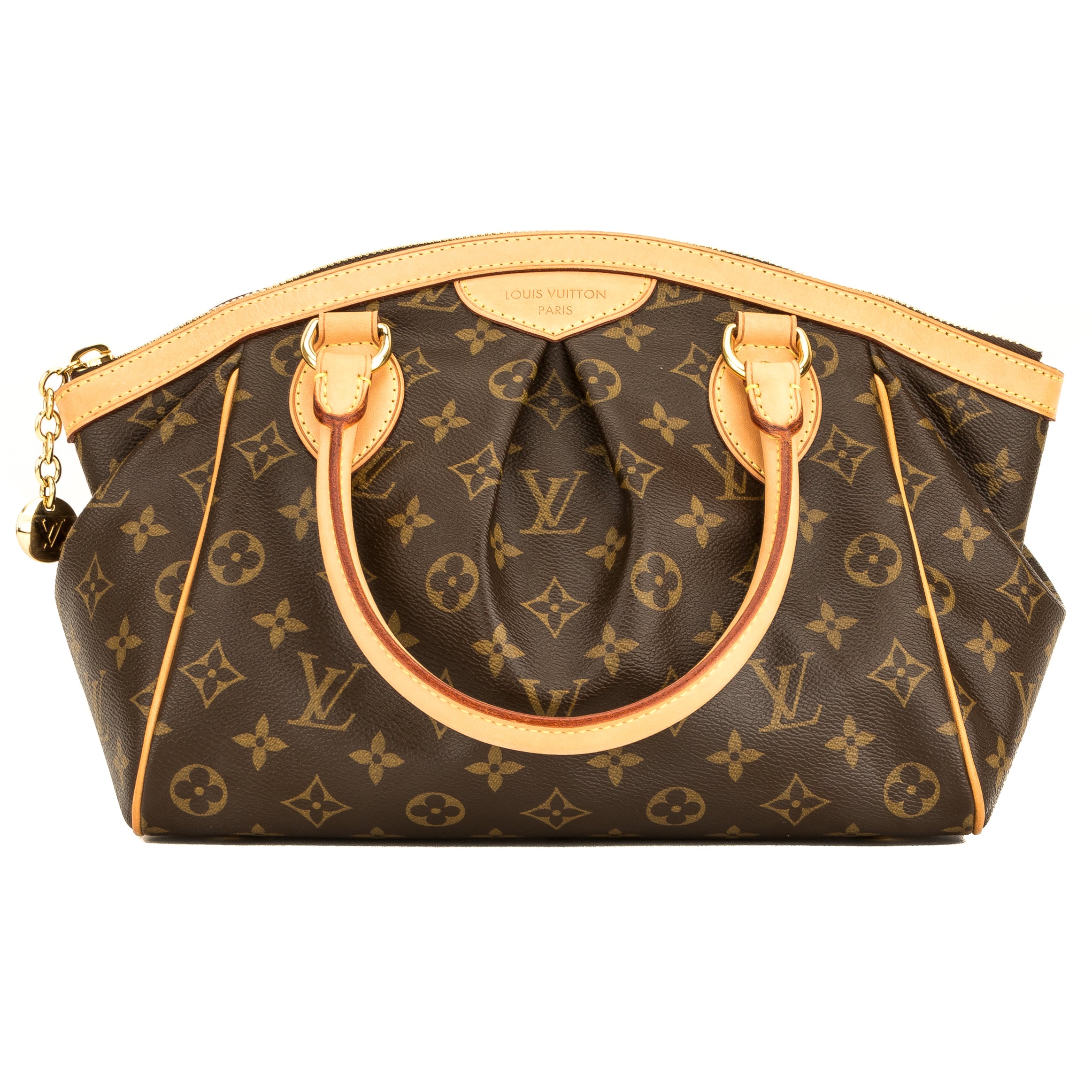 This is an authentic, pre-owned LOUIS VUITTON Tivoli PM Bag. It’s named after the beautiful city of Tivoli, Italy, which garners many tourists. It features the iconic Monogram canvas with a pleated front detail, a natural cowhide leather trim, and rolled top handles. It has golden brass hardware, including five studs on the base for support. It has a zip closure with an LV medallion charm and opens to a rich brown textile lining, a flat pocket, and a cellphone pocket. This is the petite Tivoli but it has plenty of space for your necessities. This is a charming bag for every day.
