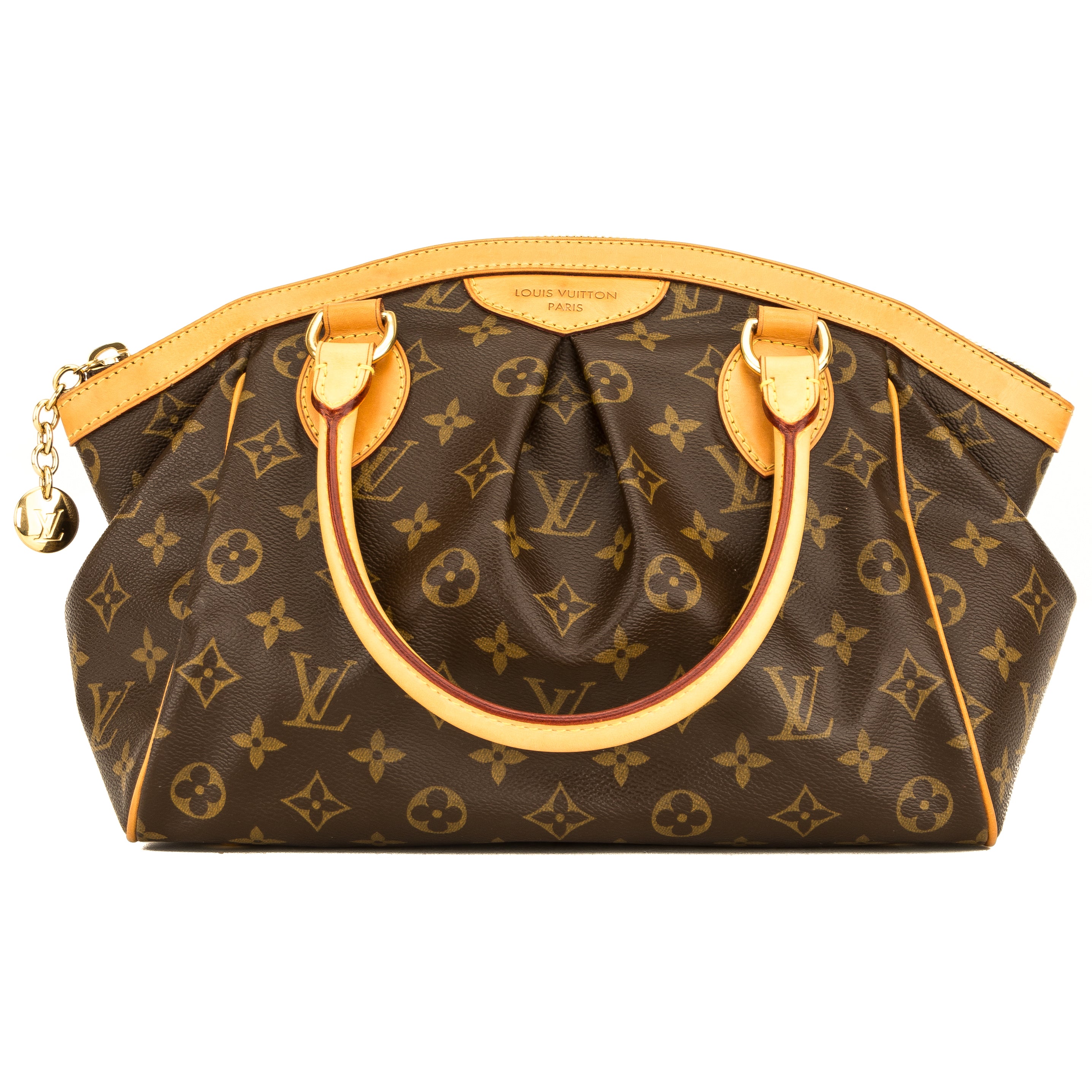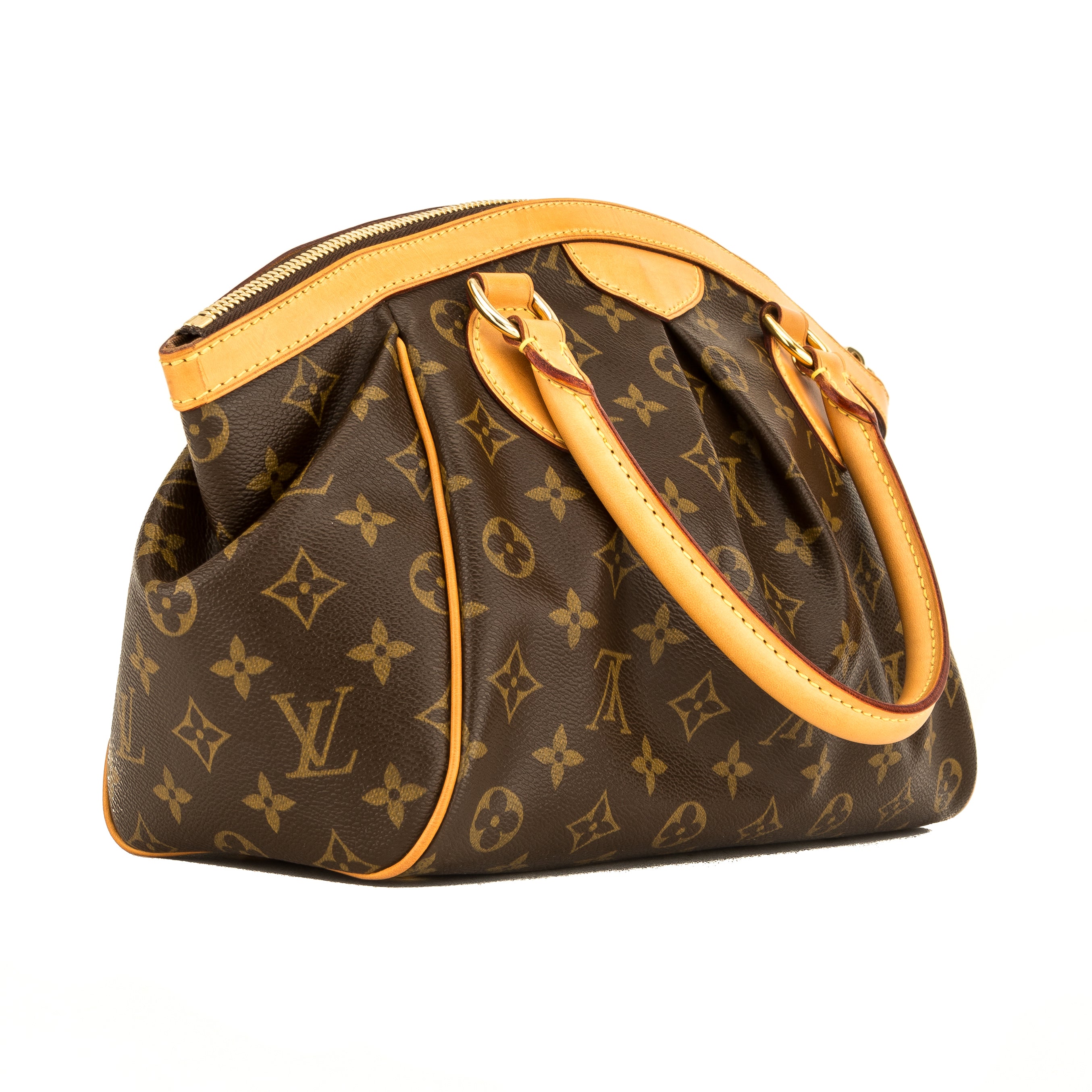 This is an authentic, pre-owned LOUIS VUITTON Tivoli PM Bag. It’s named after the beautiful city of Tivoli, Italy, which garners many tourists. It features the iconic Monogram canvas with a pleated front detail, a natural cowhide leather trim, and rolled top handles. It has golden brass hardware, including five studs on the base for support. It has a zip closure with an LV medallion charm and opens to a rich brown textile lining, a flat pocket, and a cellphone pocket. This is the petite Tivoli but it has plenty of space for your necessities. This is a charming bag for every day.