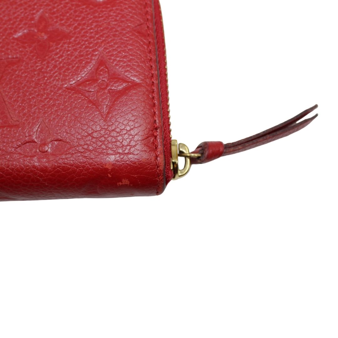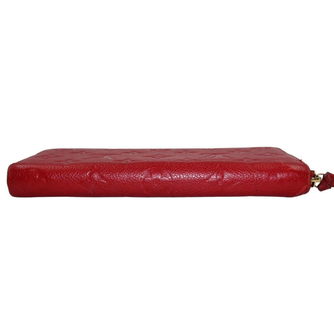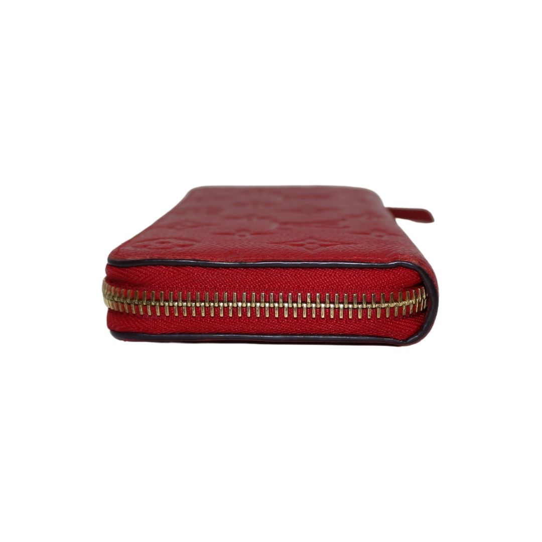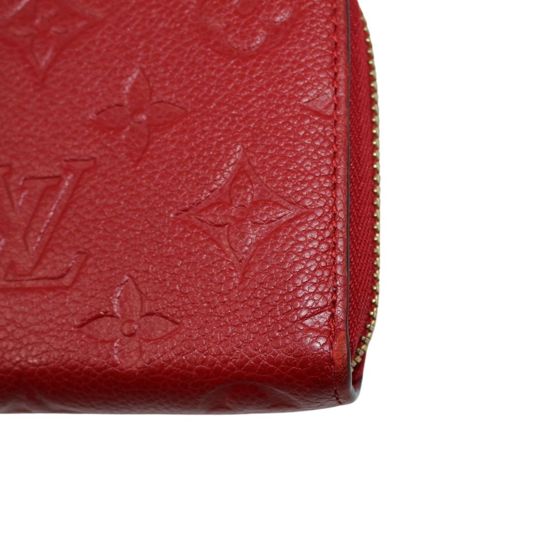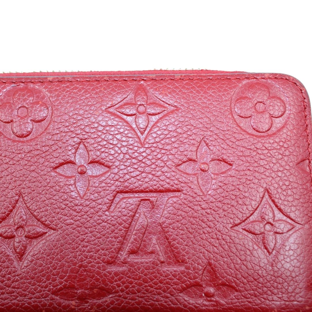 The LV Zip Around Zippy Wallet features luxurious red monogram empreinte leather and elegant gold hardware. With multiple card slots and a removable center compartment, this wallet offers both style and function for the fashion-forward customer.