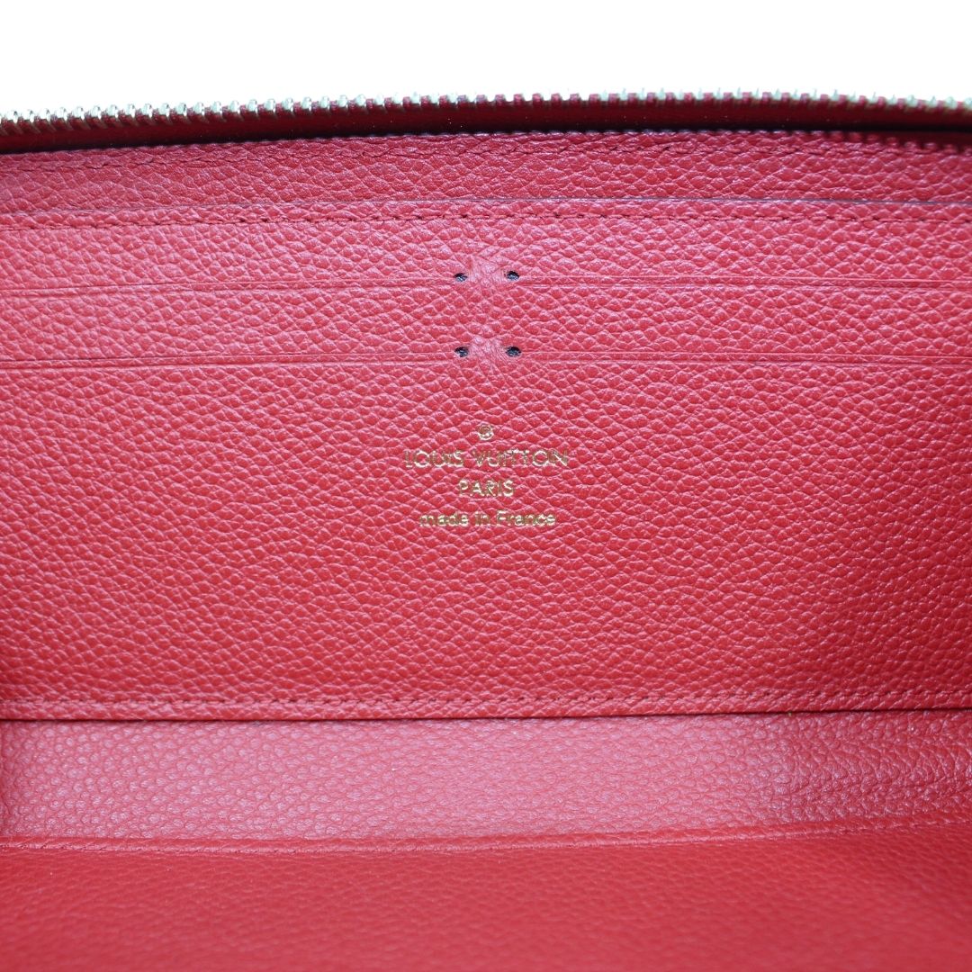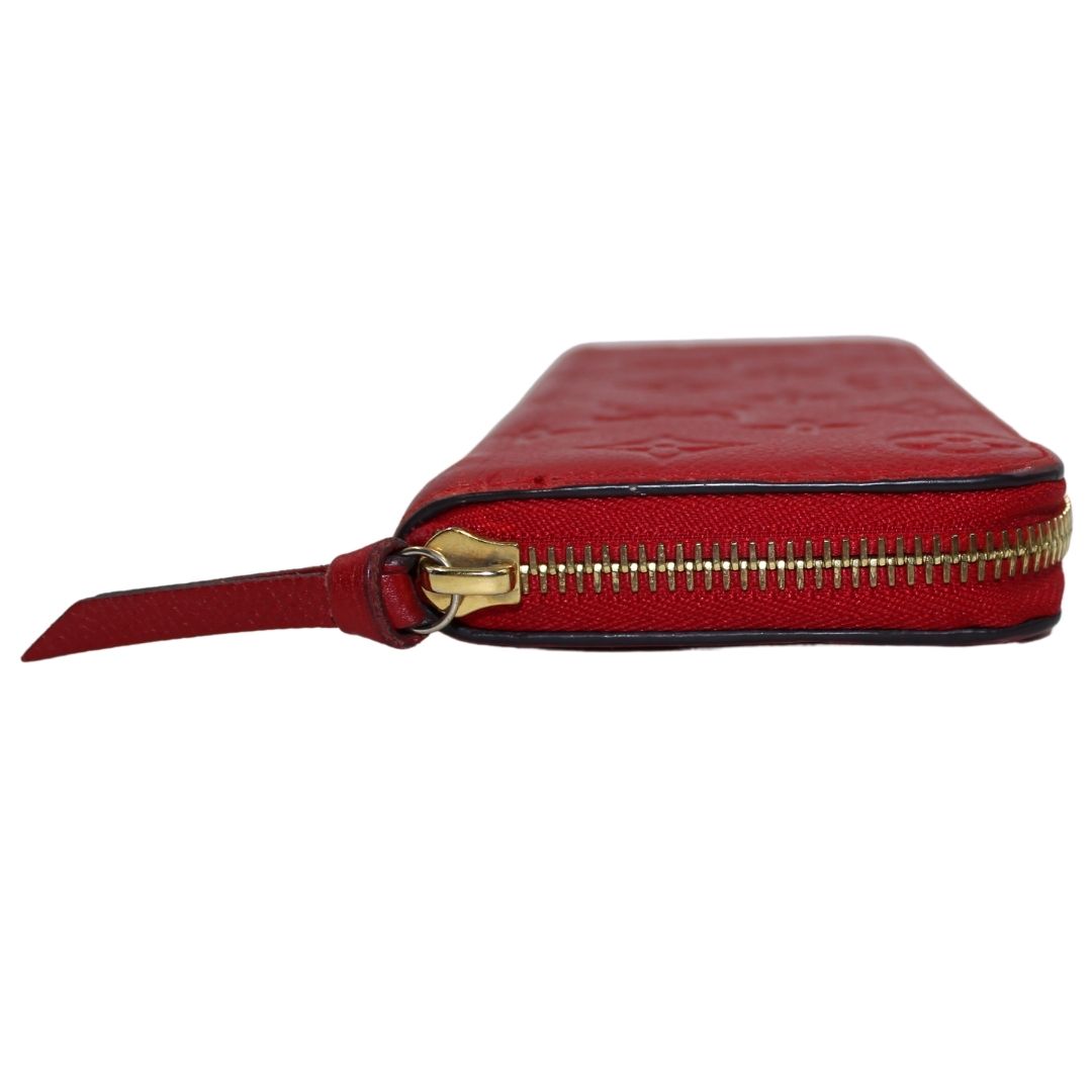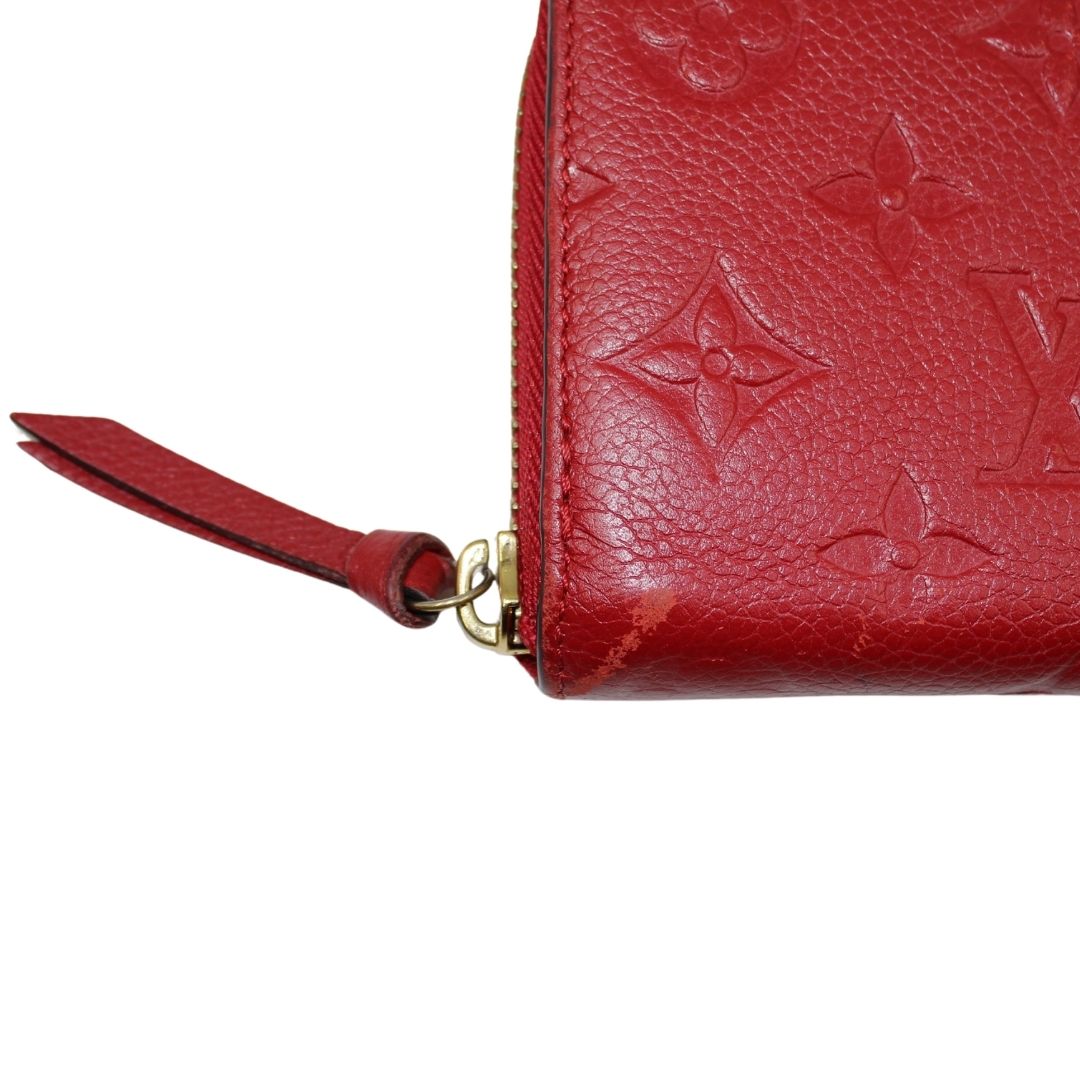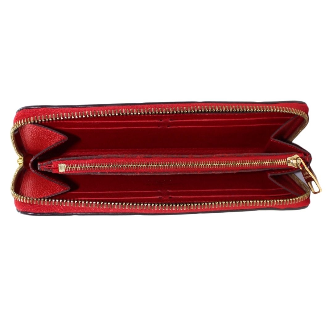 The LV Zip Around Zippy Wallet features luxurious red monogram empreinte leather and elegant gold hardware. With multiple card slots and a removable center compartment, this wallet offers both style and function for the fashion-forward customer.