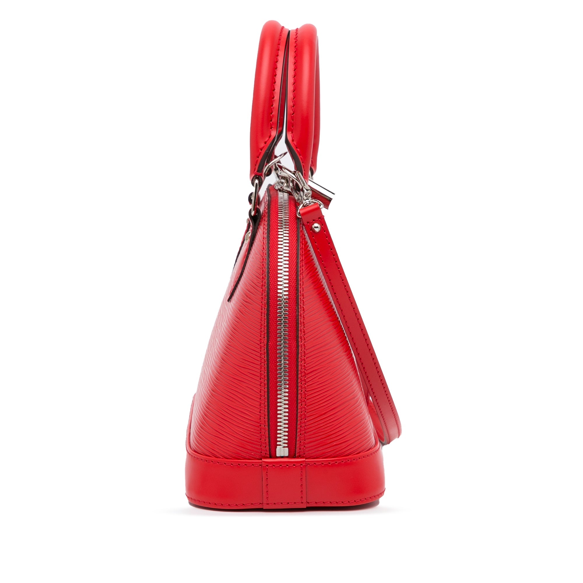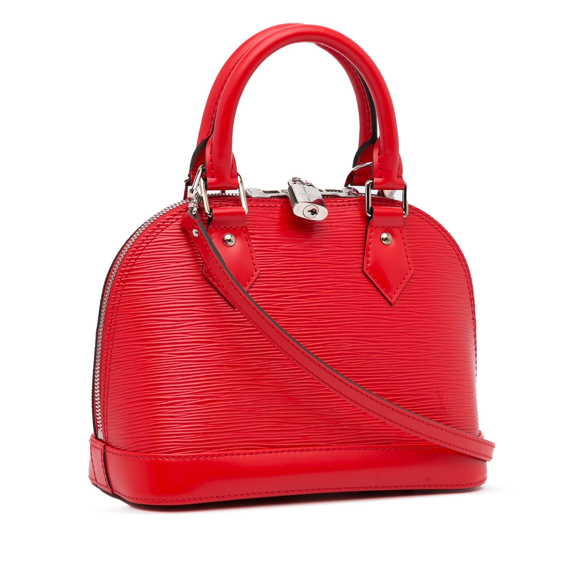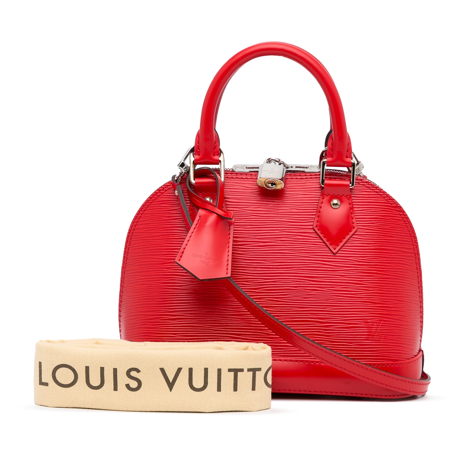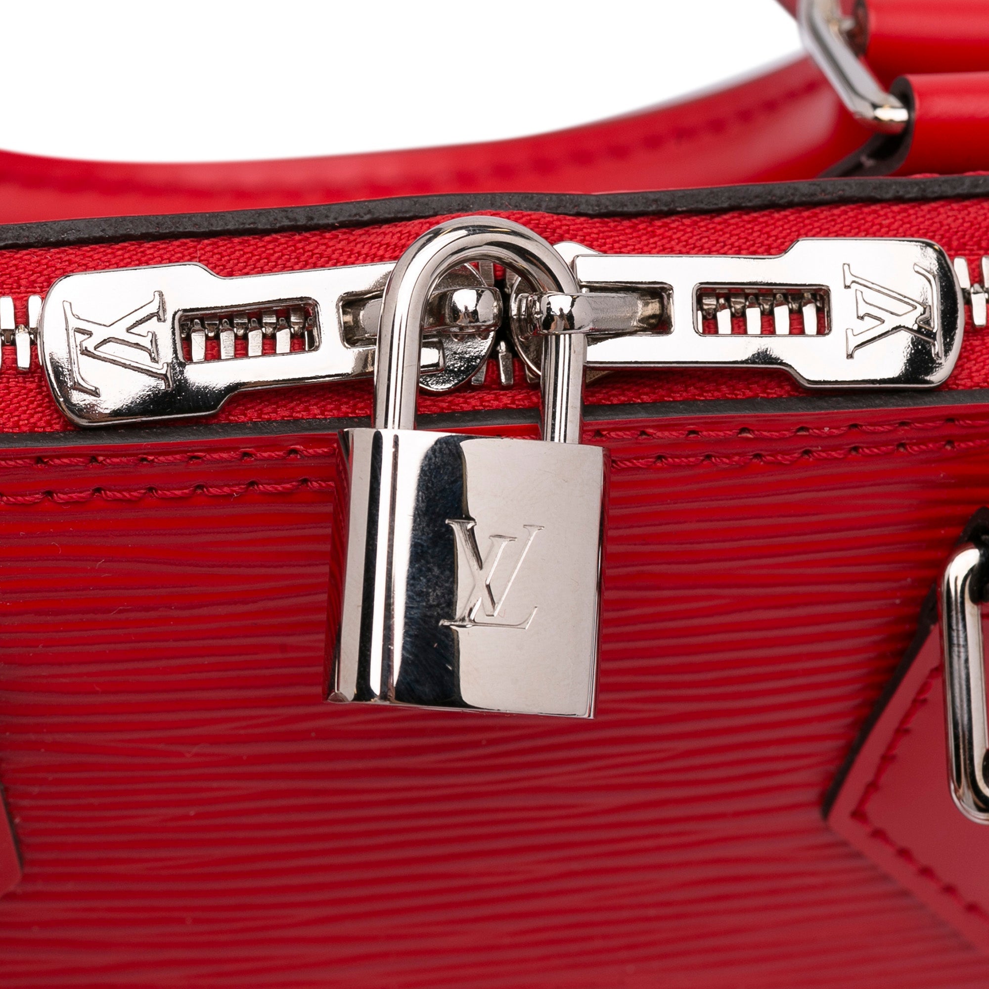 This absolutely irresistible LV Alma in the small BB version is made of fiery red, finely textured Epi leather and features silver details. A silver double zipper shines at the top opening. This can be additionally secured with a small padlock and a key. Inside the Bag has an open slip pocket.