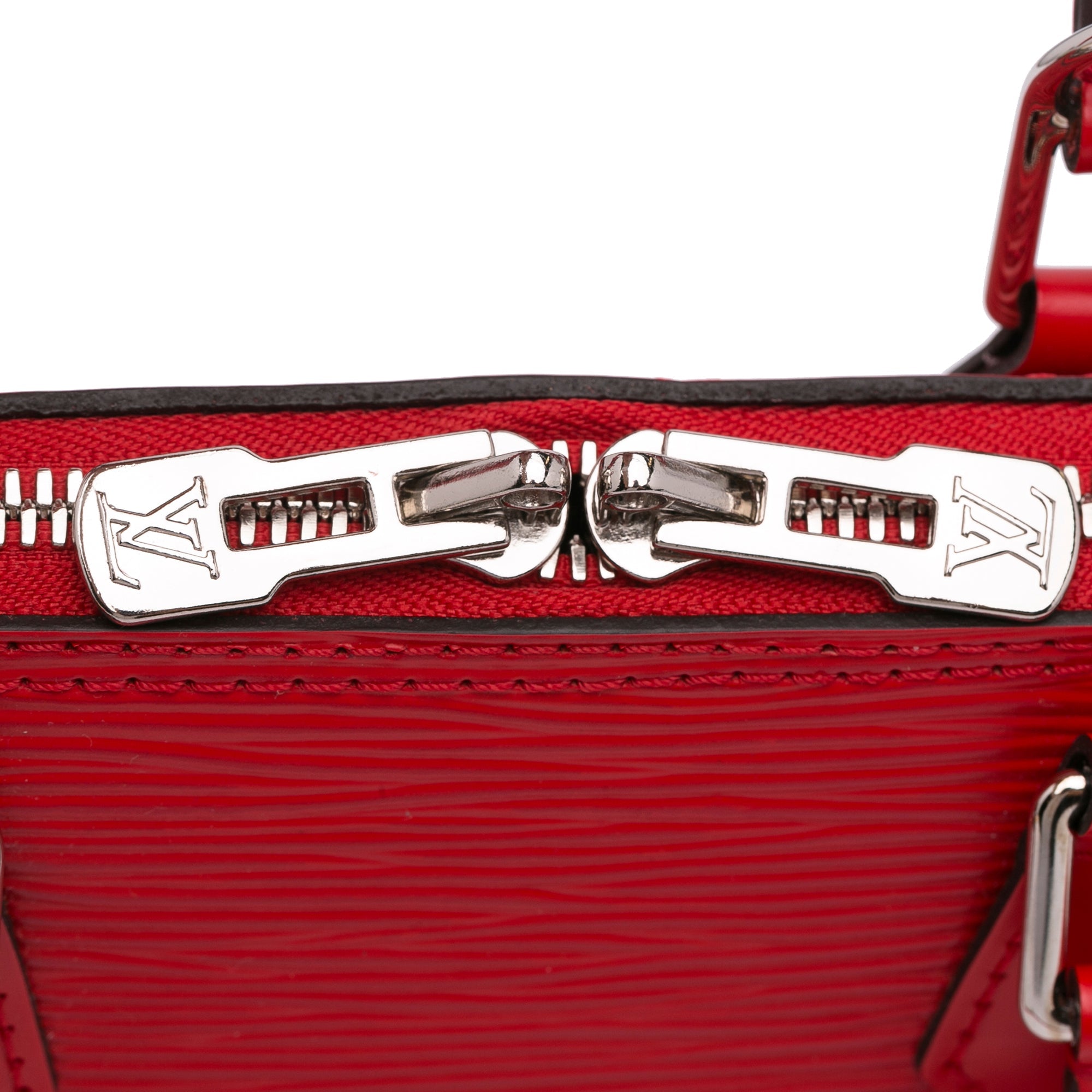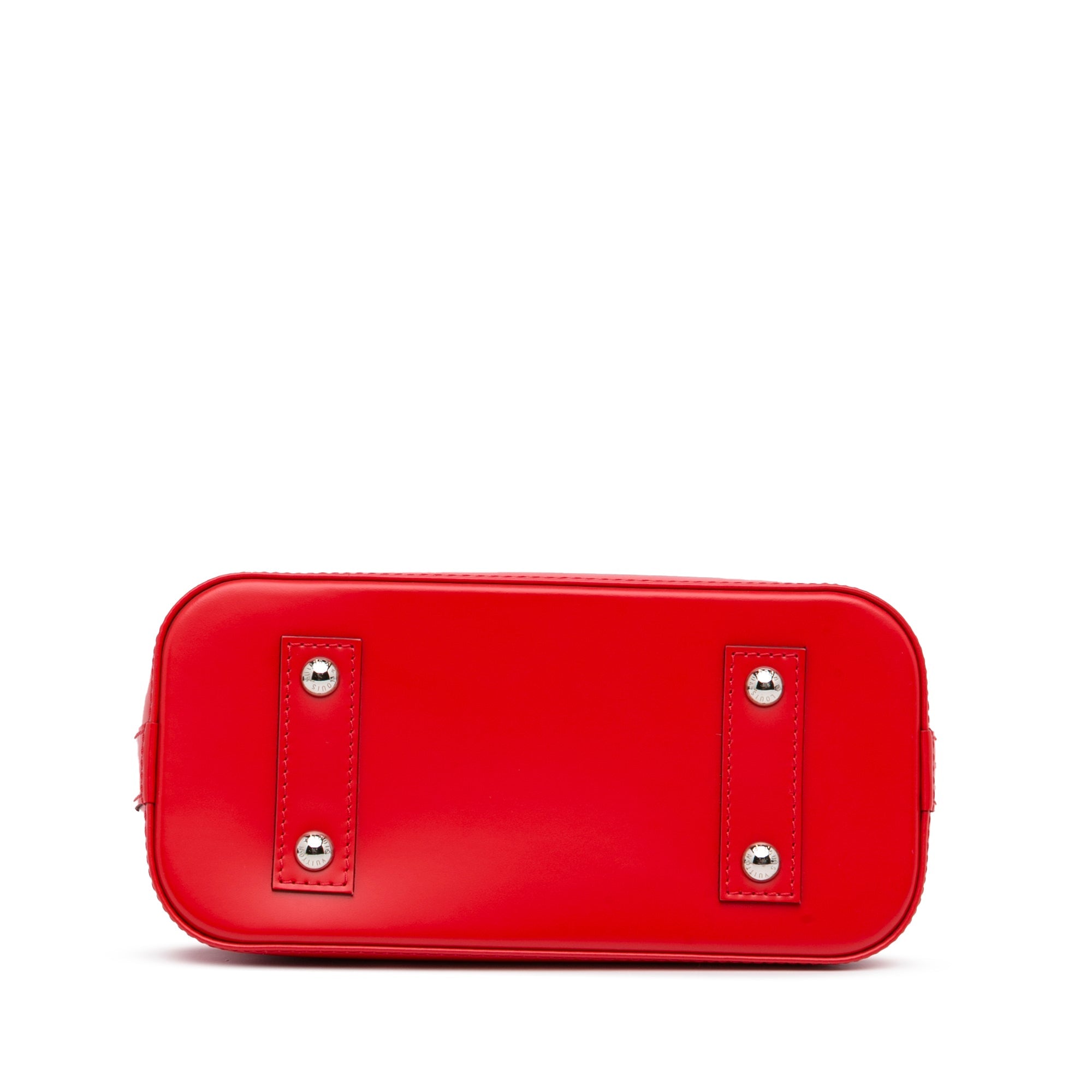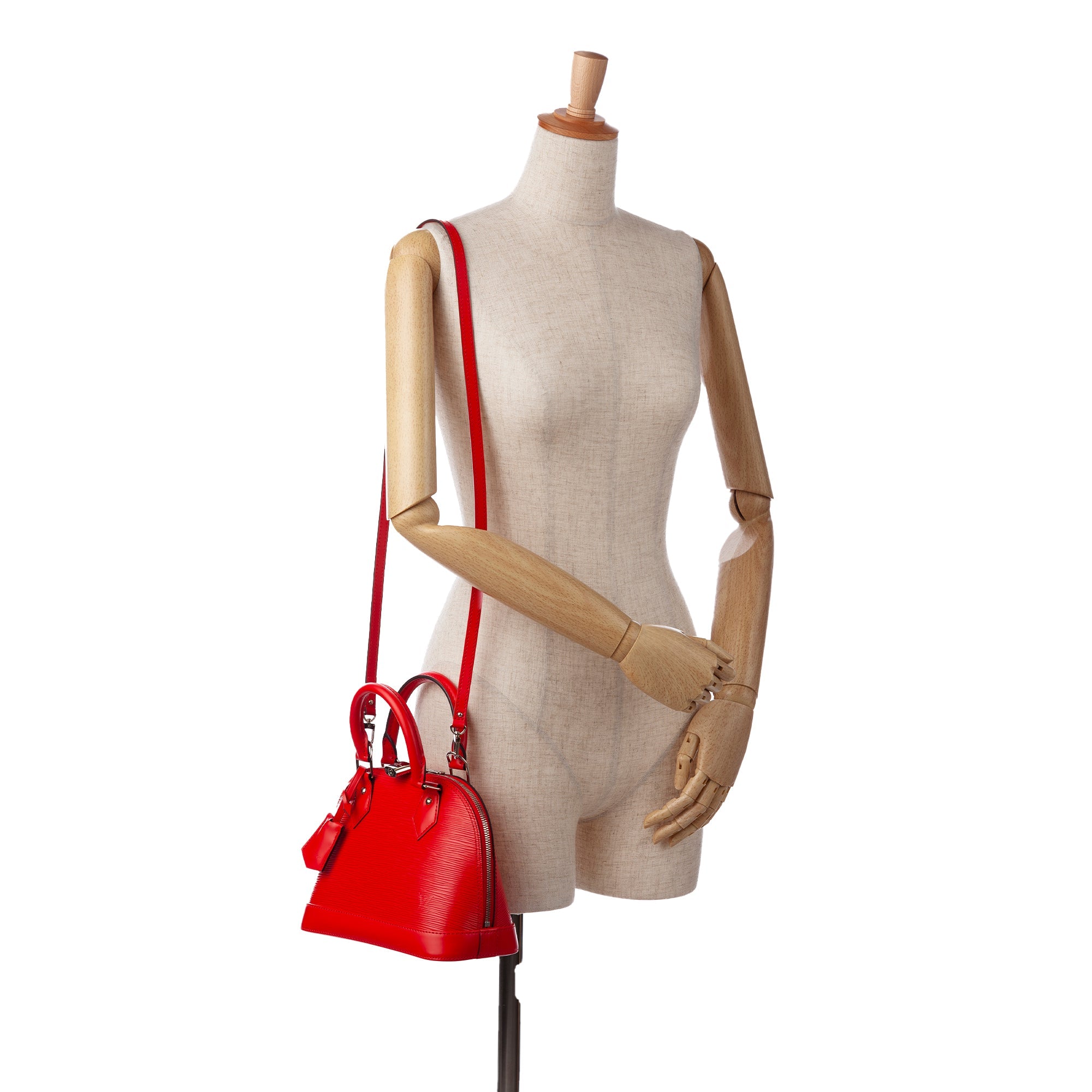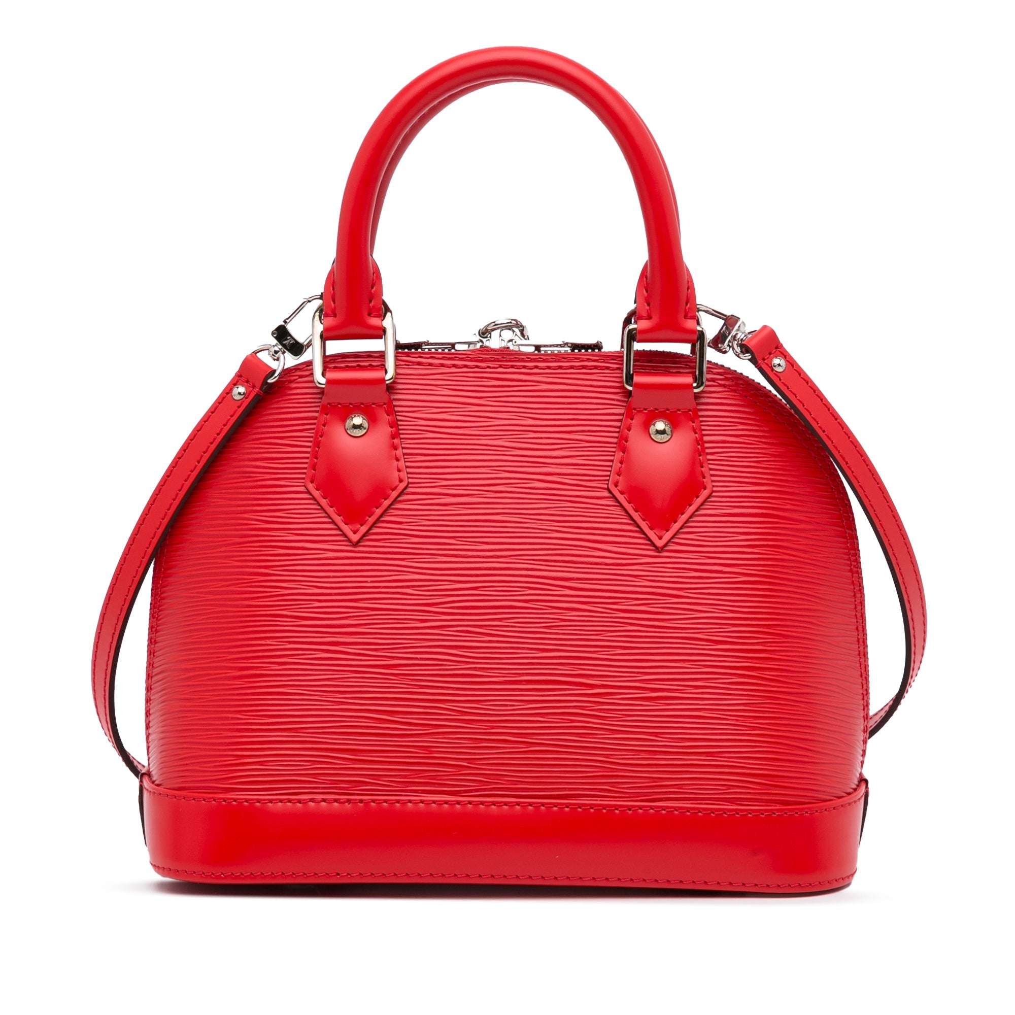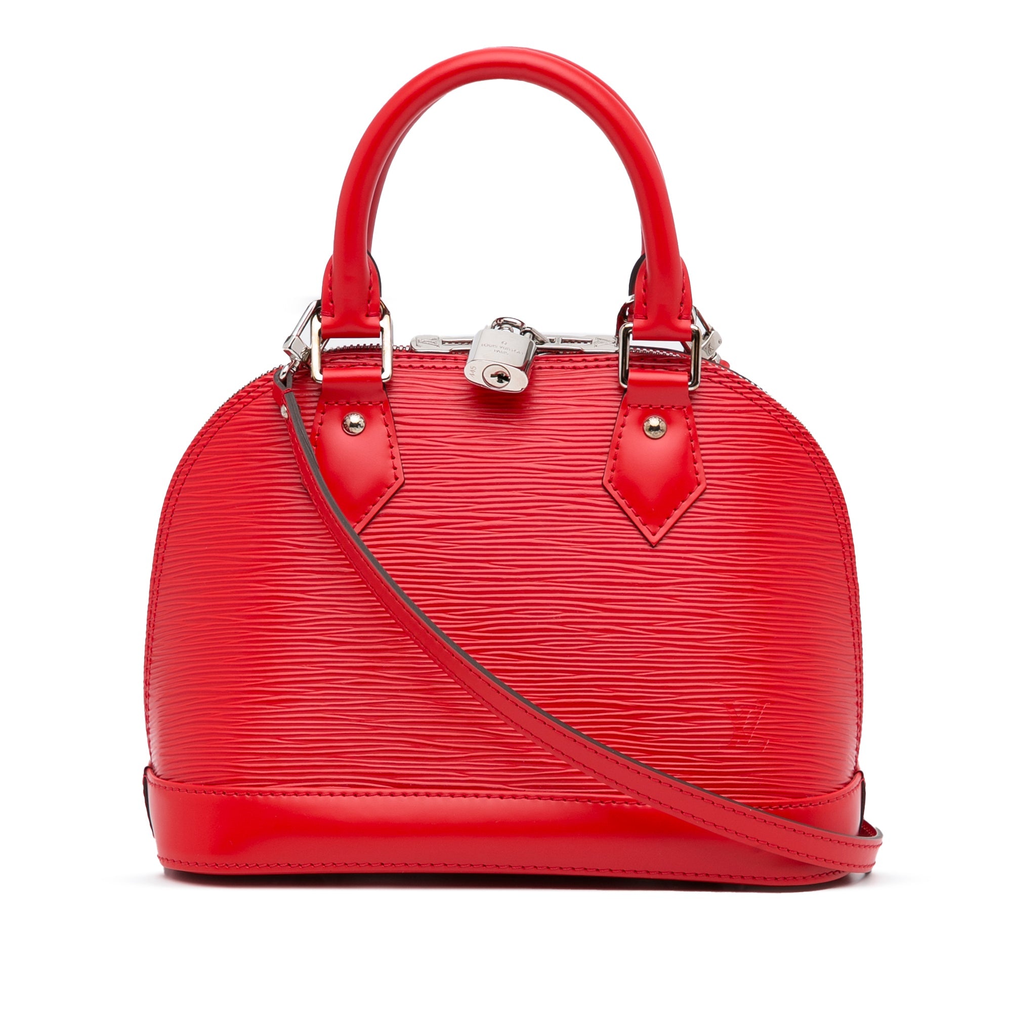 This absolutely irresistible LV Alma in the small BB version is made of fiery red, finely textured Epi leather and features silver details. A silver double zipper shines at the top opening. This can be additionally secured with a small padlock and a key. Inside the Bag has an open slip pocket.