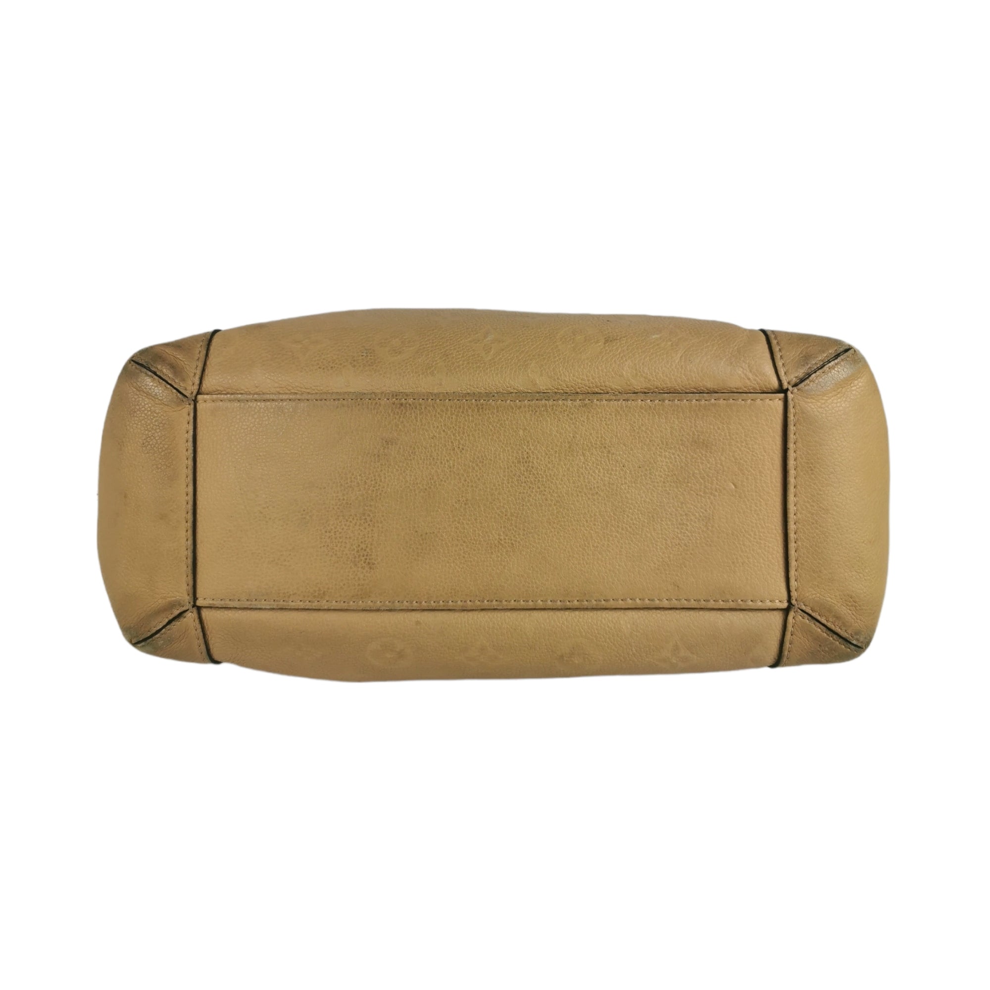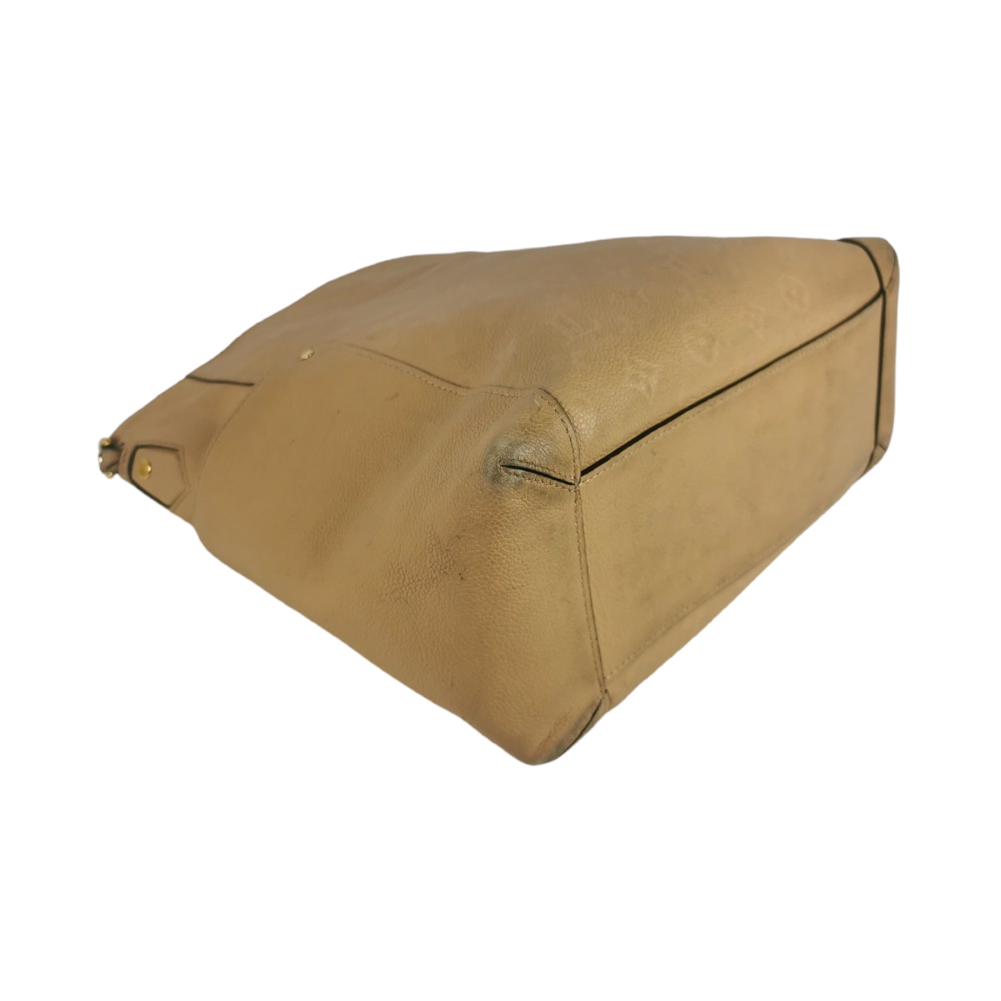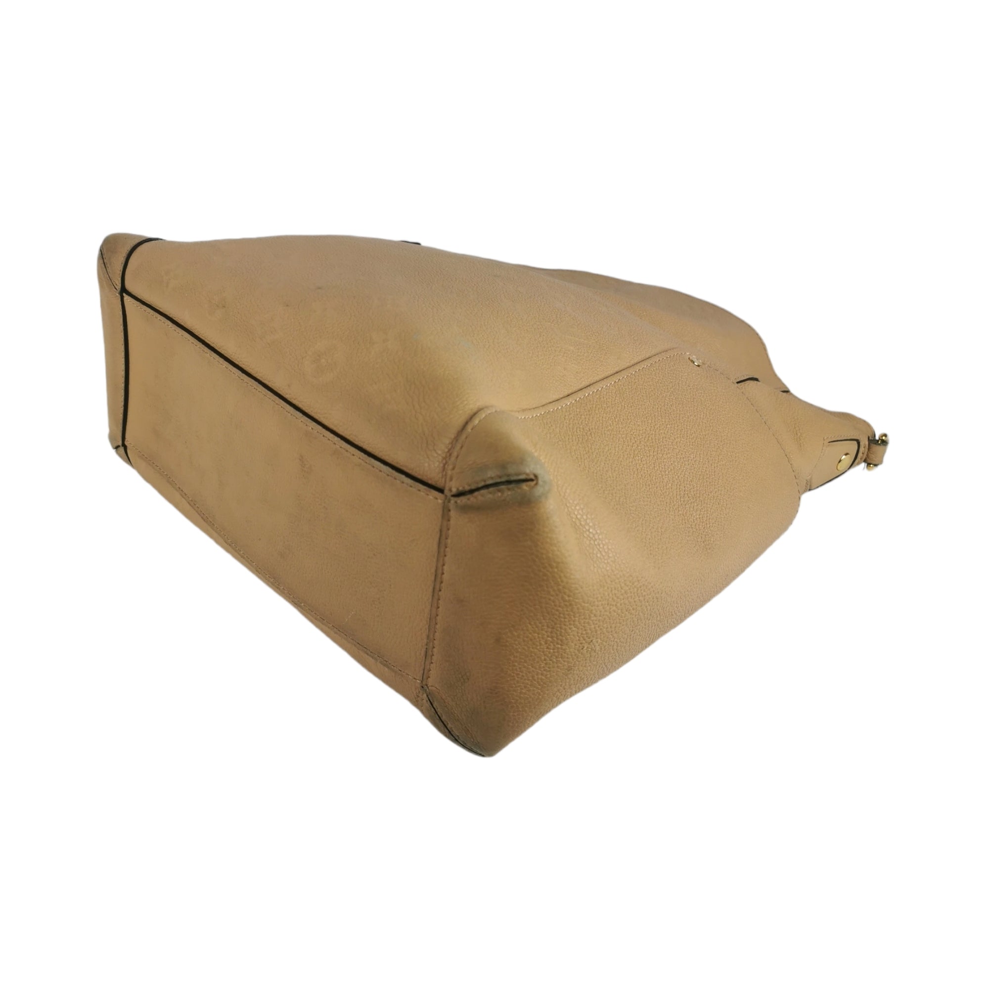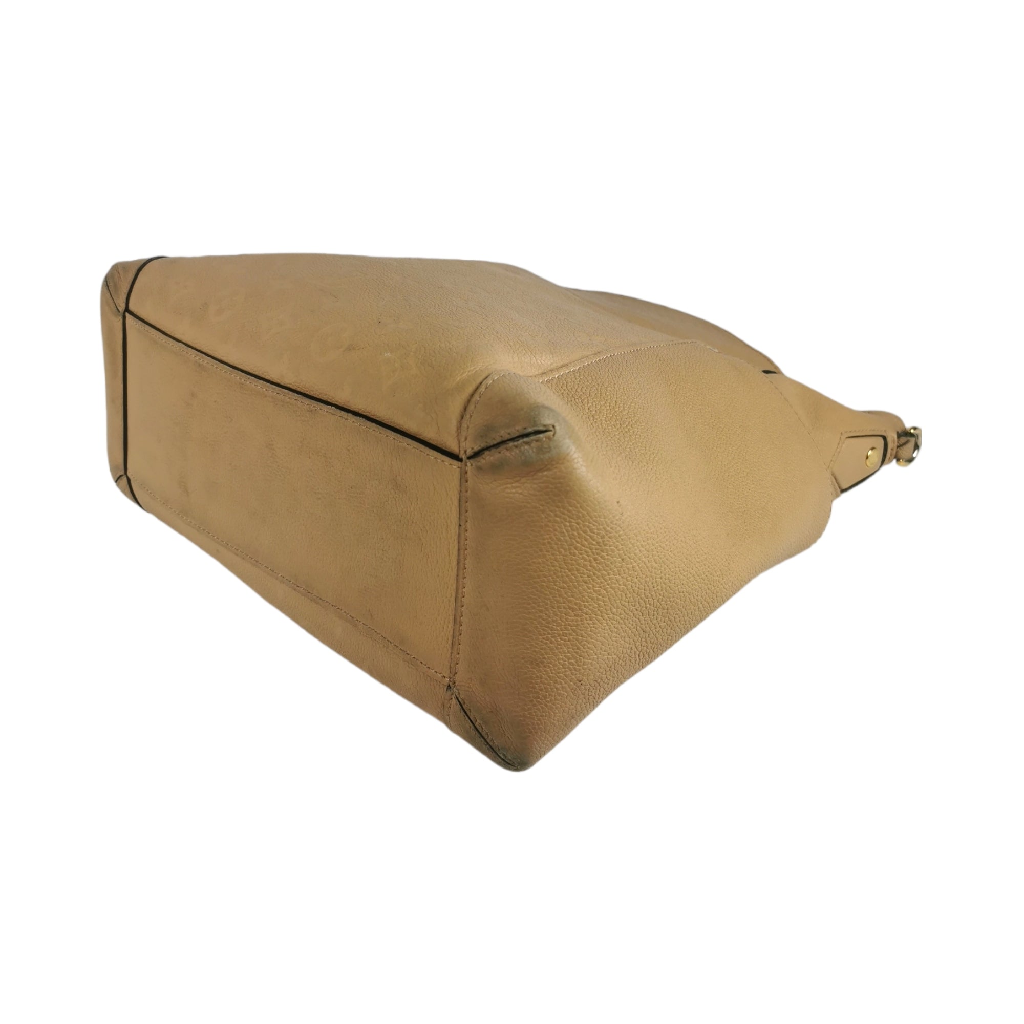 This LV Bagatelle was made from beige Monogram Empreinte leather. The Bag features gold details, a slip pocket on each side, a detachable flat shoulder strap, an open top, and zippered and slip pockets inside.