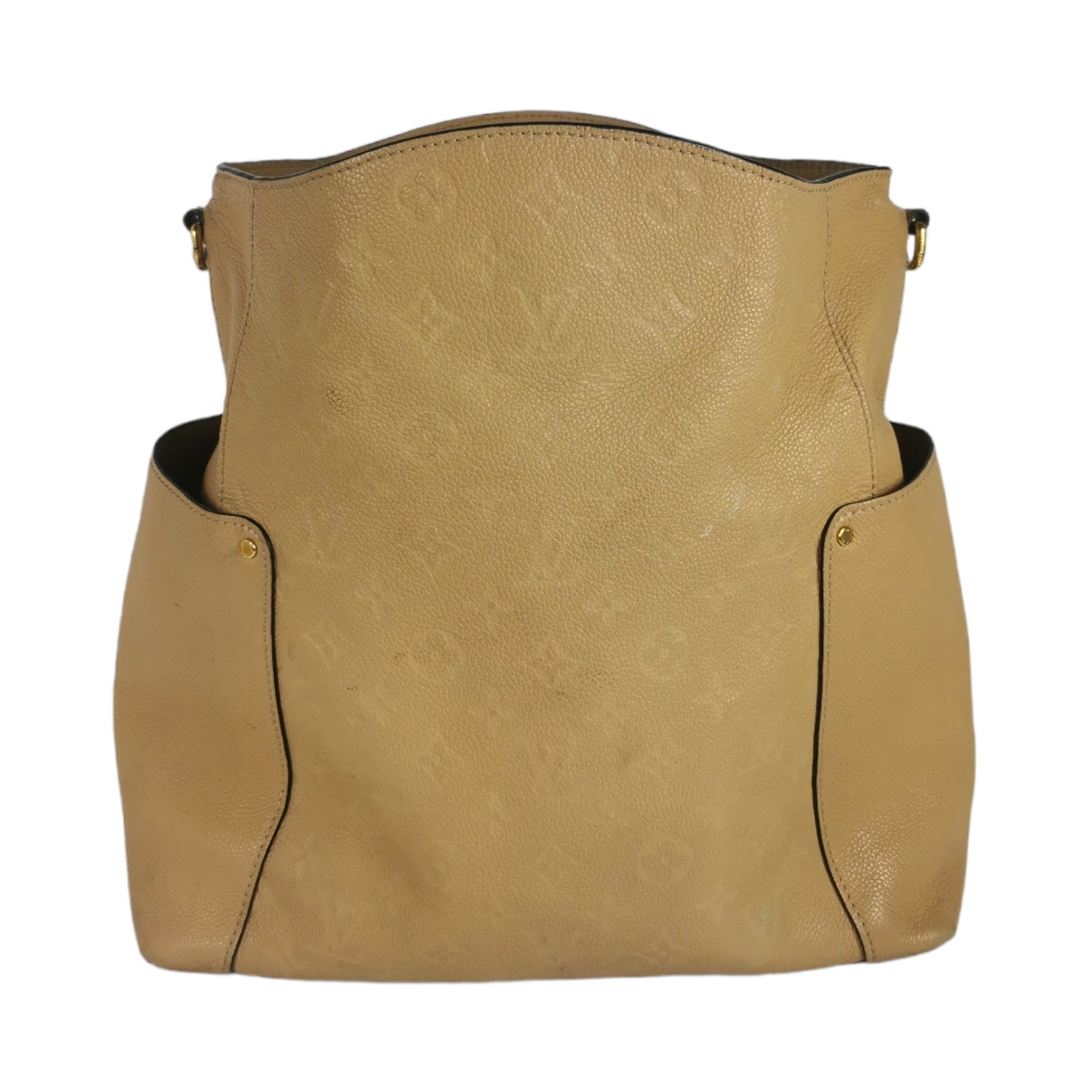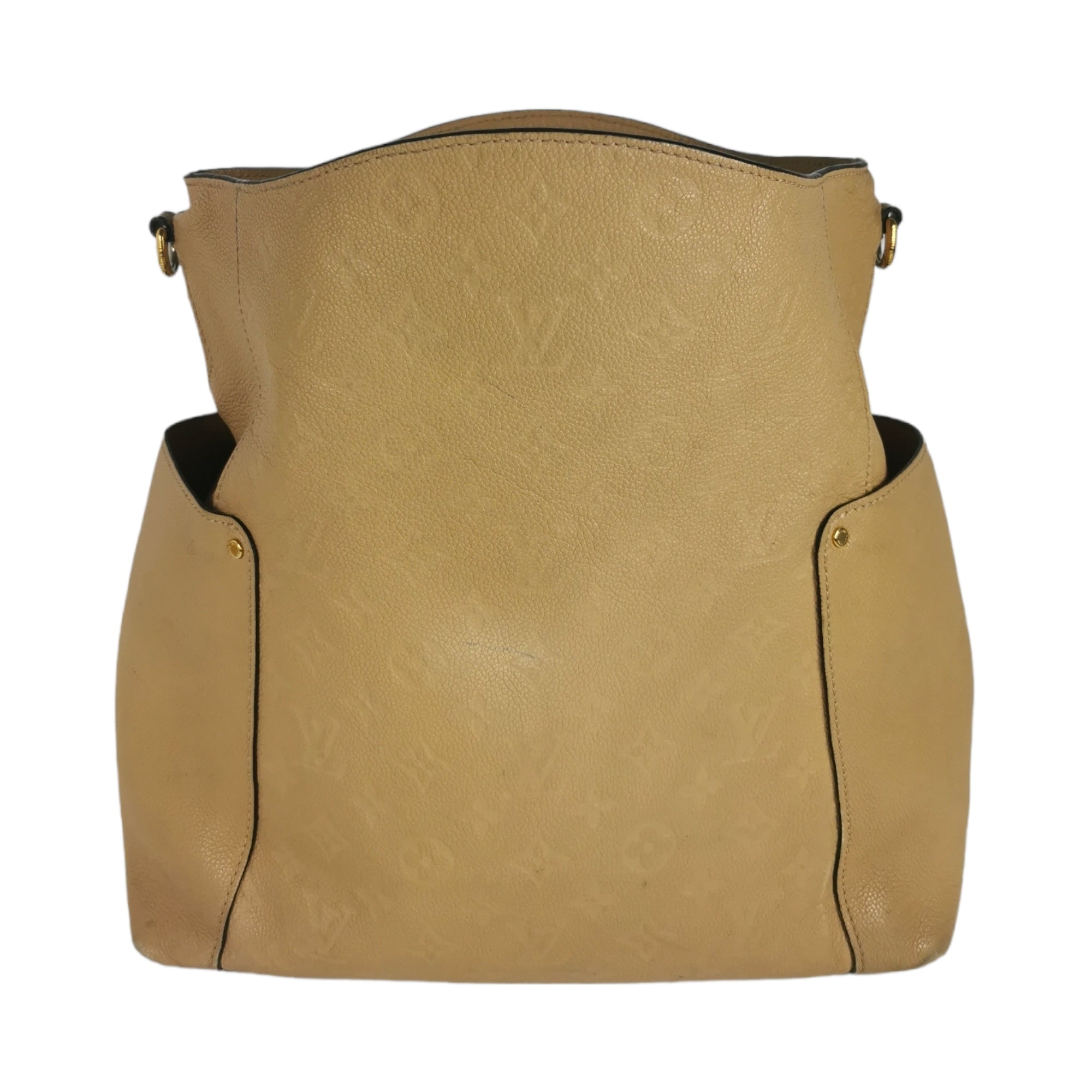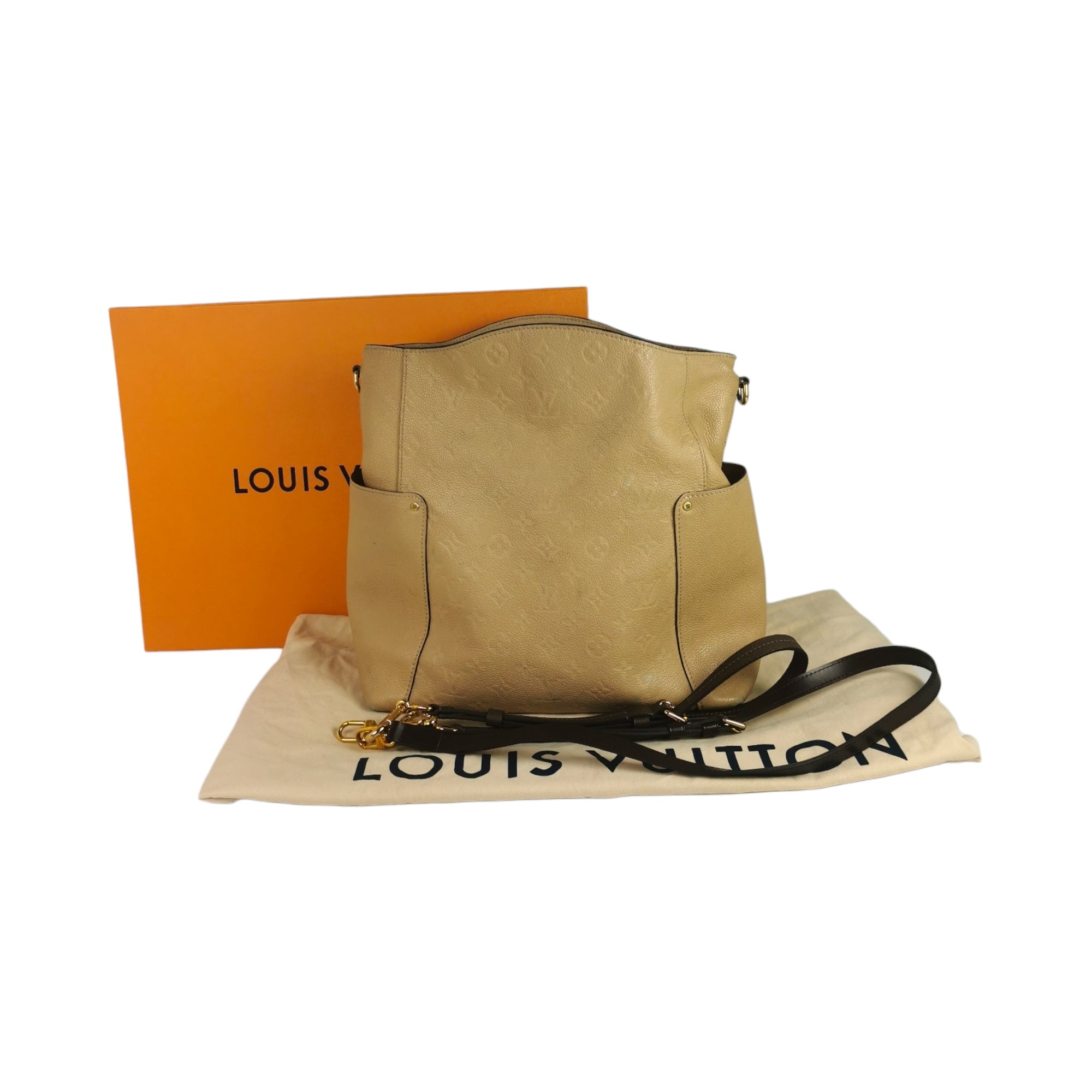 This LV Bagatelle was made from beige Monogram Empreinte leather. The Bag features gold details, a slip pocket on each side, a detachable flat shoulder strap, an open top, and zippered and slip pockets inside.