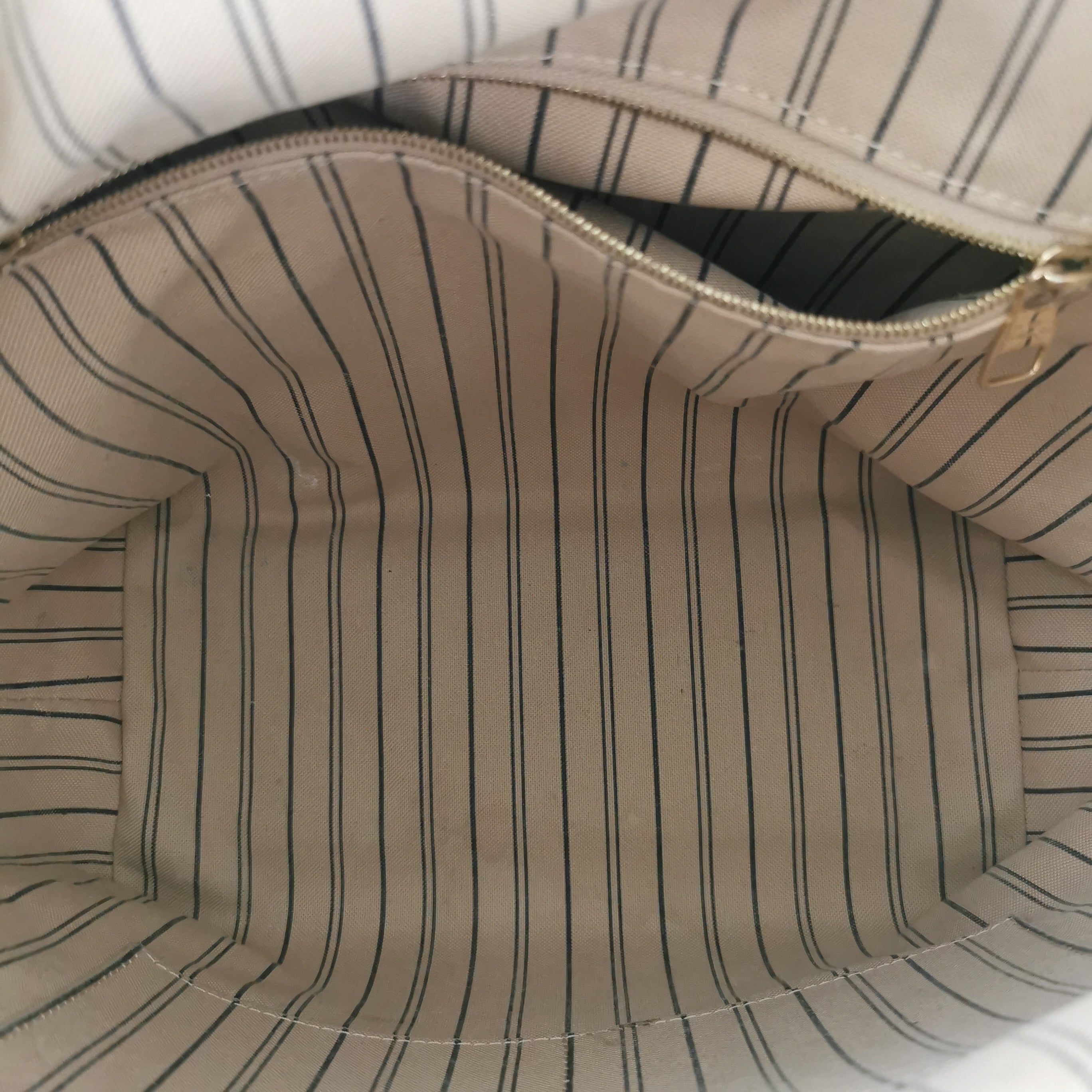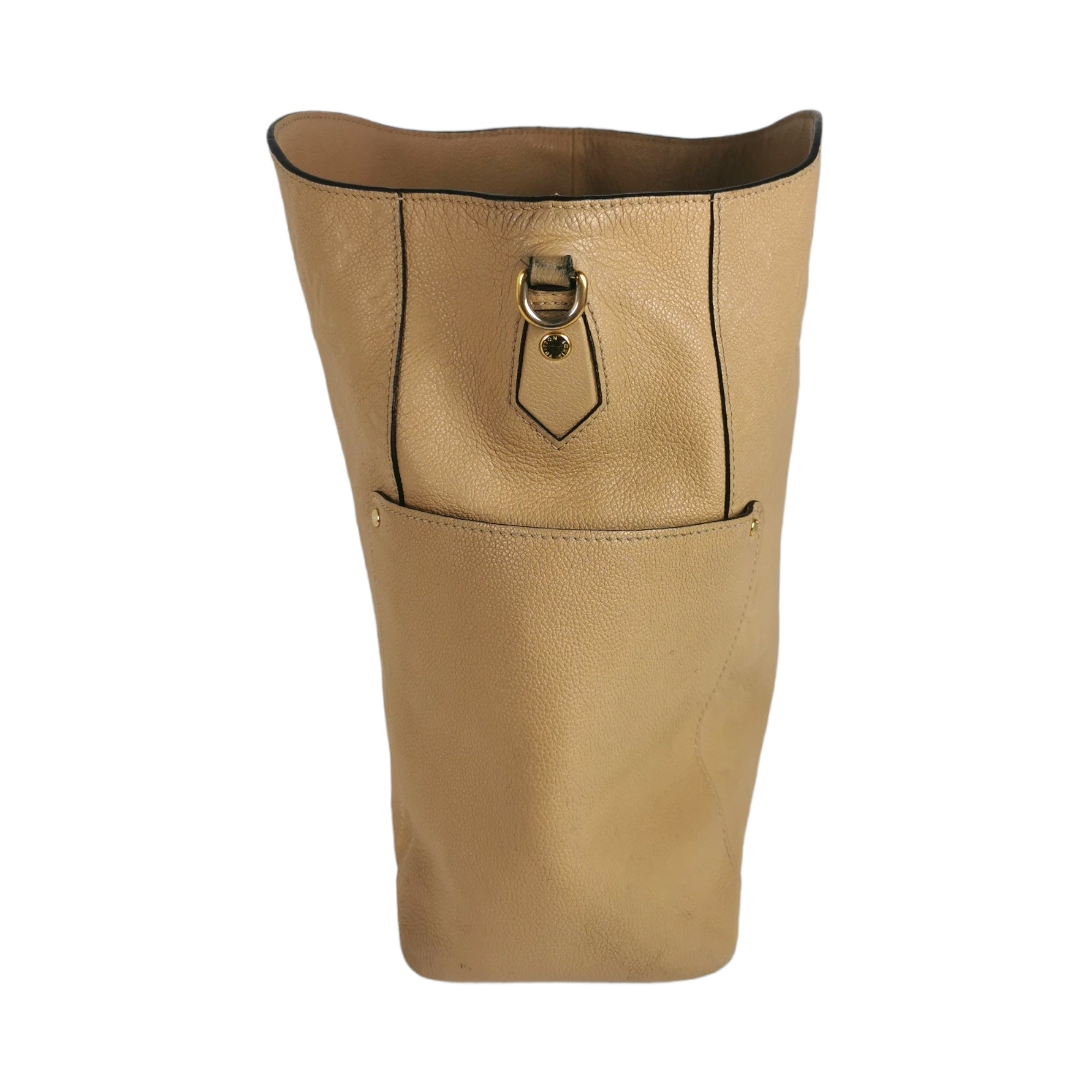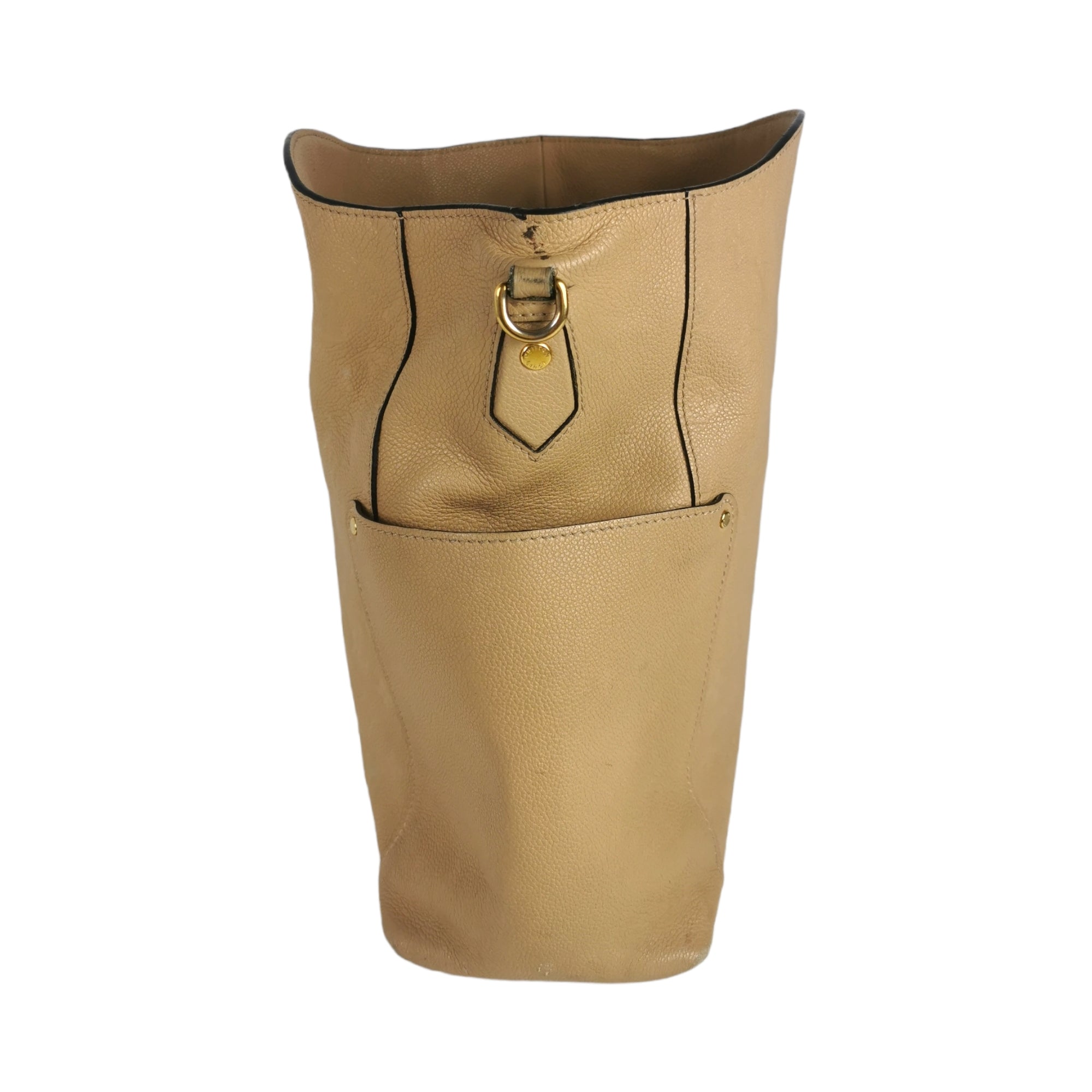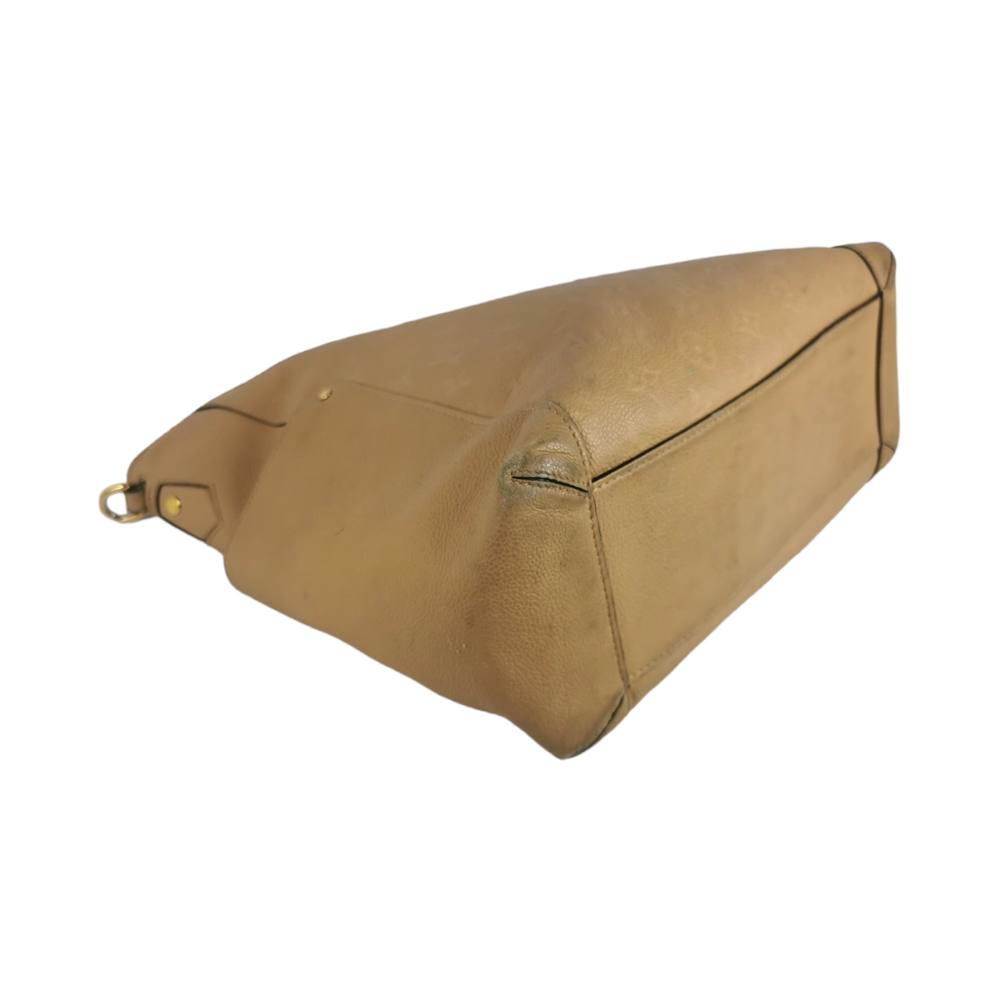 This LV Bagatelle was made from beige Monogram Empreinte leather. The Bag features gold details, a slip pocket on each side, a detachable flat shoulder strap, an open top, and zippered and slip pockets inside.