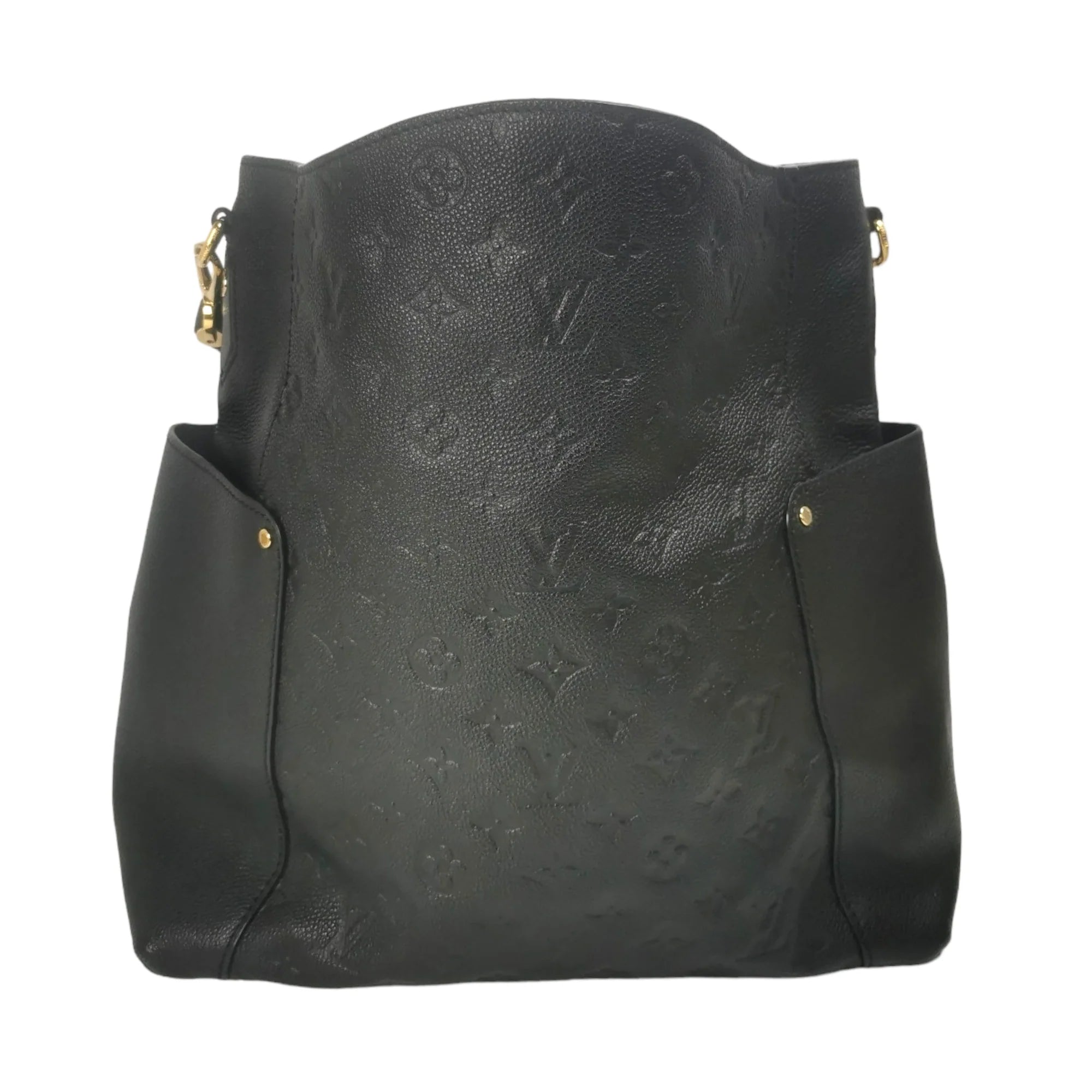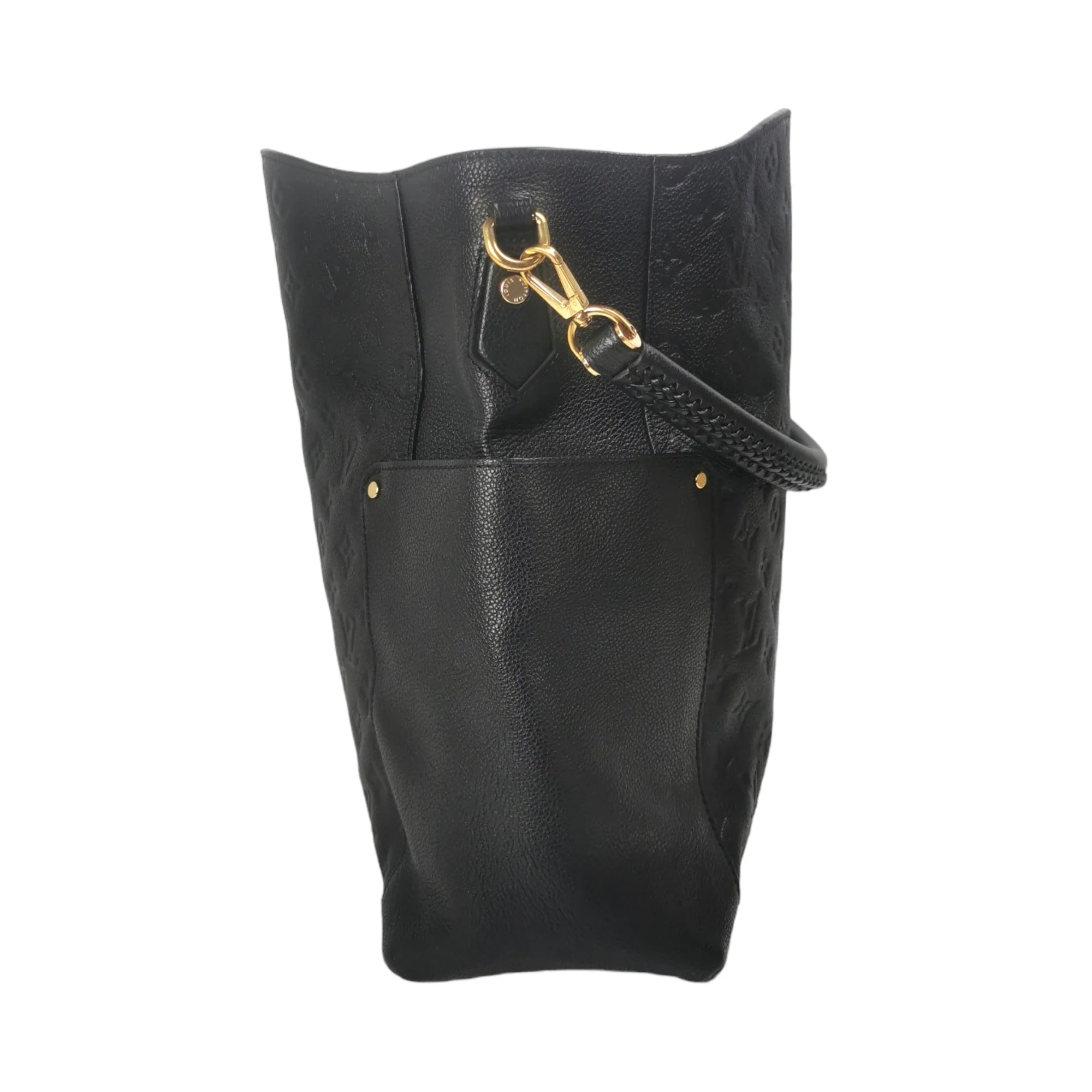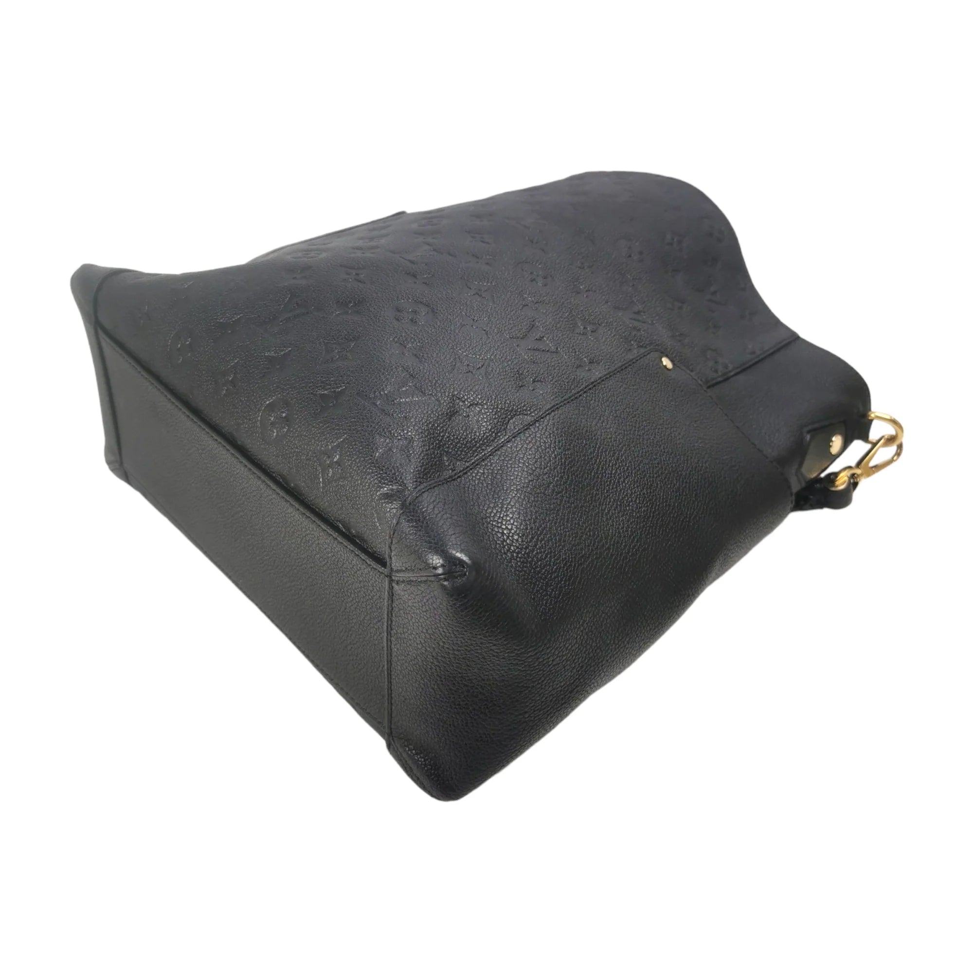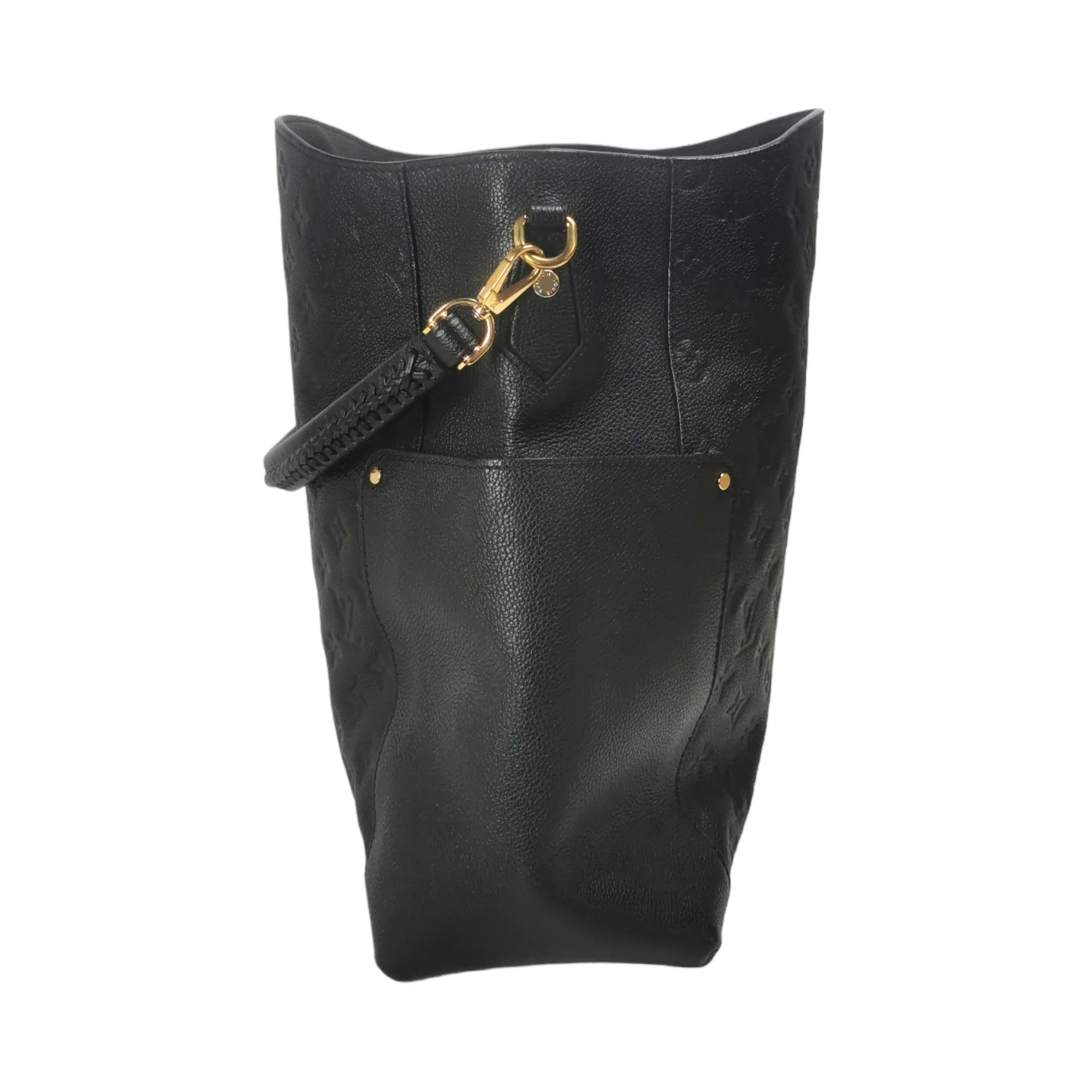 This LV Bagatelle was made from black Monogram Empreinte. The Bag features gold details, a slip pocket on each side, a detachable flat shoulder strap, an open top, and zippered and slip pockets inside.