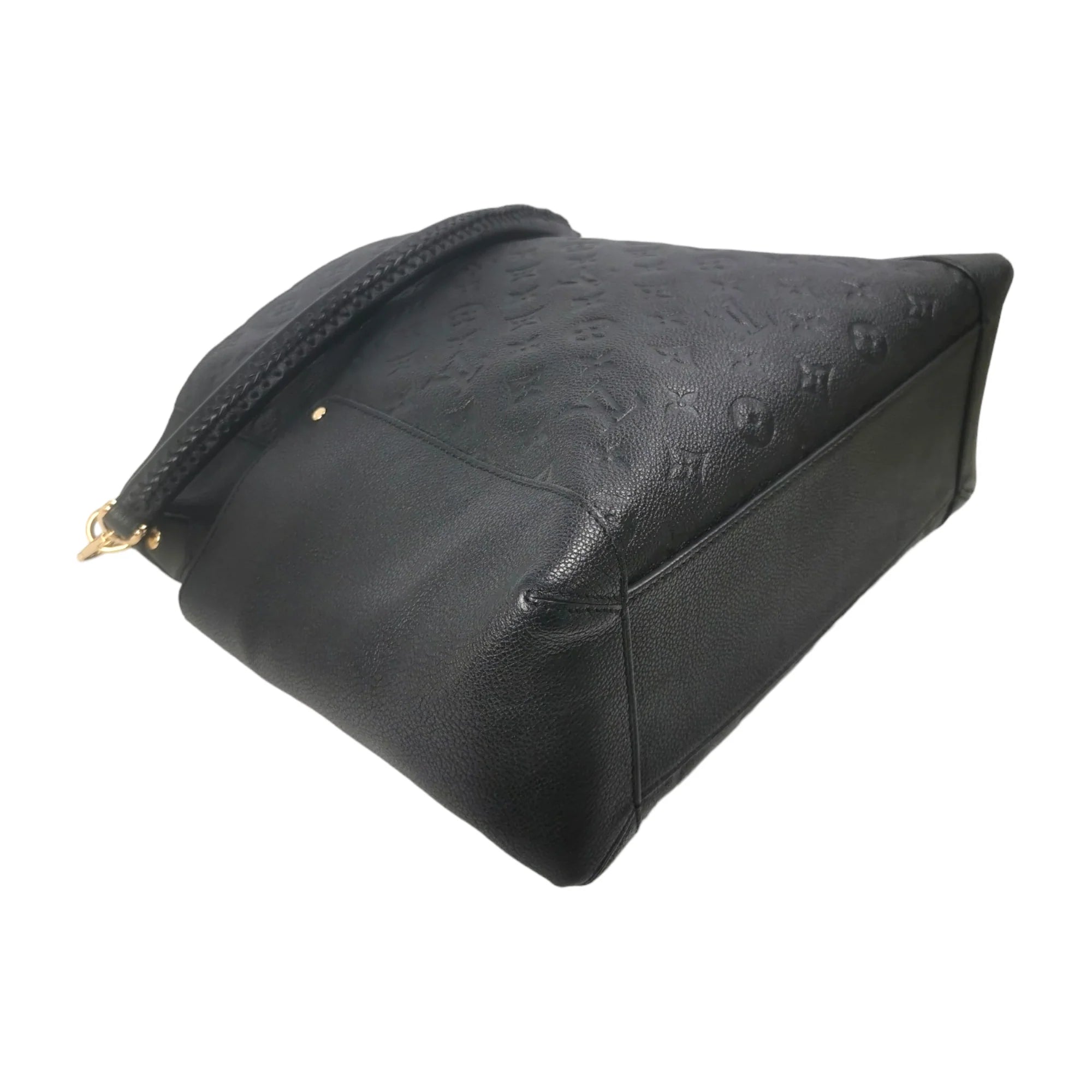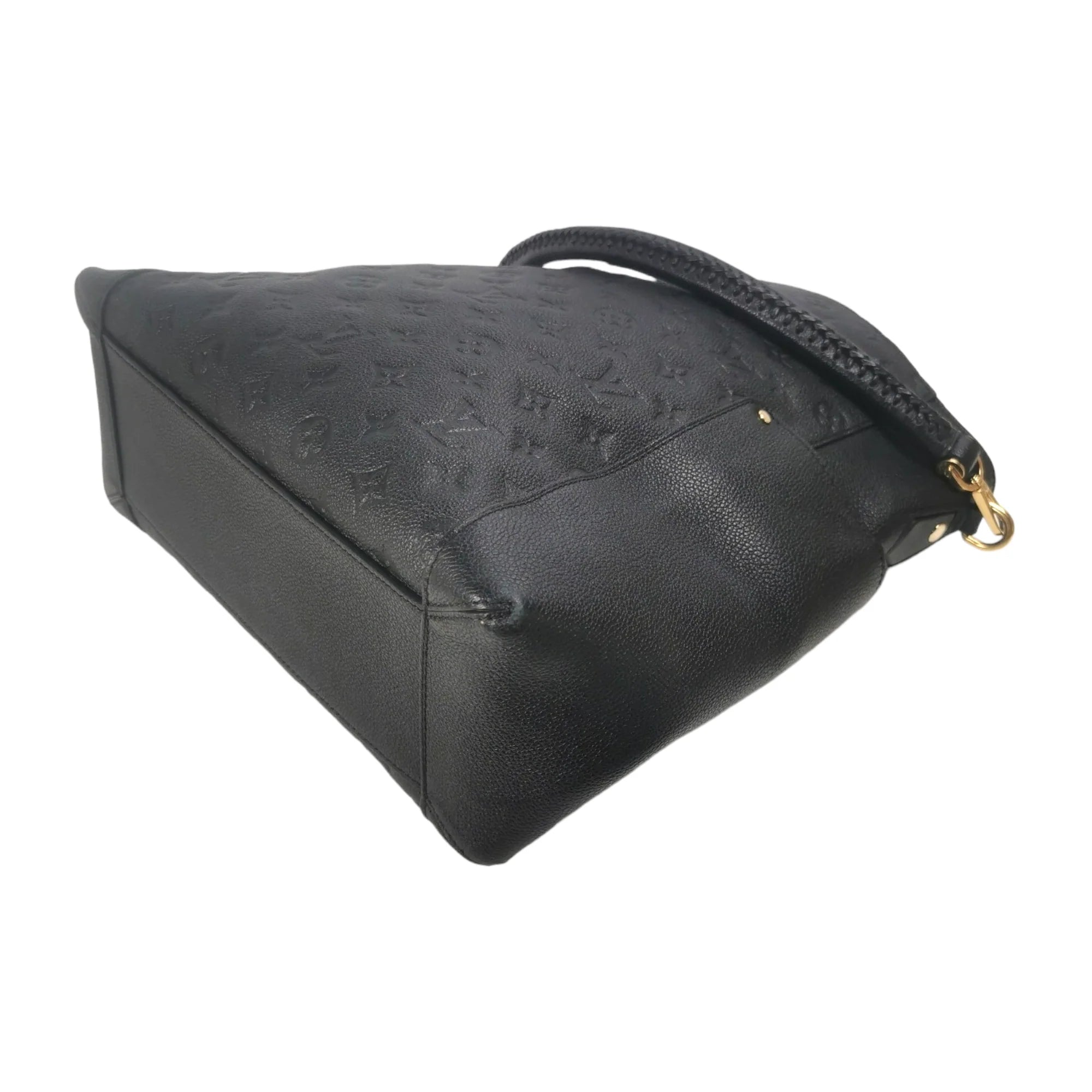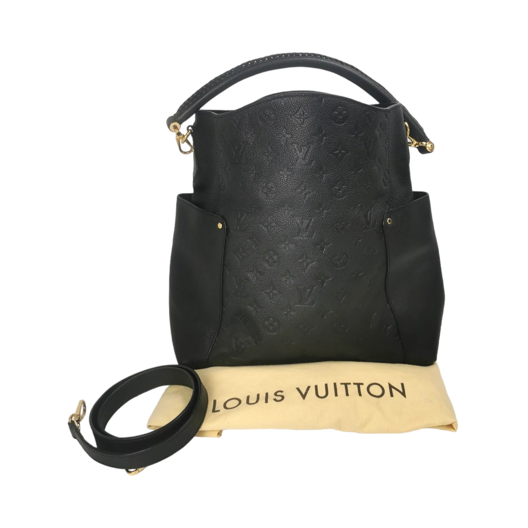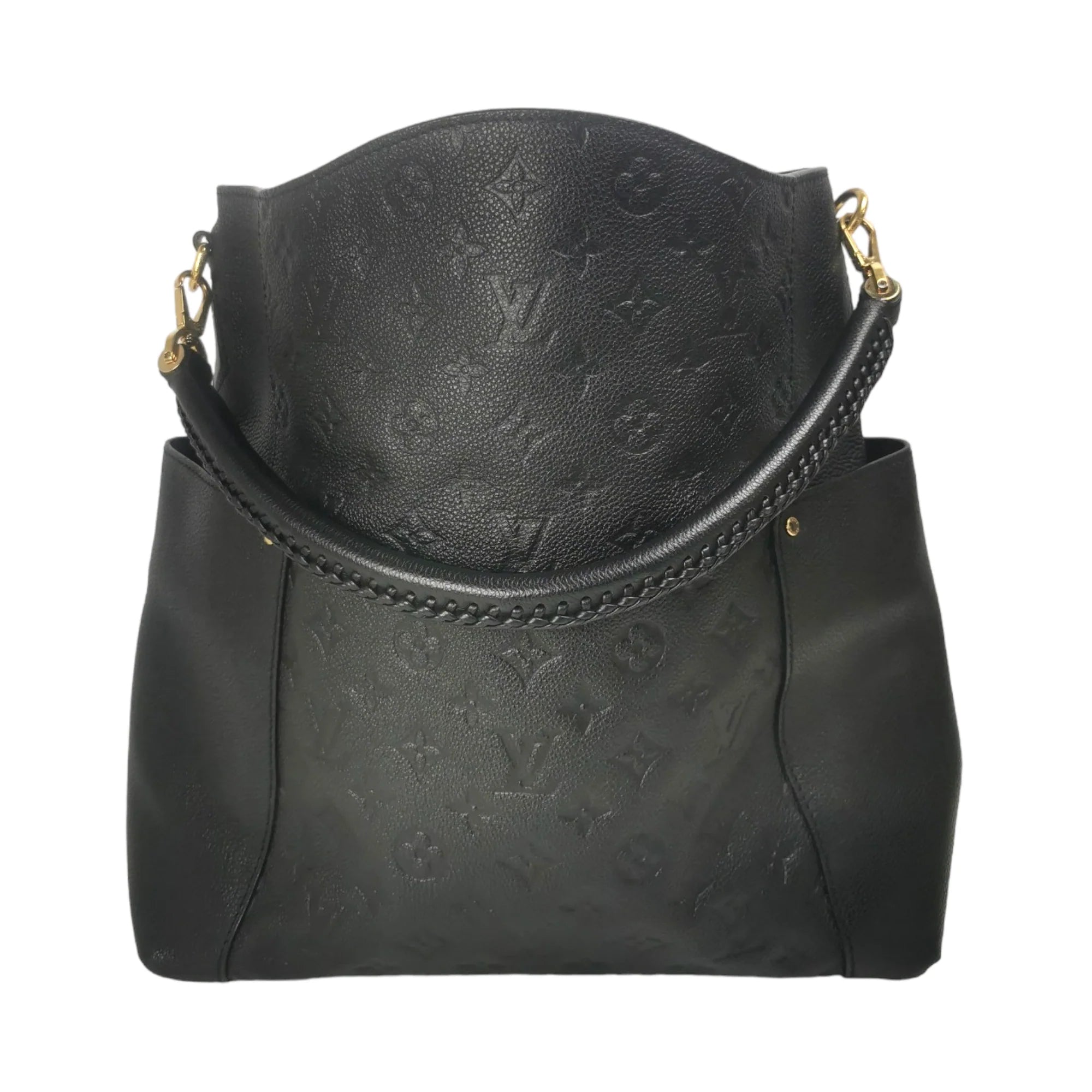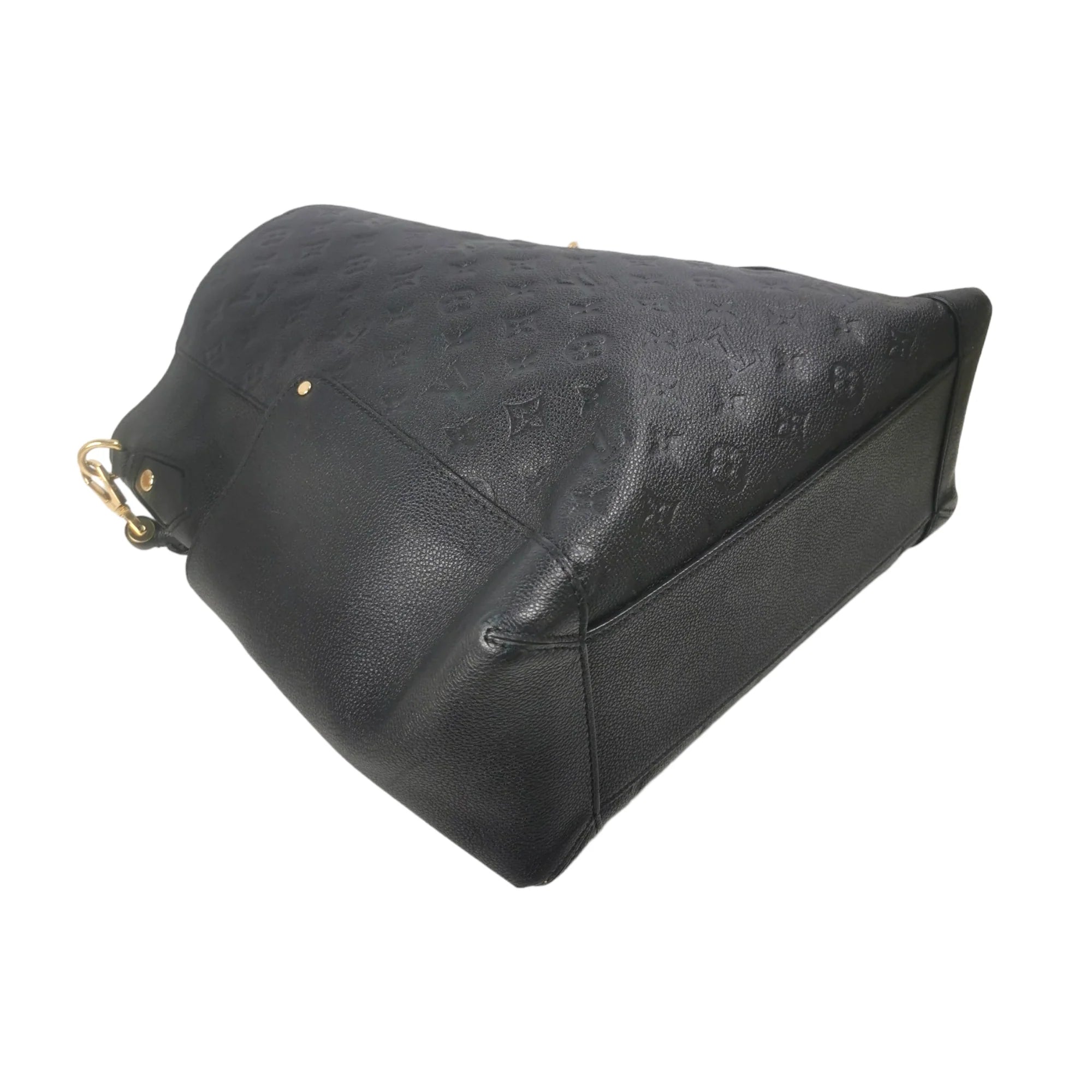 This LV Bagatelle was made from black Monogram Empreinte. The Bag features gold details, a slip pocket on each side, a detachable flat shoulder strap, an open top, and zippered and slip pockets inside.