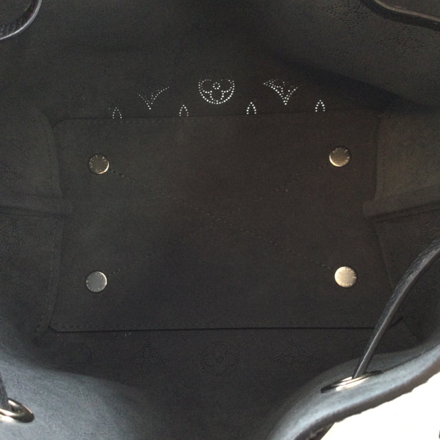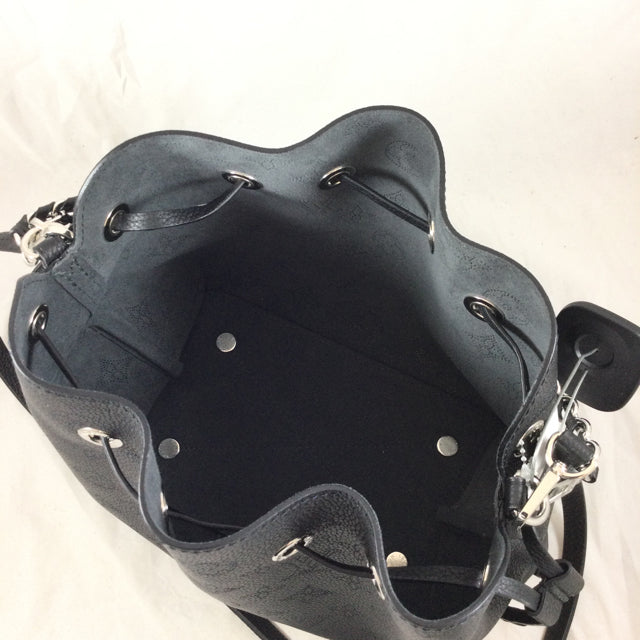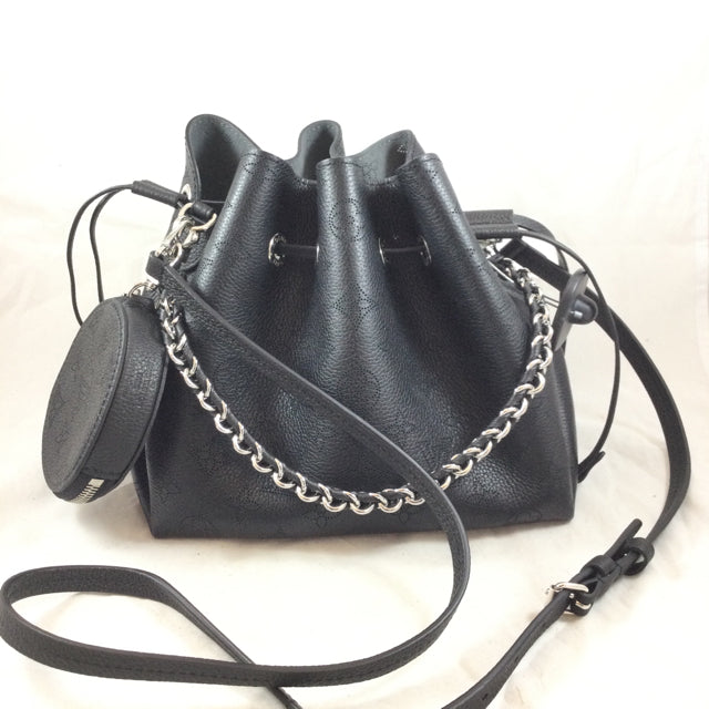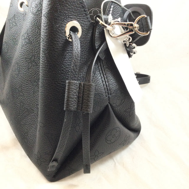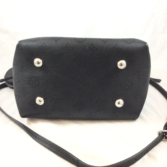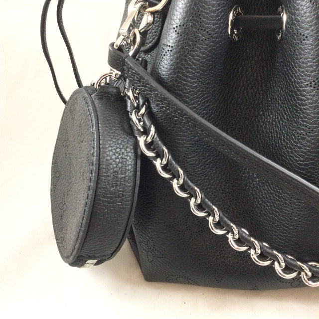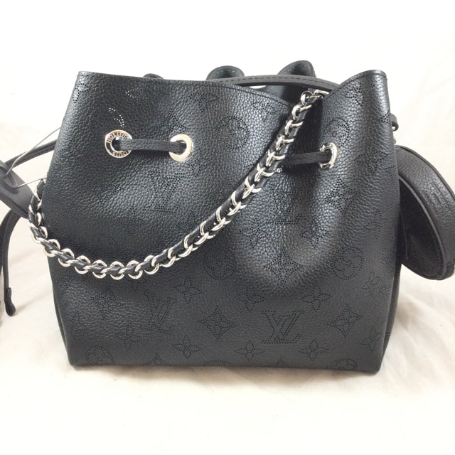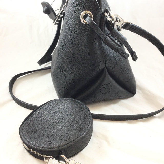 LV Bella Handbag. Logo Pattern Mahina Leather with Attached Round Pochette Detail. Silvertone Hardware & Chain Strap Design. (Microchip)