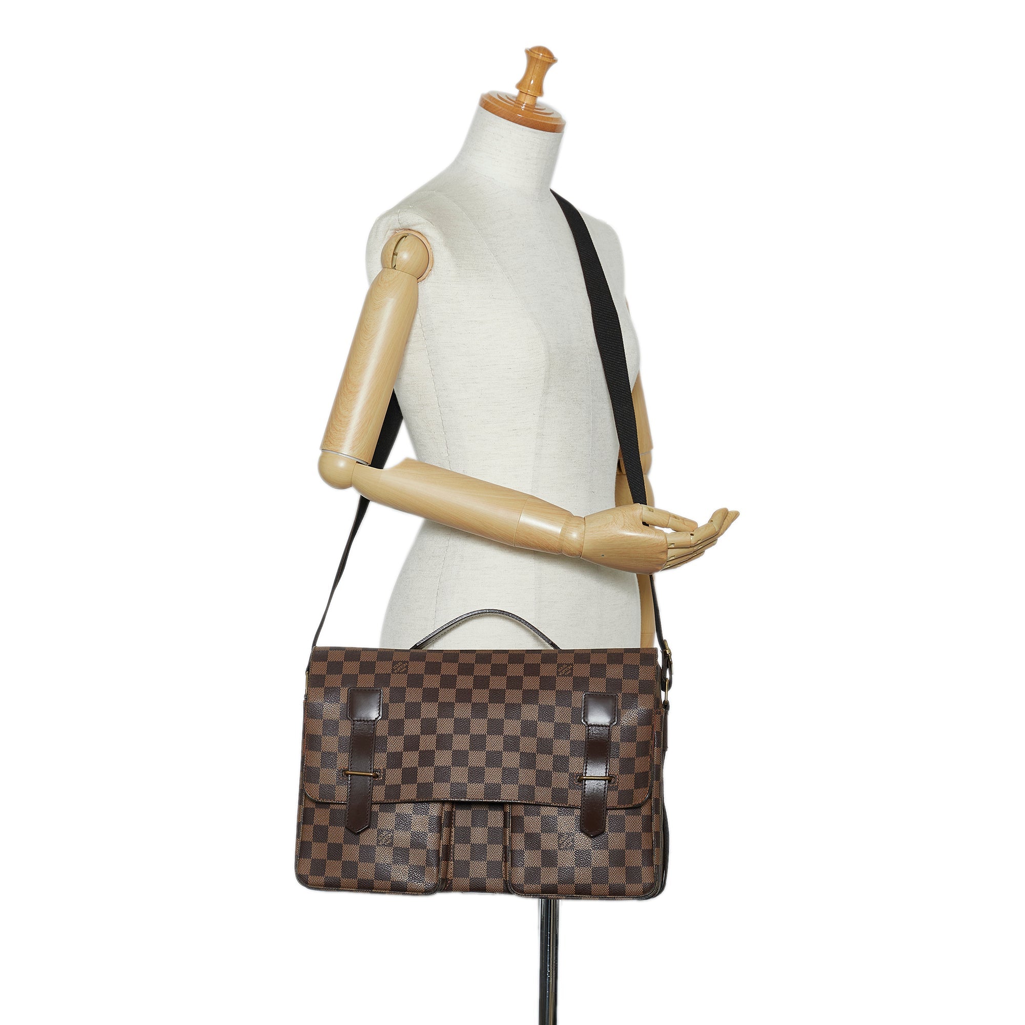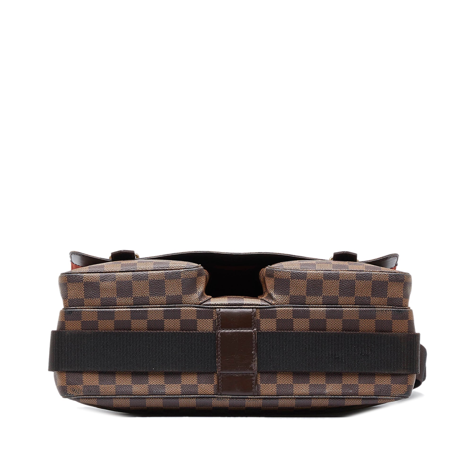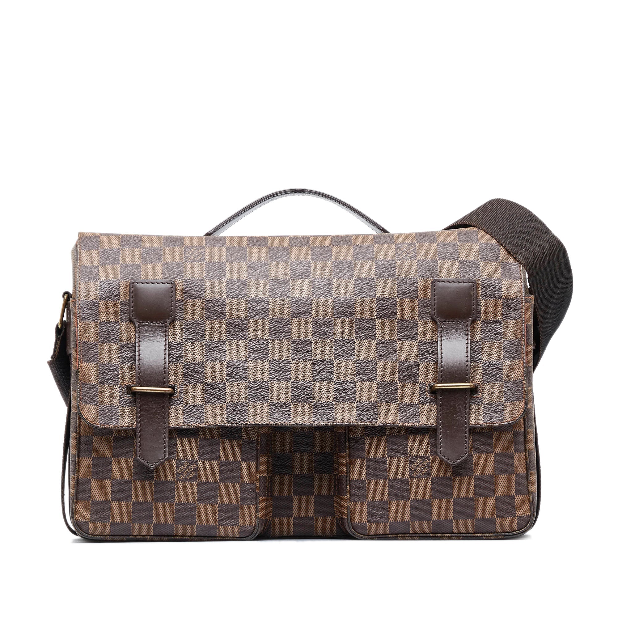 This LV Broadway is made of brown Damier level canvas and features dark brown leather trim and gold details. The front flap closes via two slip closures with leather straps. Underneath the Bag two open pockets. In the interior has the Bag two more compartments of this shape. The Bag is best worn crossbody with its flat canvas shoulder strap.