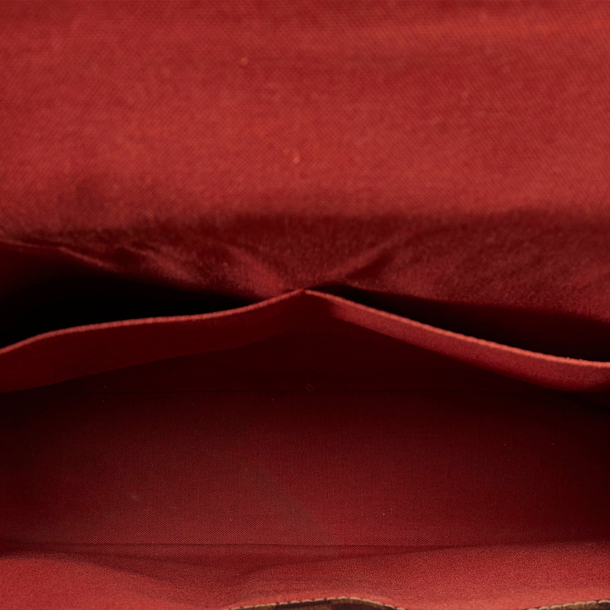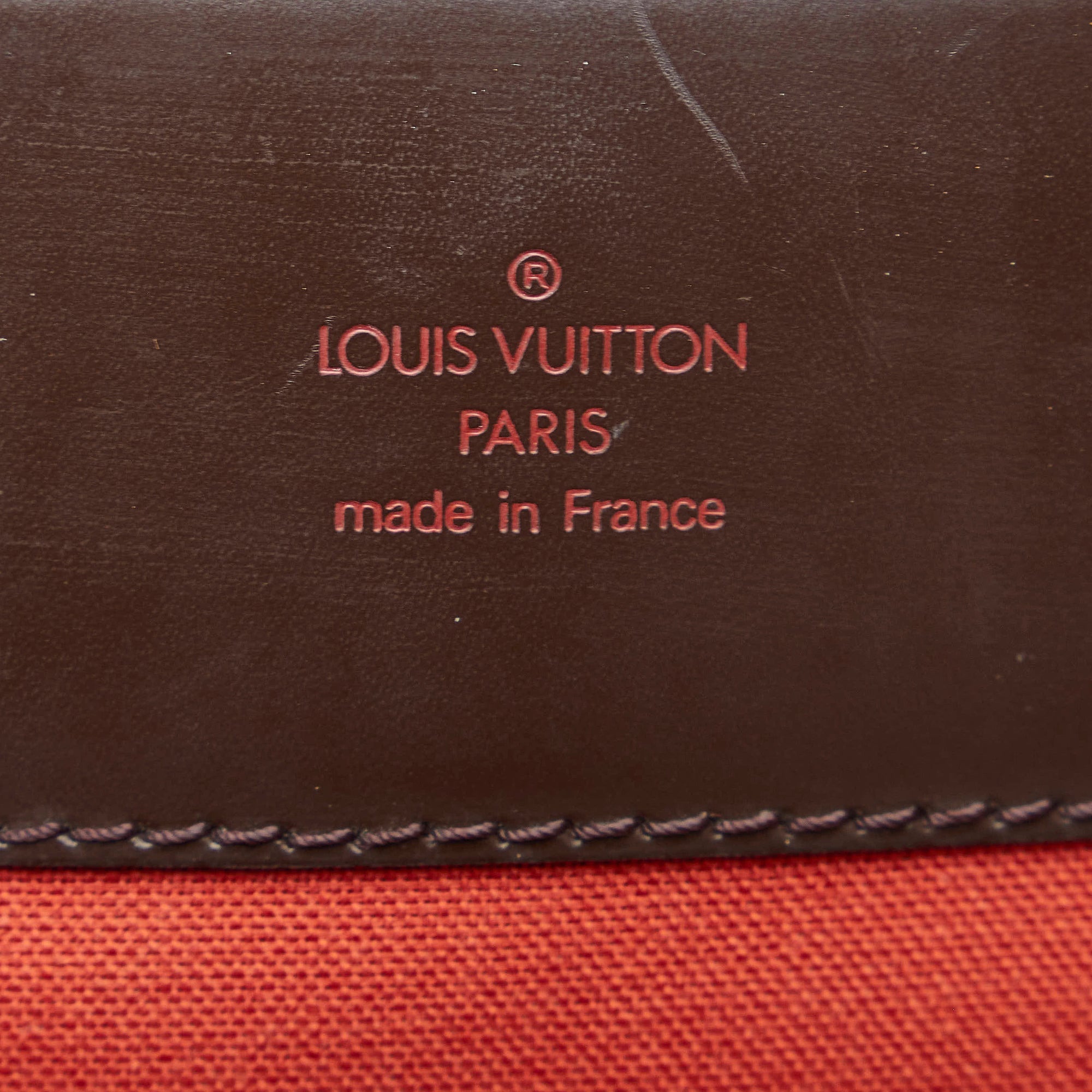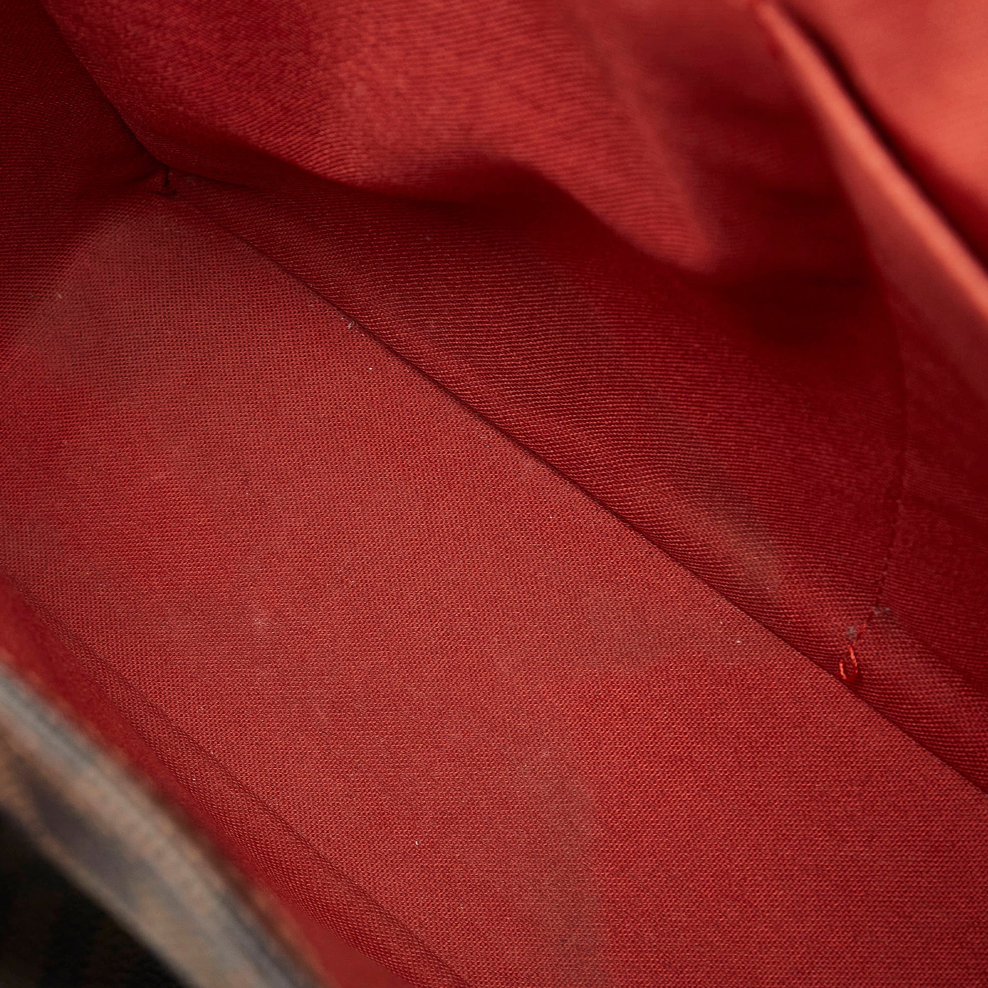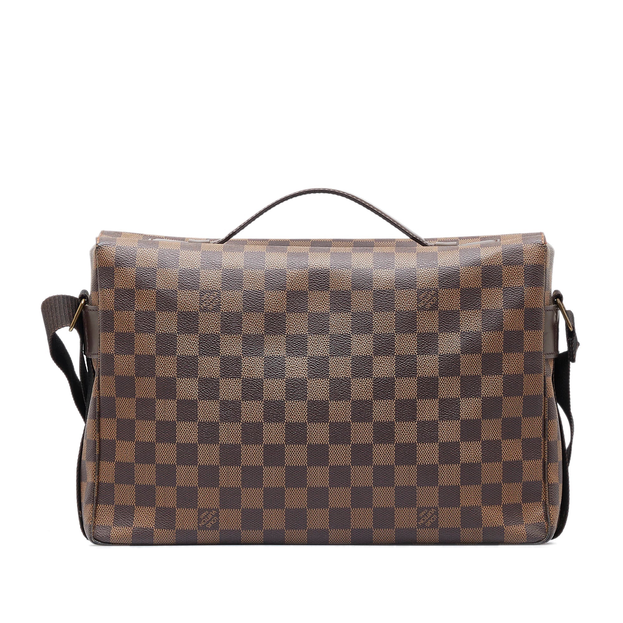 This LV Broadway is made of brown Damier level canvas and features dark brown leather trim and gold details. The front flap closes via two slip closures with leather straps. Underneath the Bag two open pockets. In the interior has the Bag two more compartments of this shape. The Bag is best worn crossbody with its flat canvas shoulder strap.