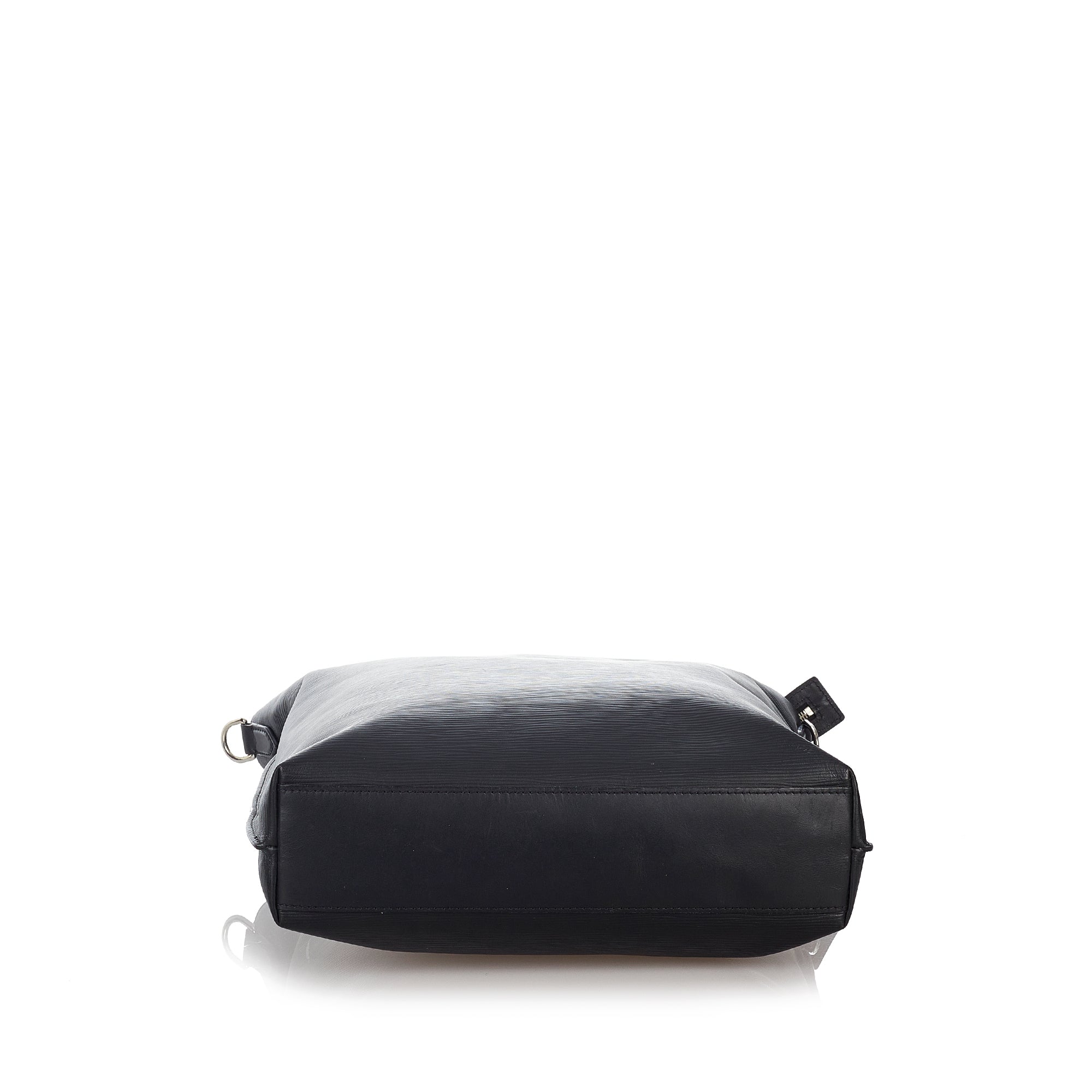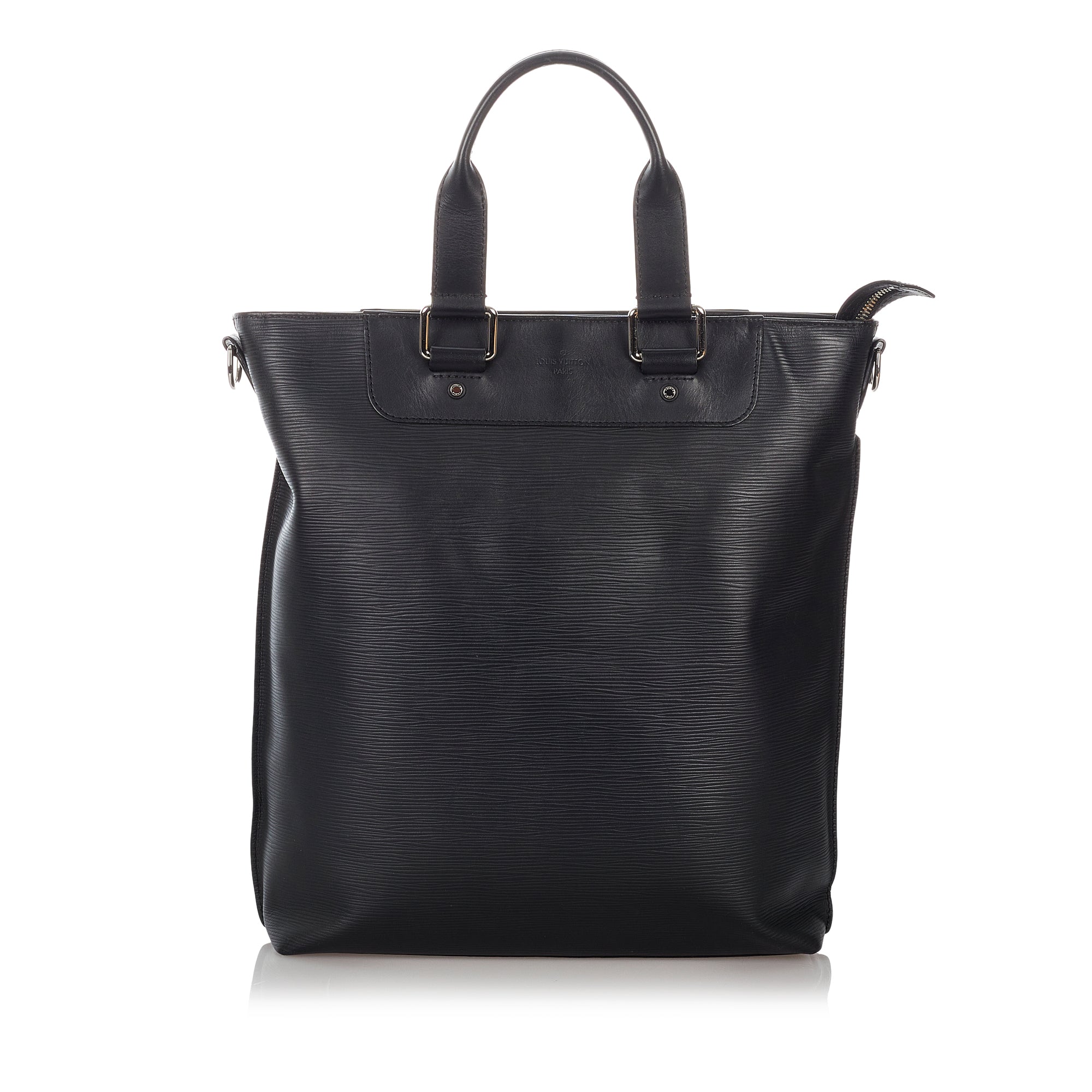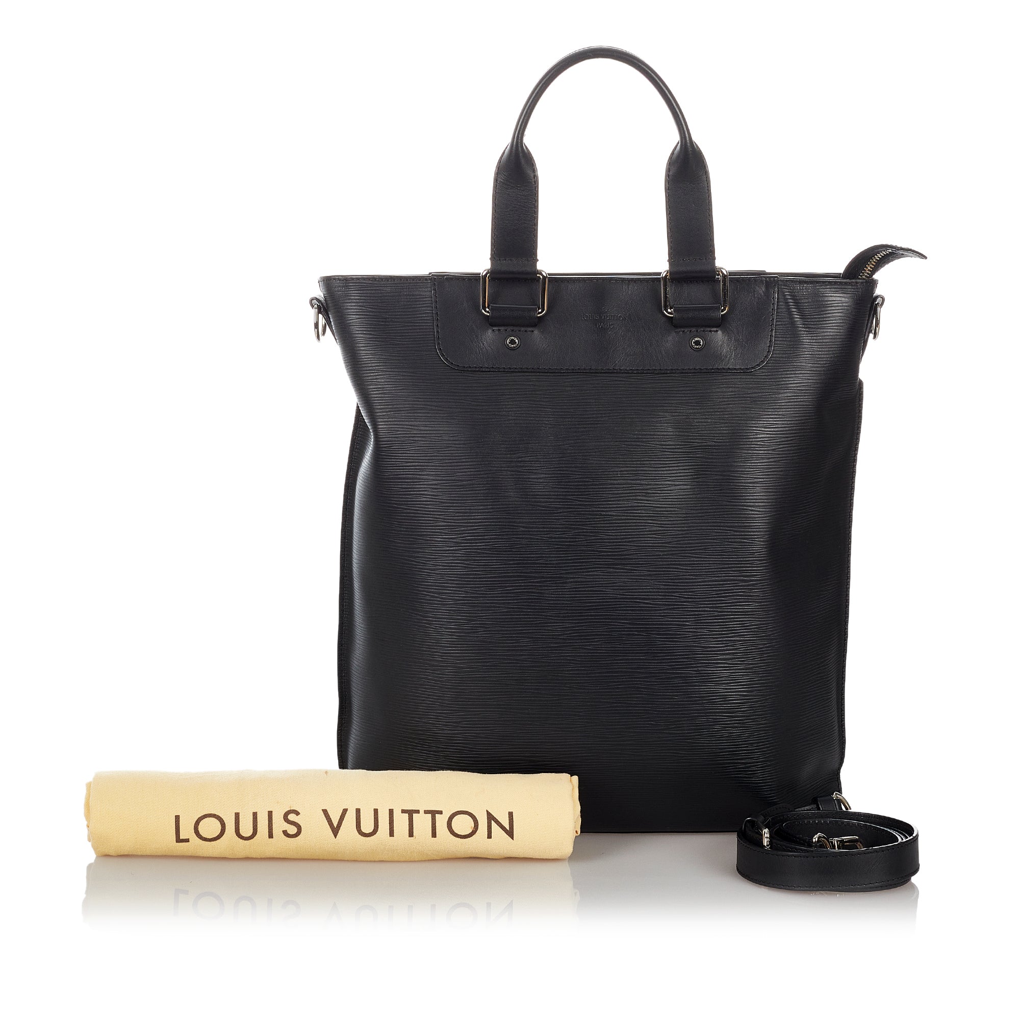 This LV Cabas Sac Jour was made from black epi leather. The Bag features trimmings and rolled handles in smooth black leather, silver rings and closures, a zipper at the top opening, and zippered and slip pockets inside. The Bag is carried by hand and further has a detachable leather shoulder strap, with the help of which the Bag can also be worn loosely over the shoulder and across the body.