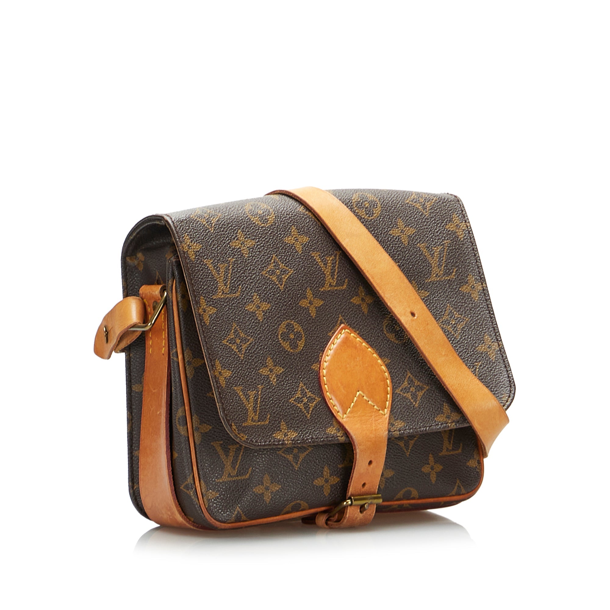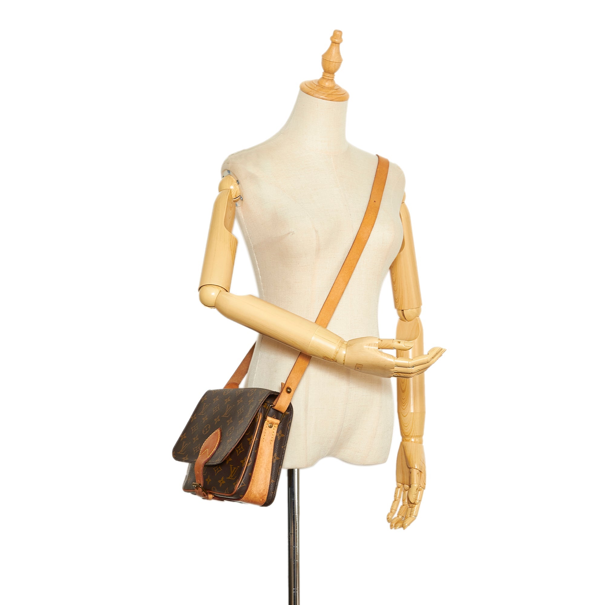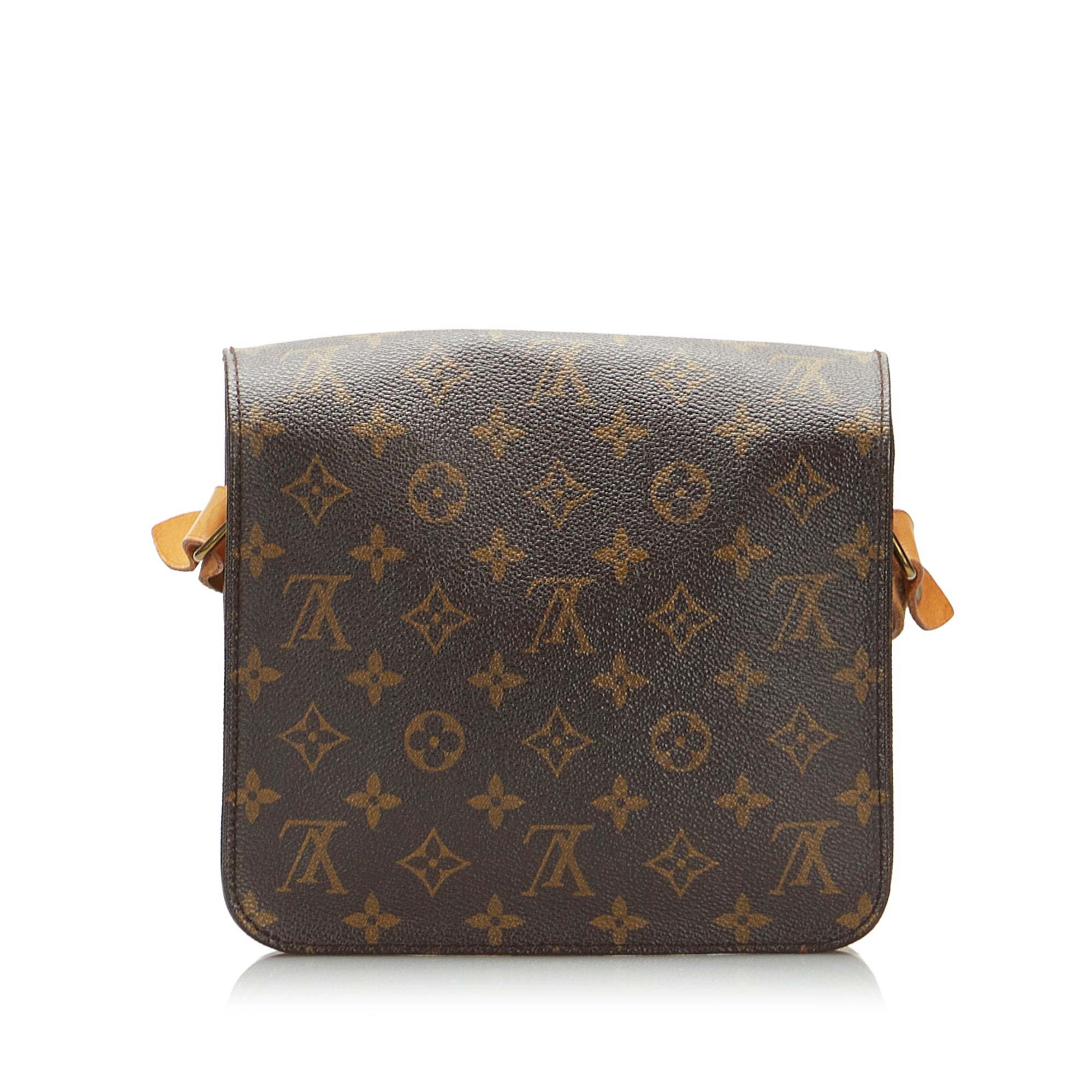 This LV Cartouchière in size MM was made of Monogram Canvas. The Bag features trim and a flat vachetta leather shoulder strap that is adjustable in length, gold detailing, and a flap with a buckle closure. The Bag is worn across the body or loosely over the shoulder.