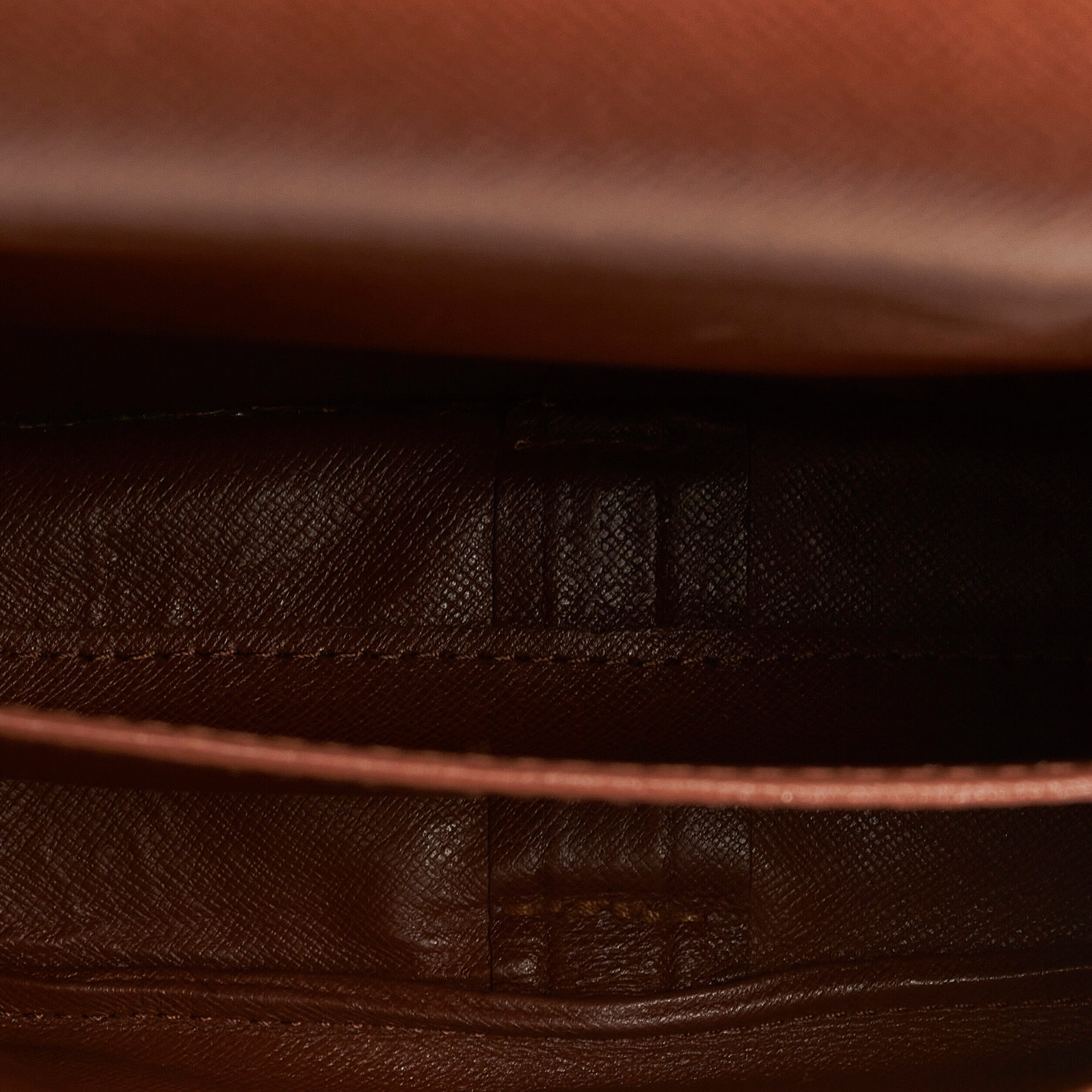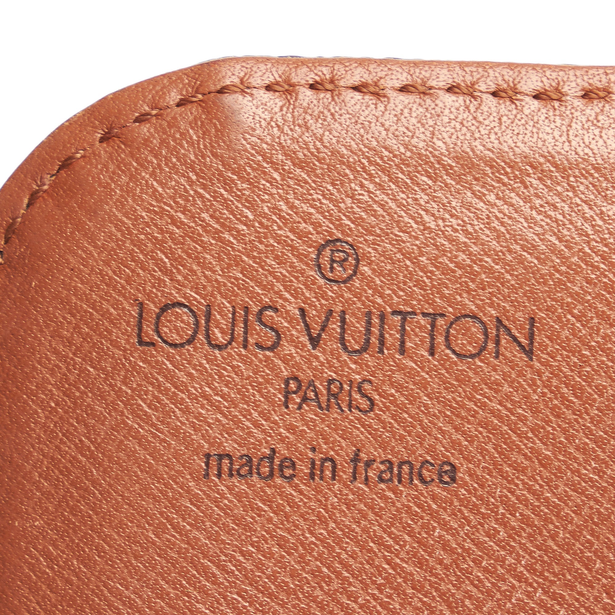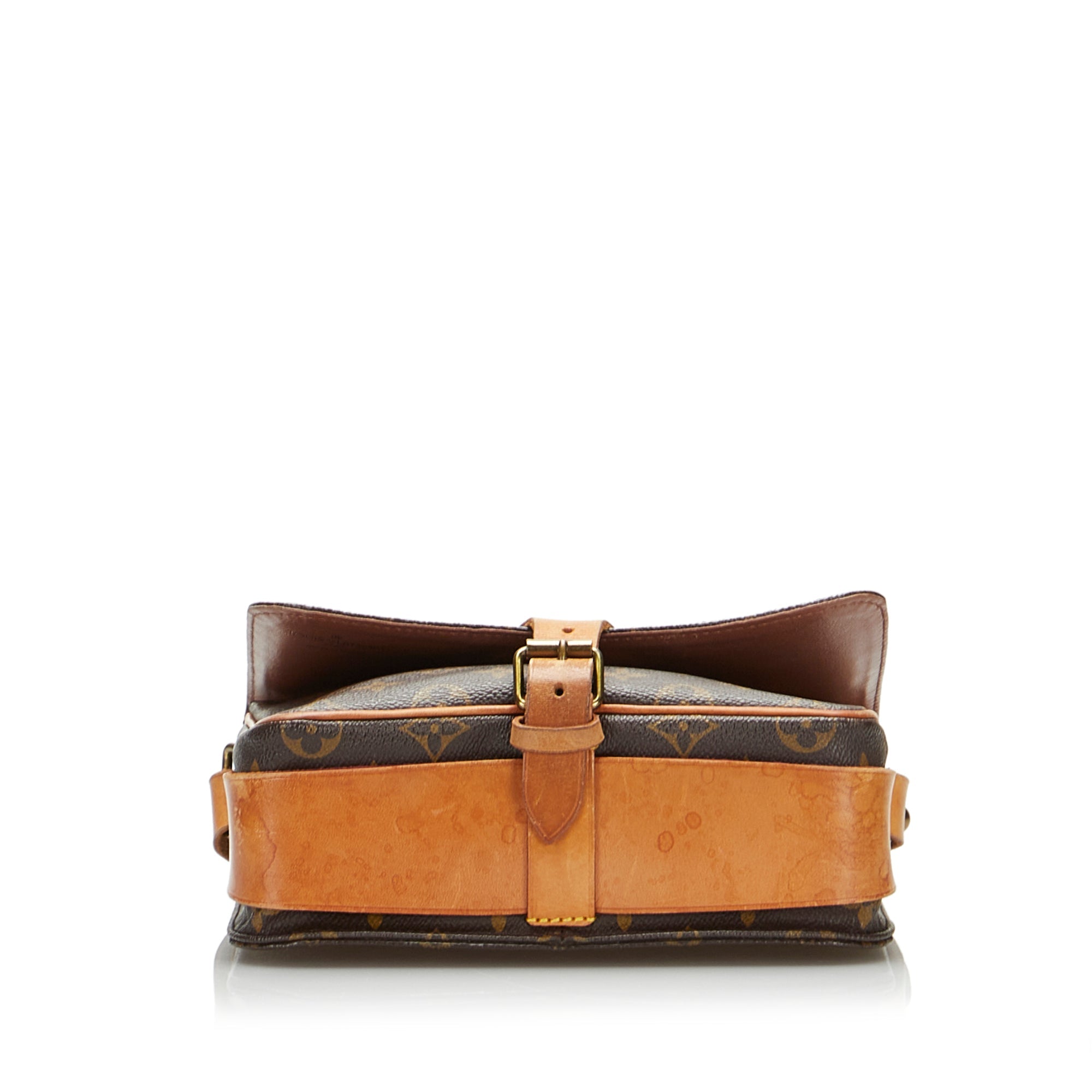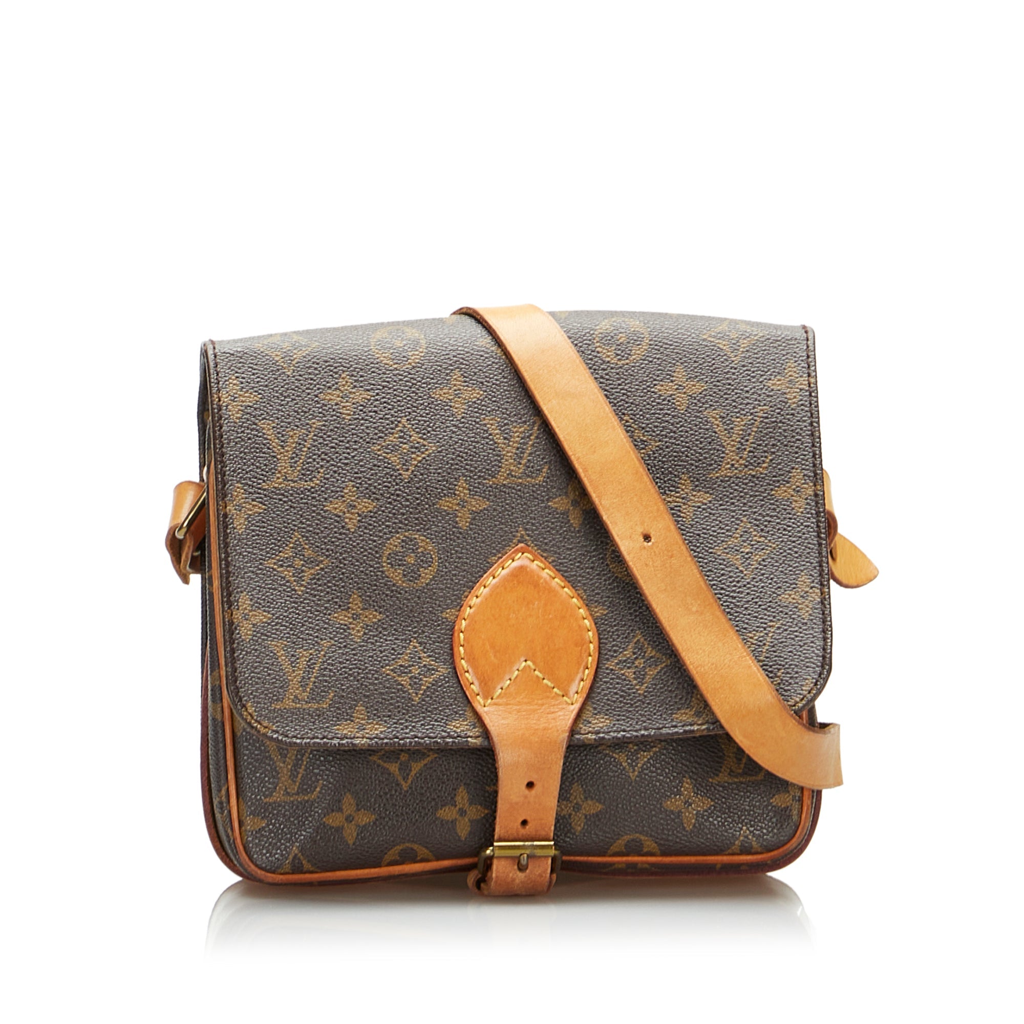 This LV Cartouchière in size MM was made of Monogram Canvas. The Bag features trim and a flat vachetta leather shoulder strap that is adjustable in length, gold detailing, and a flap with a buckle closure. The Bag is worn across the body or loosely over the shoulder.