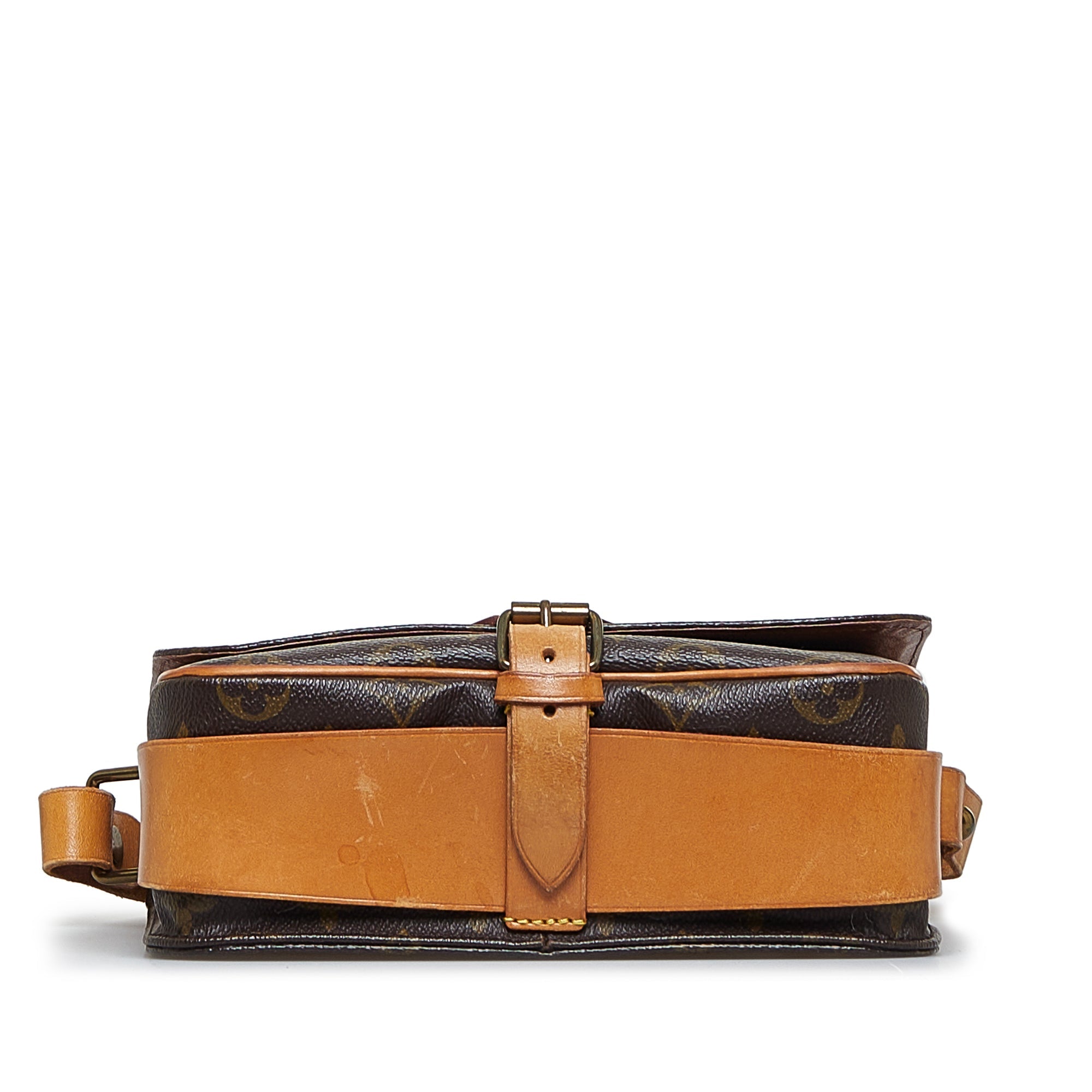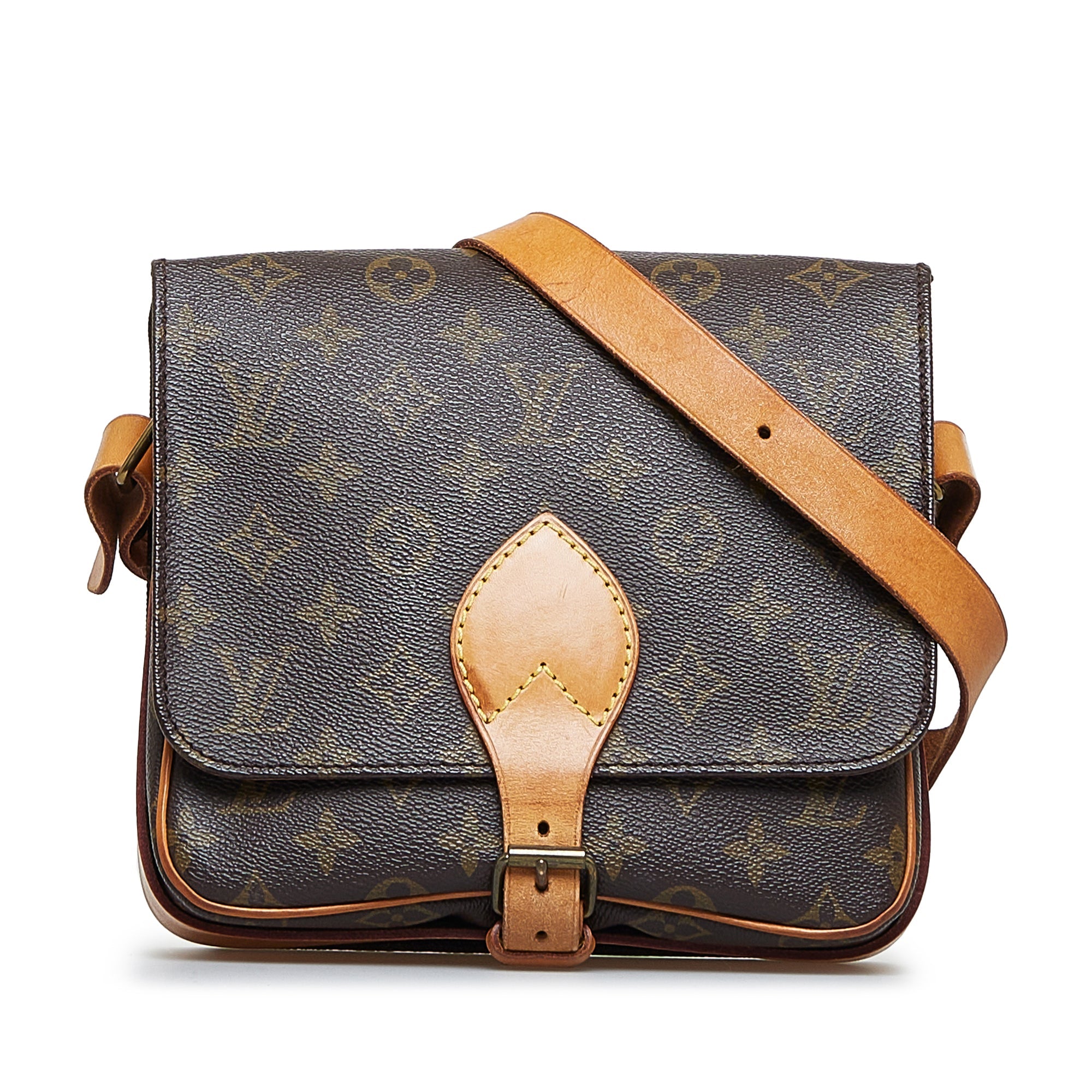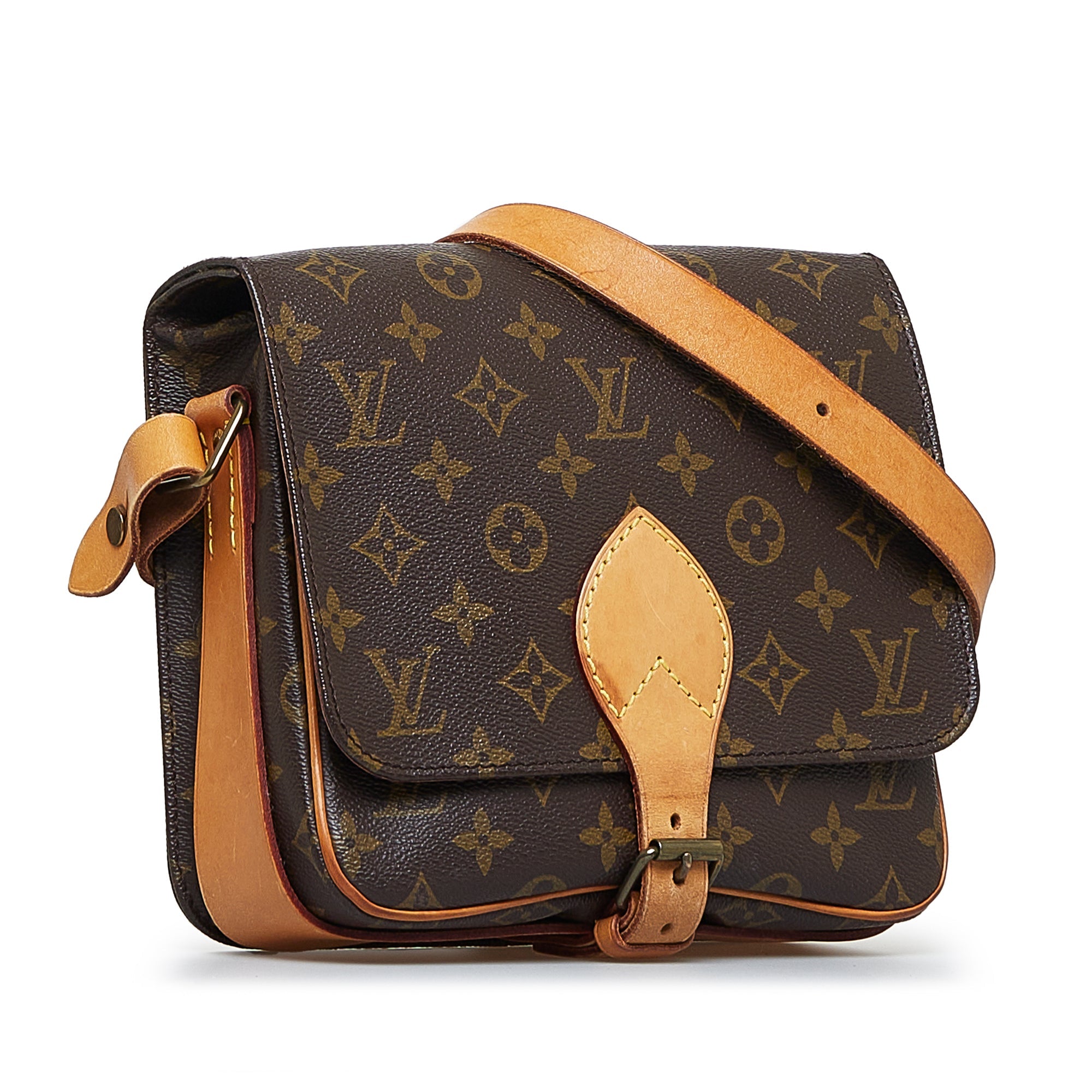 This LV Cartouchière in the MM variant was made of Monogram Canvas. The Bag features brown leather trim and shoulder strap, gold detailing, and a buckle closure on the front flap. The interior of the Bag accommodates an interior compartment. The Bag came loosely over the shoulder or also be worn across the body.