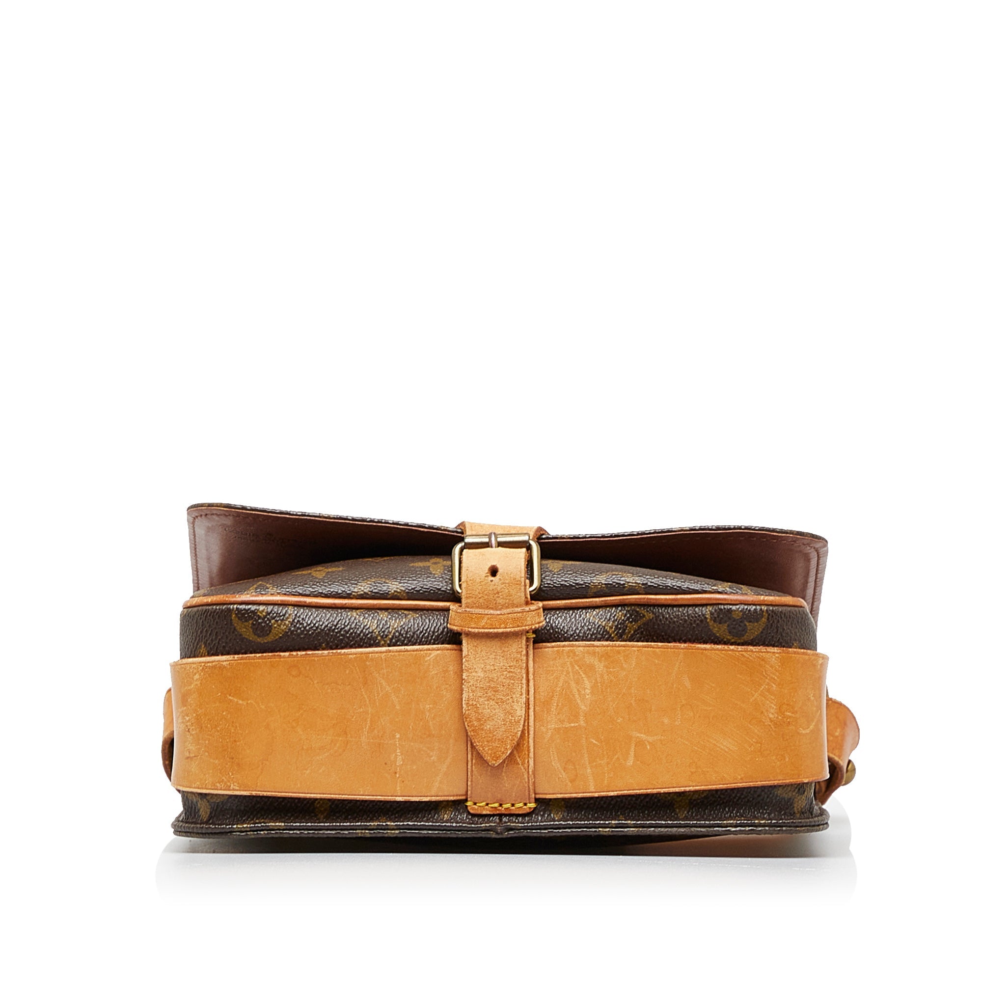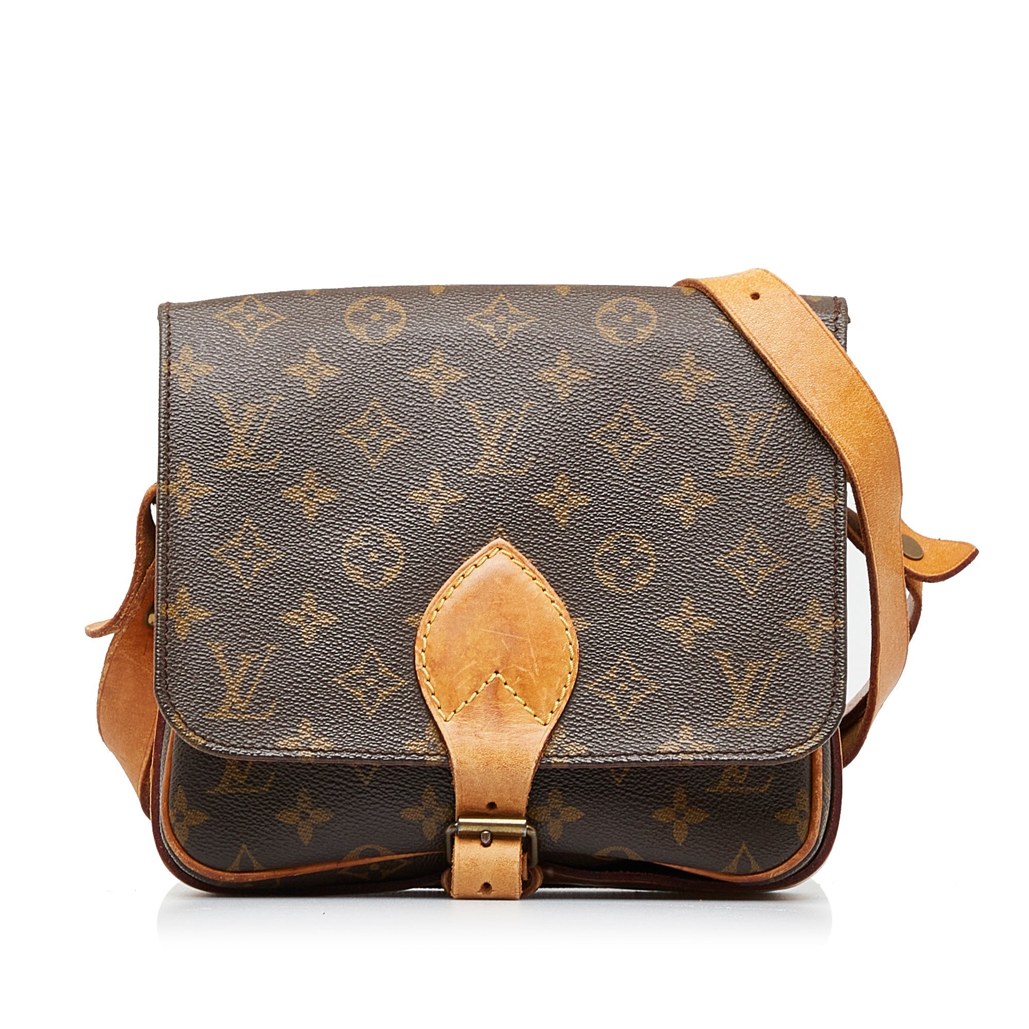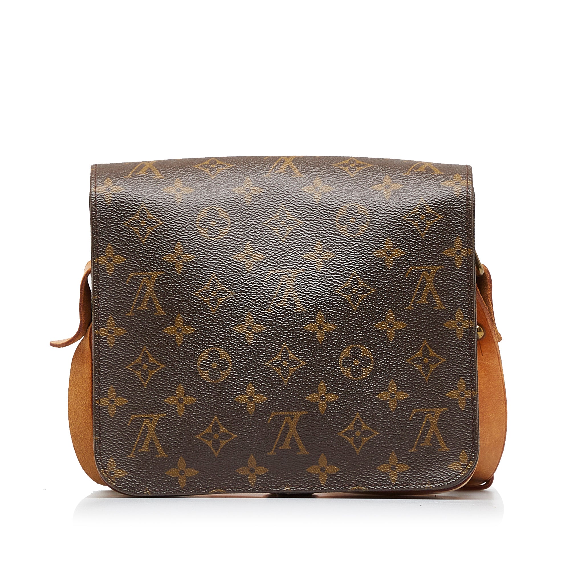 This LV Cartouchière in size MM was made from Monogram Canvas. The Bag features trim and a flat vachetta leather shoulder strap that is adjustable in length, gold detailing, and a flap with a buckle closure. The Bag is worn across the body or loosely over the shoulder.
