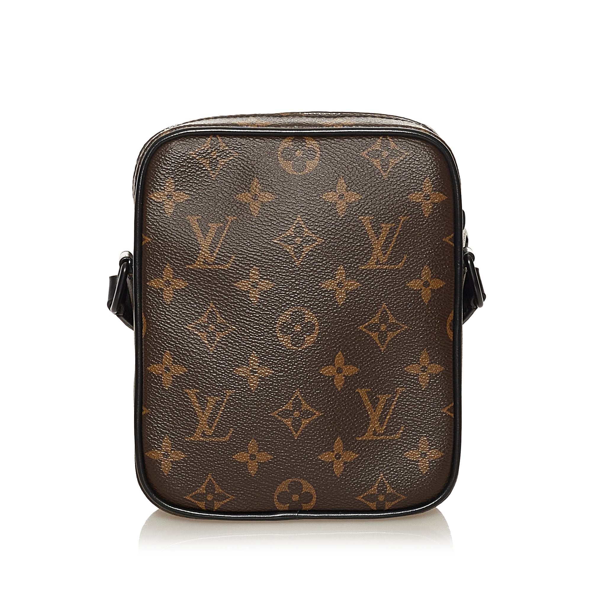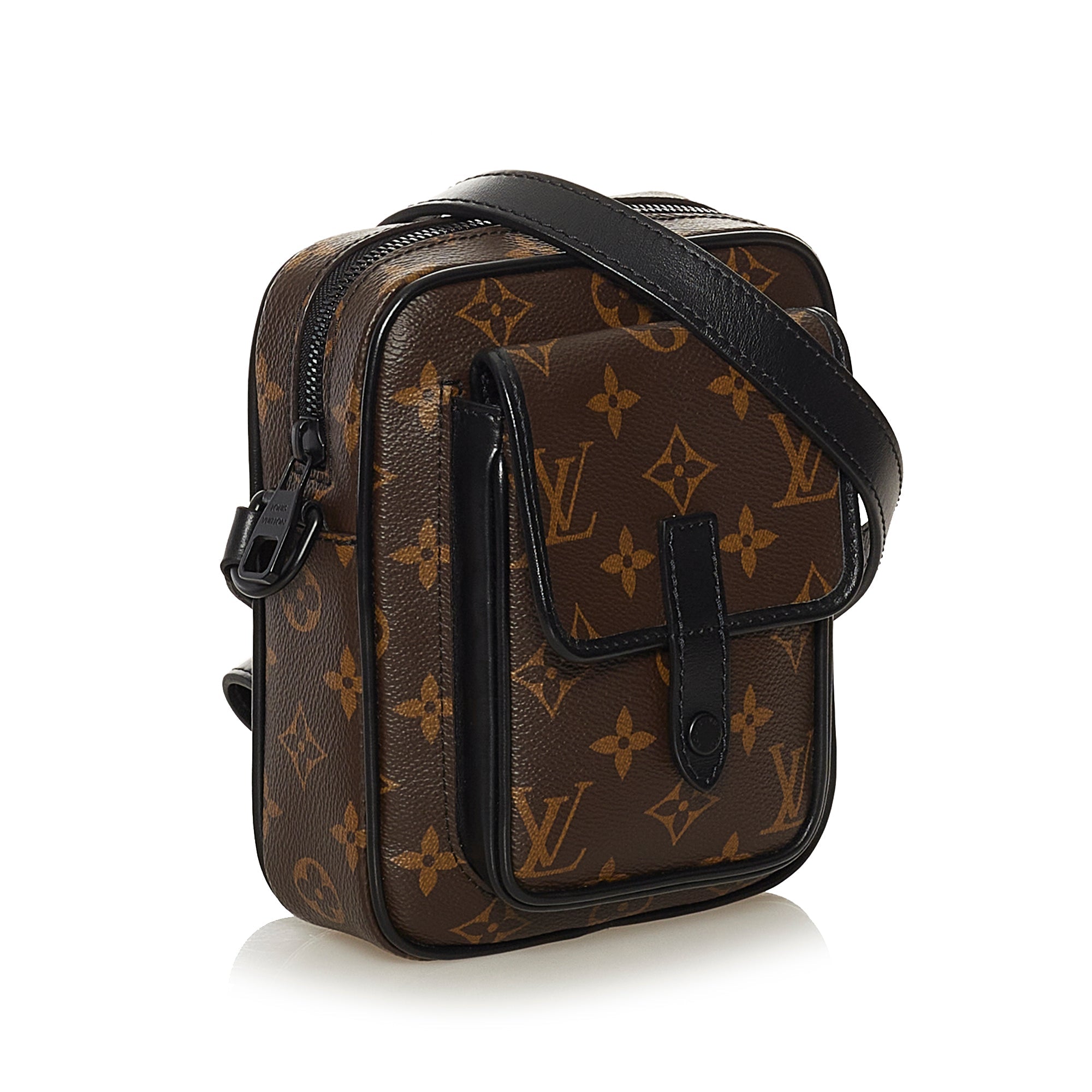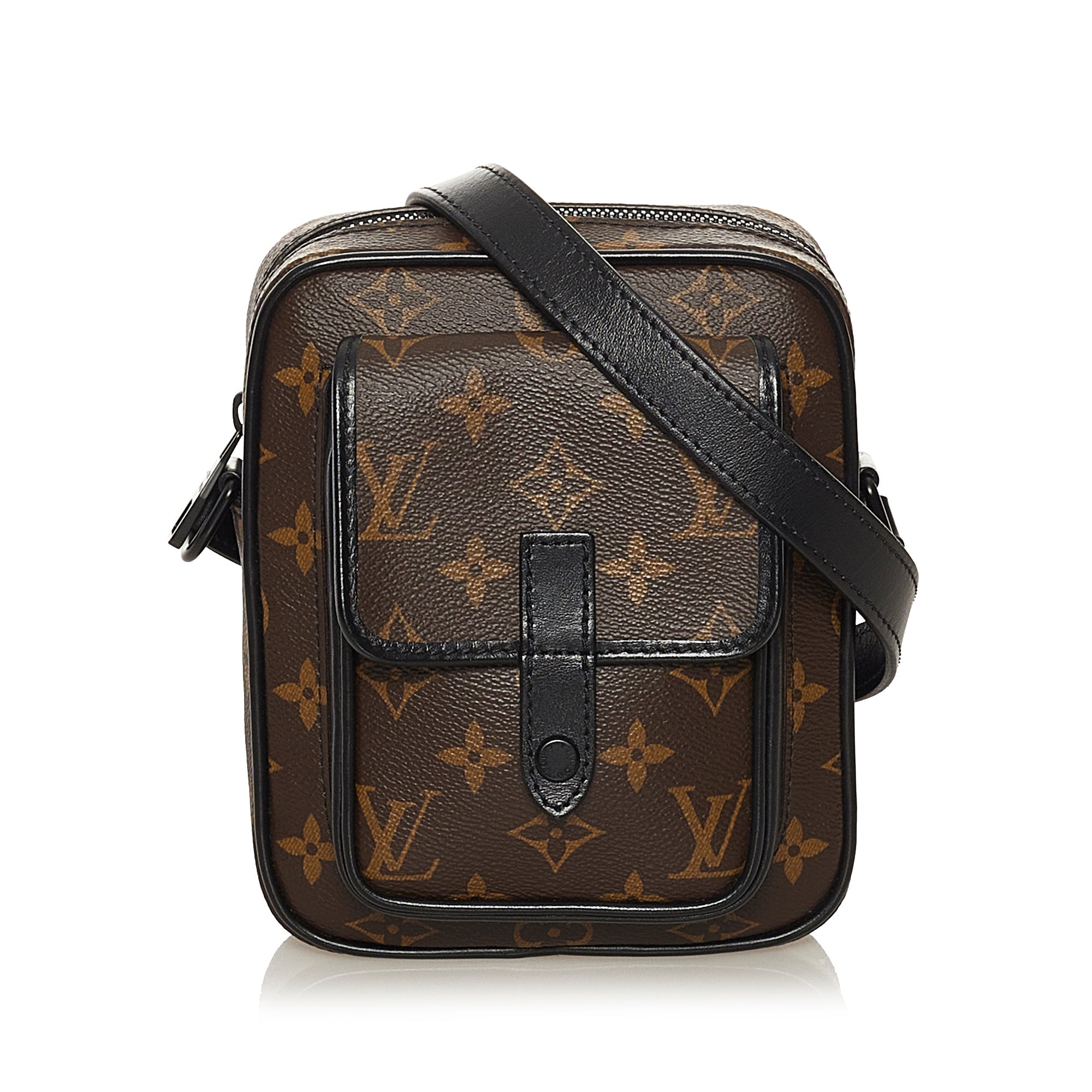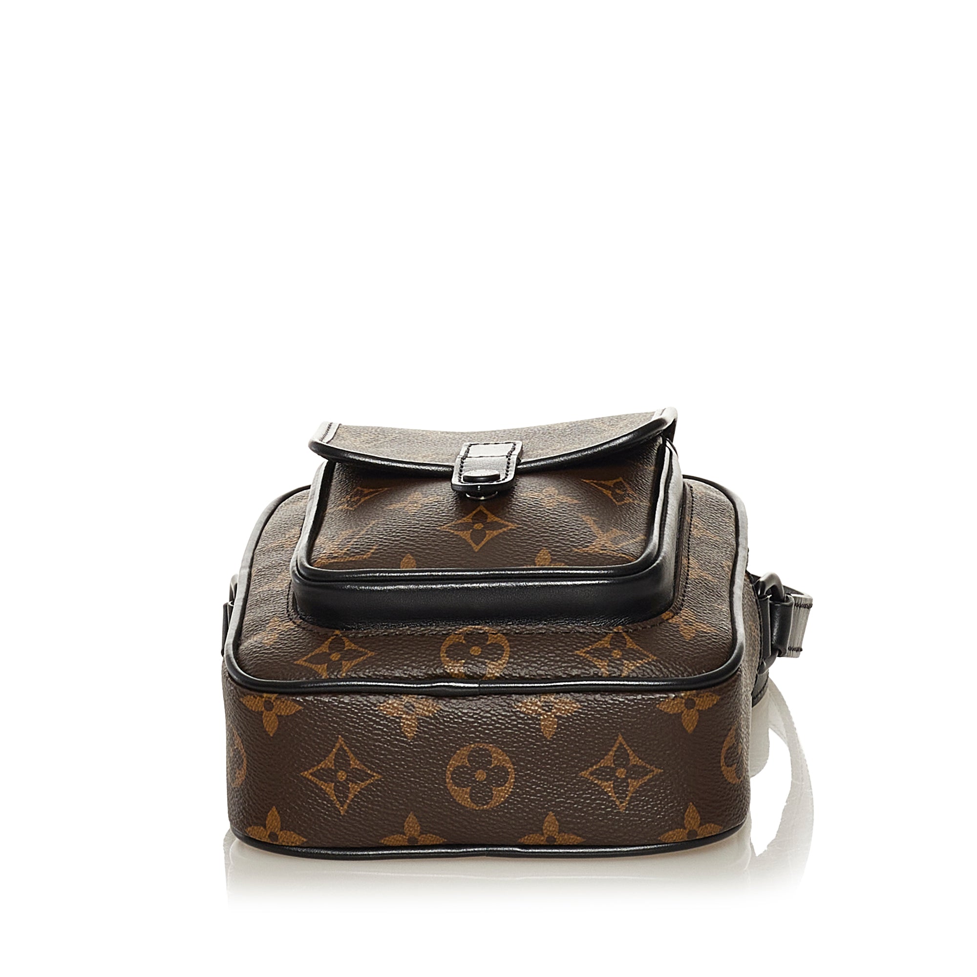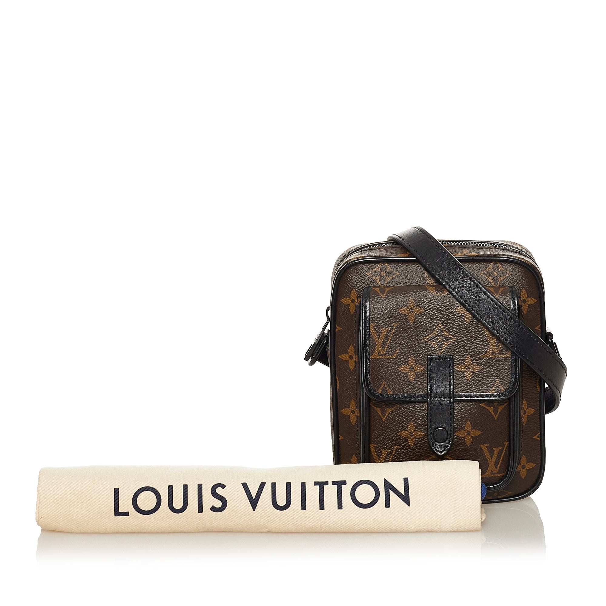 This Christopher Wearable crossbody is made of monogram macassar and features an adjustable flat strap, exterior flap pocket with magnetic closure, top zipper closure and interior slip pockets.