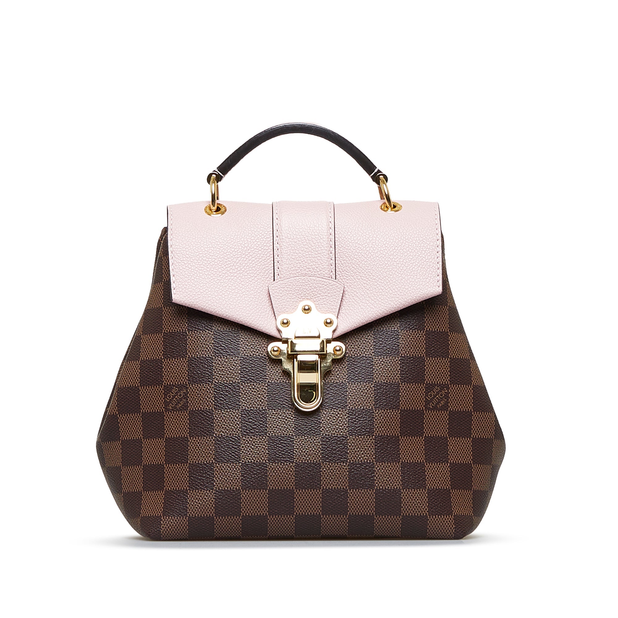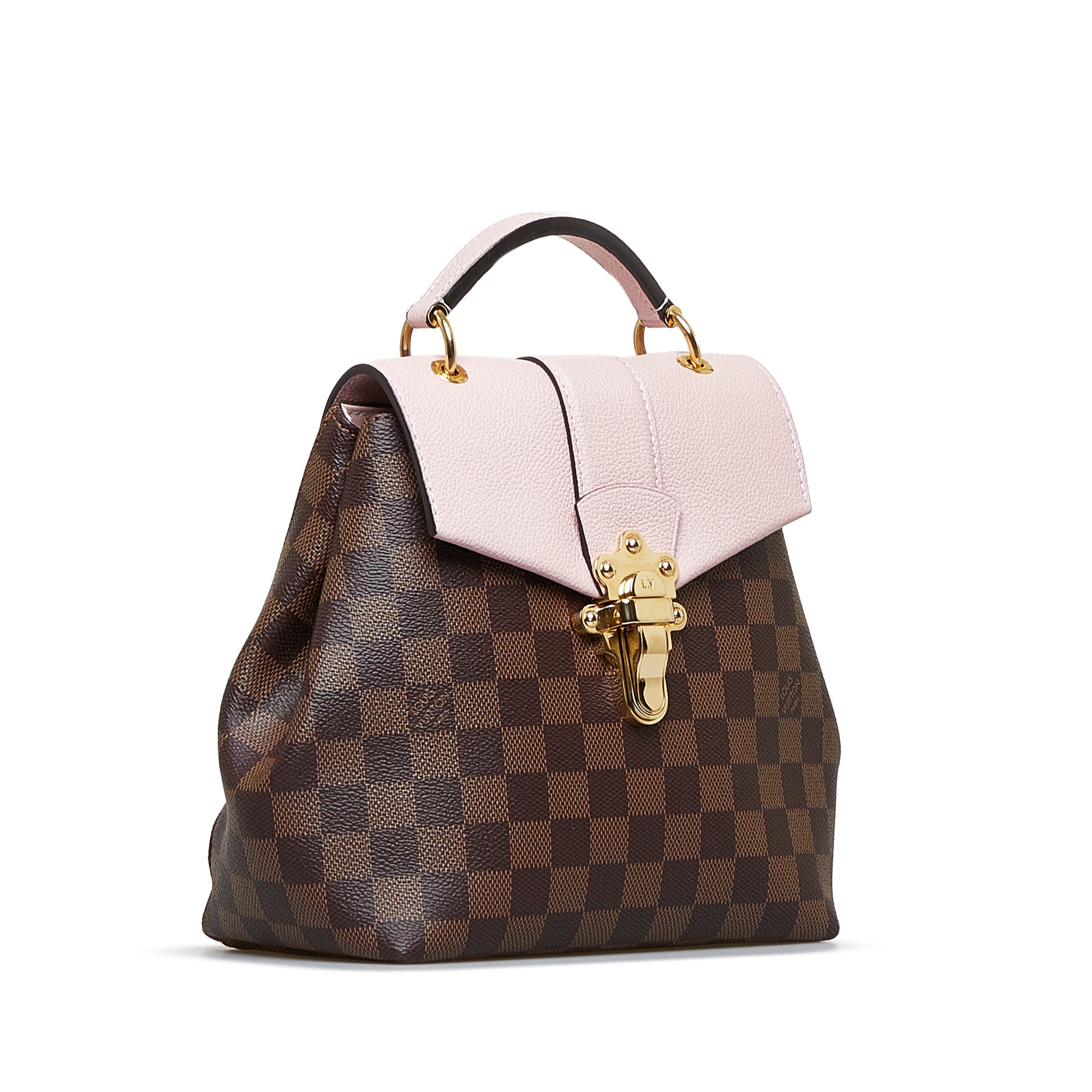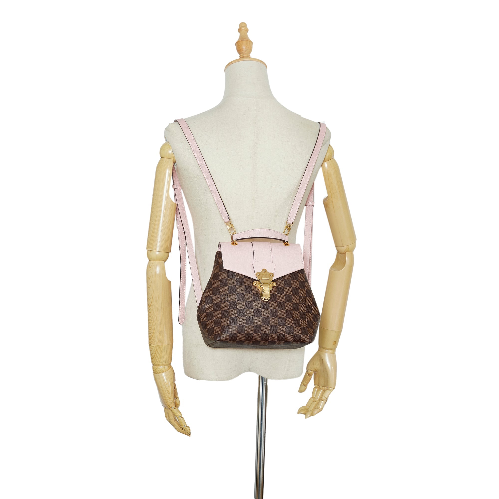 This small LV Clapton backpack is crafted from brown damier level canvas and features pink leather trim and gold details, most notably the clasp on the front flap. The Bag features back straps as well as a flat leather handle at the top. Inside the backpack has an open slip pocket.