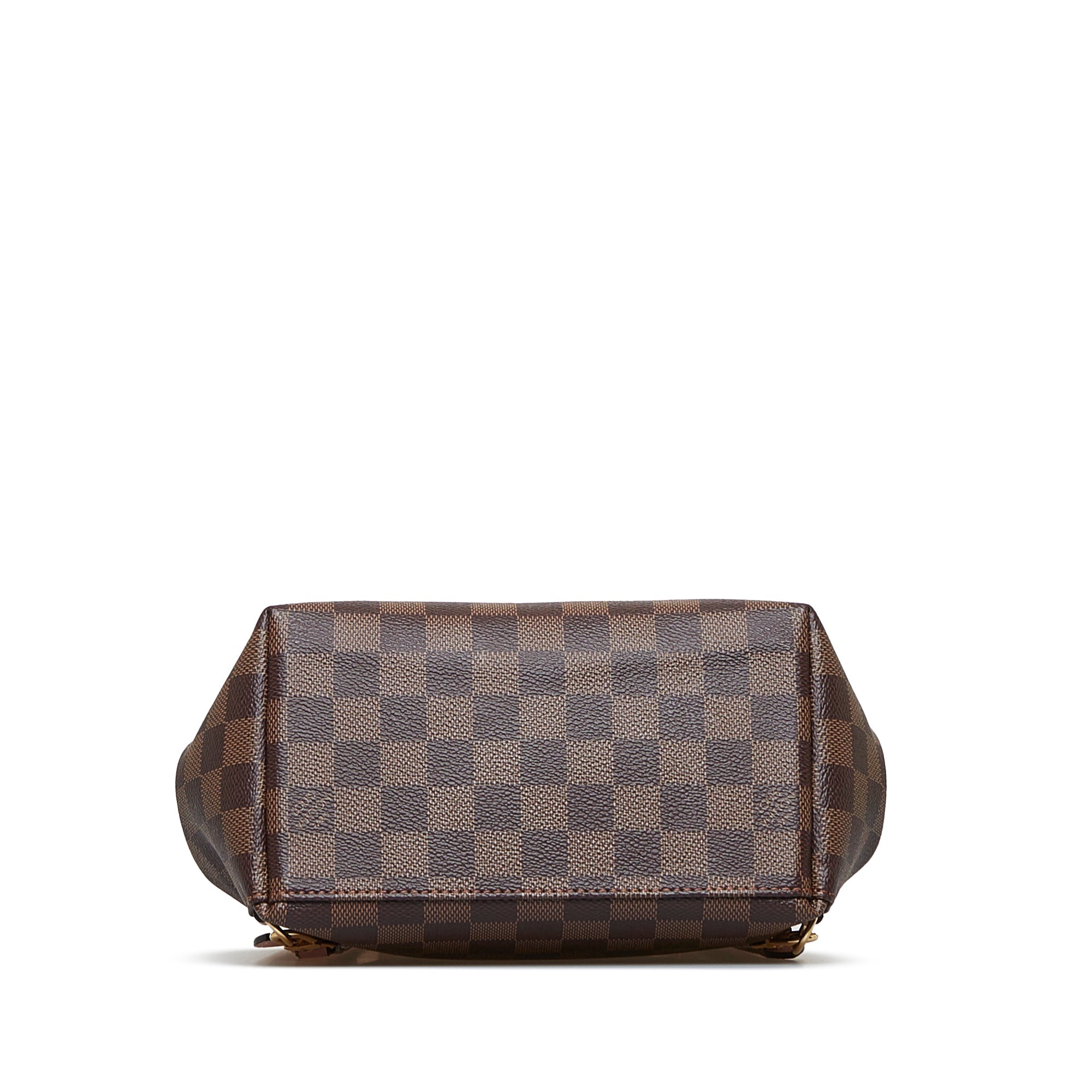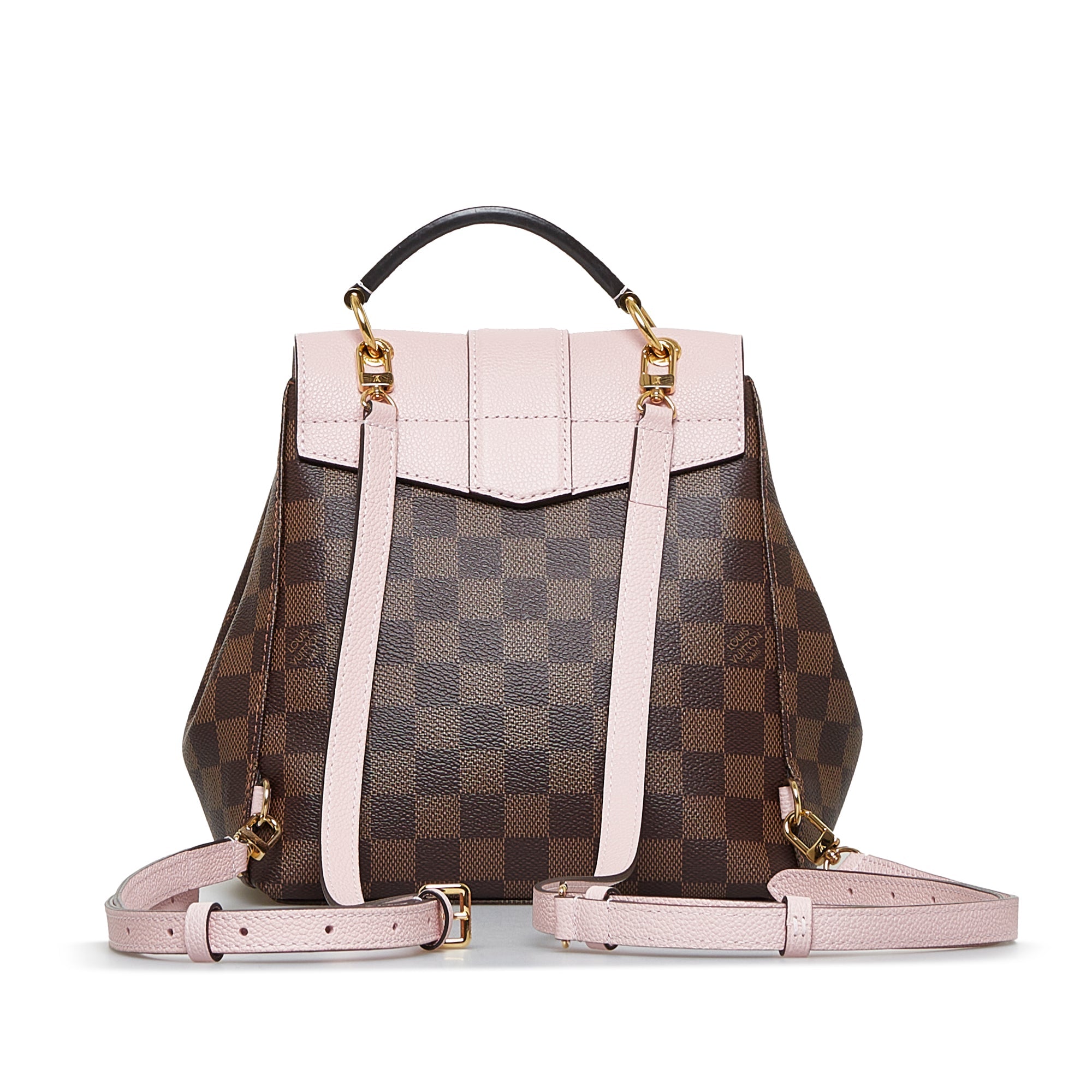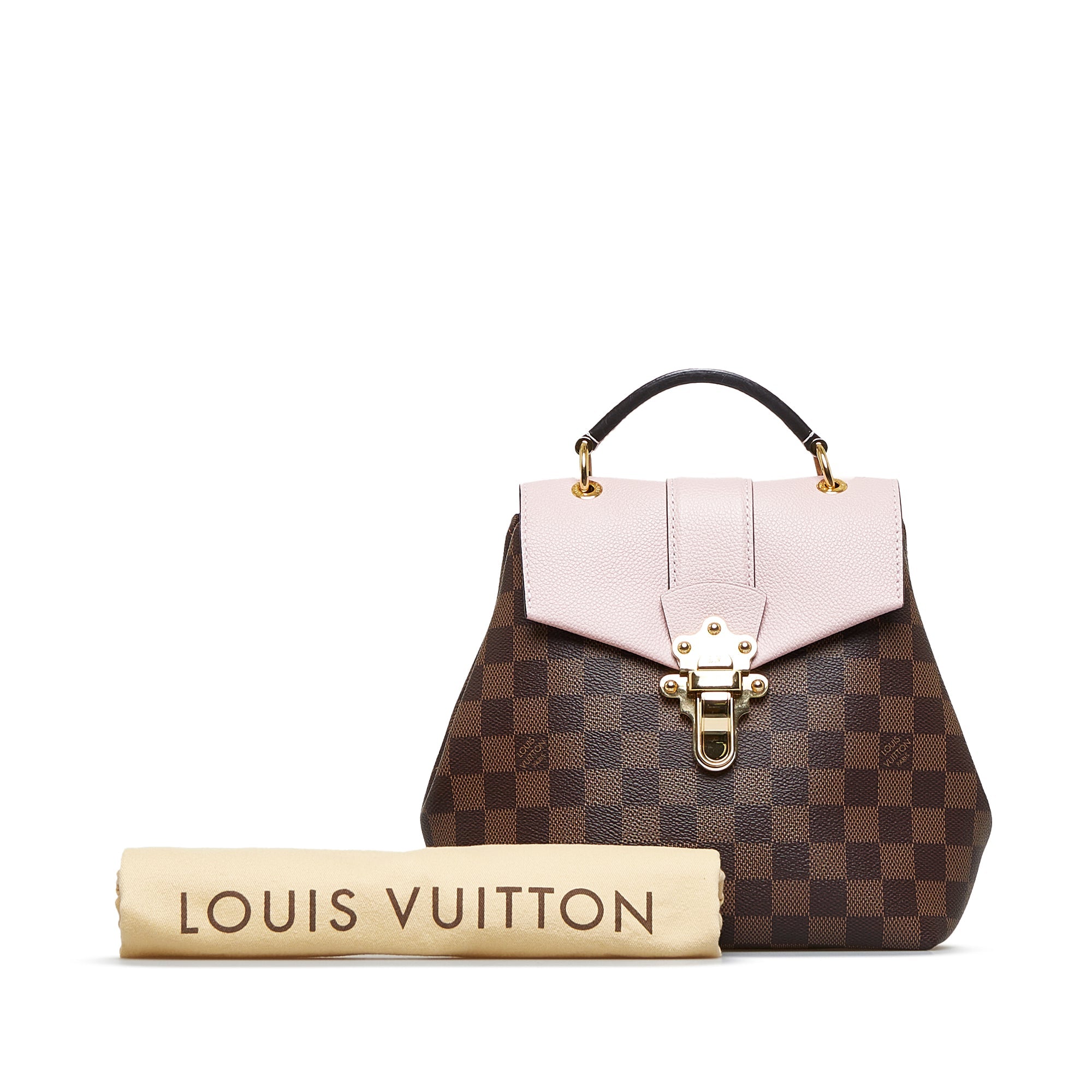 This small LV Clapton backpack is crafted from brown damier level canvas and features pink leather trim and gold details, most notably the clasp on the front flap. The Bag features back straps as well as a flat leather handle at the top. Inside the backpack has an open slip pocket.