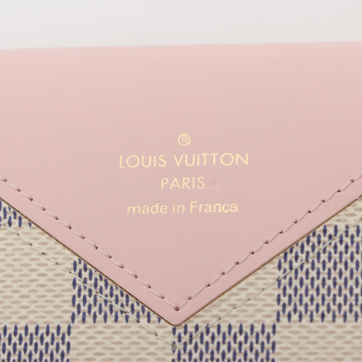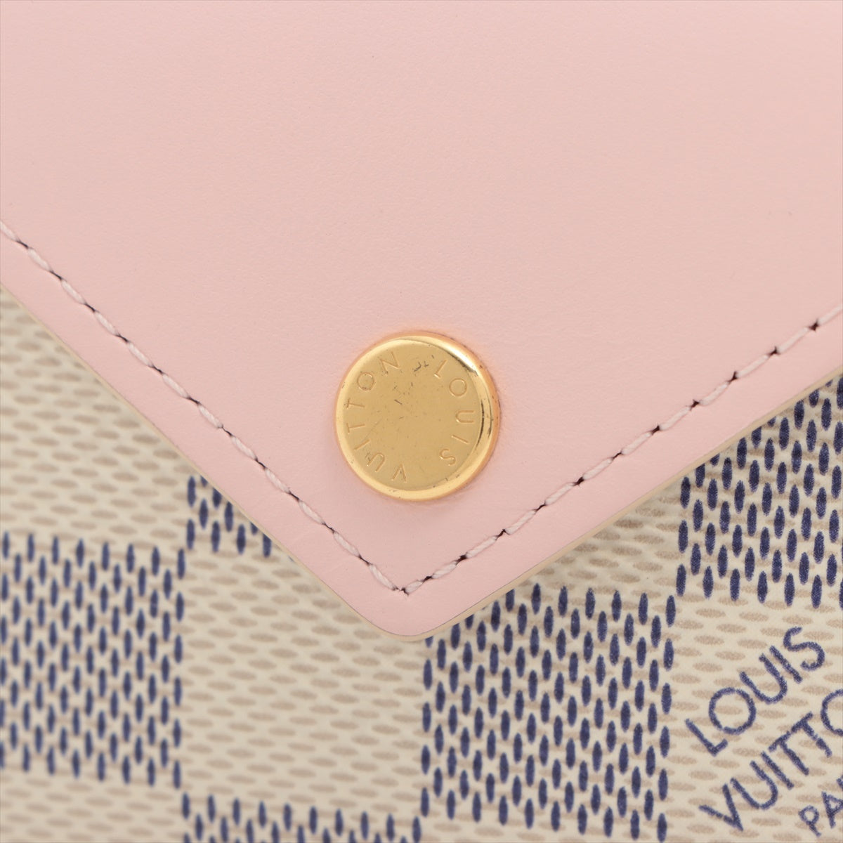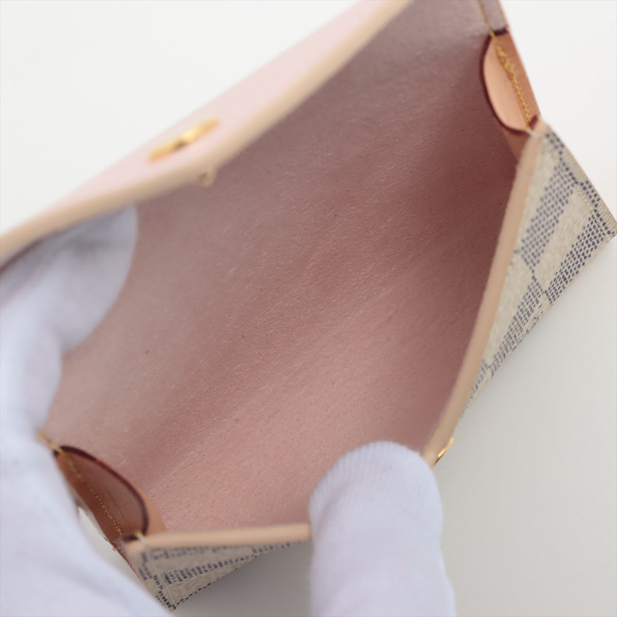 The LV Damier Azur Arsene Playing Cards  Pouch in Rose Ballerine is a delightful and whimsical accessory designed to carry your playing cards in style. Crafted from LV’s iconic Damier Azur canvas, the pouch boasts a fresh and elegant design. The Damier Azur pattern features a light blue and white checkerboard motif, lending a touch of sophistication to the accessory. It’s complemented by the Rose Ballerine lining and flap cover, a soft and feminine shade of pink.