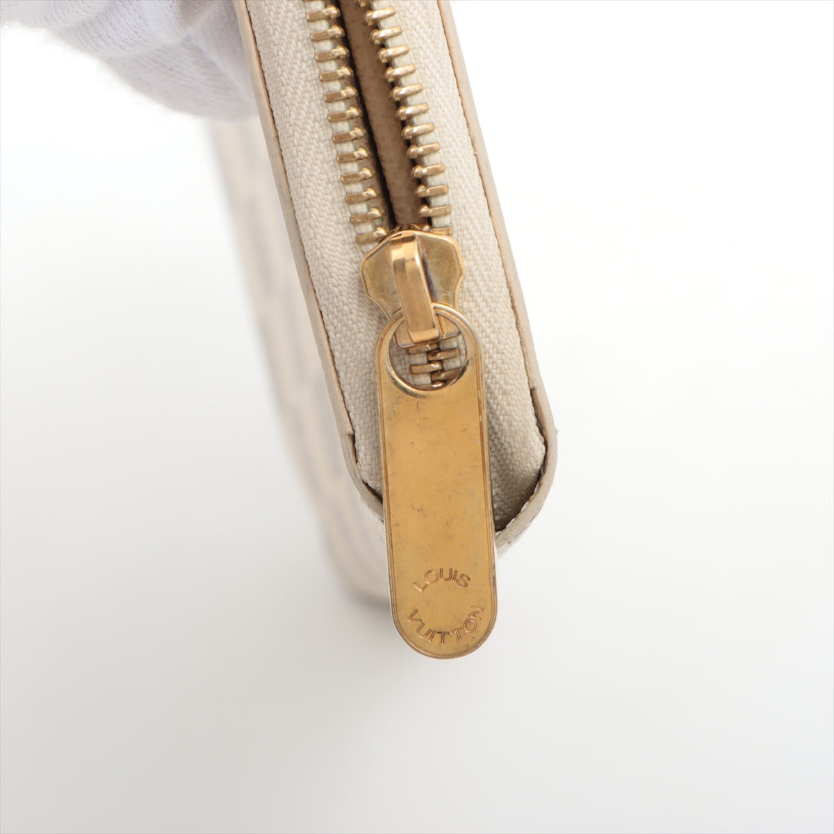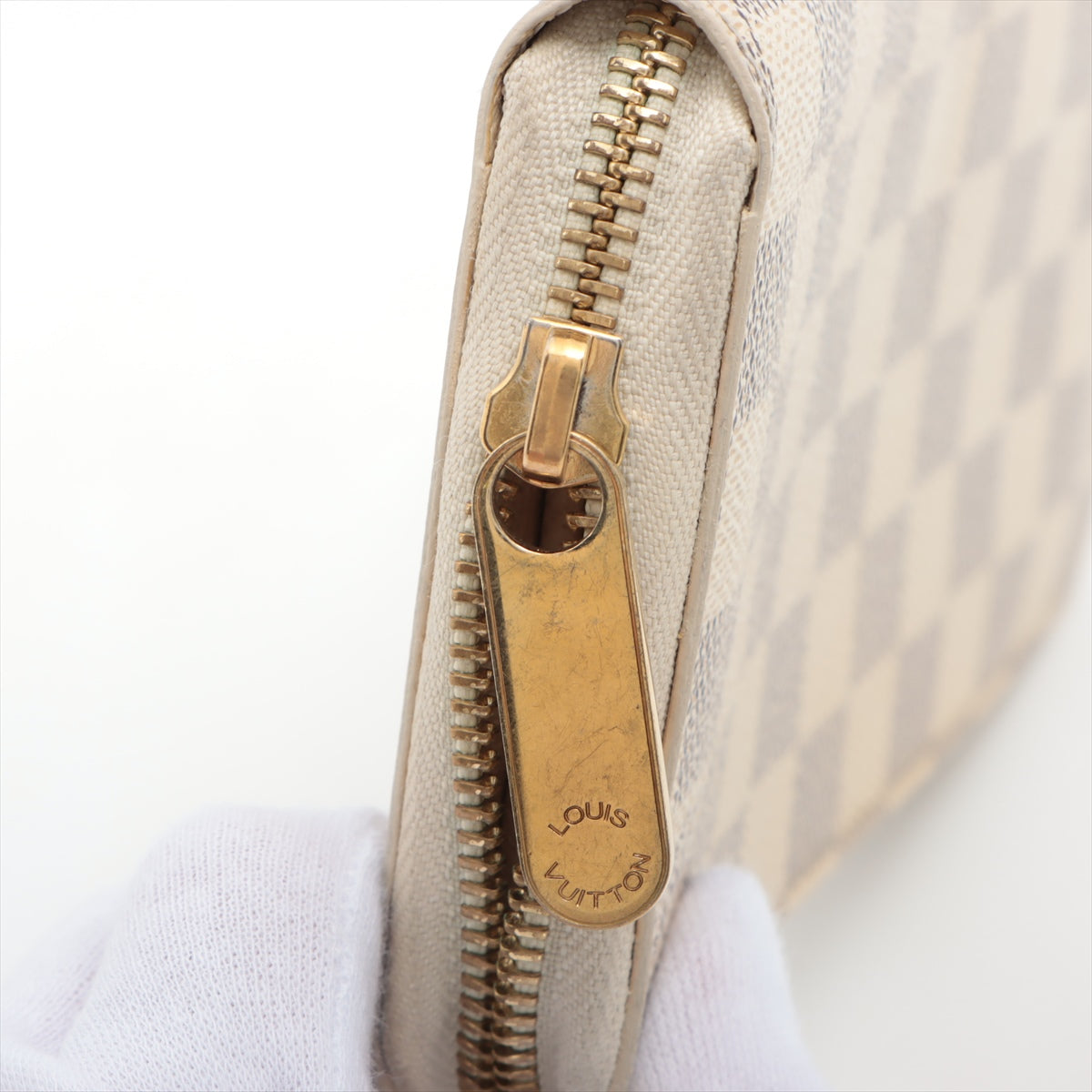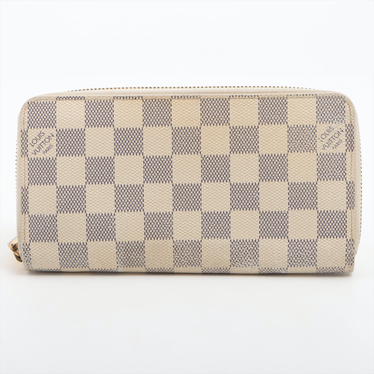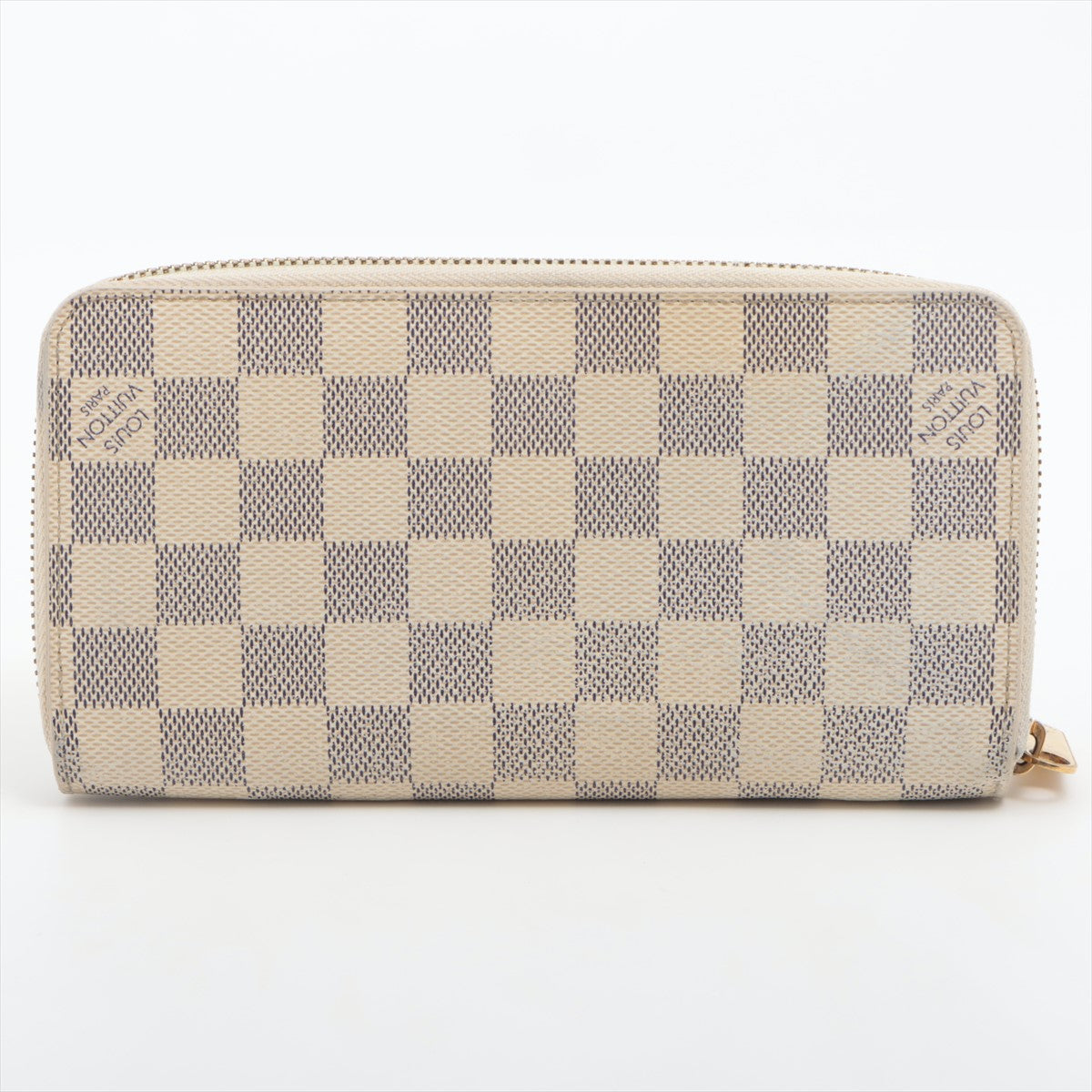 The soft, leather lining adds a touch of luxury to the wallet’s interior. It not only feels great to the touch but also enhances the overall durability of the accessory. The secure zip-around closure keeps your valuables safe and sound, making it ideal for daily use or travel. The gold-tone hardware complements the light-colored canvas, adding a touch of glamour to the design. The Damier Azur pattern, with its iconic checkered print and subtle LV logo, makes the wallet instantly recognizable as a luxury fashion piece.