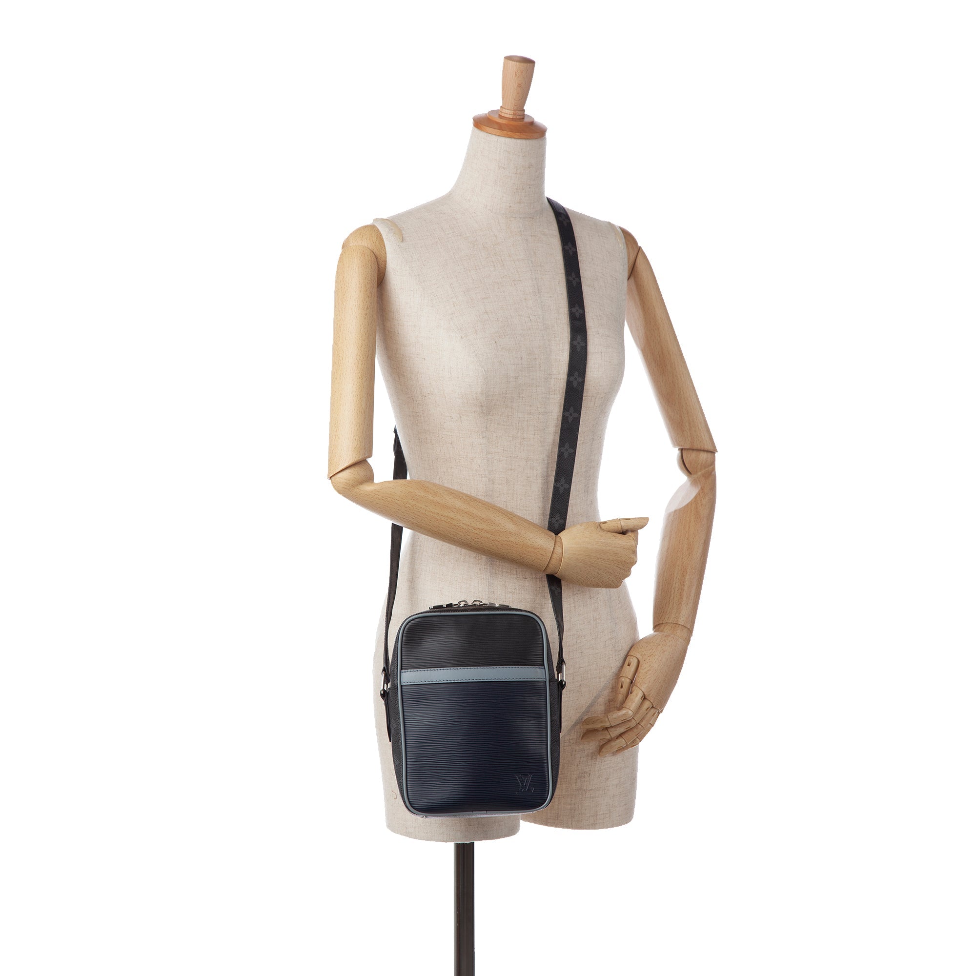The Danube has a blue epi leather body with monogram canvas trim, an exterior front with slip pocket, an adjustable shoulder strap, and a top zipper closure.