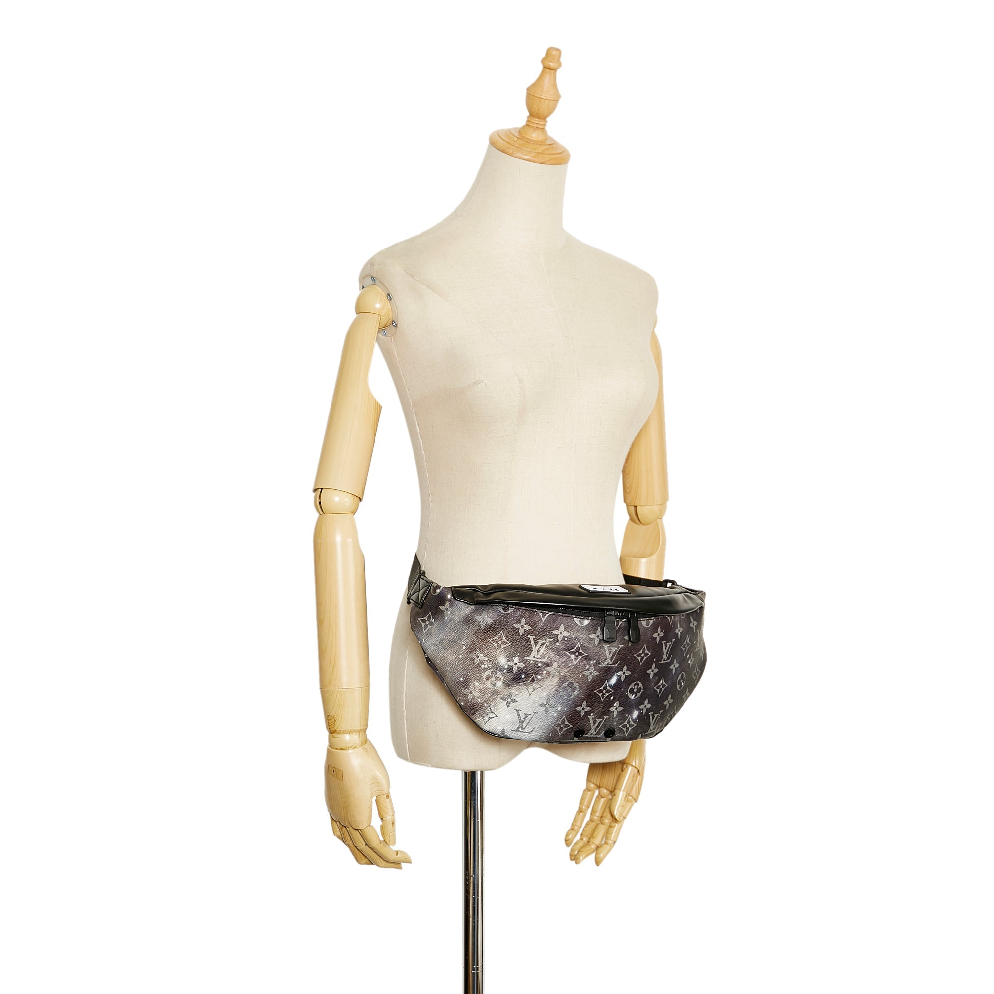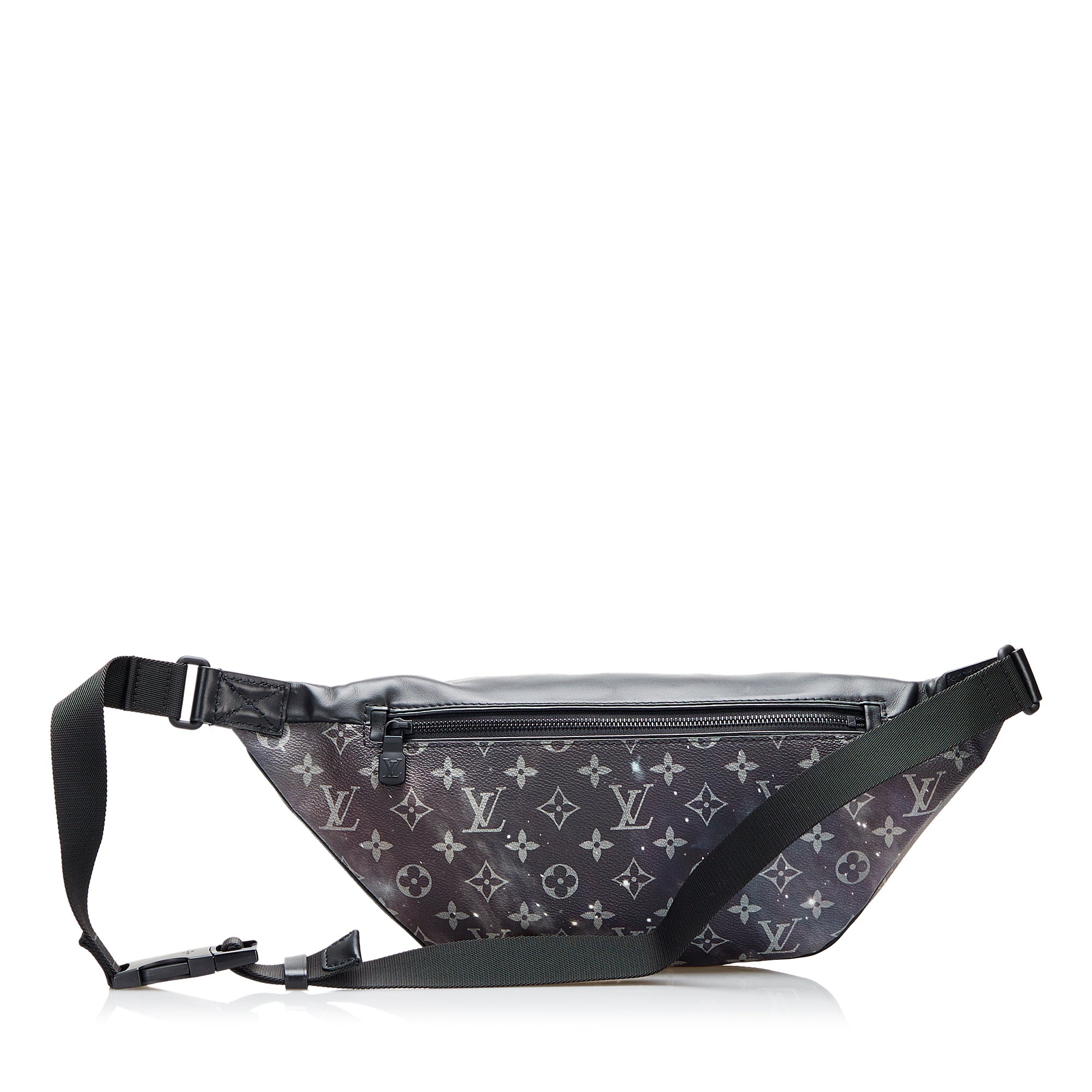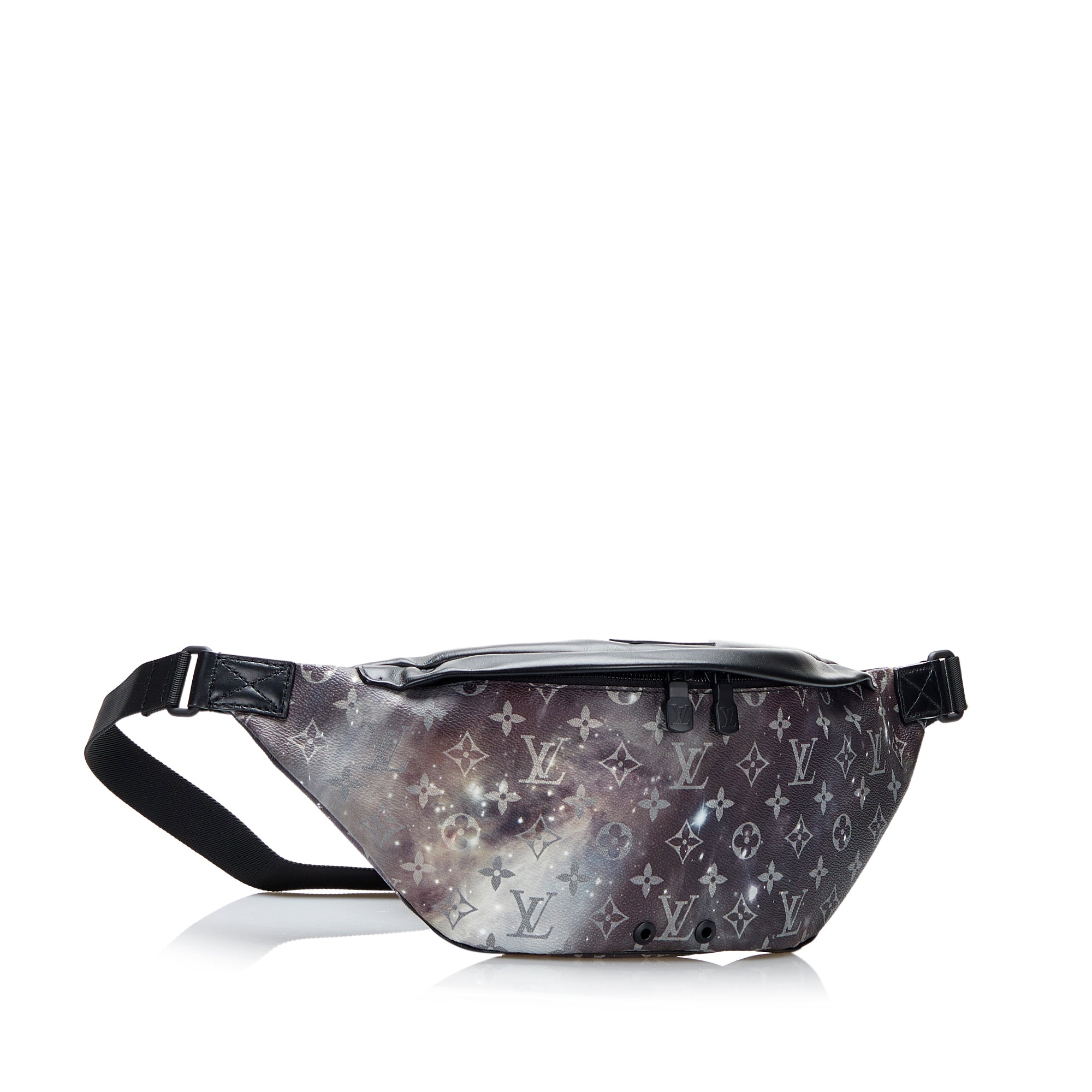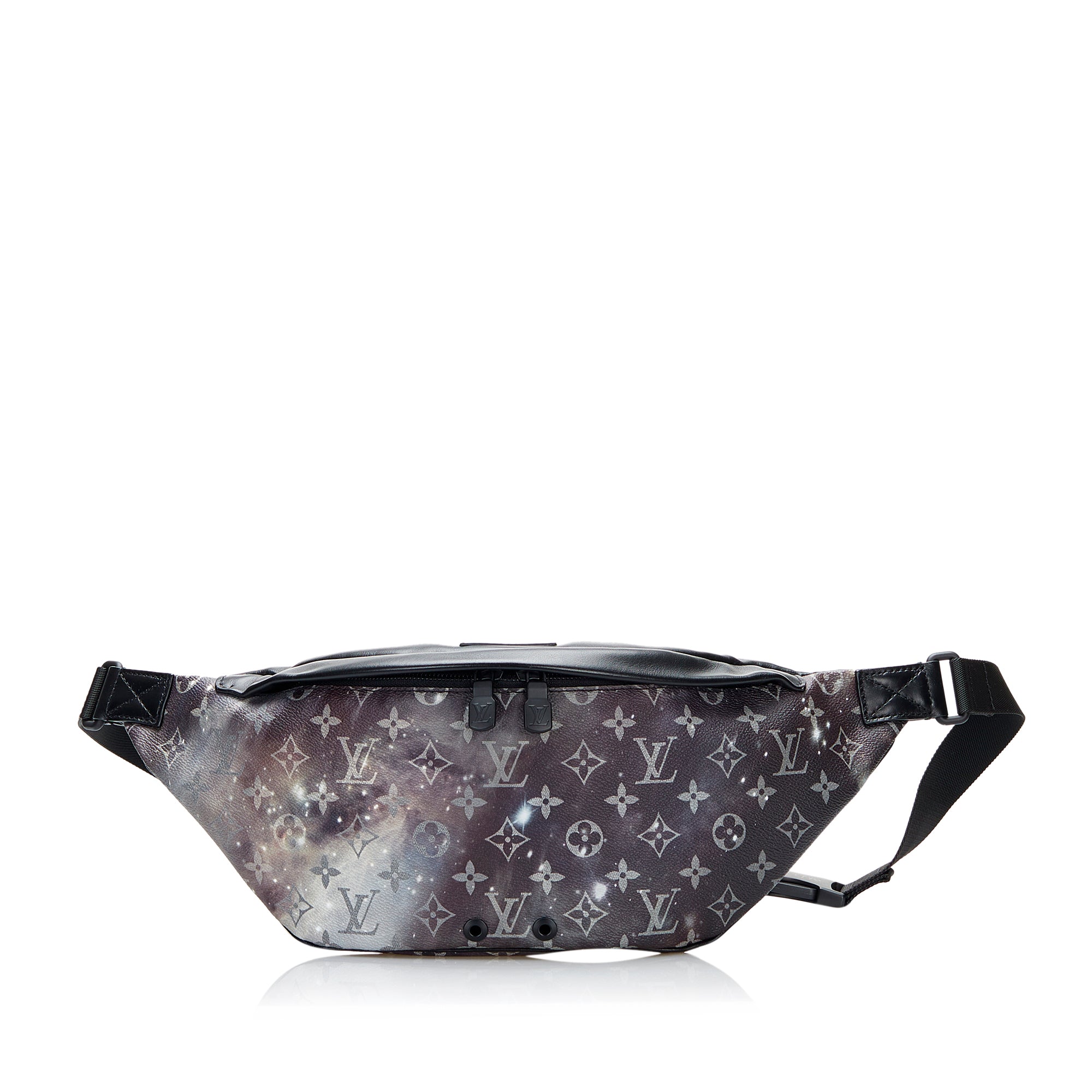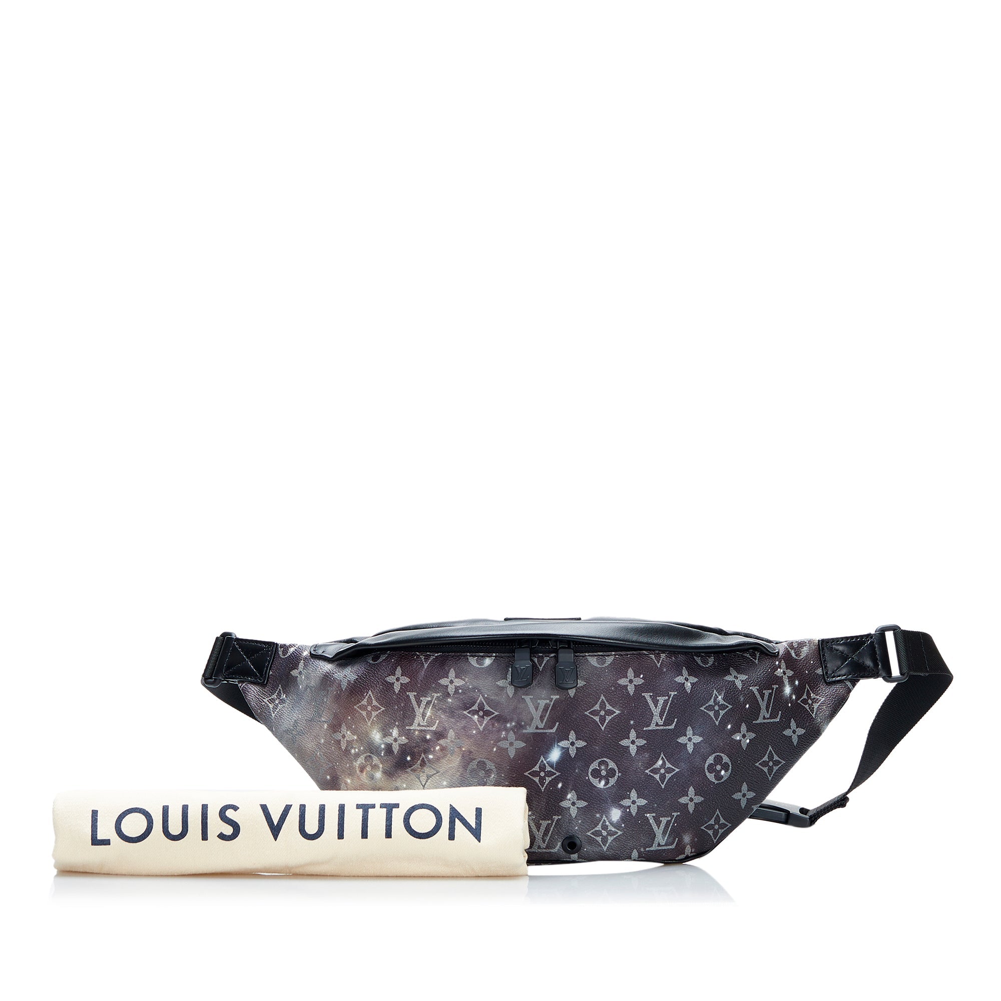 This LV Discovery fanny pack is crafted from gray Galaxy Monogram canvas and features black leather trim, matte black metal details, a zipper closure, and an adjustable length fabric belt. At the back, the Bag has a small zippered pocket. The Bag can be worn at the waist or across the body.