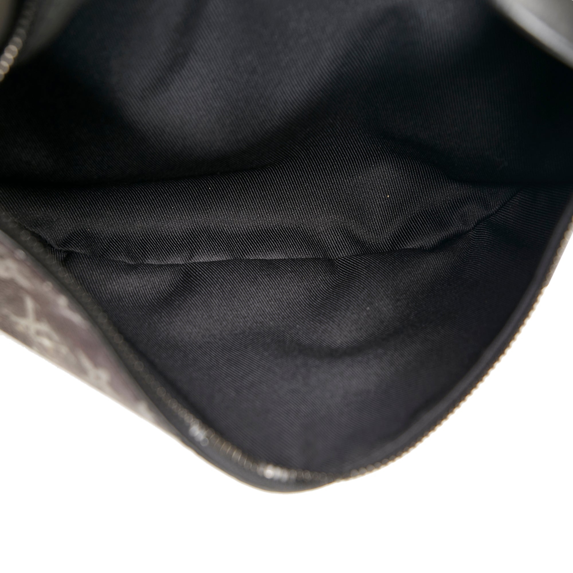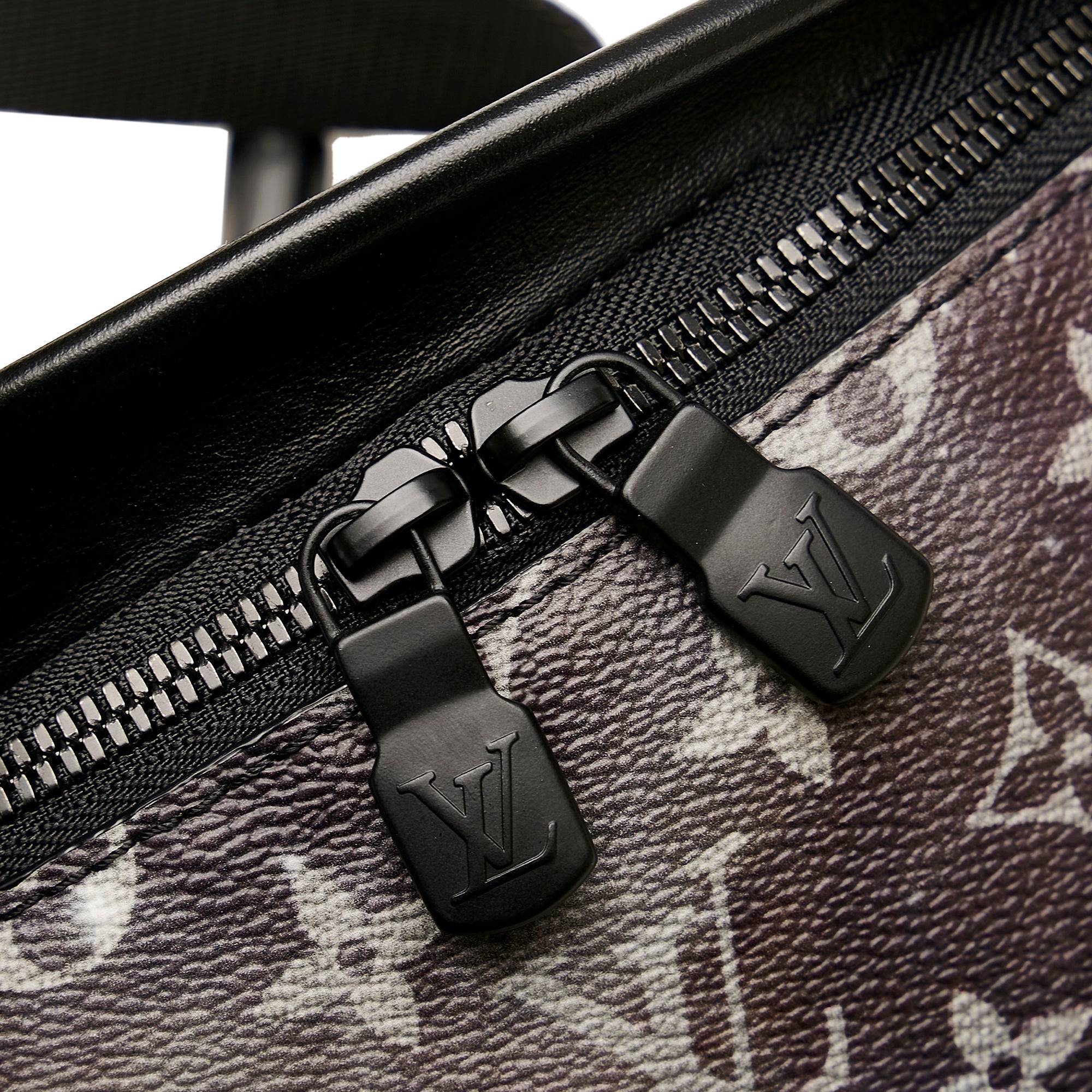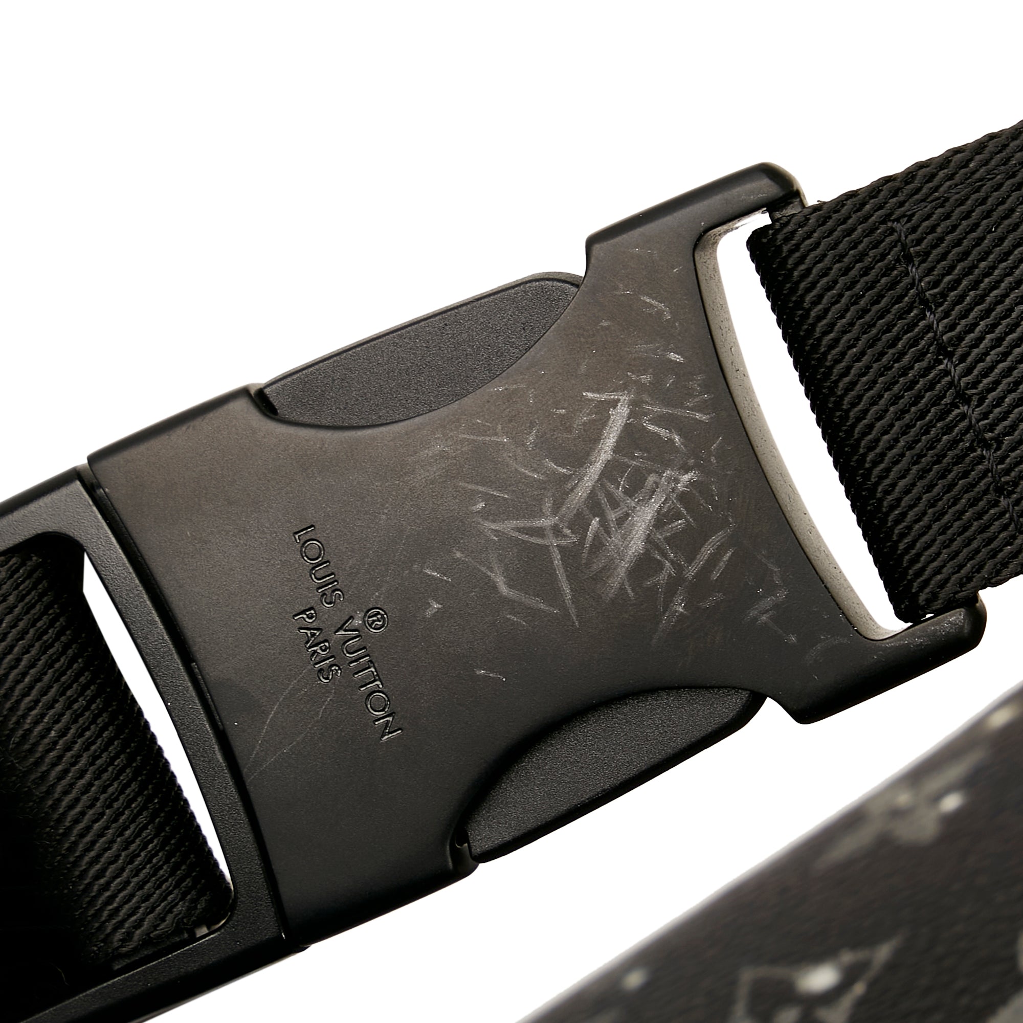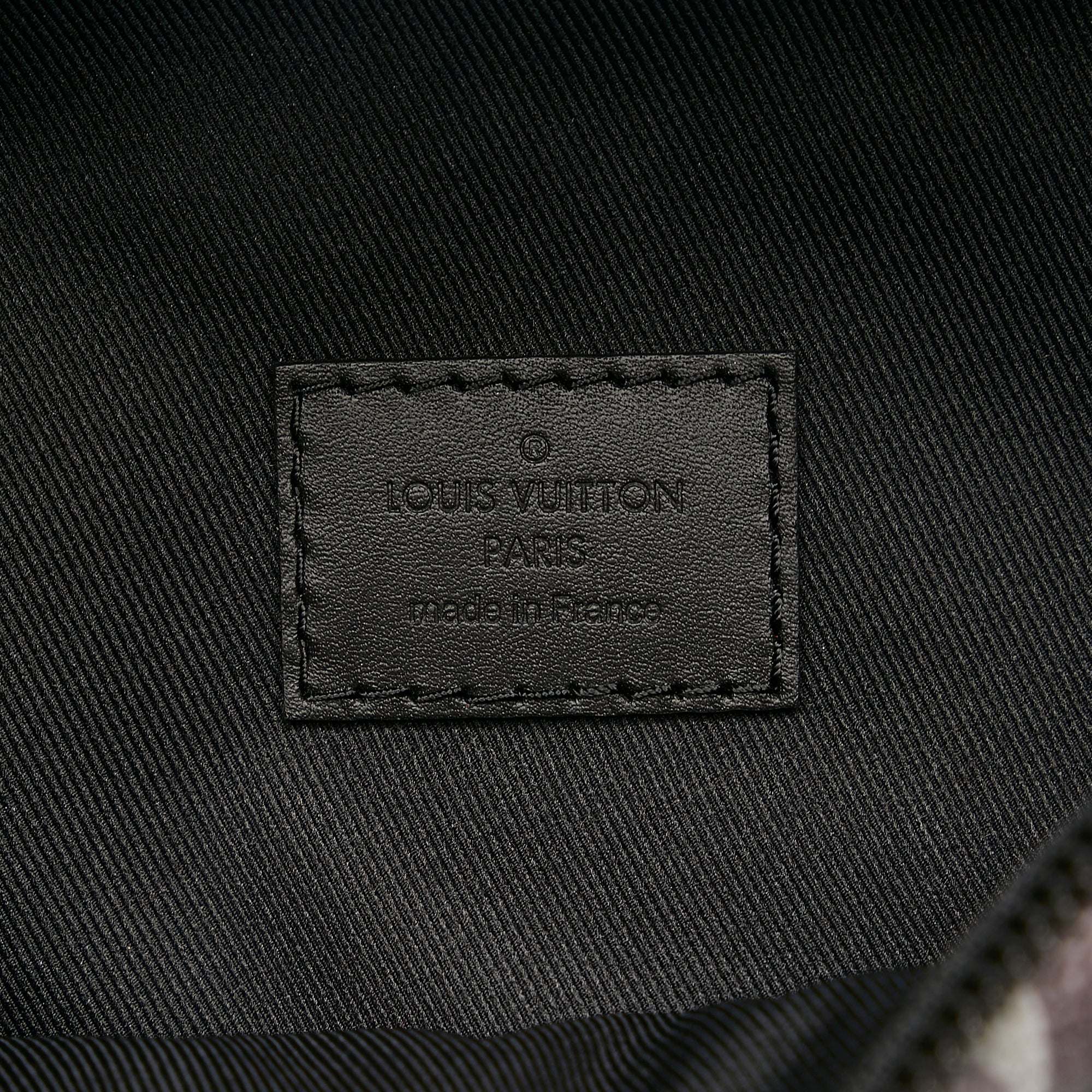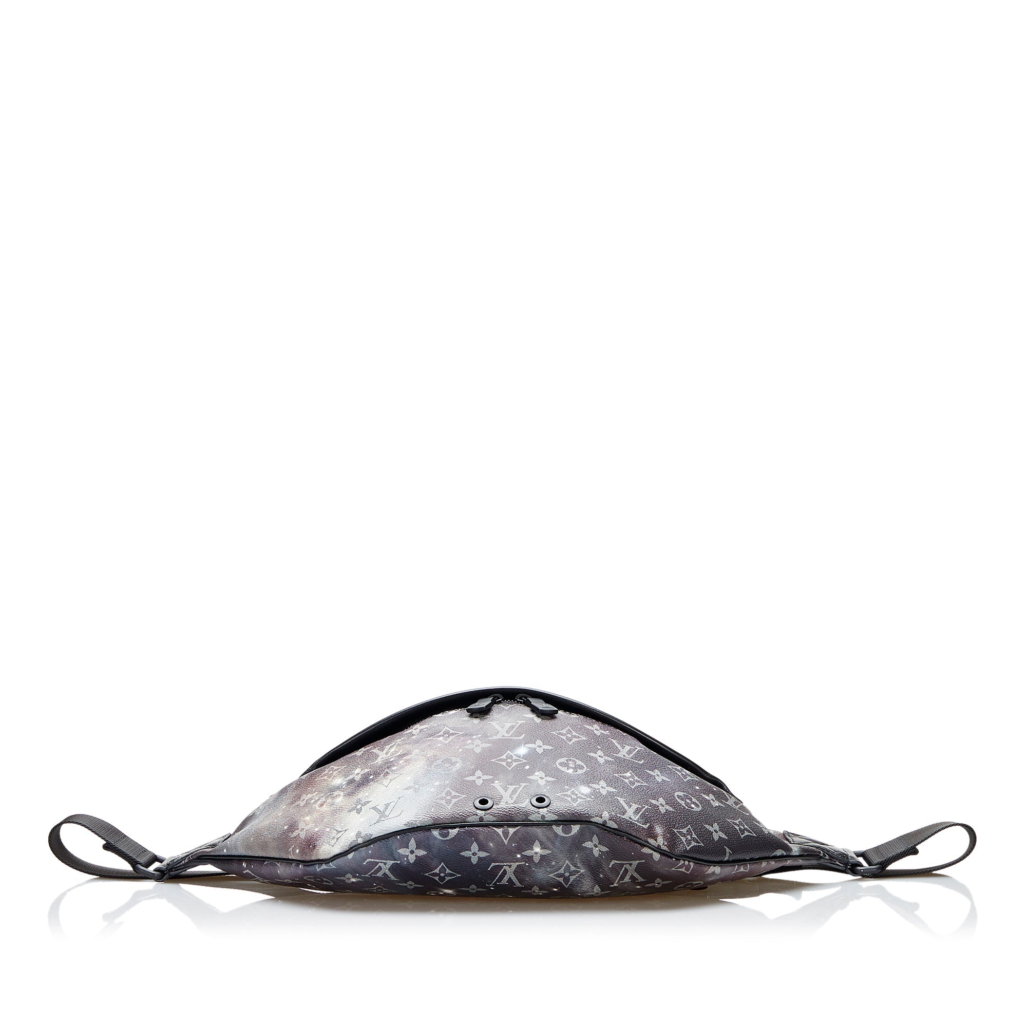This LV Discovery fanny pack is crafted from gray Galaxy Monogram canvas and features black leather trim, matte black metal details, a zipper closure, and an adjustable length fabric belt. At the back, the Bag has a small zippered pocket. The Bag can be worn at the waist or across the body.
