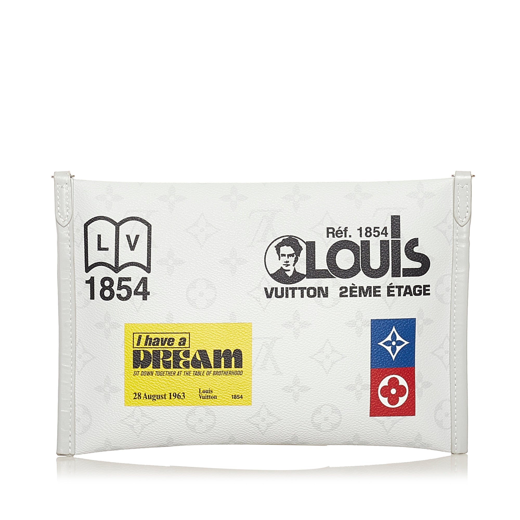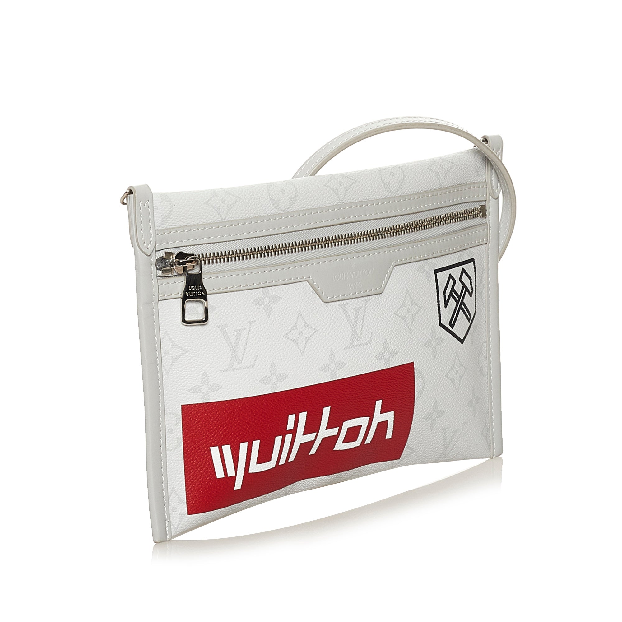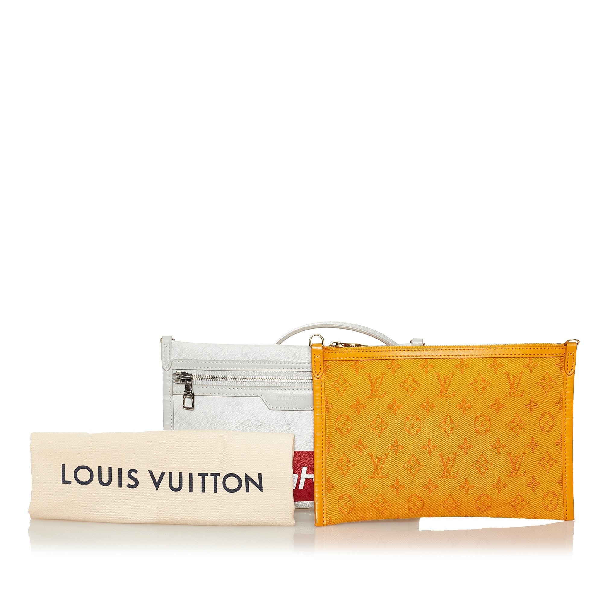 Crafted from white Monogram canvas with colorful logo prints, this LV Double Flat Bag features leather trim and a detachable shoulder strap, a zippered front compartment, and a zippered top opening. The Bag is best worn across the body and comes with another matching pouch made of yellow Monogram Canvas. After removing the shoulder strap, the Bag can also be carried as a clutch in the hand.