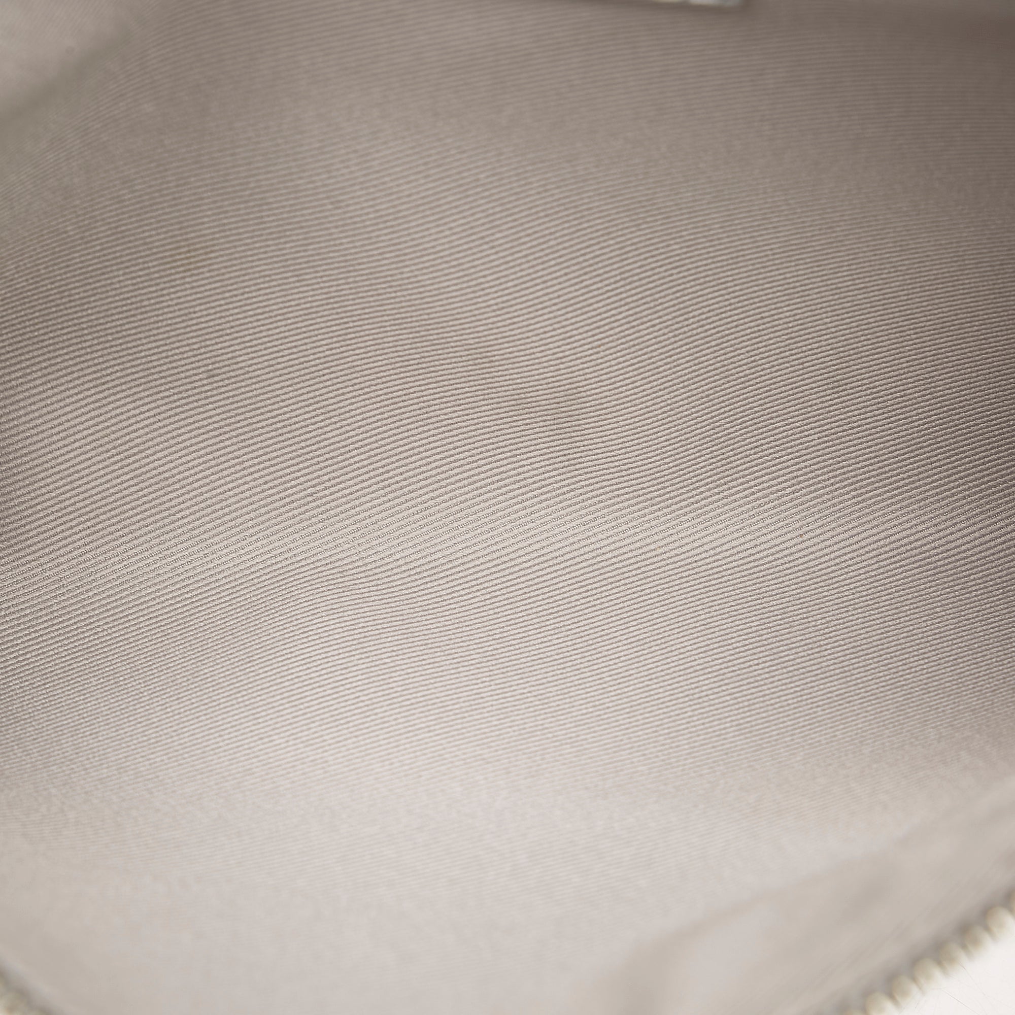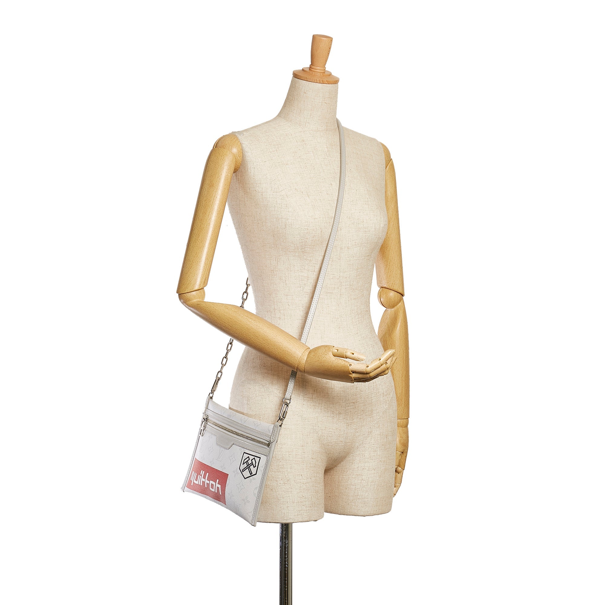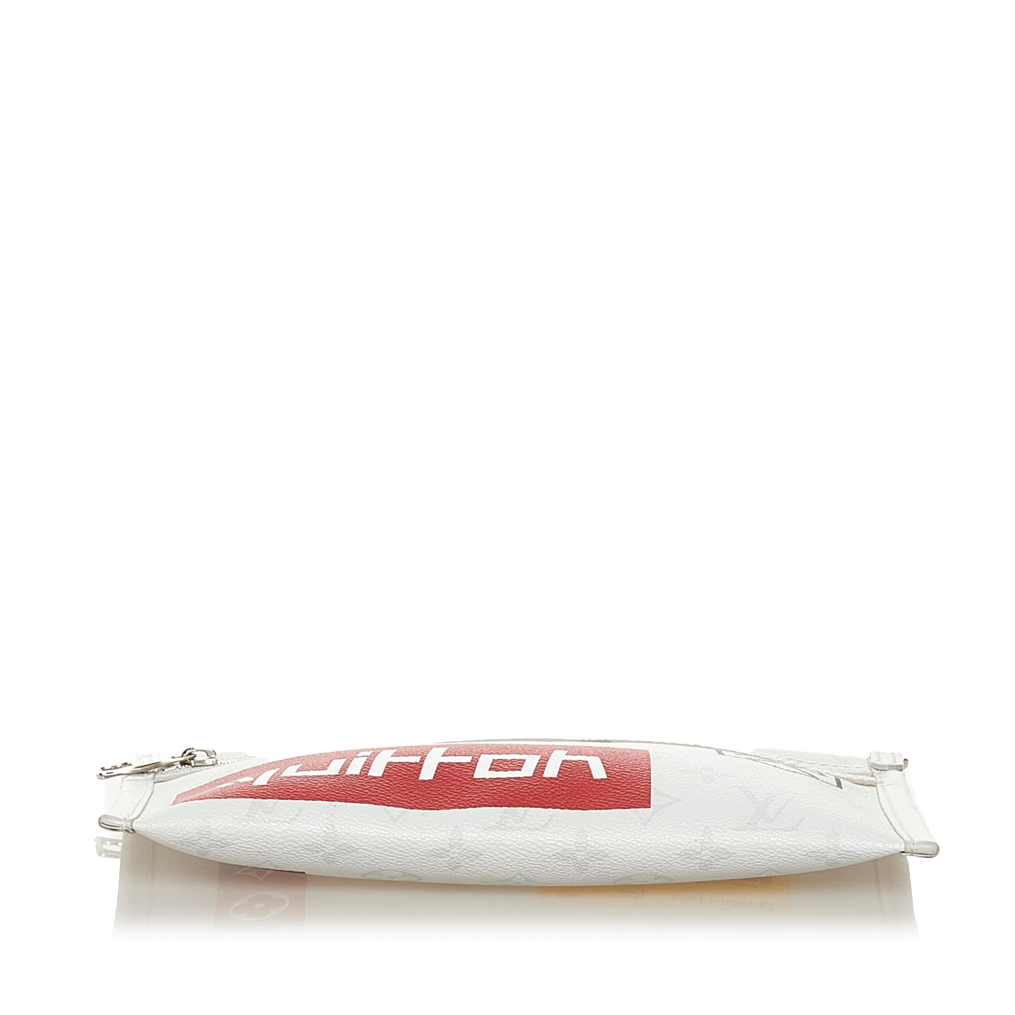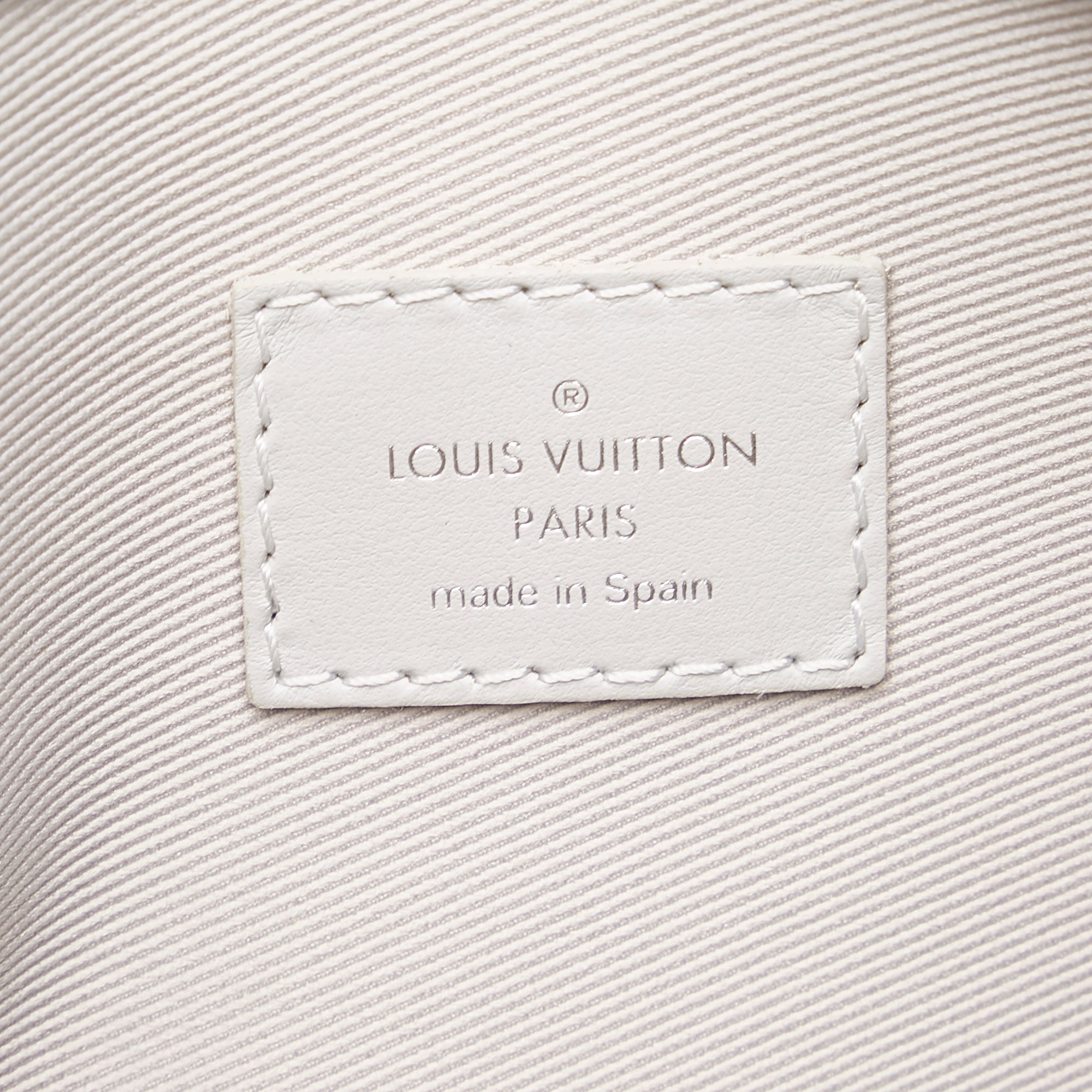 Crafted from white Monogram canvas with colorful logo prints, this LV Double Flat Bag features leather trim and a detachable shoulder strap, a zippered front compartment, and a zippered top opening. The Bag is best worn across the body and comes with another matching pouch made of yellow Monogram Canvas. After removing the shoulder strap, the Bag can also be carried as a clutch in the hand.