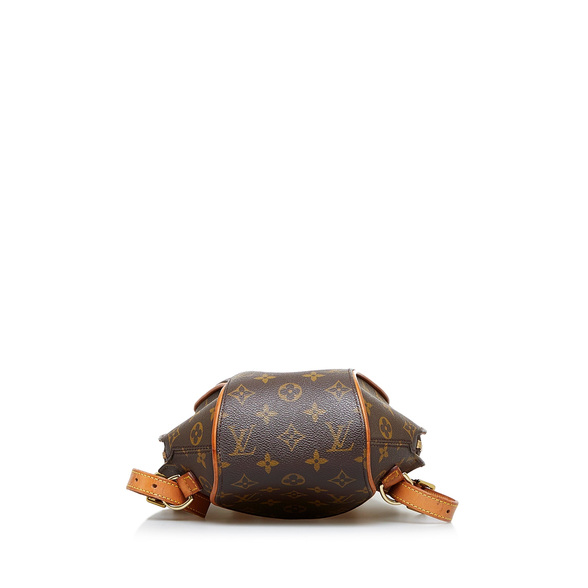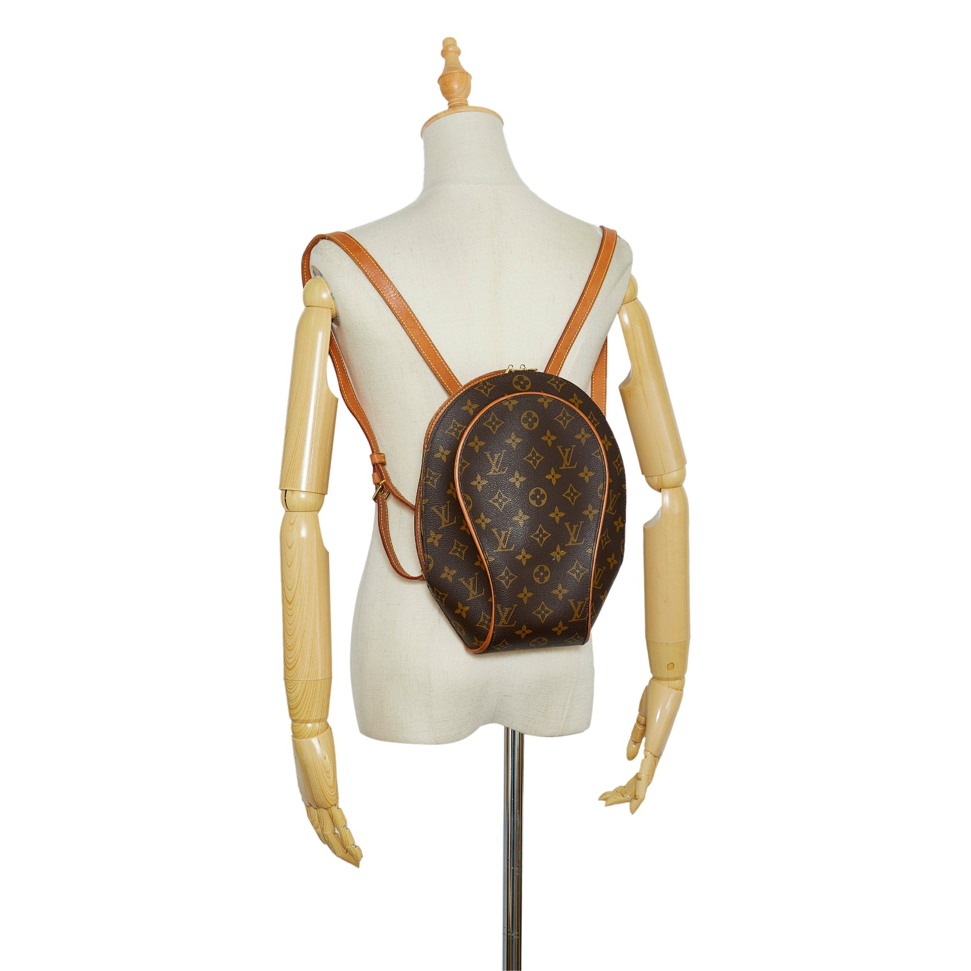 This shapely LV Ellipse Sac a Dos backpack is crafted of brown Monogram canvas and complemented by tan leather trim and straps and gold hardware. The interior is accessed via a gold double zipper. Here you will find a slip pocket. The leather straps can be varied in length for comfortable carrying. This model is no longer in production and enjoys great popularity among fans because of its unusual design.