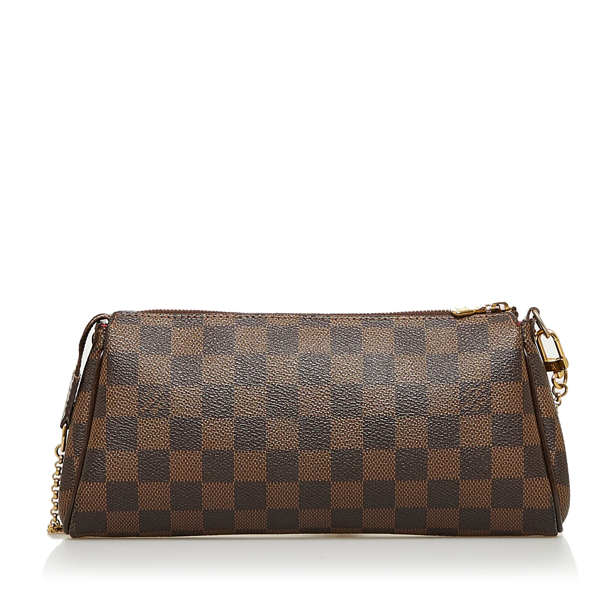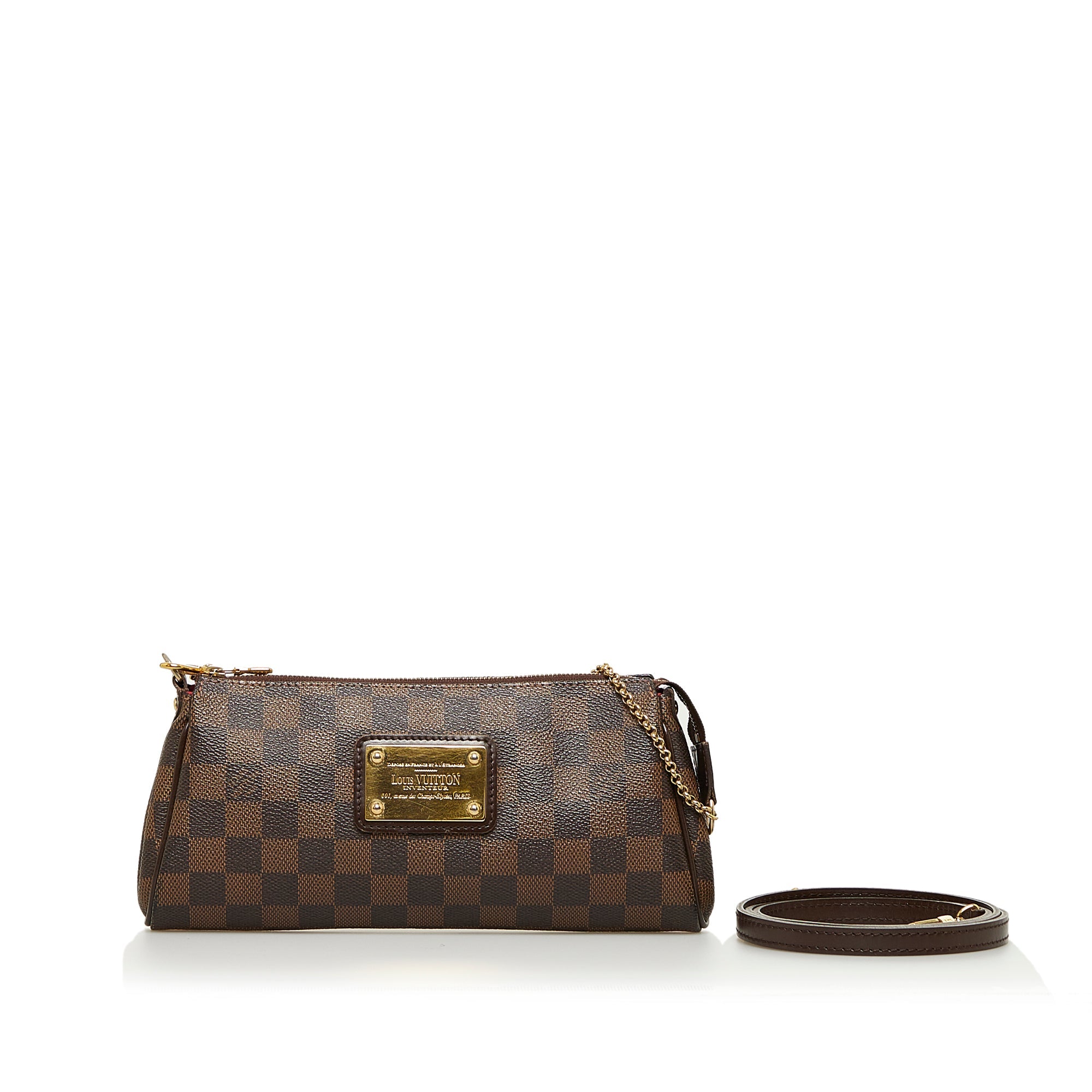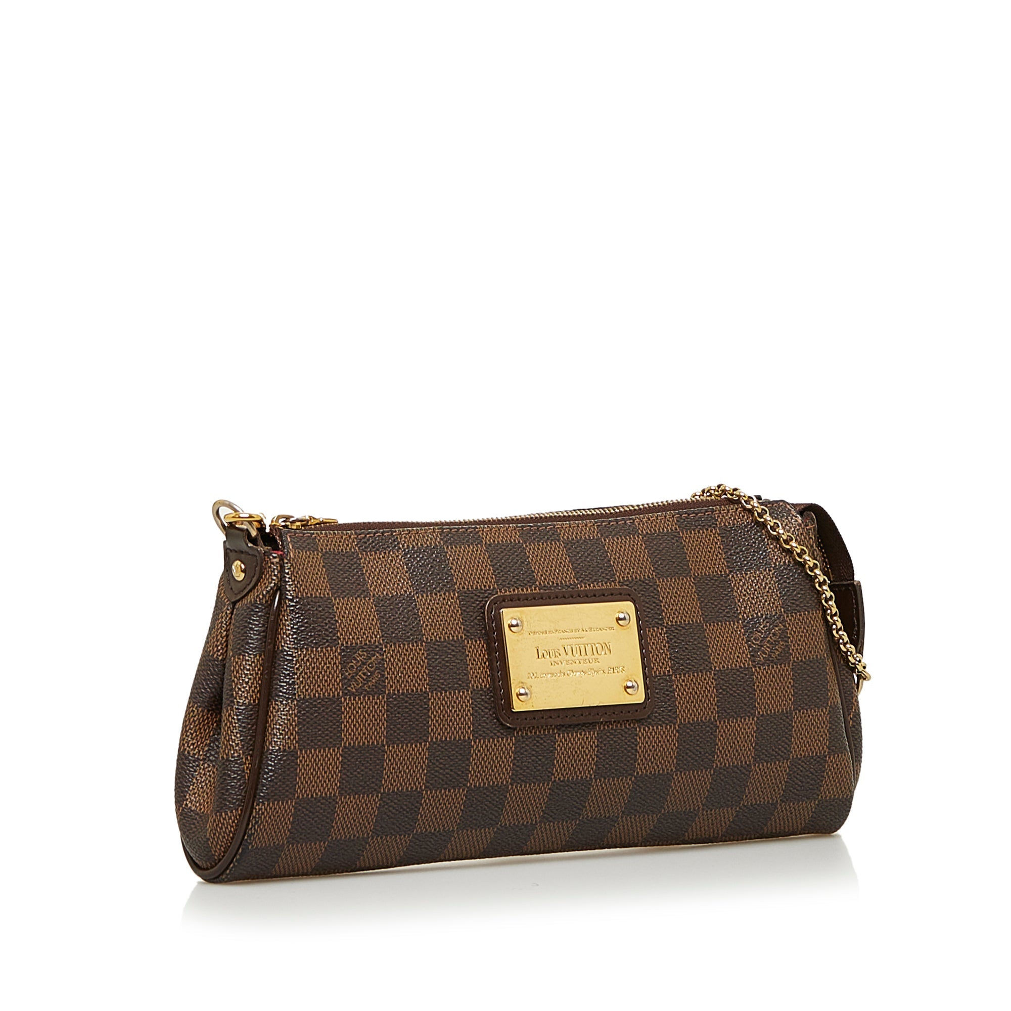 An absolute superstar among LV classics, the LV Eva in Damier Ebene Canvas bears its name in honor of fashion icon Eva Herzigová. On the front bears the Bag proudly bears a gold shield engraved with LV. With a delicate chain strap, the Bag worn near the shoulder or in the arm. Alternatively, the Bag also has a detachable shoulder strap, with the help of which the Bag crossbody can be worn.