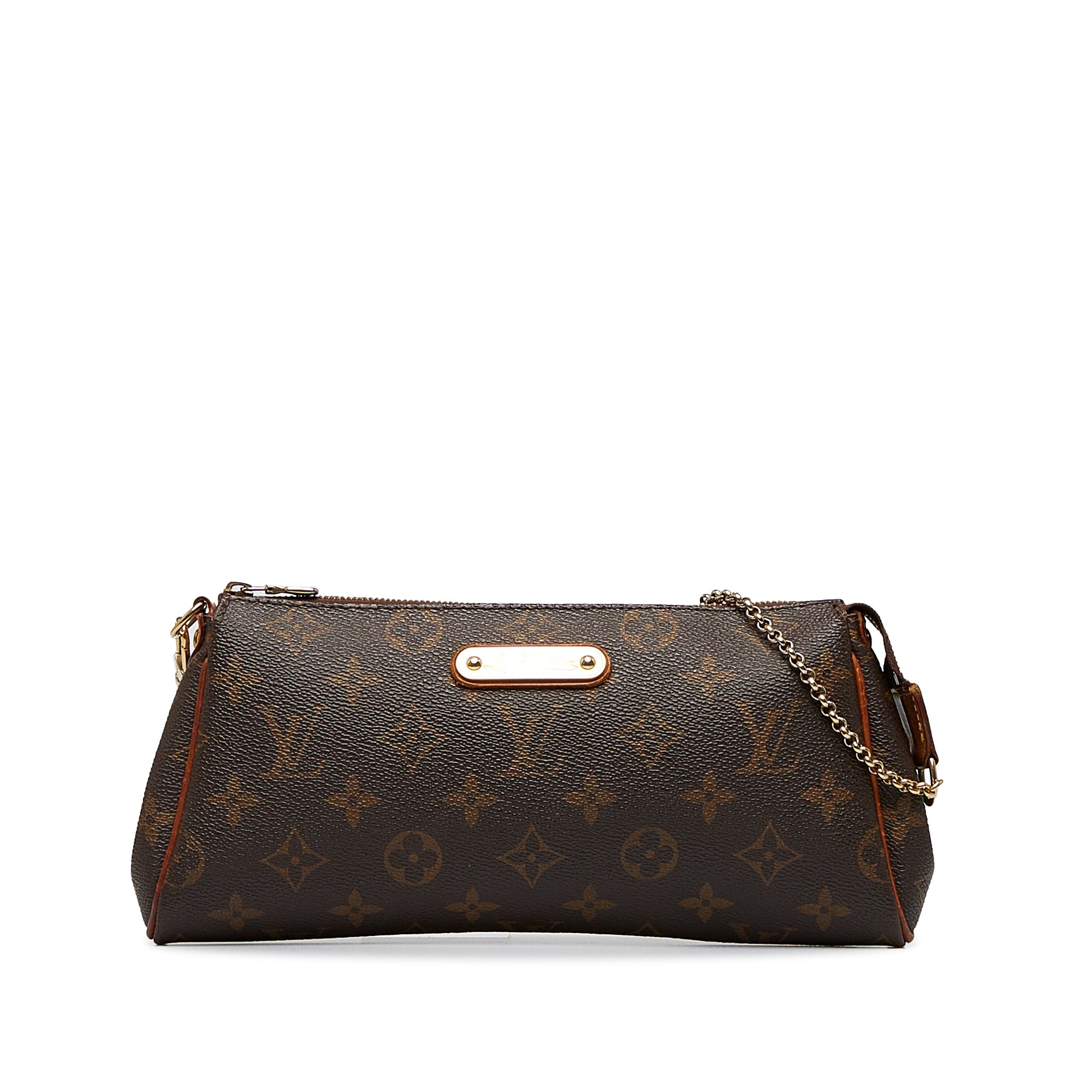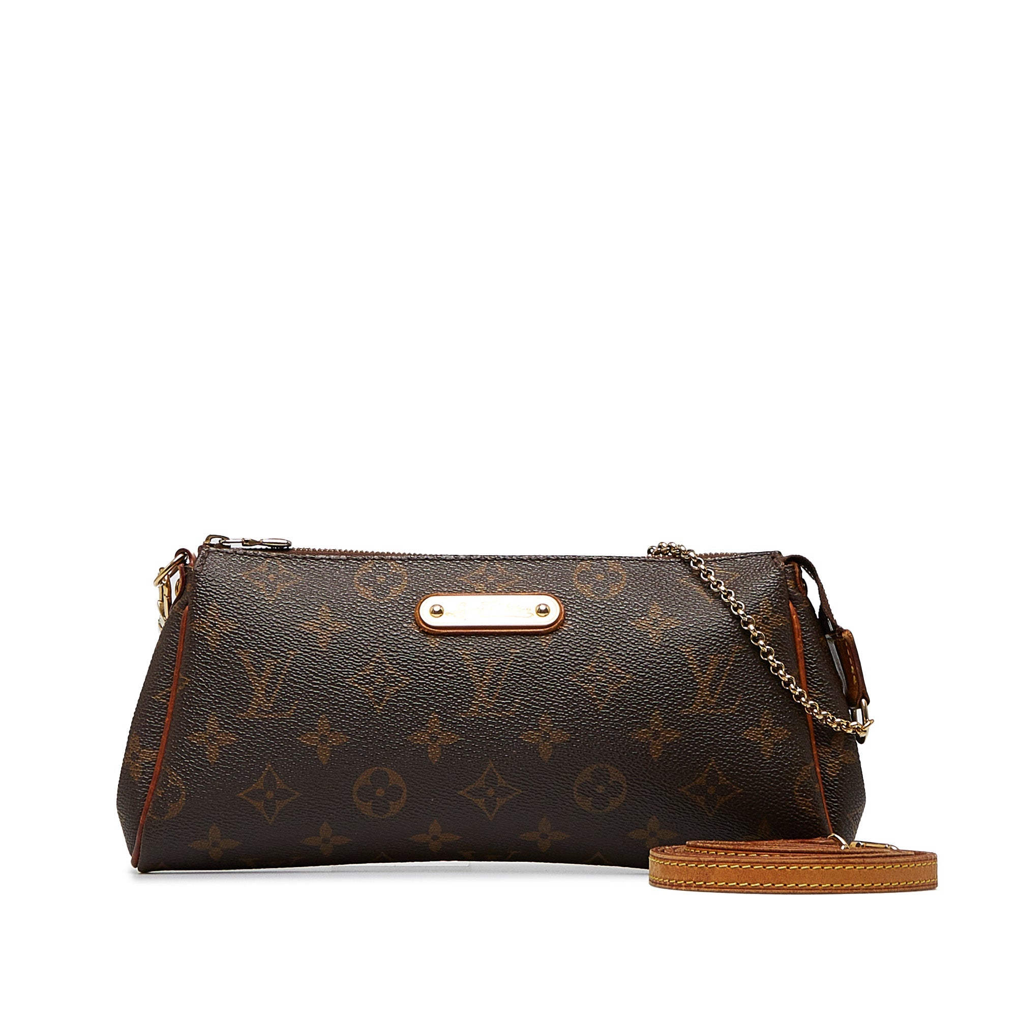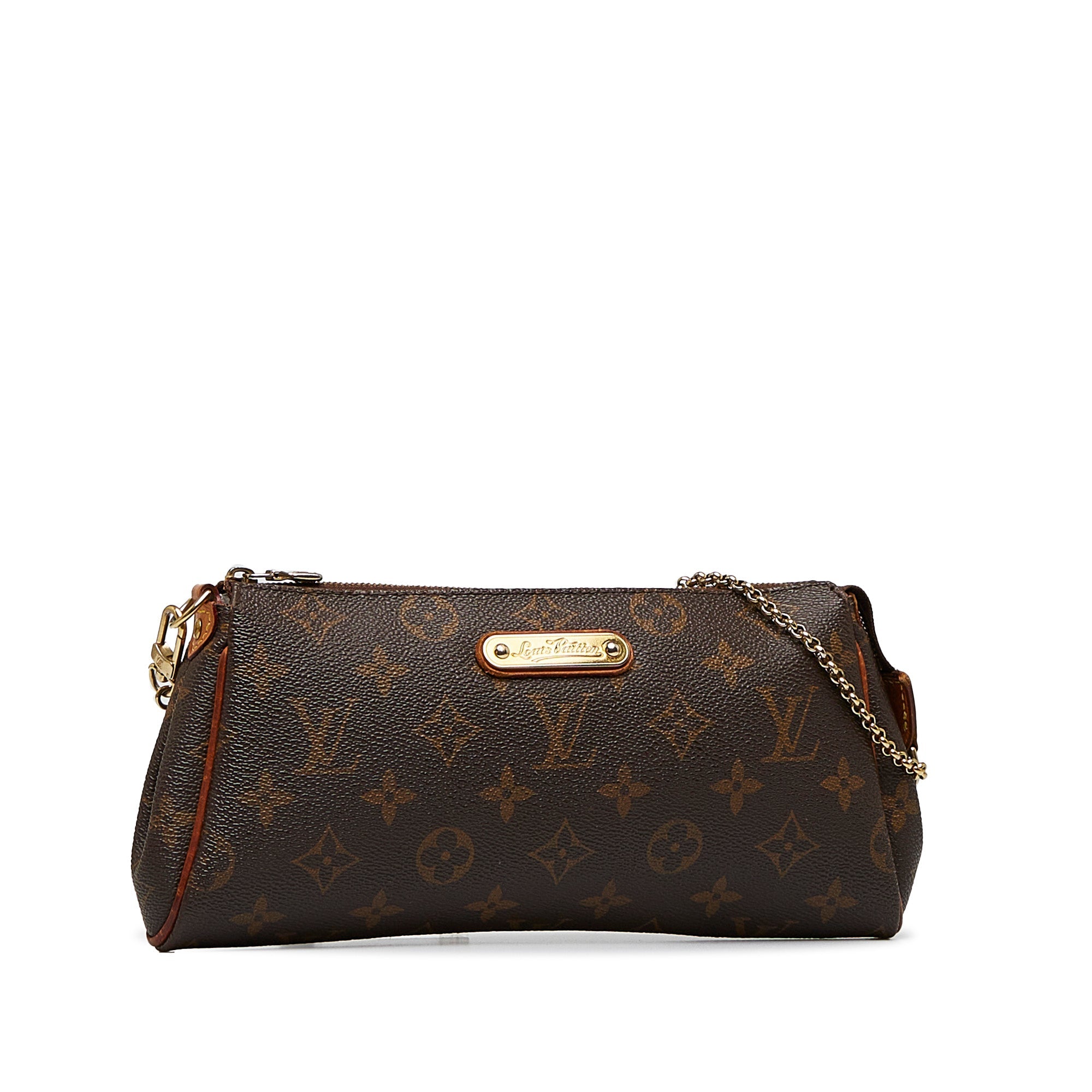 This LV Eva is made of Monogram Canvas and is named in honor of top model and fashion legend Eva Herzigová. The Bag features brown vachetta leather trim, gold details a gold-tone chain strap and a zipper closure at the top opening. The Bag can be worn near the shoulder and in the arm.