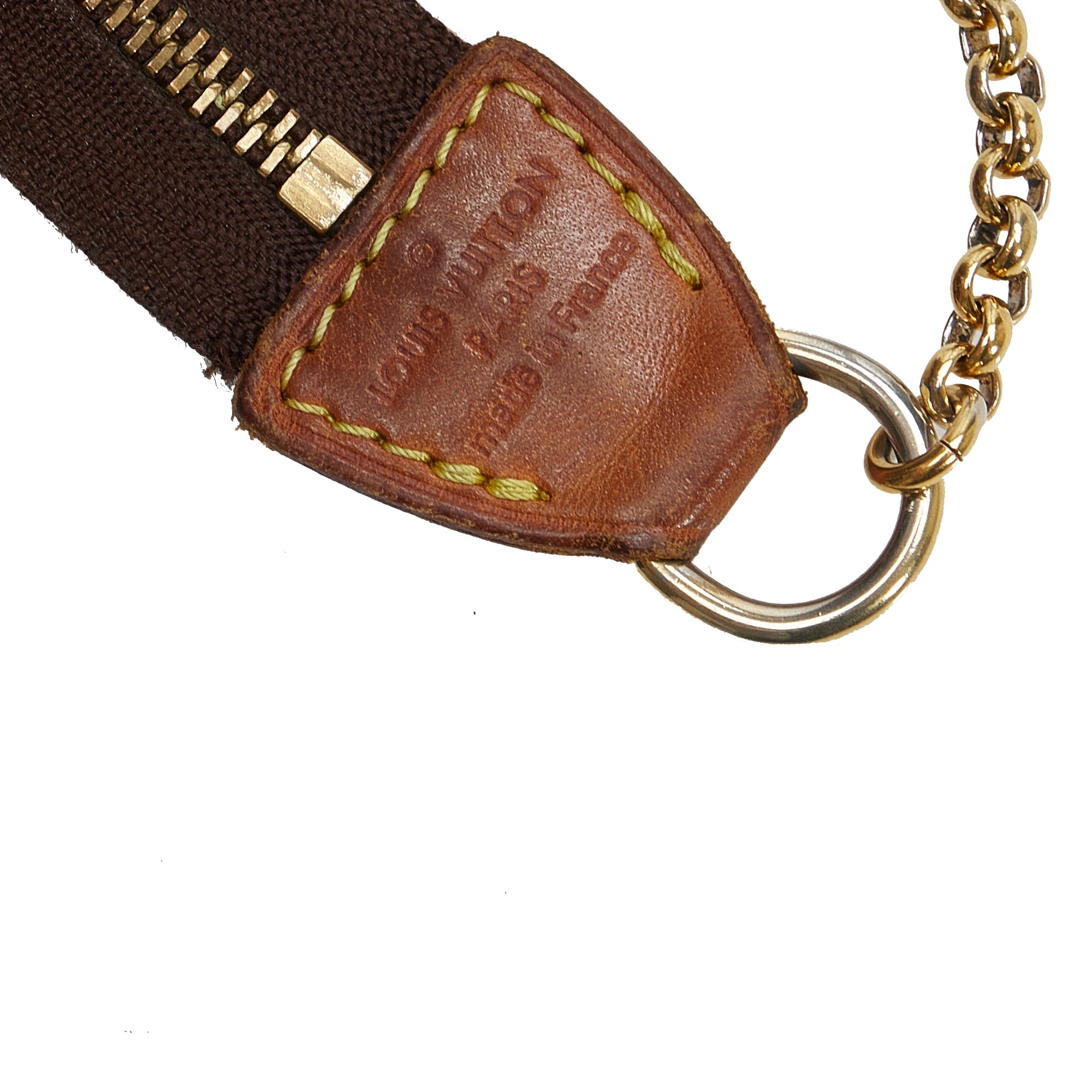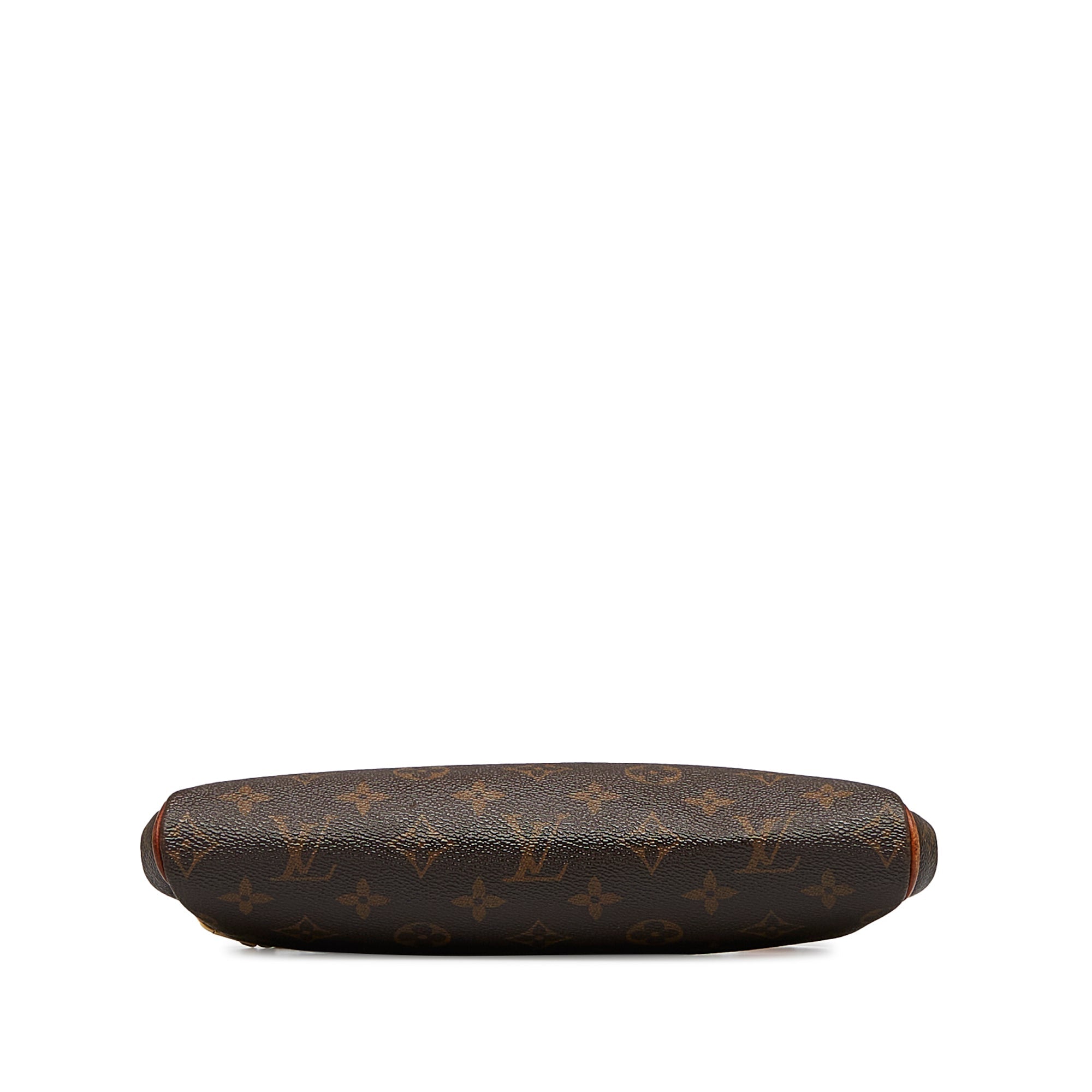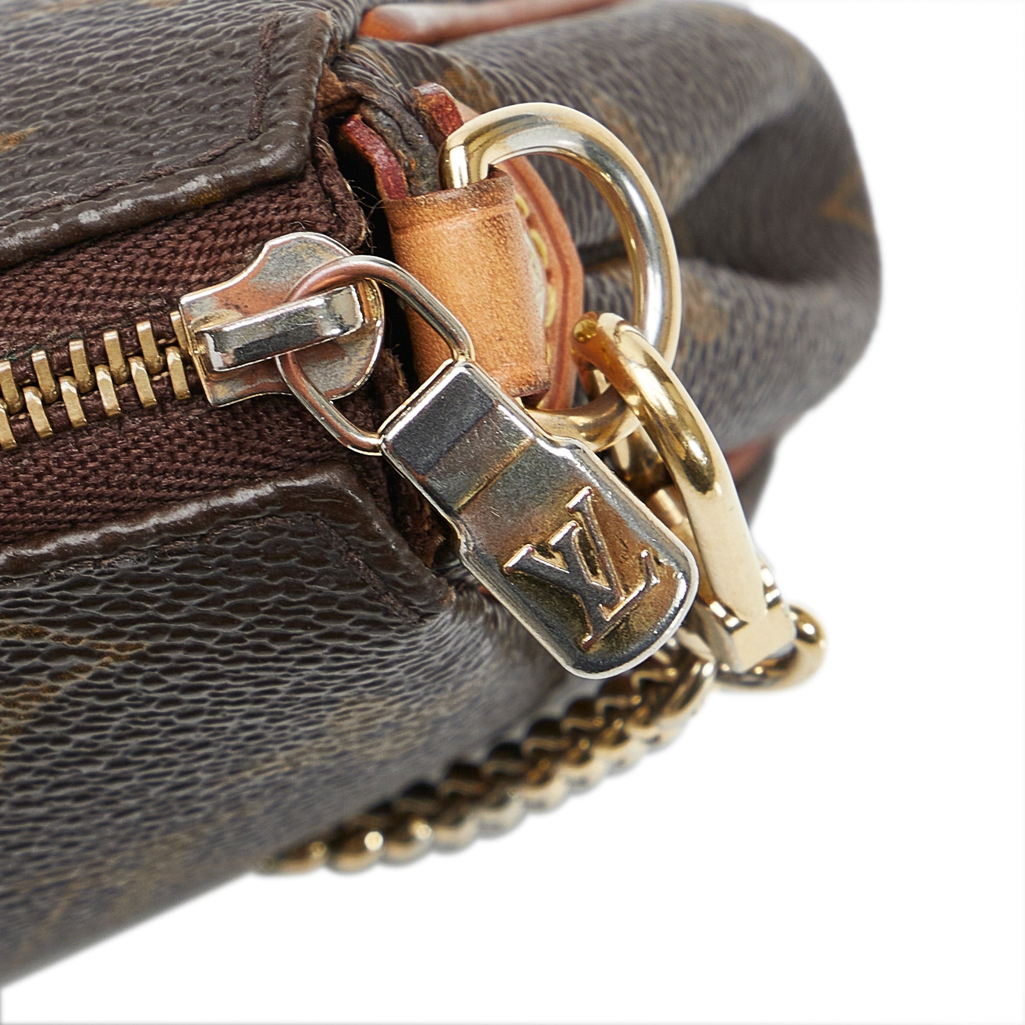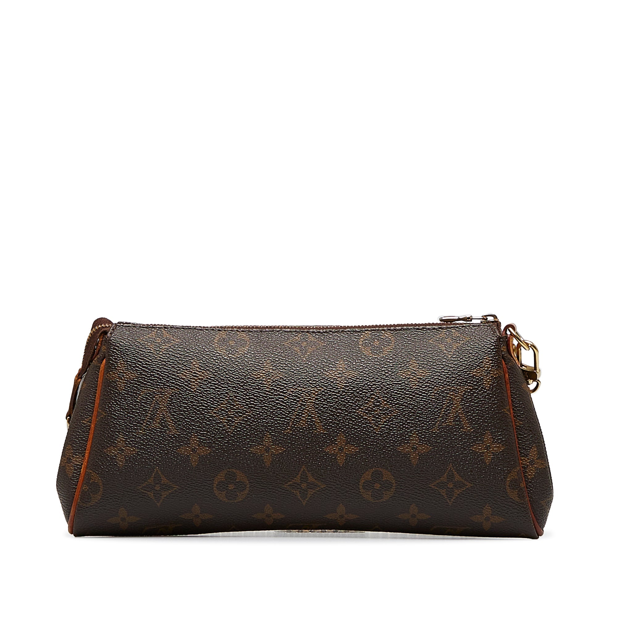 This LV Eva is made of Monogram Canvas and is named in honor of top model and fashion legend Eva Herzigová. The Bag features brown vachetta leather trim, gold details a gold-tone chain strap and a zipper closure at the top opening. The Bag can be worn near the shoulder and in the arm.