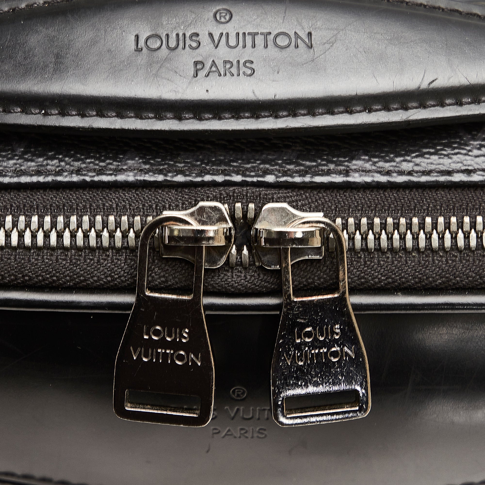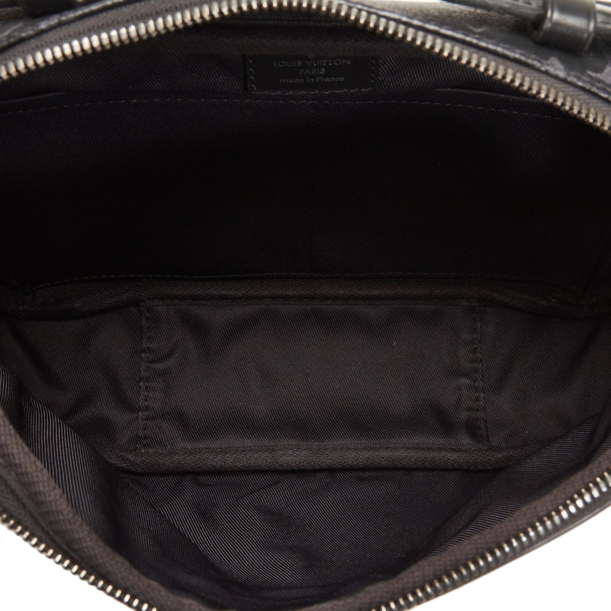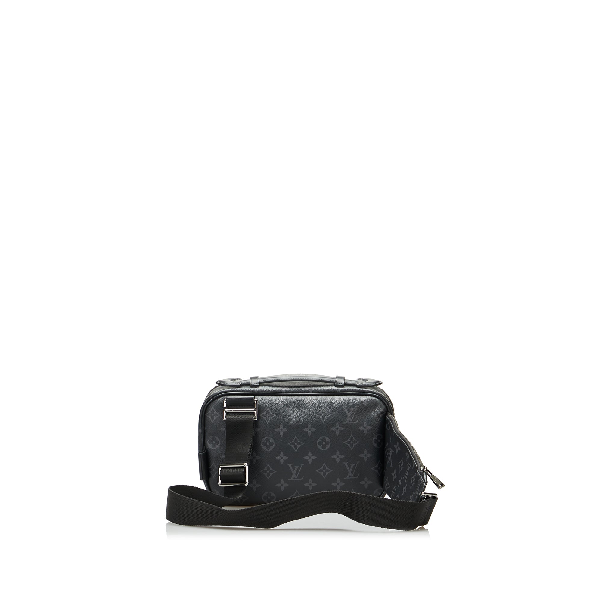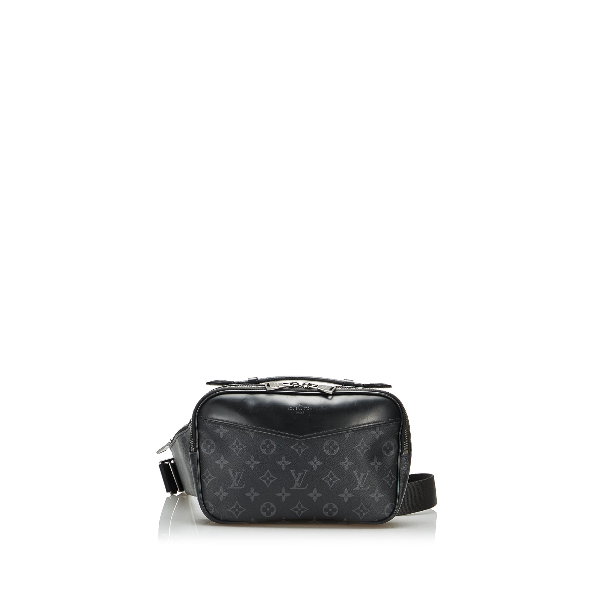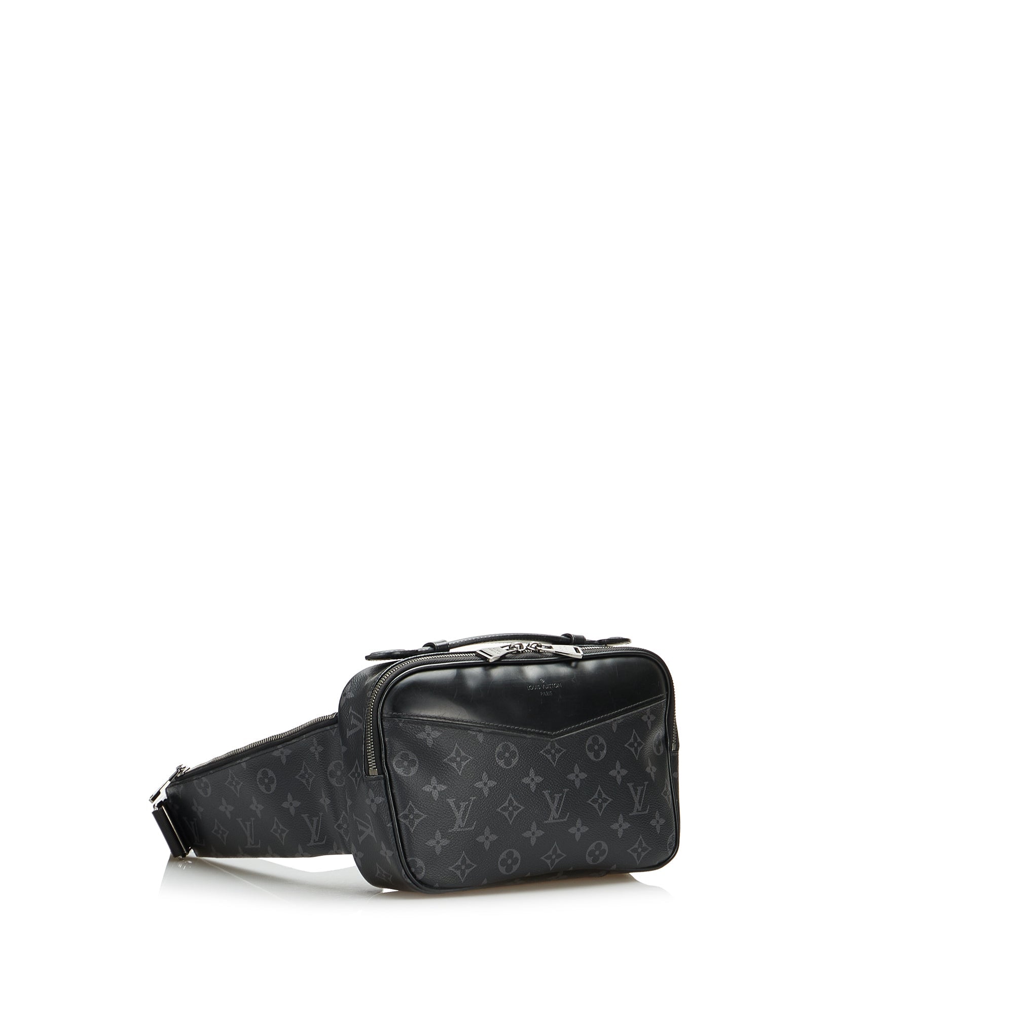 The fancy LV Explorer Bumbag features a black canvas Eclipse monogram, adjustable waist strap, silver-tone zipper and interior pockets.