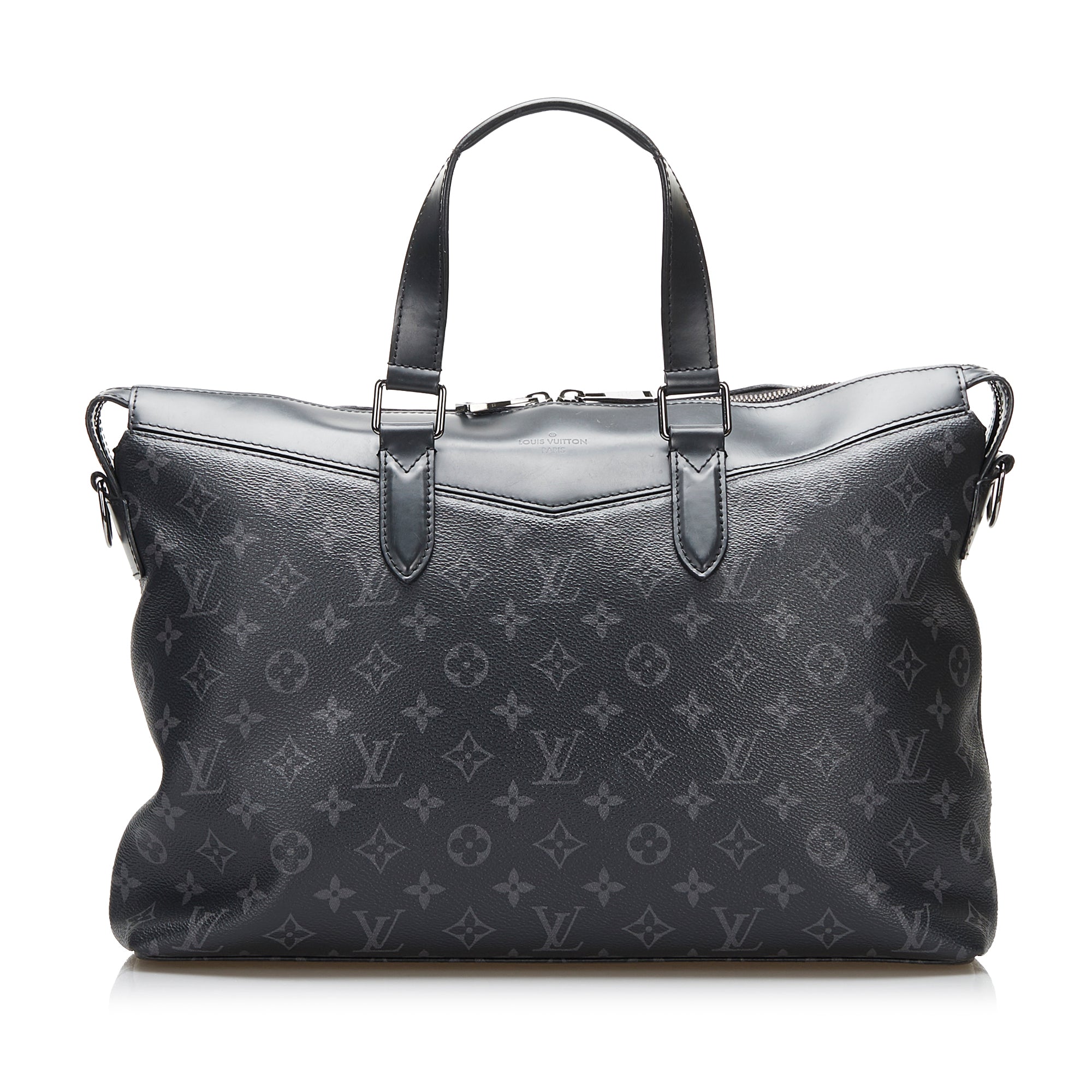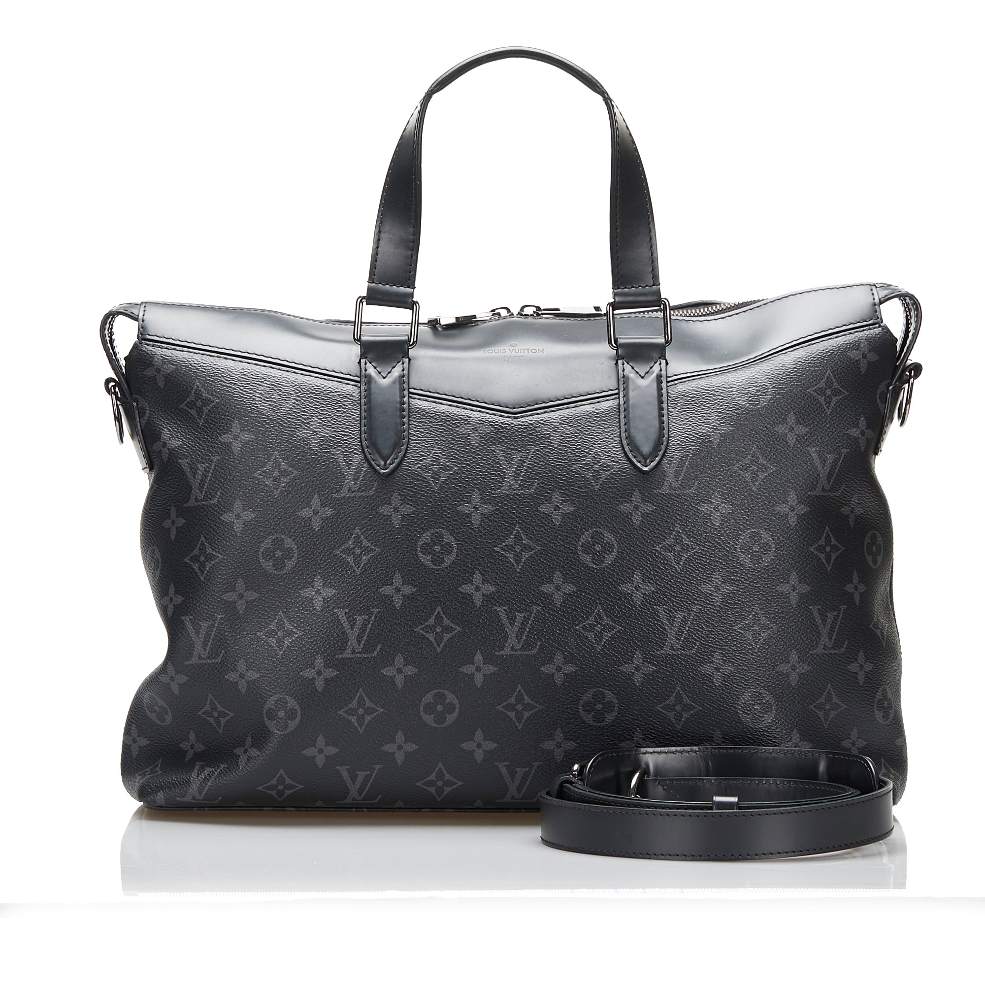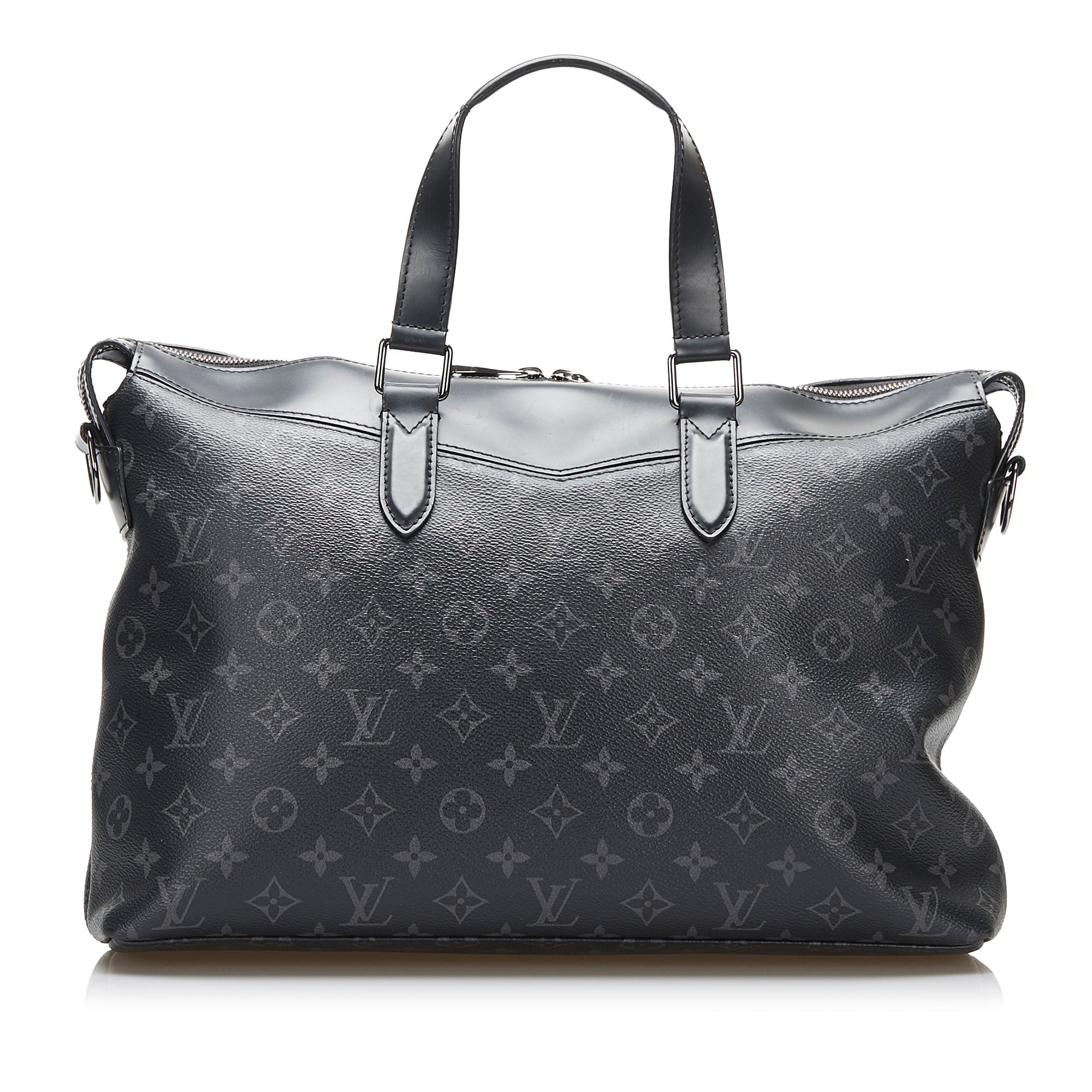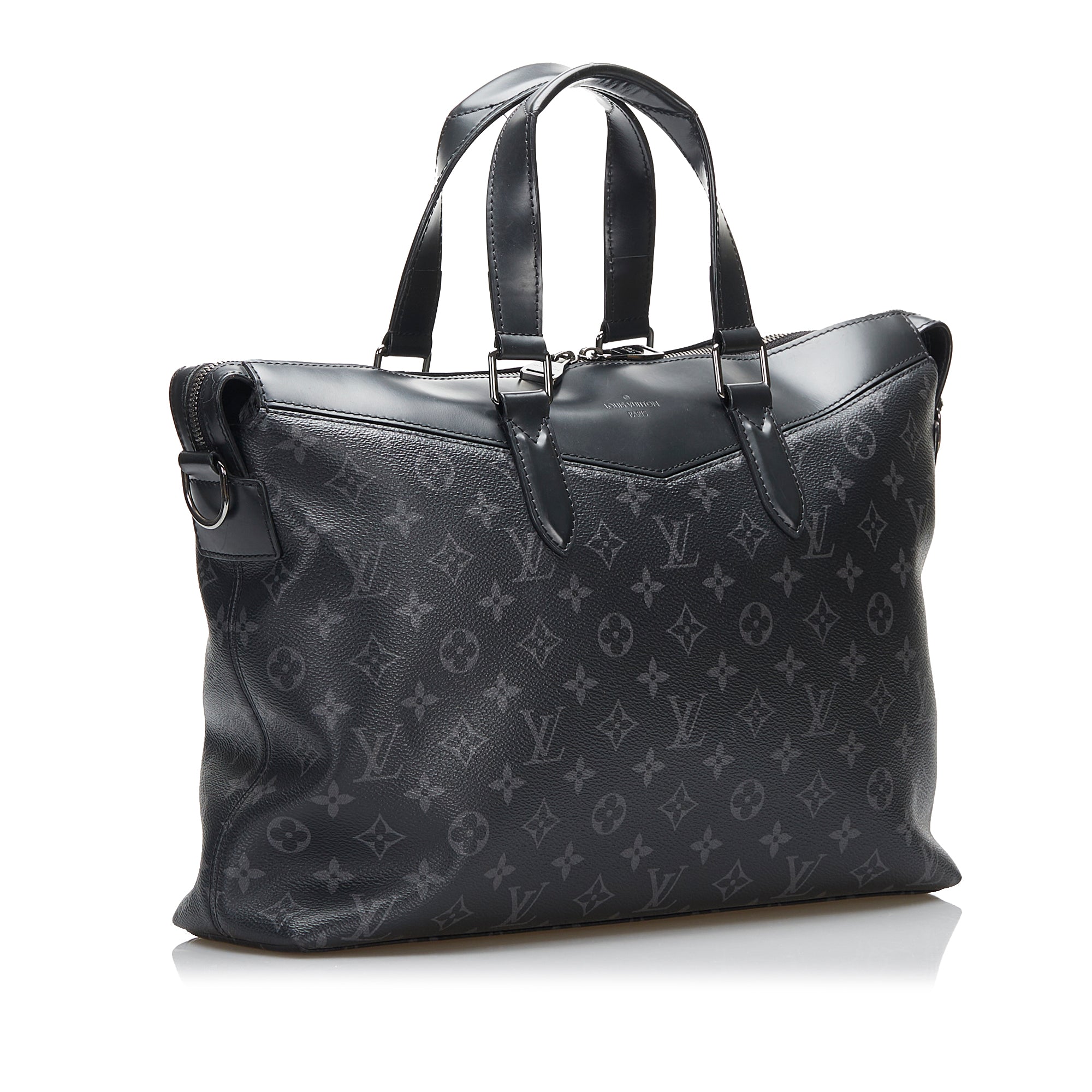 This LV Explorer business bag is made from black Monogram Eclipse canvas. The Bag features black leather trim, silver detailing, a rear exterior zippered pocket, flat leather handles, an adjustable, detachable shoulder strap, a double zippered top opening, and interior slip pockets. The Bag is carried by hand or loosely over the shoulder.