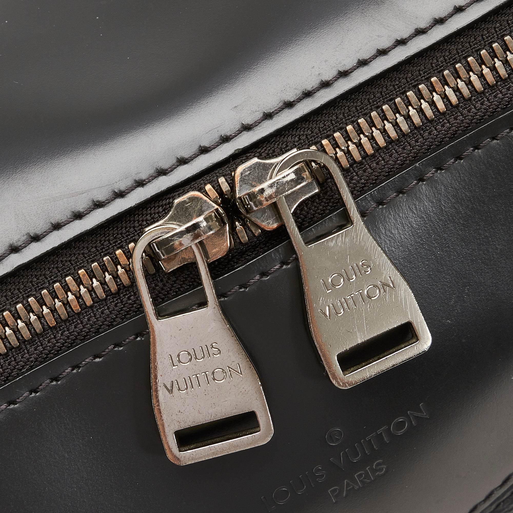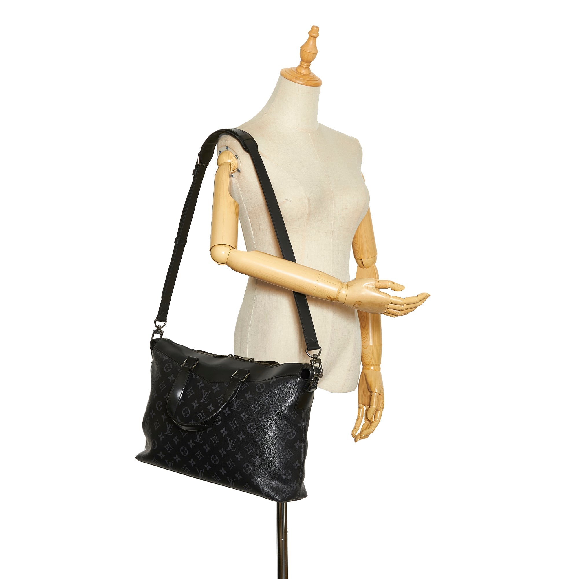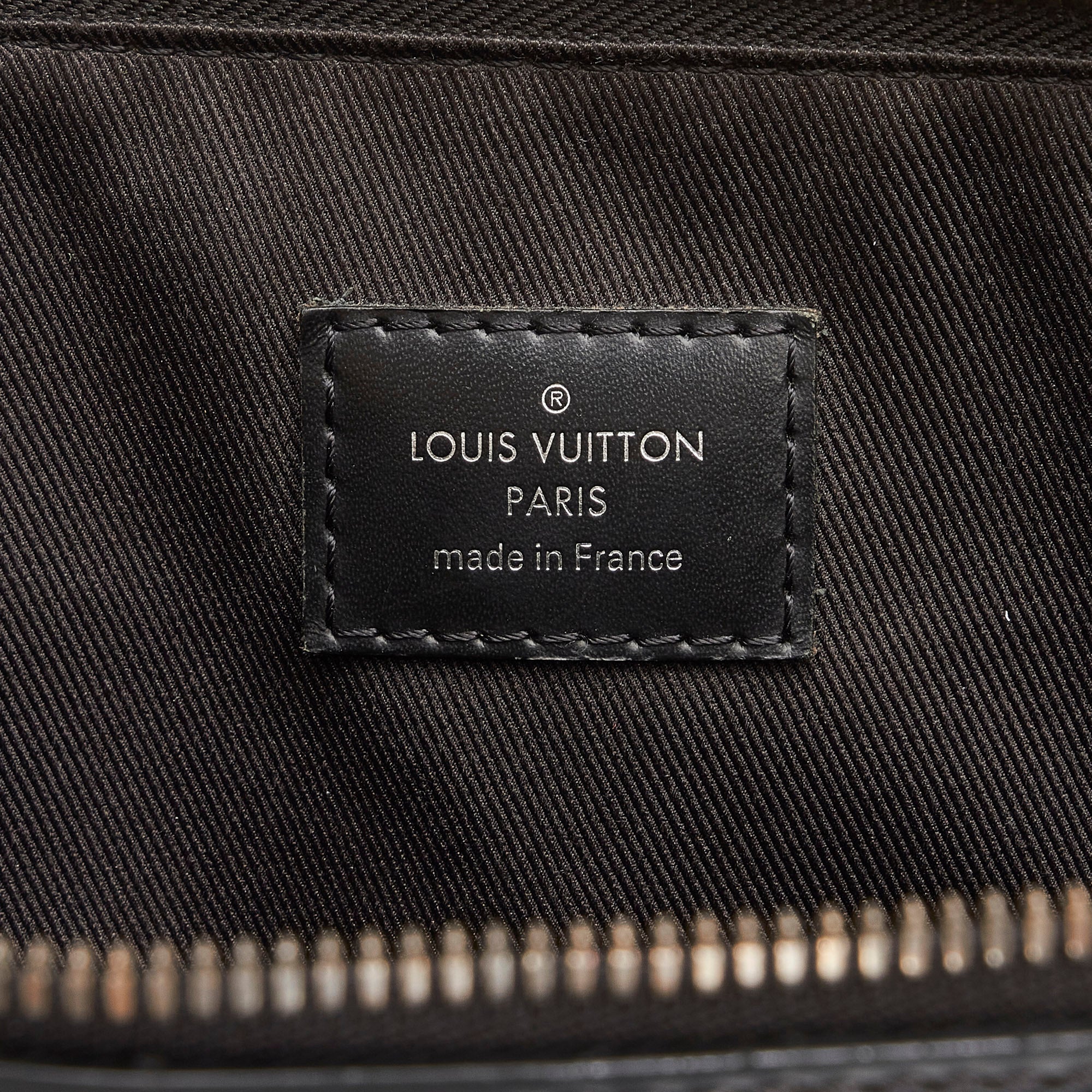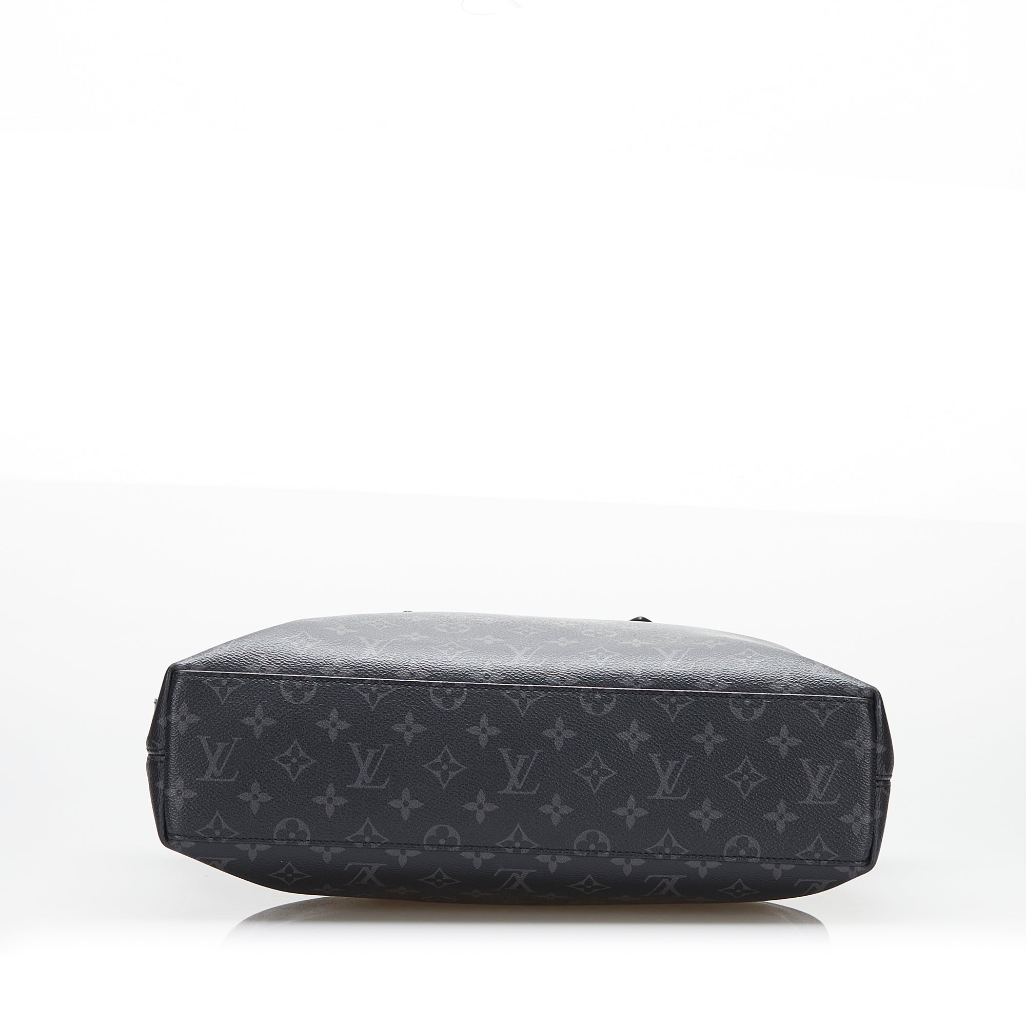 This LV Explorer business bag is made from black Monogram Eclipse canvas. The Bag features black leather trim, silver detailing, a rear exterior zippered pocket, flat leather handles, an adjustable, detachable shoulder strap, a double zippered top opening, and interior slip pockets. The Bag is carried by hand or loosely over the shoulder.
