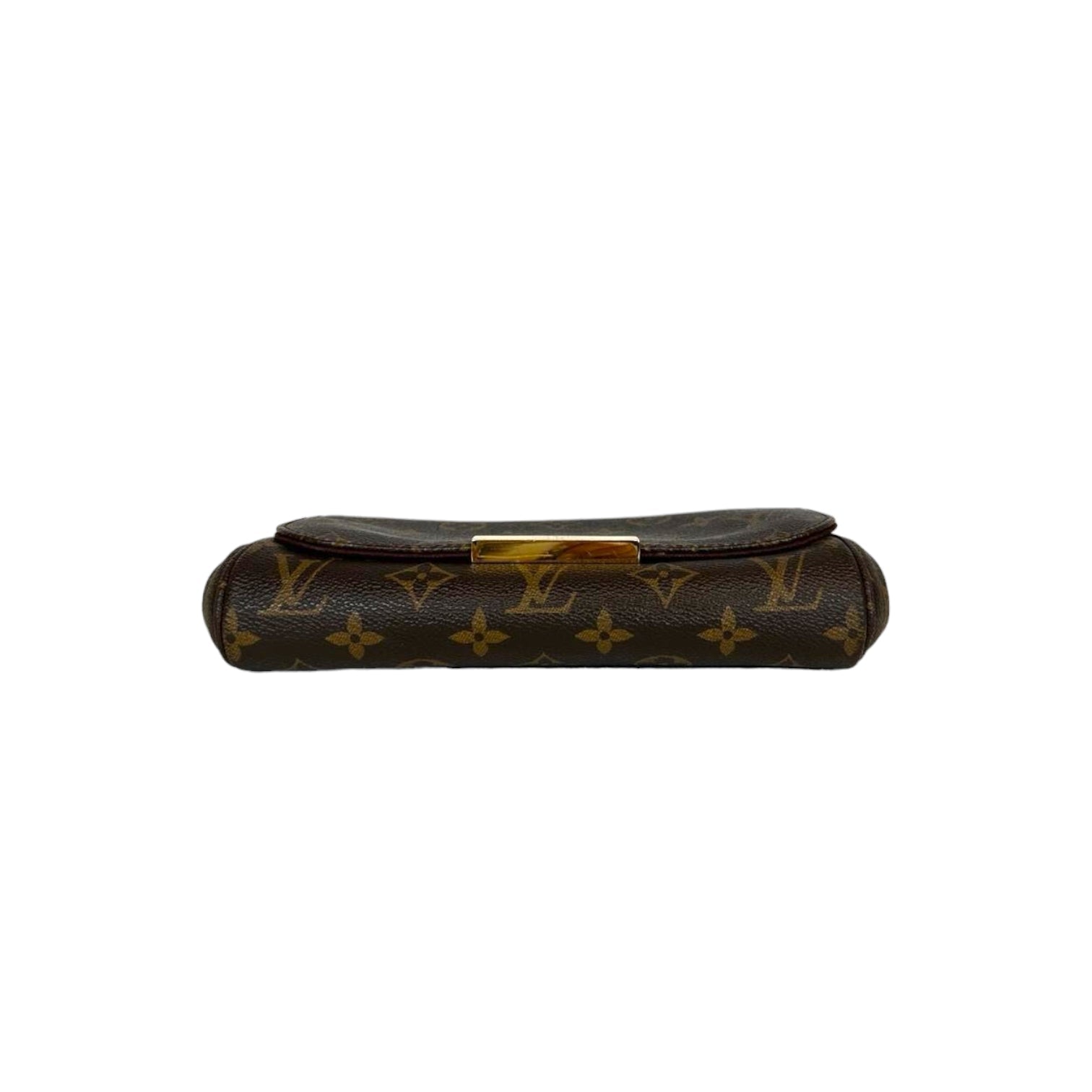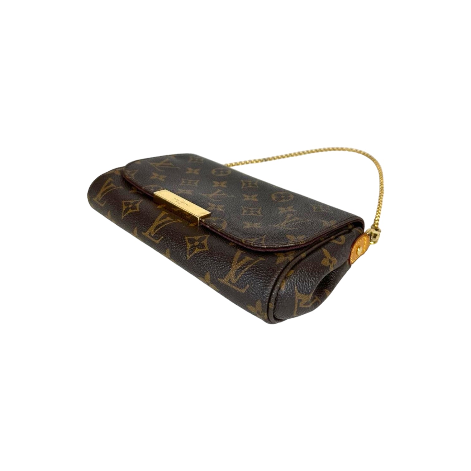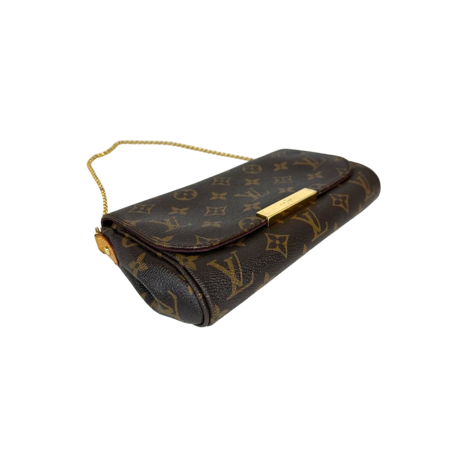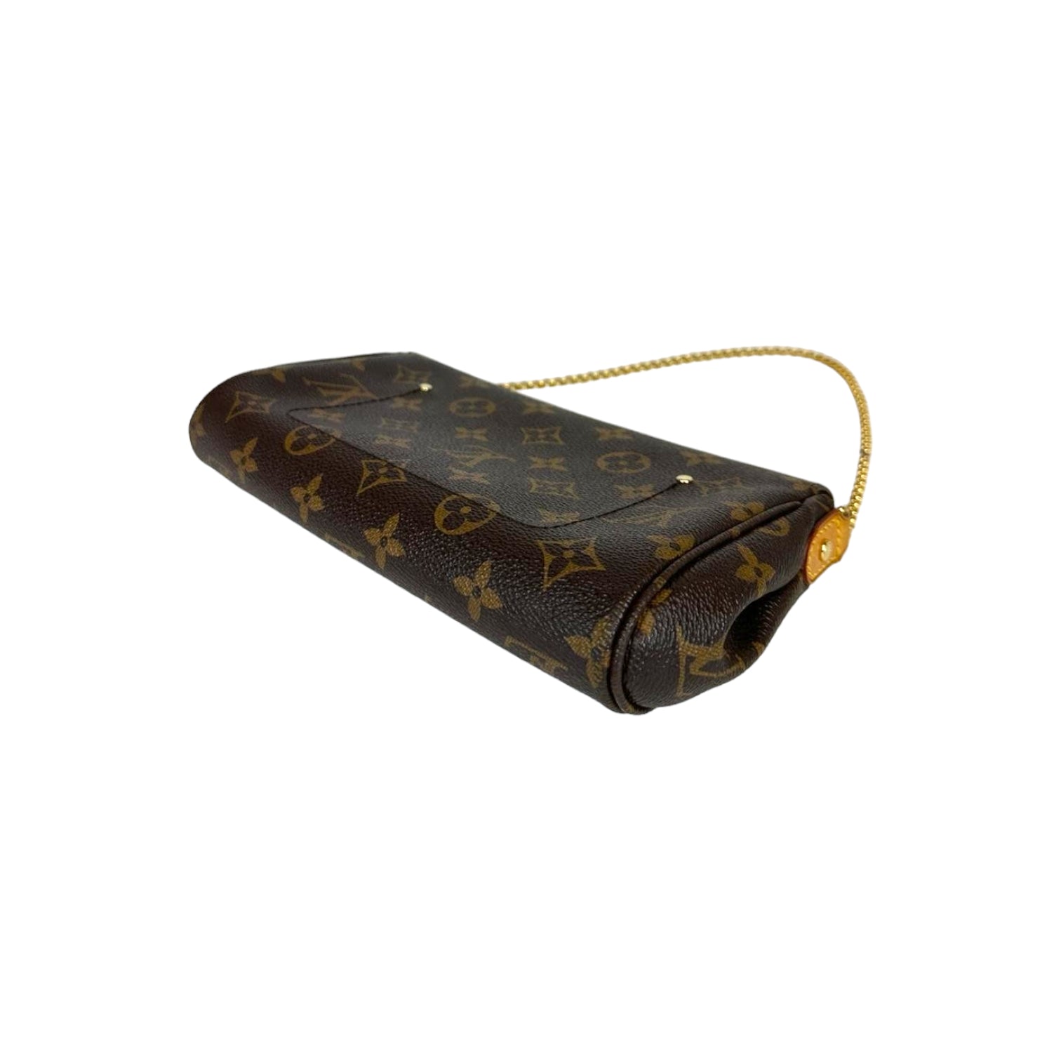This LV Favorite MM is made from classic brown Monogram canvas. The front flap is magnetically secured and features a gold fitting with the name of the house and Paris, the company’s home town. The Bag can be carried comfortably in the hand as a clutch. Alternatively, the Bag also has a detachable vachetta leather shoulder strap that allows it to be crossbody. The interior of the small Bag has a slip pocket.