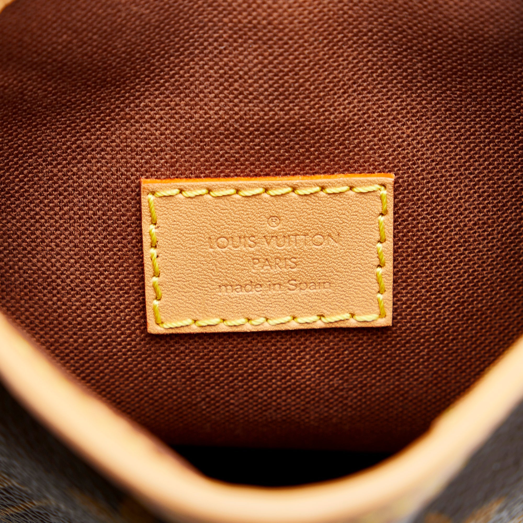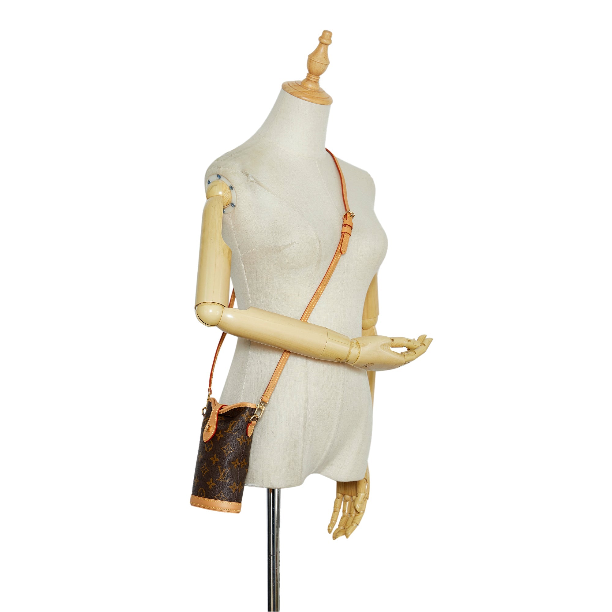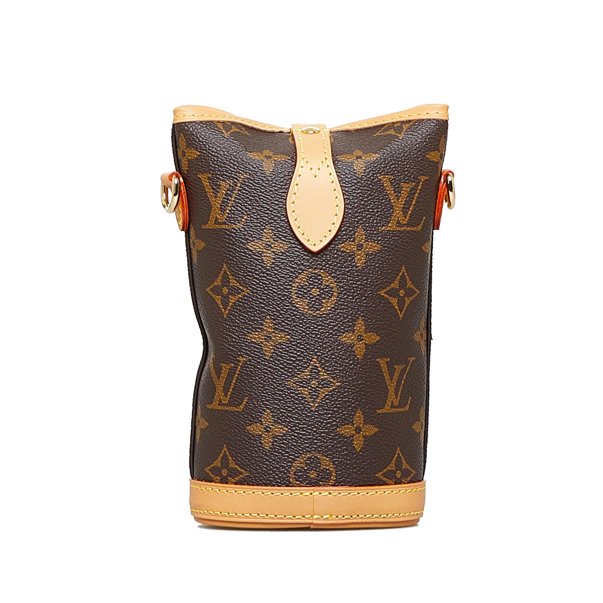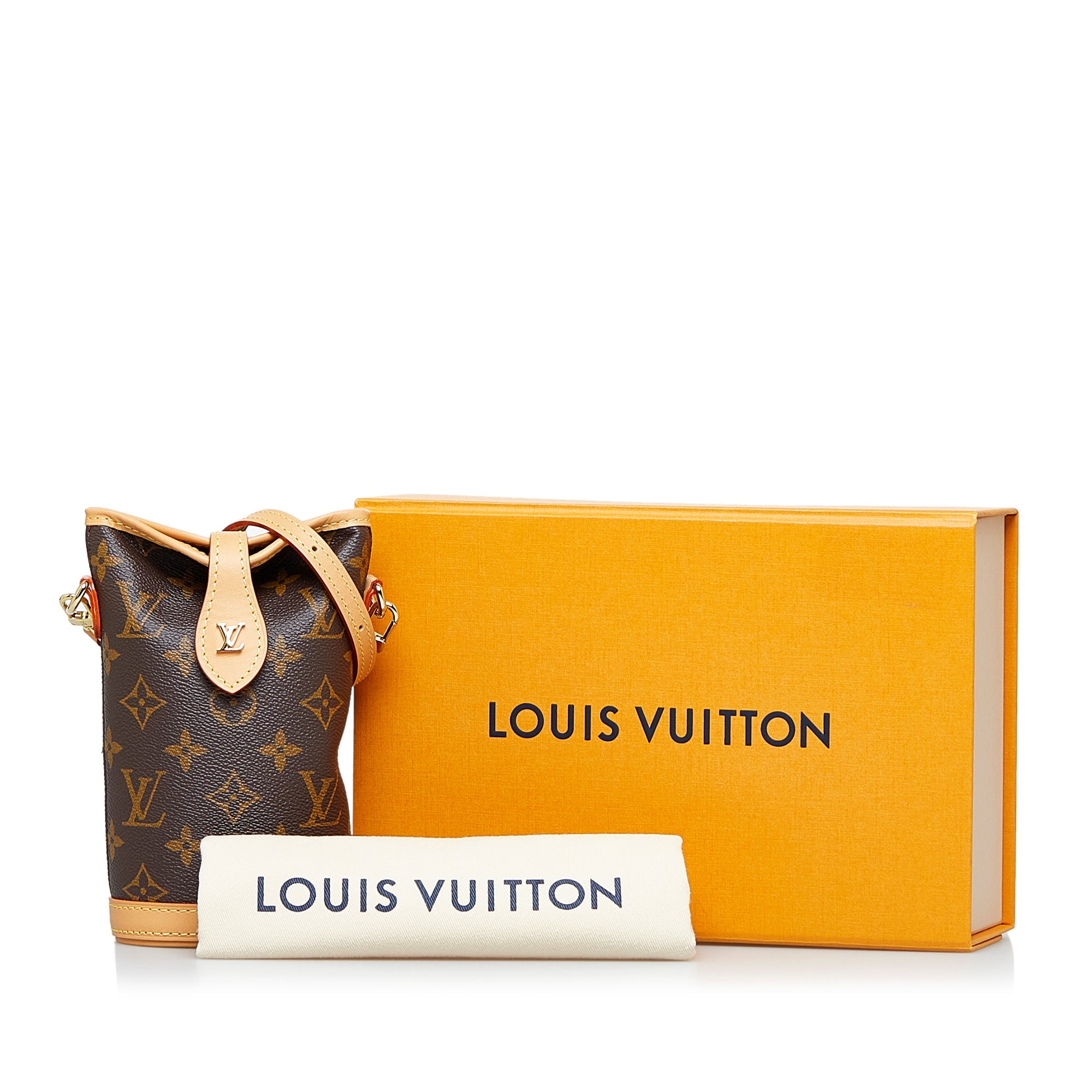 This elegant little LV Fold Me Pouch is made from classic Monogram Canvas. A vachetta leather strap with a gold LV monogram and magnetic closure wraps over the top opening. The Bag is best worn across the body.