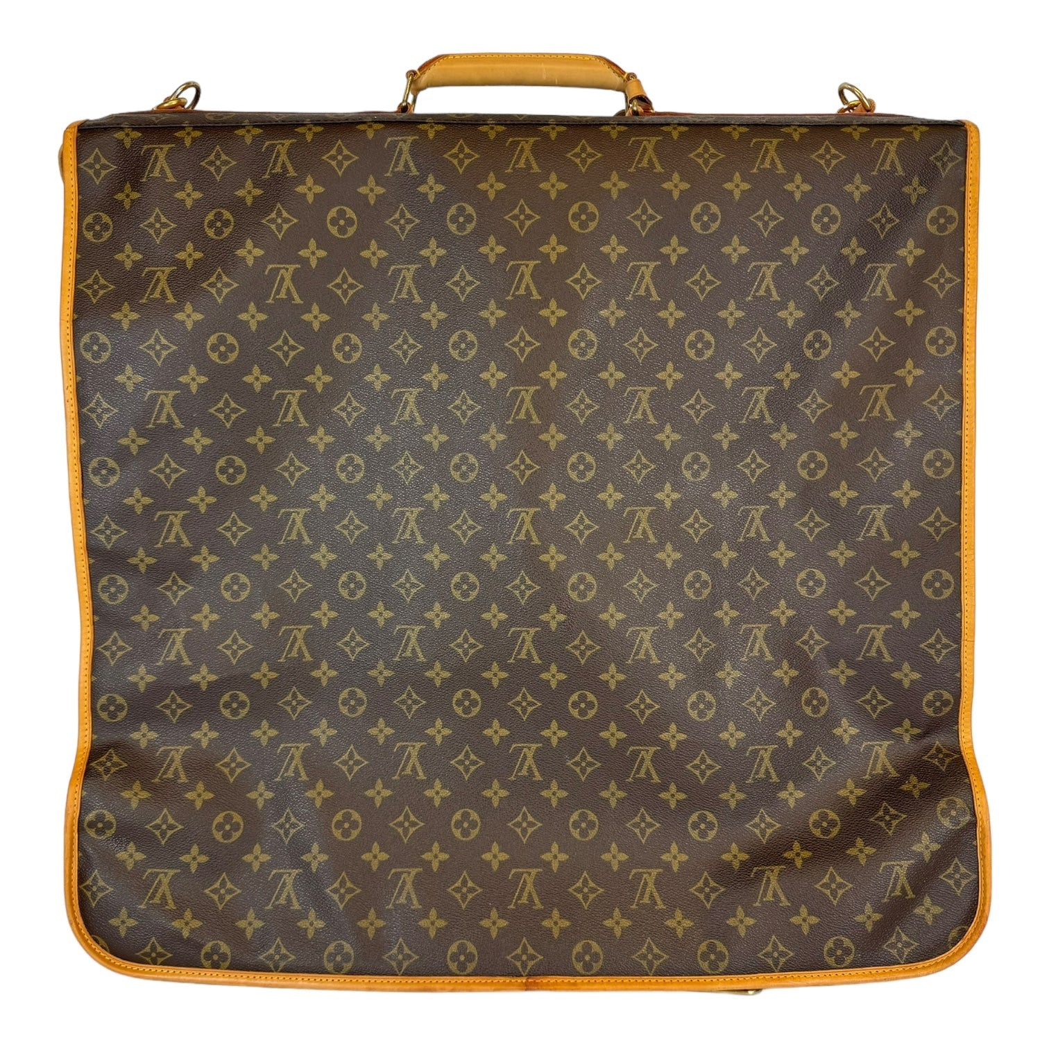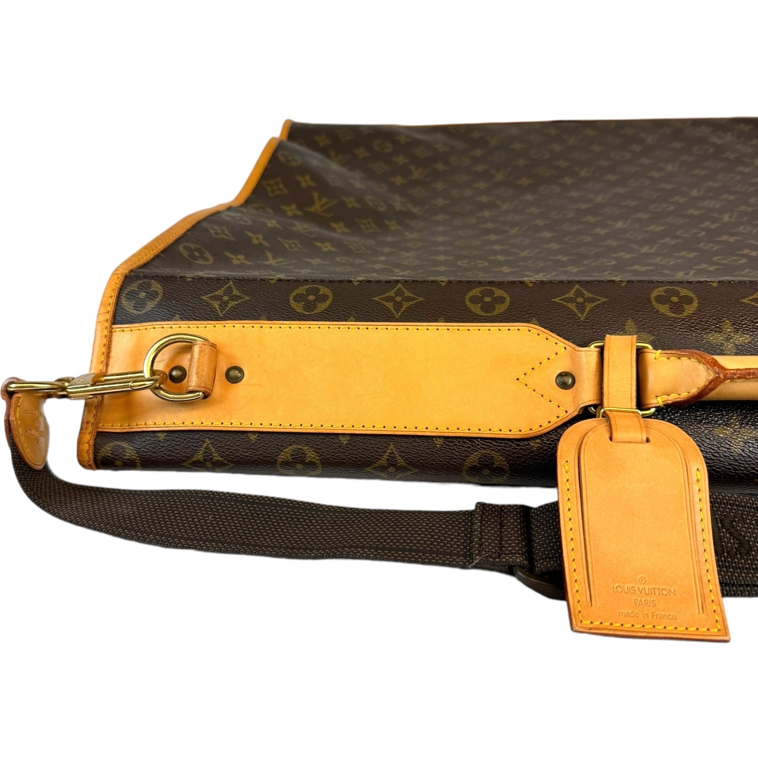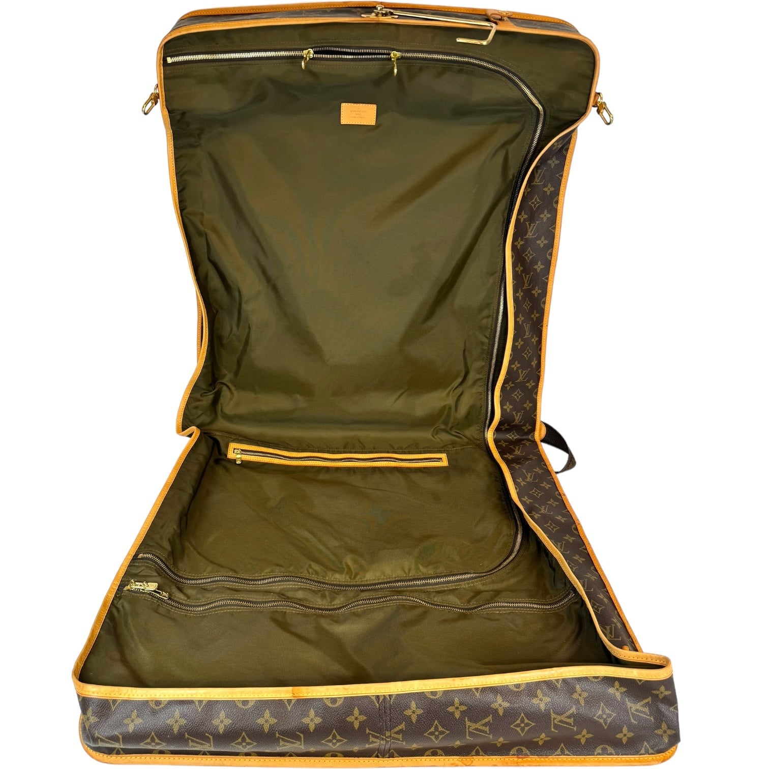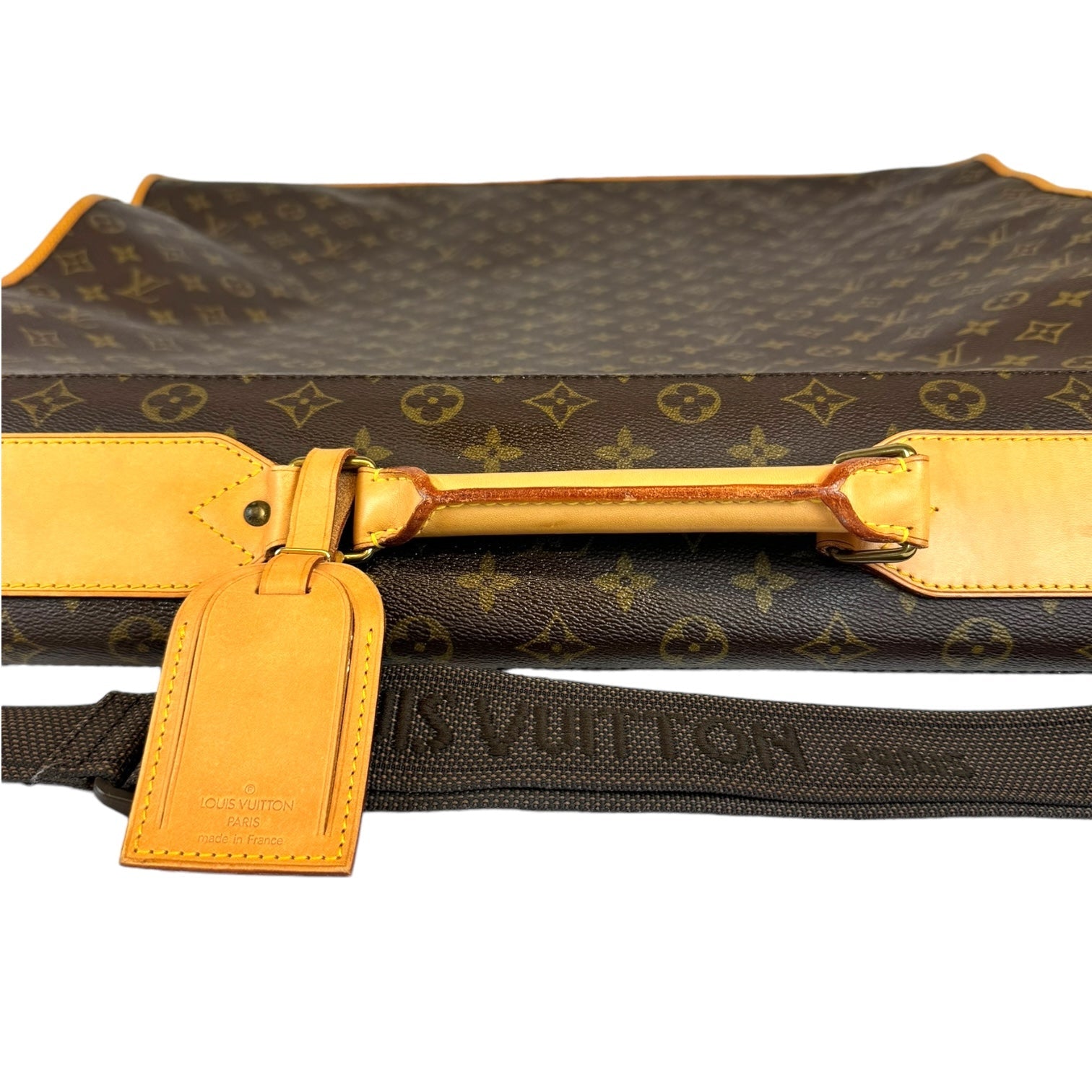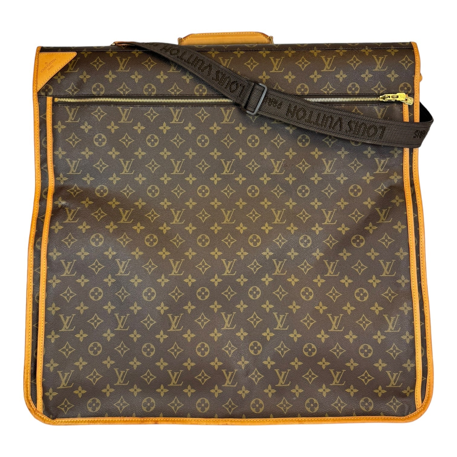 This fresh LV garment bag is made from Monogram canvas. The front has a gold-colored zipper that runs down the middle. The garment bag can be folded in half and carried by the double handles. It comes with a name tag. The inside is lined with silky soft beige fabric. Great for all your travel needs!