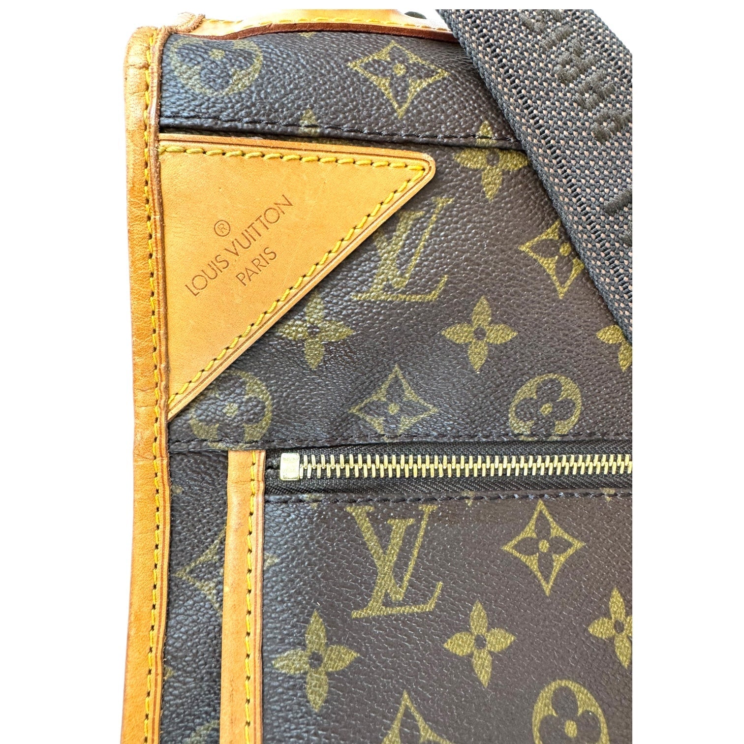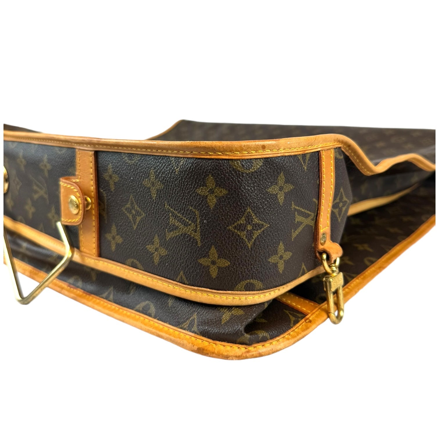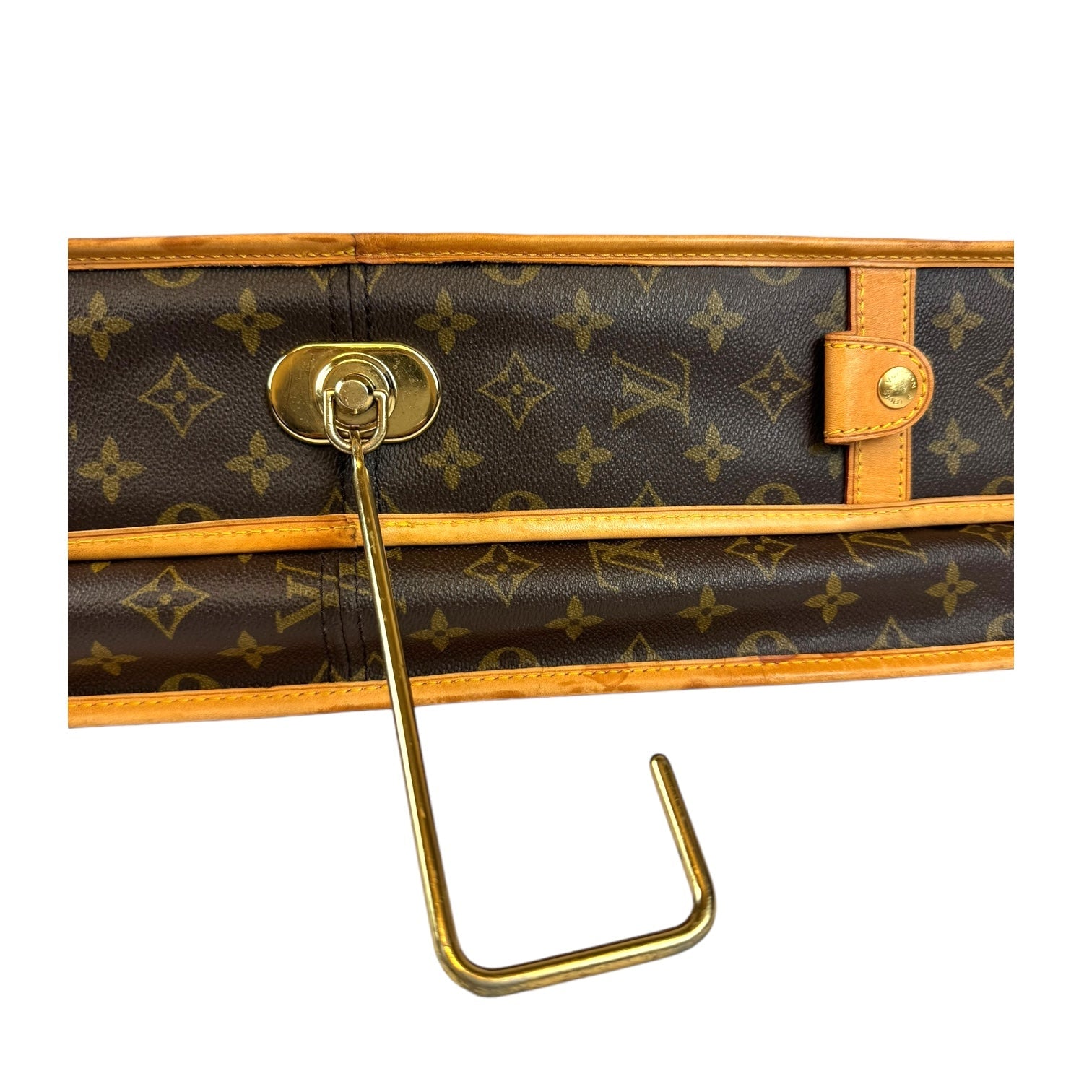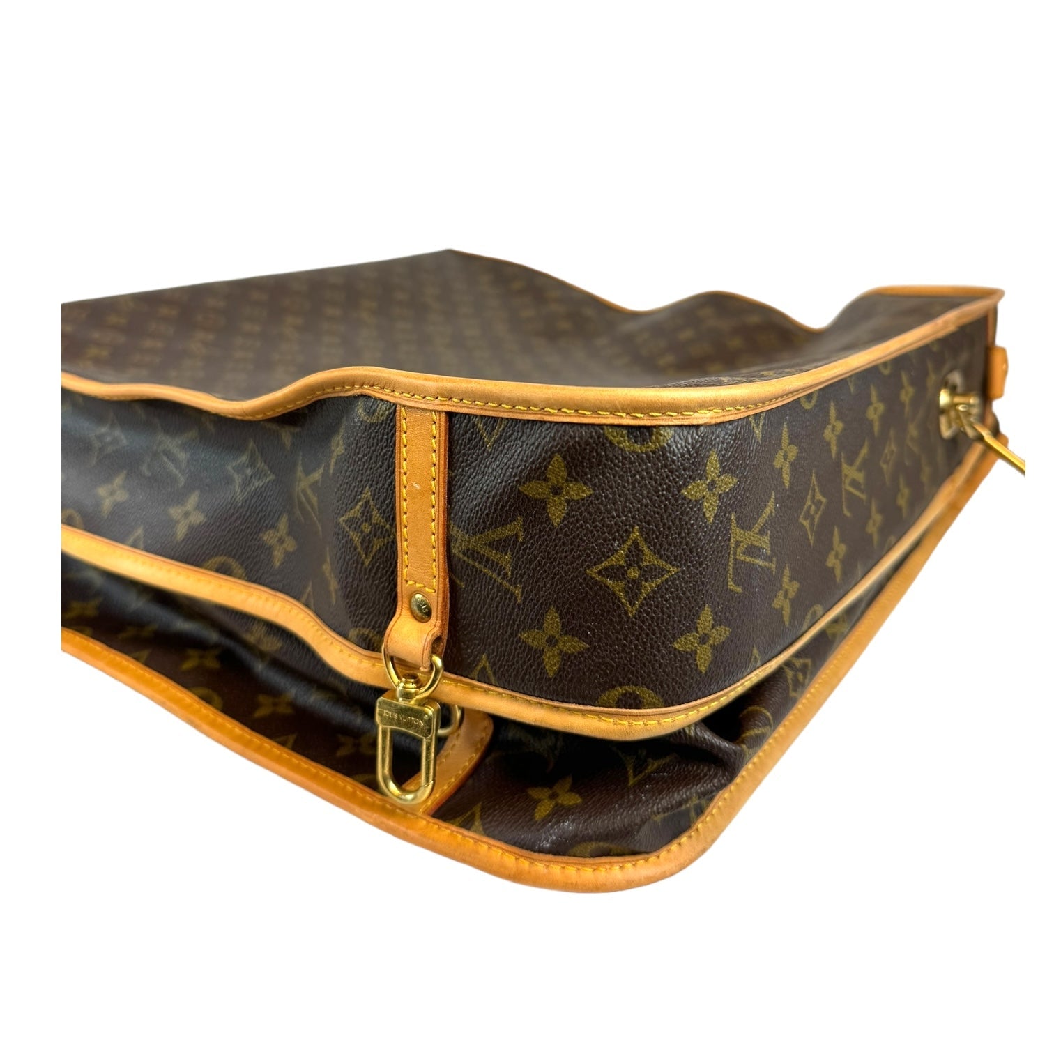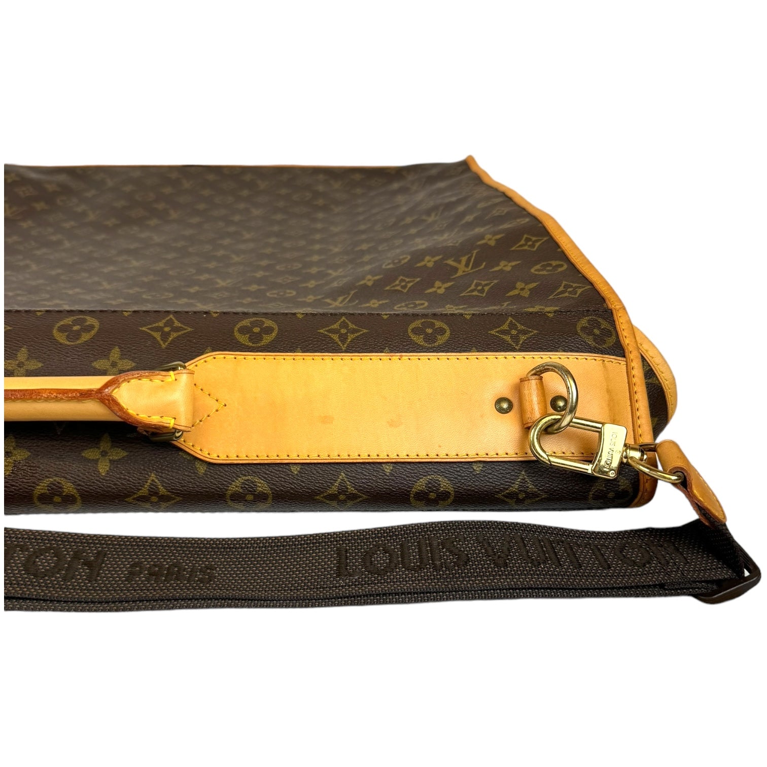 This fresh LV garment bag is made from Monogram canvas. The front has a gold-colored zipper that runs down the middle. The garment bag can be folded in half and carried by the double handles. It comes with a name tag. The inside is lined with silky soft beige fabric. Great for all your travel needs!