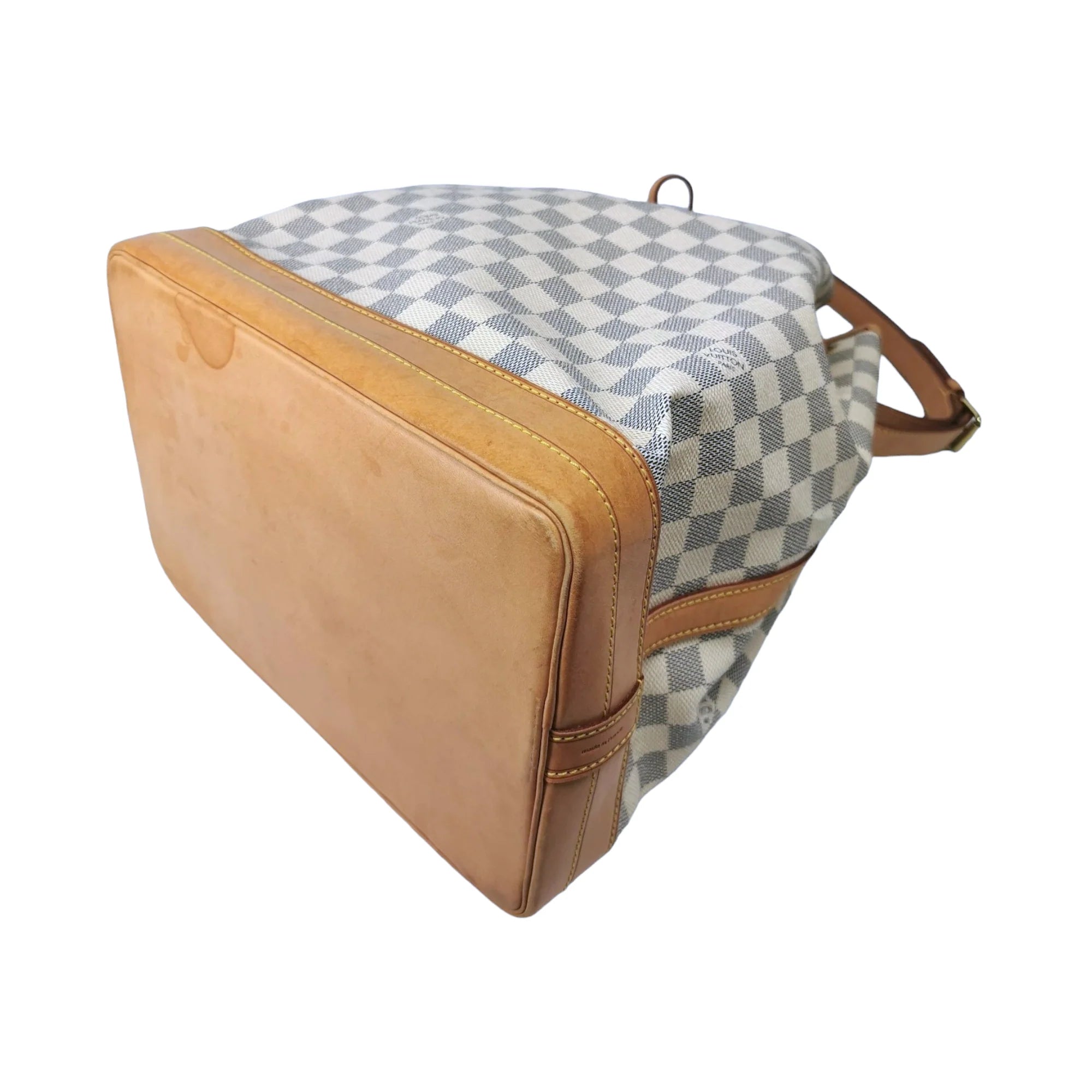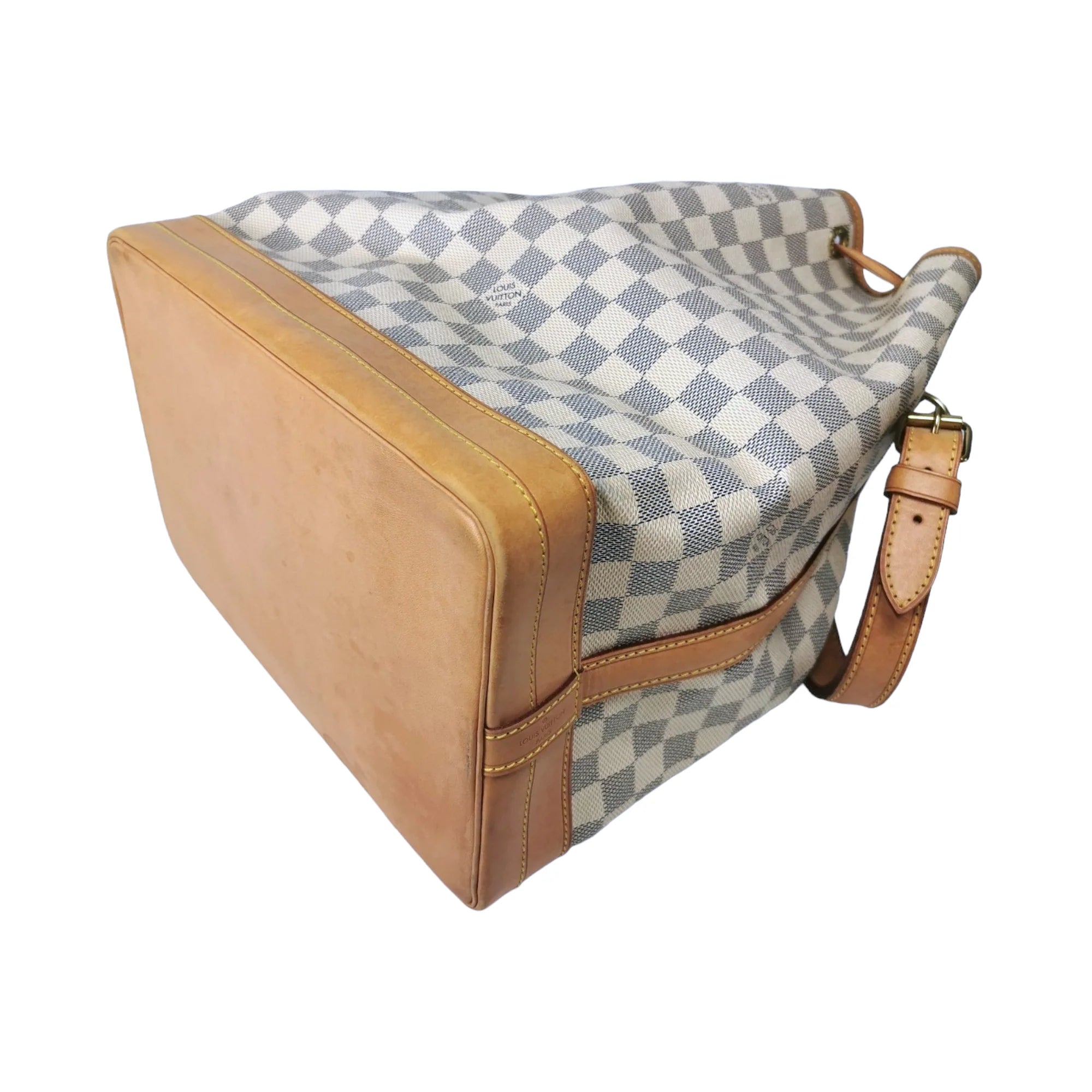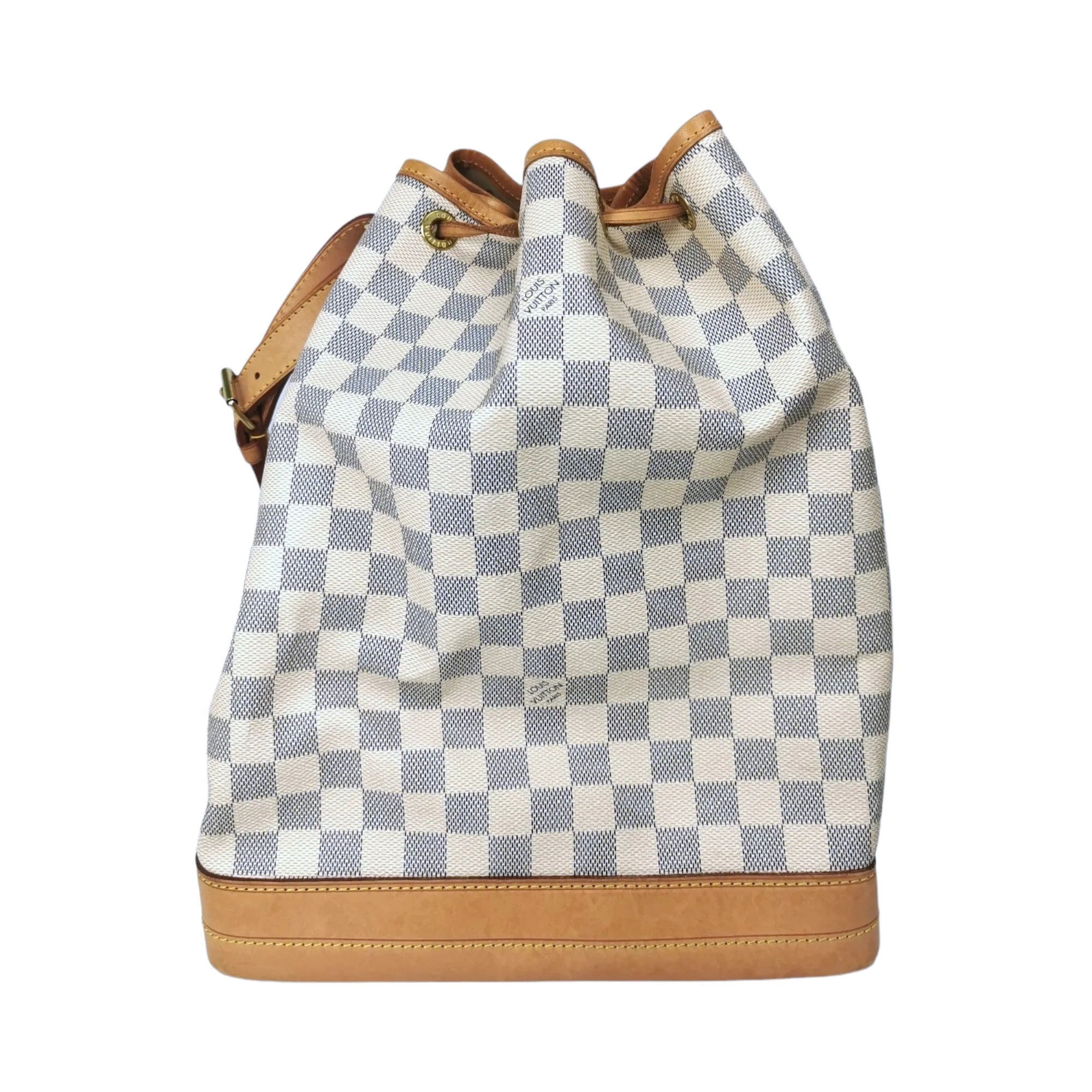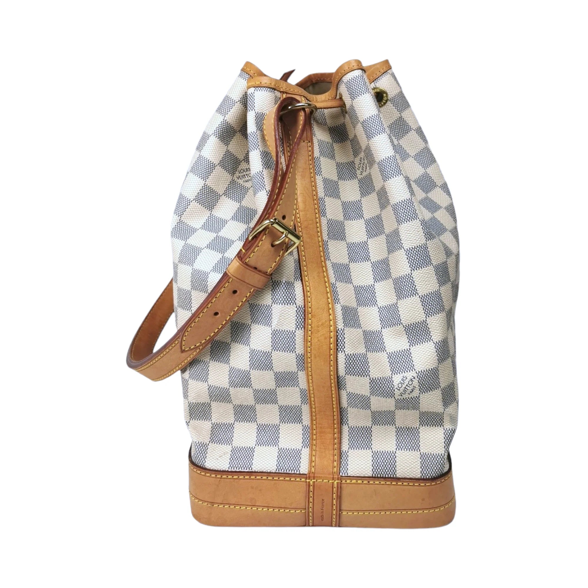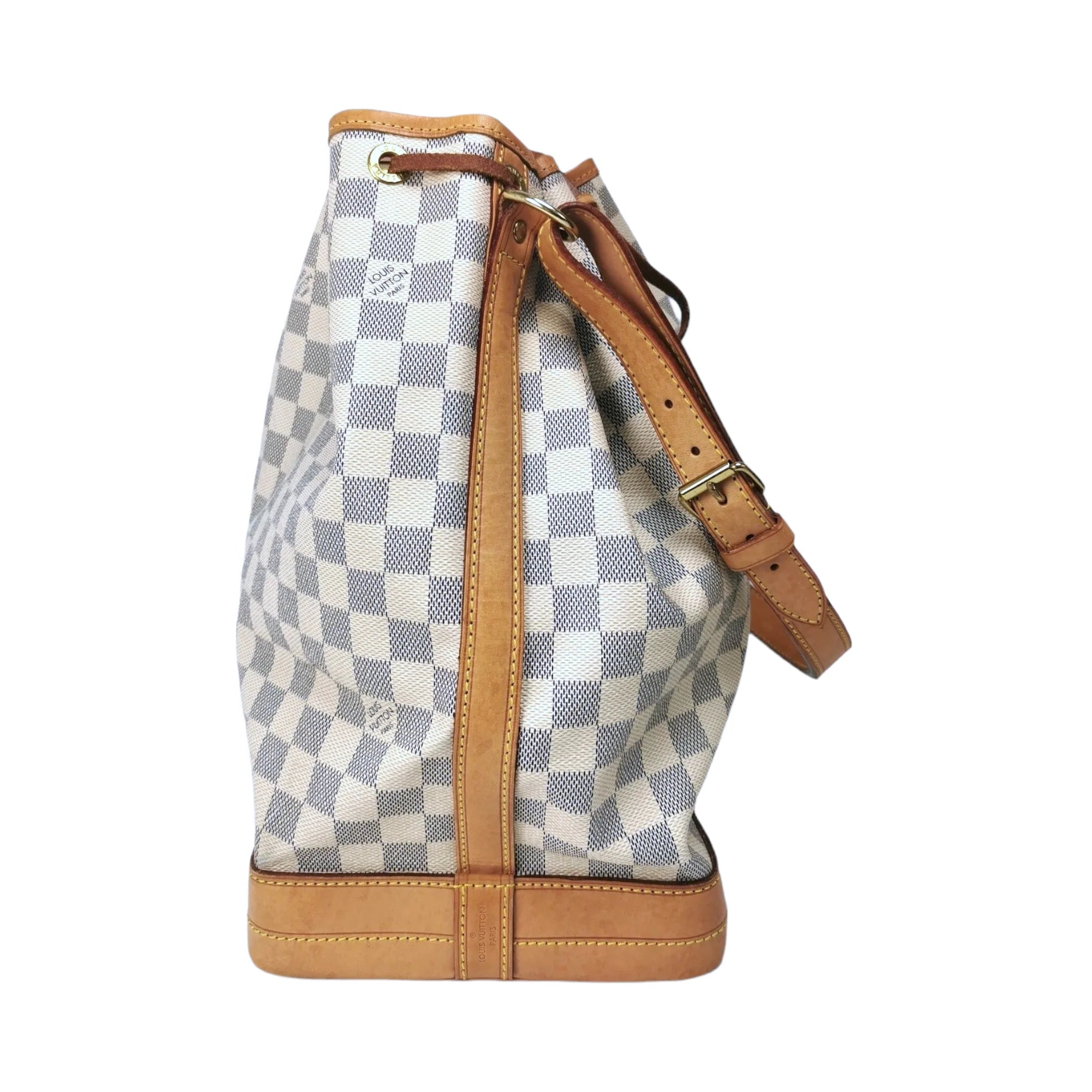 In 1932, a champagne producer asked Gaston-LV for an elegant and practical way to carry five bottles of champagne. This resulted in the LV Noé, which has become an absolute classic of the LV fashion house. This LV Grand Noé is made of white Damier Azur Canvas and has gold details.
